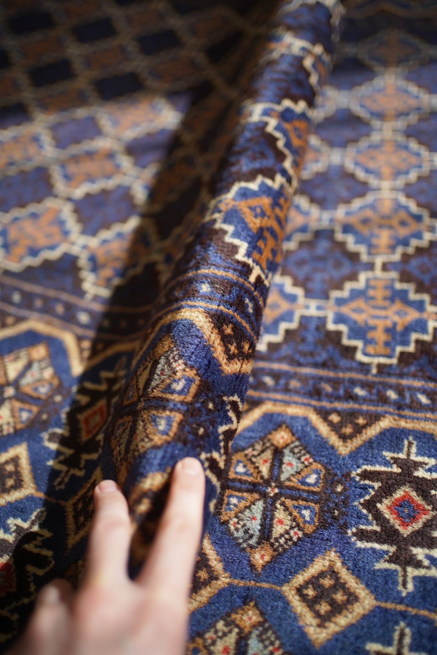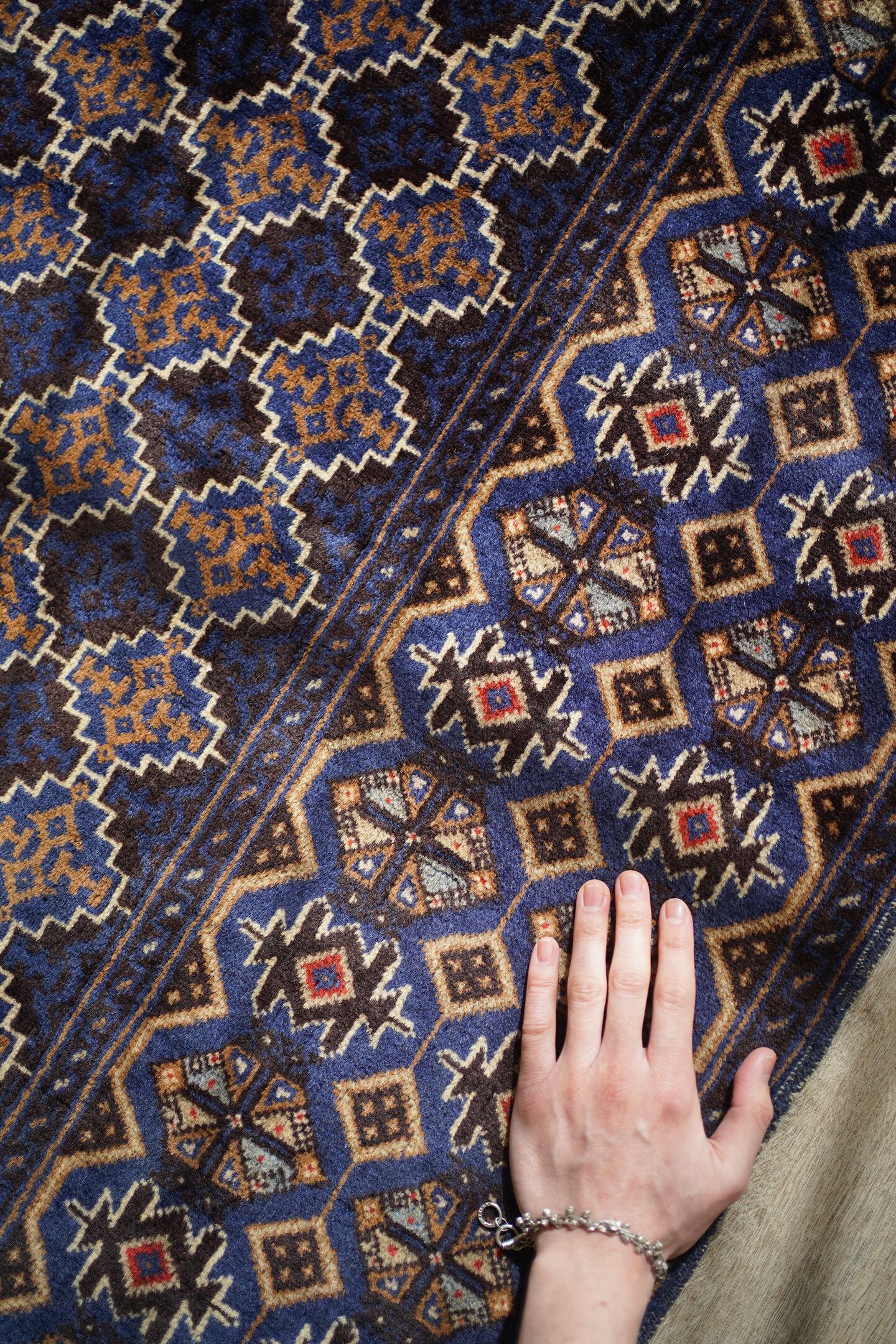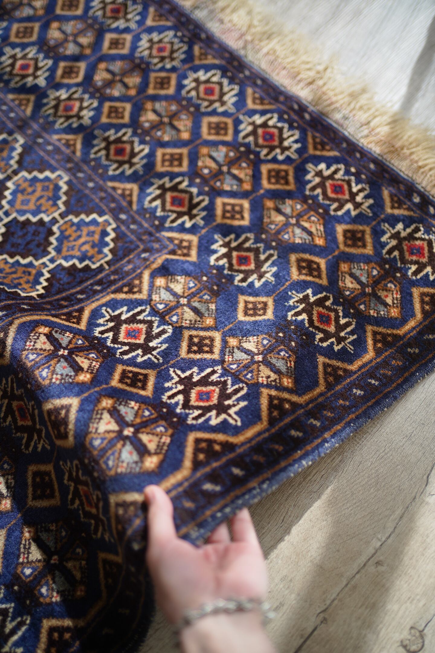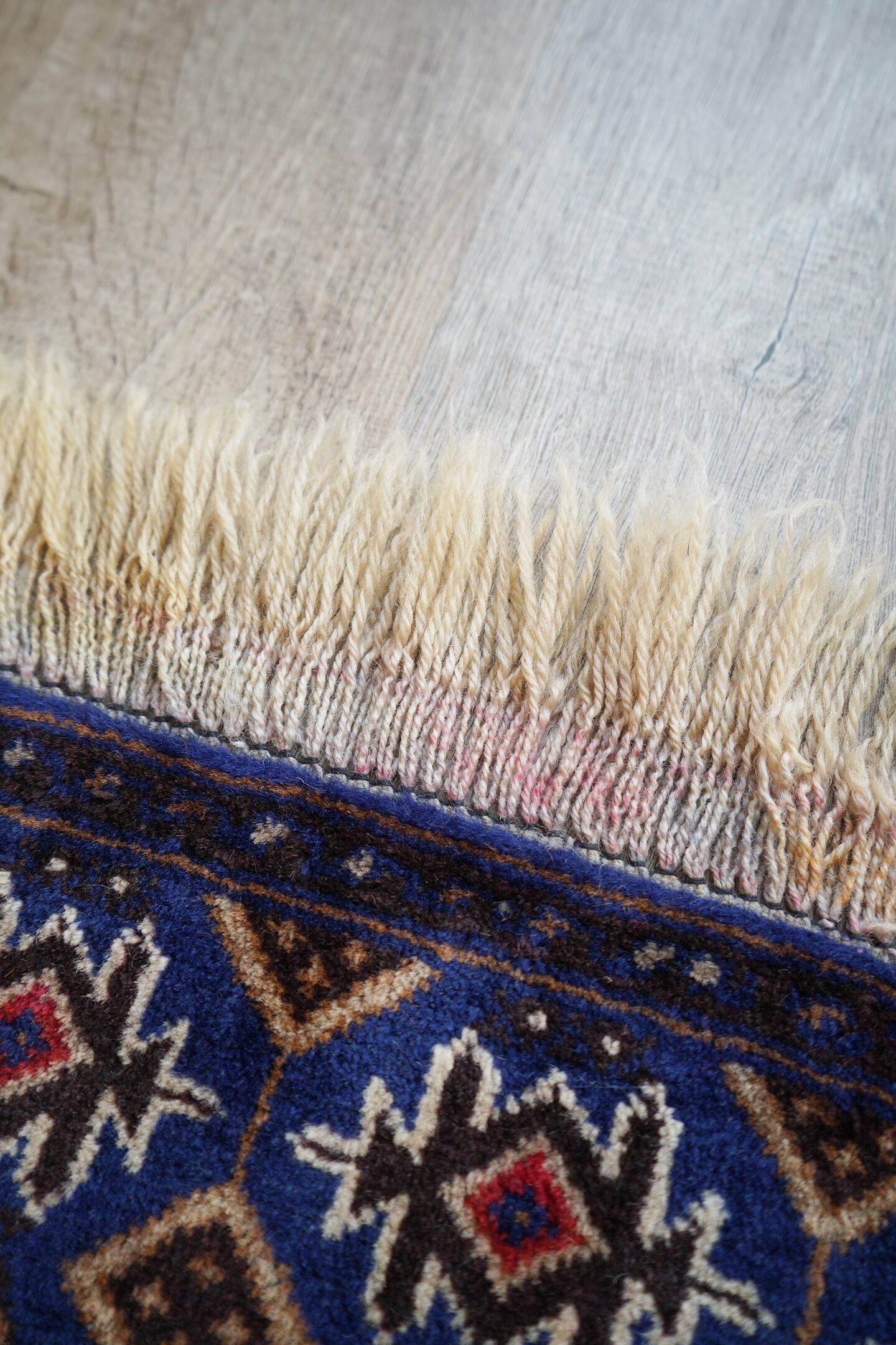 経年30年ほどのアフガニスタン産のバルーチラグ。まるでタイルのように綺麗に配列した紋様がフィールドとボーターに織り込まれた美しい一枚。ネイビー、ブルー、ブラウンの配色に差し色で細かく赤色が使用されています。パイルに光が差し込むと艶感が際立ち大変美しいです。全体的に状態と仕立てが良く、パイルの長さの均一感含めて上質感があります。コンディションとしては片方のフリンジと1箇所、色移りしているところがございますが、その他は補修跡などなく大変良好です(お写真最後の2枚をご参照ください)。サラふわっとした滑らかな肌触りで、厚みは7mm程度。リビングをはじめ、ベッドサイドやお気に入りの場所に♫