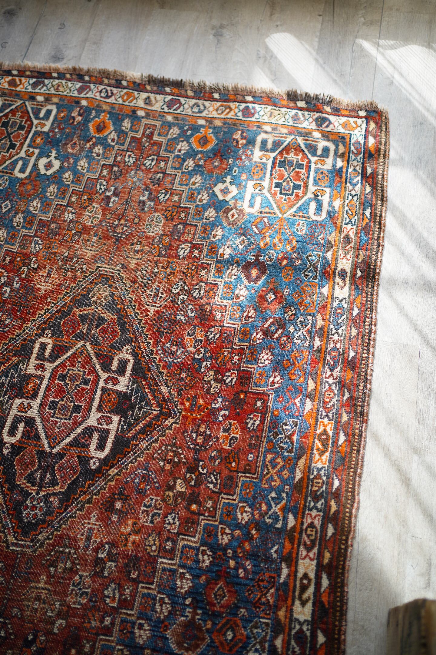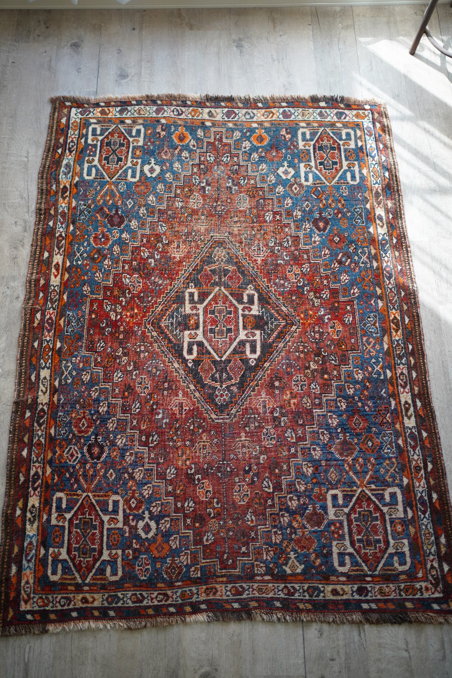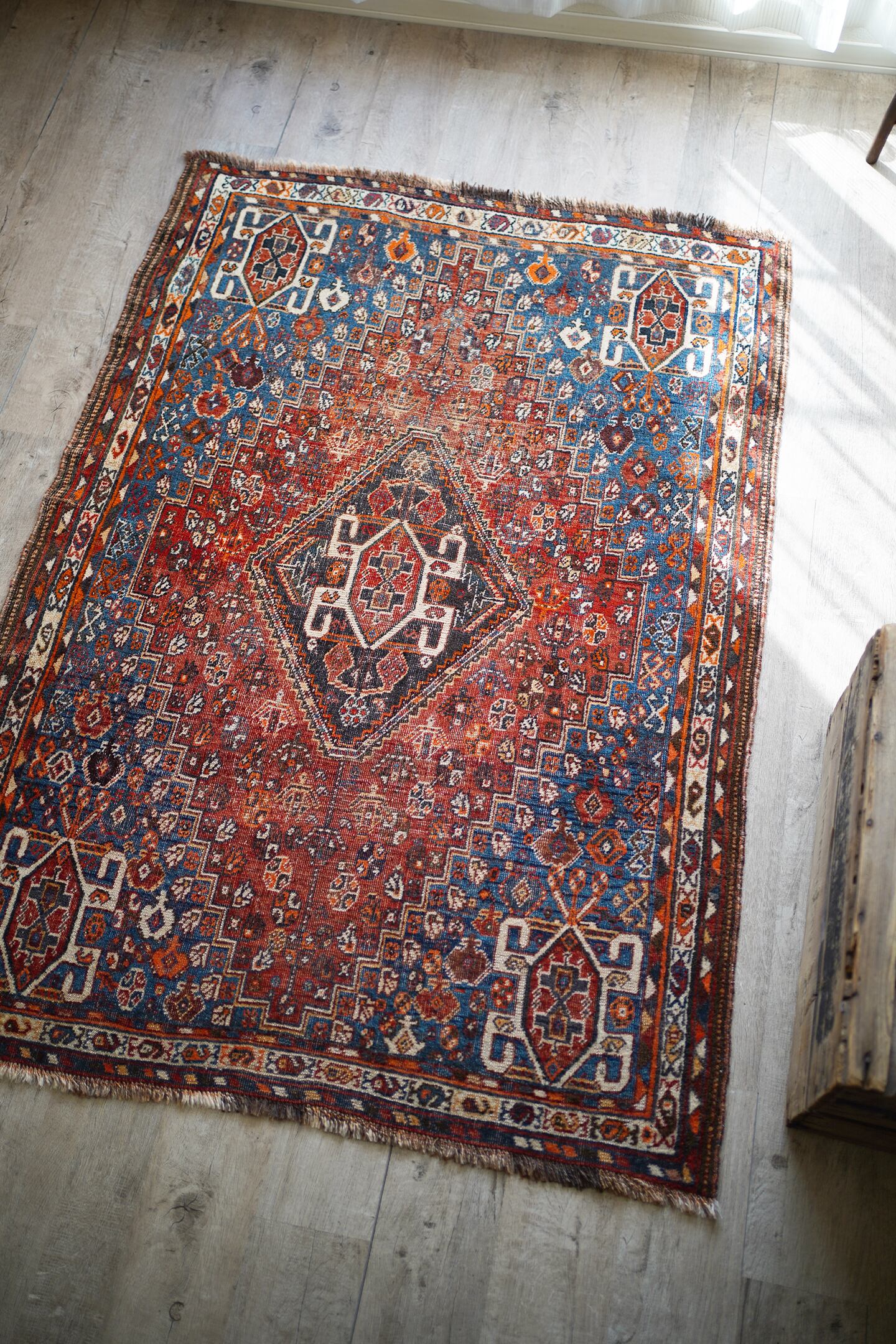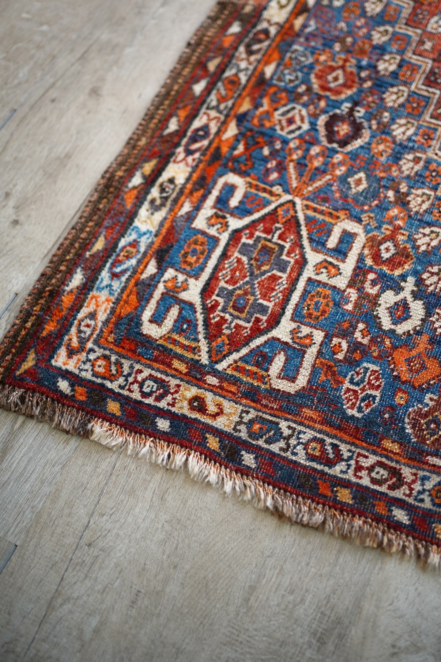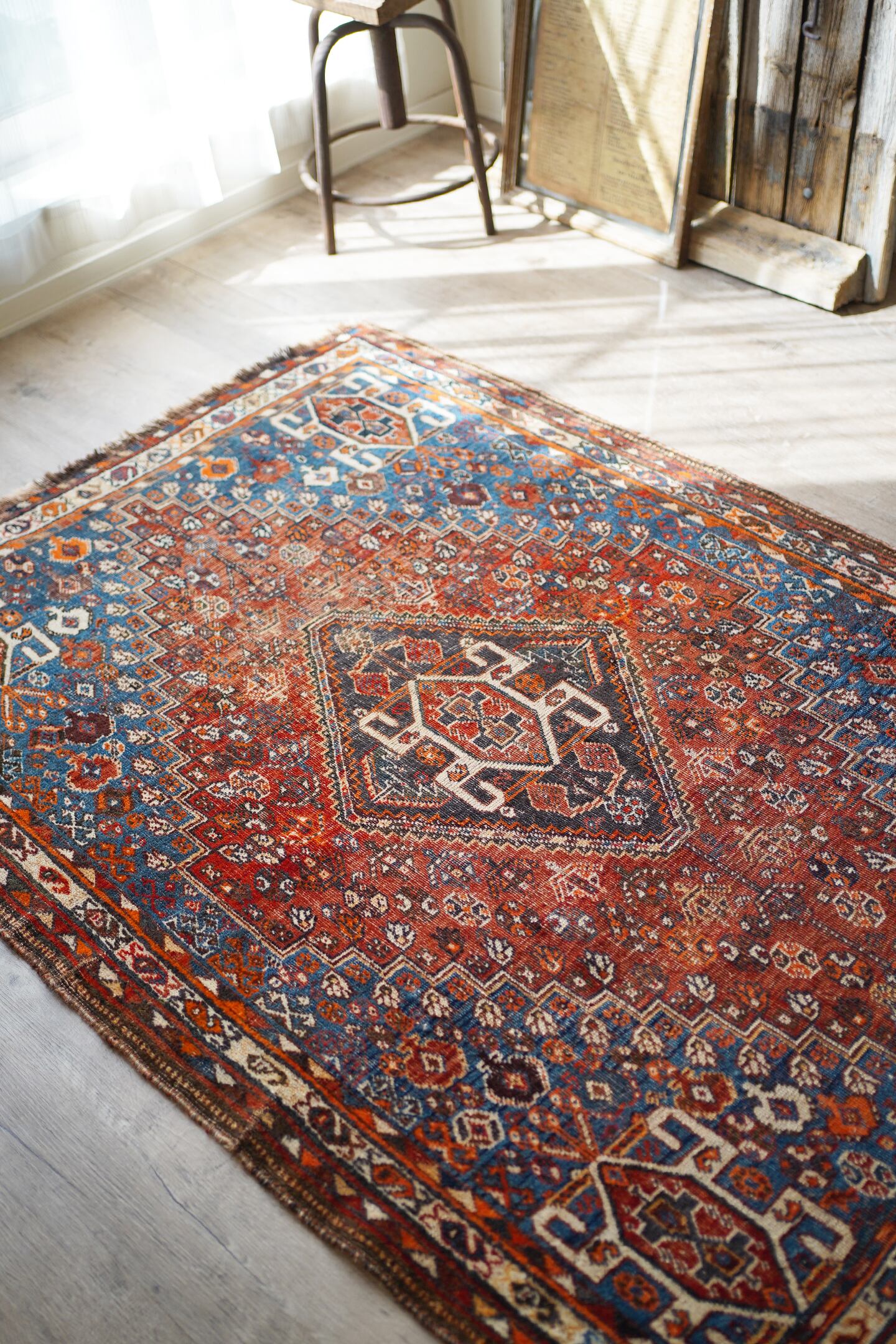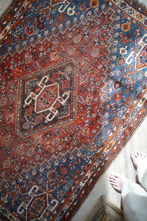 デザイン・擦れ具合・配色、3つが抜群に良く揃った経年約90年のセミアンティークのカシュガイラグです。ブラウンにも見える色褪せた赤にフィールドは青に近いブルーグリーン、差し色にオレンジと素敵な色合いです。擦れ具合で少し分かりづらいですが、よく見ると中央メダリオンの周りには人型の紋様が織り込まれています。状態としては2箇所ほど若干目立つ補修跡がありますが、それ以外は気になる点はありません(お写真最後をご参照ください)パイルは薄くなっているものの、サラふわっとした柔らかい肌触りで厚みは5mm〜6mm程度となります。アンティークの風合いがお好き、かつカシュガイラグをお探しの方に特にオススメです♪