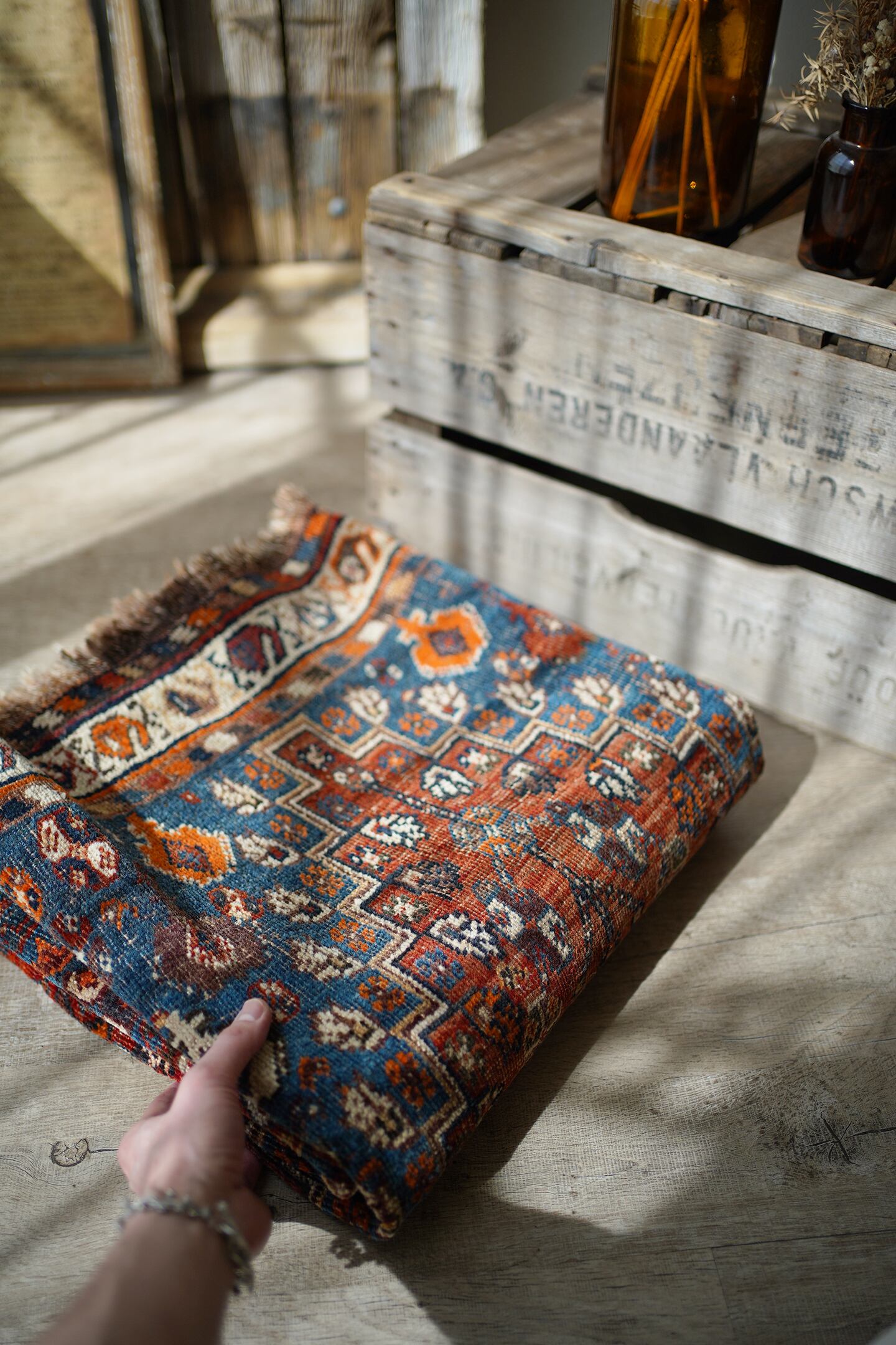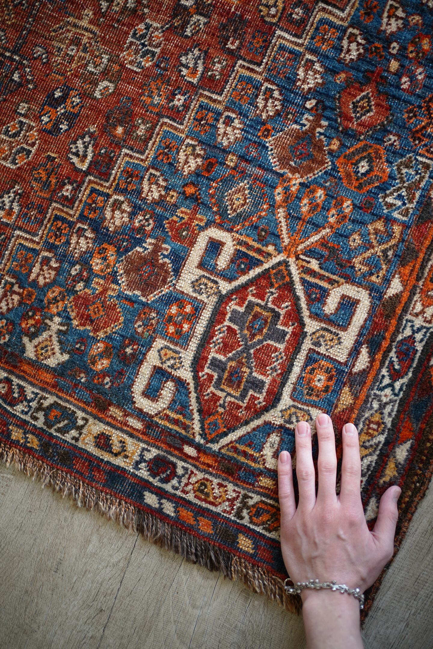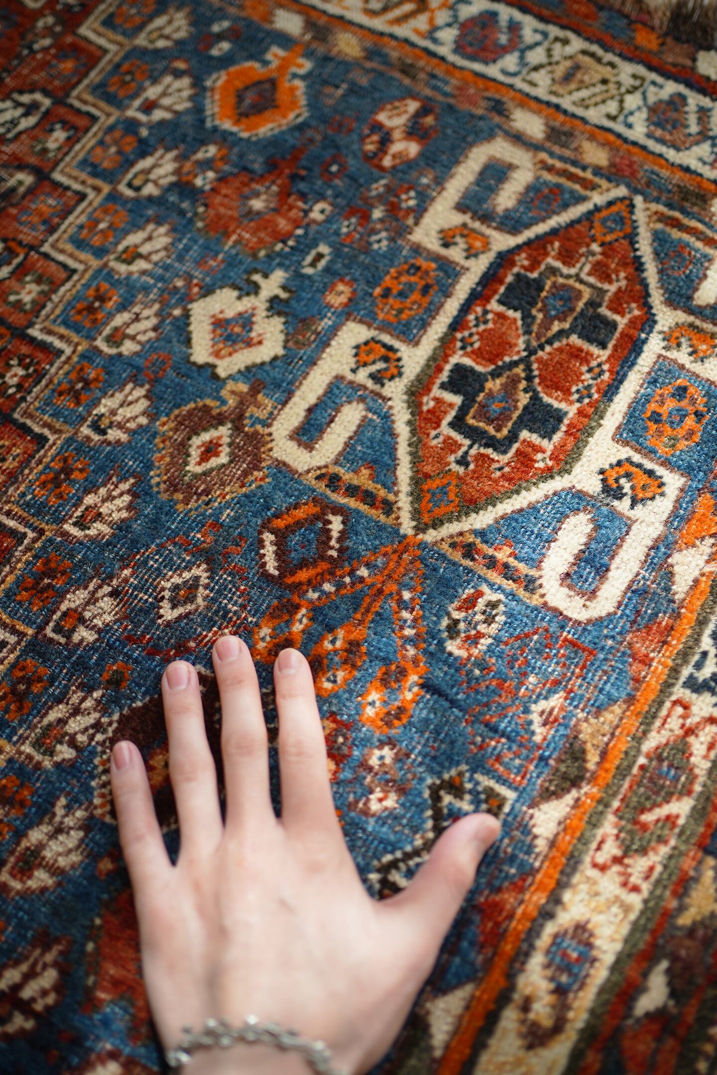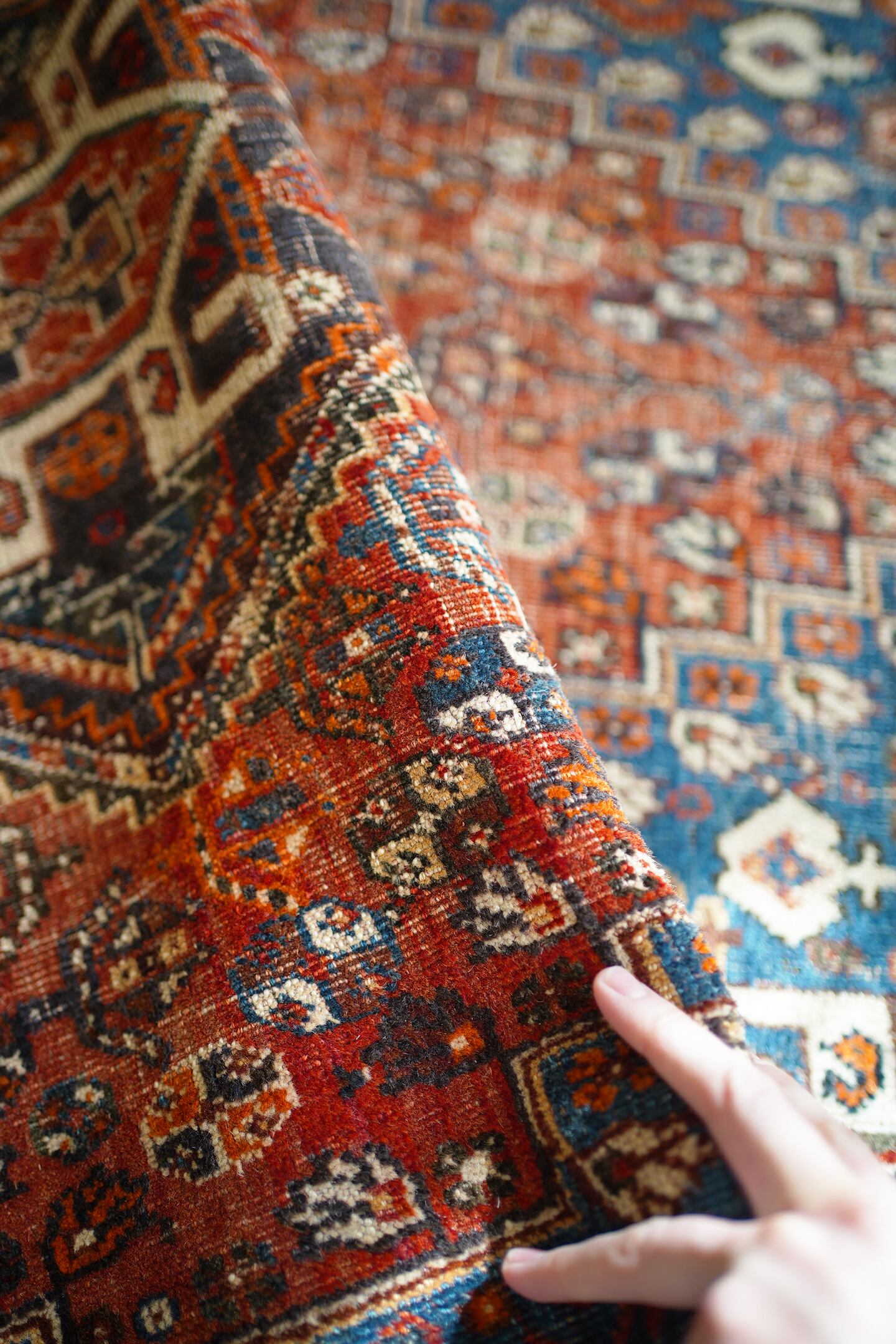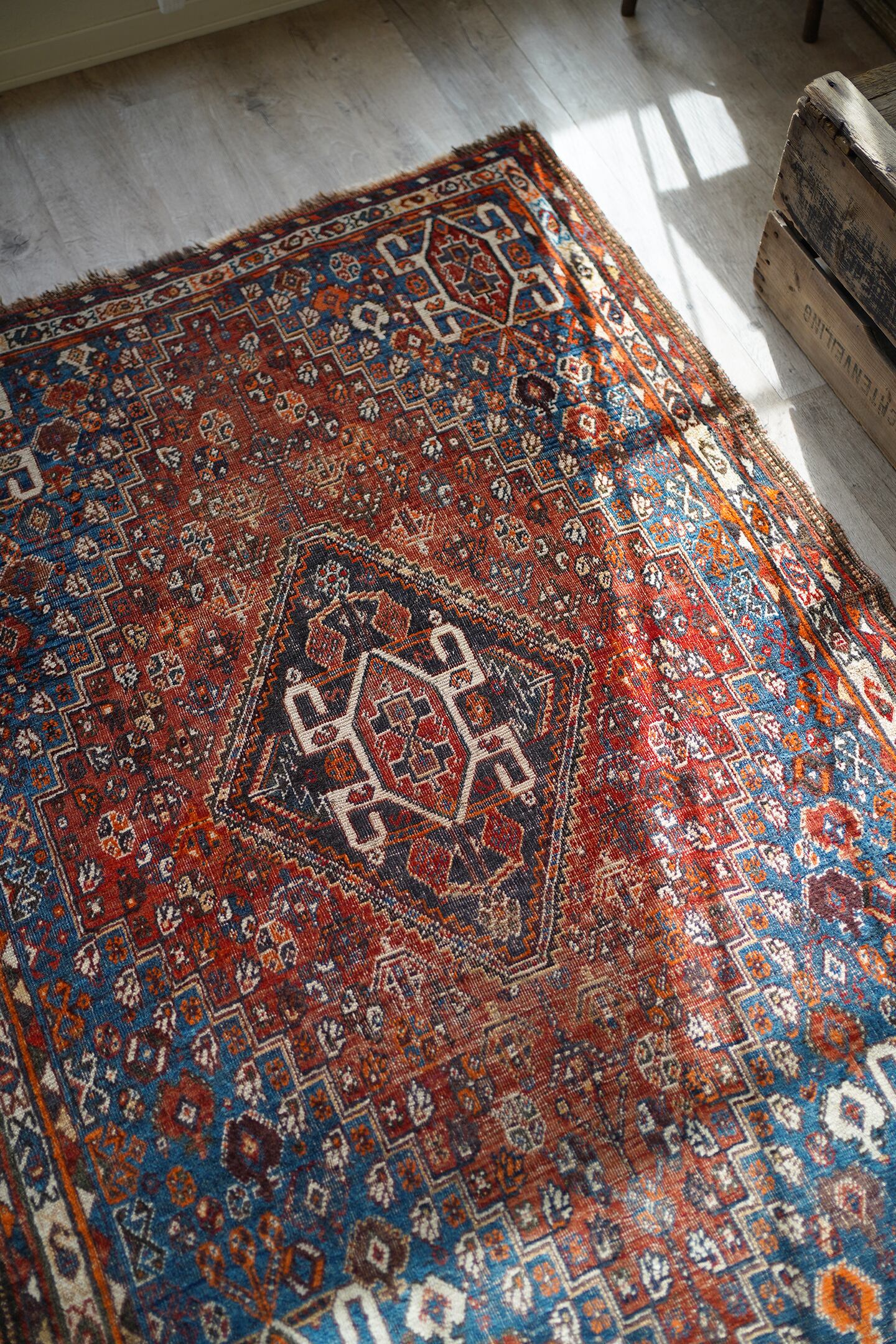 デザイン・擦れ具合・配色、3つが抜群に良く揃った経年約90年のセミアンティークのカシュガイラグです。ブラウンにも見える色褪せた赤にフィールドは青に近いブルーグリーン、差し色にオレンジと素敵な色合いです。擦れ具合で少し分かりづらいですが、よく見ると中央メダリオンの周りには人型の紋様が織り込まれています。状態としては2箇所ほど若干目立つ補修跡がありますが、それ以外は気になる点はありません(お写真最後をご参照ください)パイルは薄くなっているものの、サラふわっとした柔らかい肌触りで厚みは5mm〜6mm程度となります。アンティークの風合いがお好き、かつカシュガイラグをお探しの方に特にオススメです♪