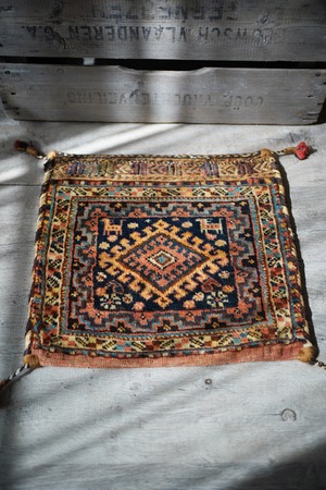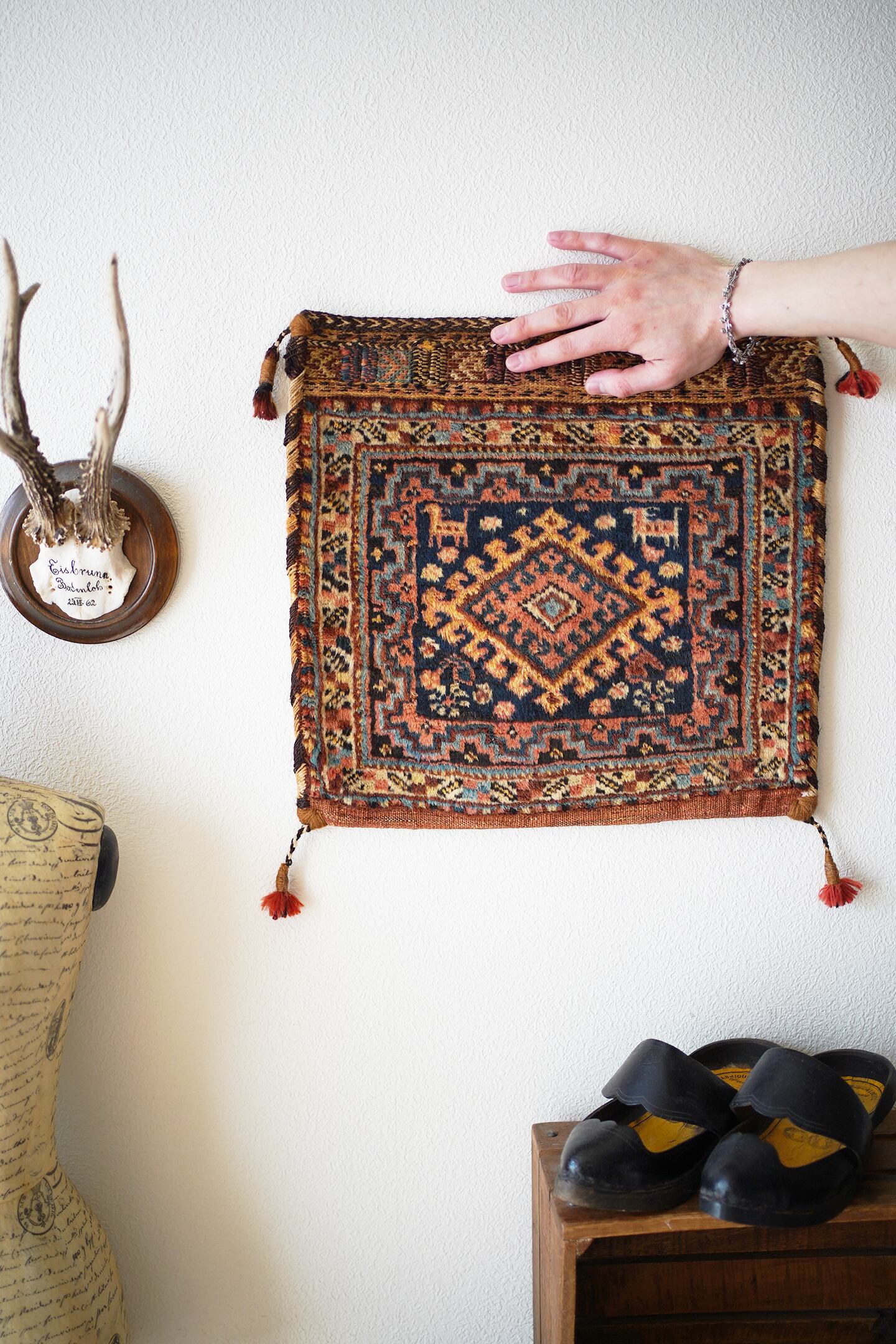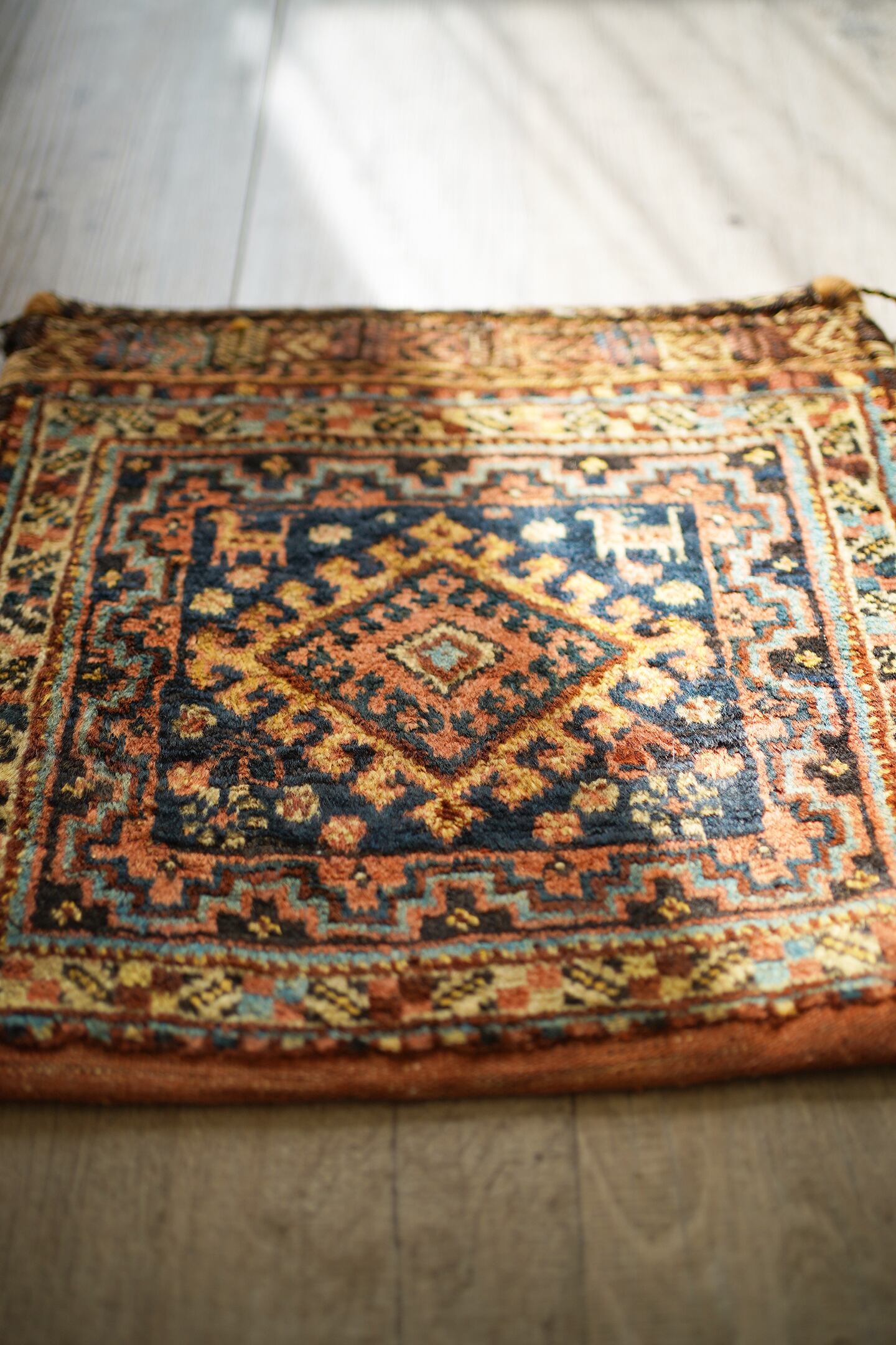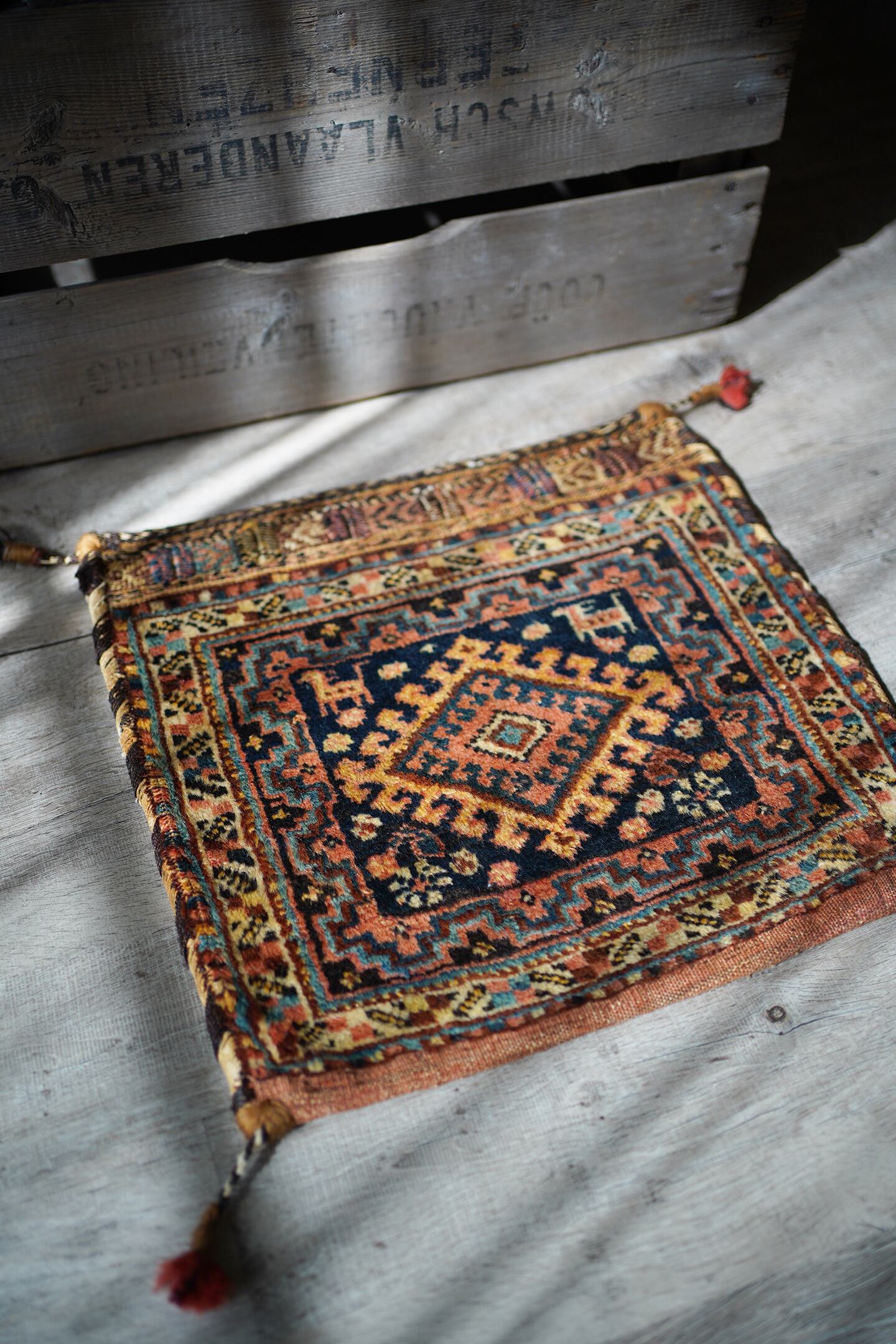 約80年前にアフシャール族によって作られたソルトバッグです。遊牧民たちが移動する際に、岩塩の持ち運びに使ったと言われています。様々な色を使いつつも、バランスの良い配色が本当に美しく、小さいながらも存在感があります。中央のフックドメダリオンの周りには2匹の動物が織り込まれており、また可愛らしいポイントです。お付き合いのあるイランの職人さんにお願いして、周りの紐部分や裏側などを綺麗に修理していただきました。厚みは1.2cmほどで、表面の毛並みはサラふわっとした優しい肌触り。コンディションも大変良好です。壁に掛けてタペストリーとして飾ればとっても素敵にお部屋を彩ってくれますよ♪