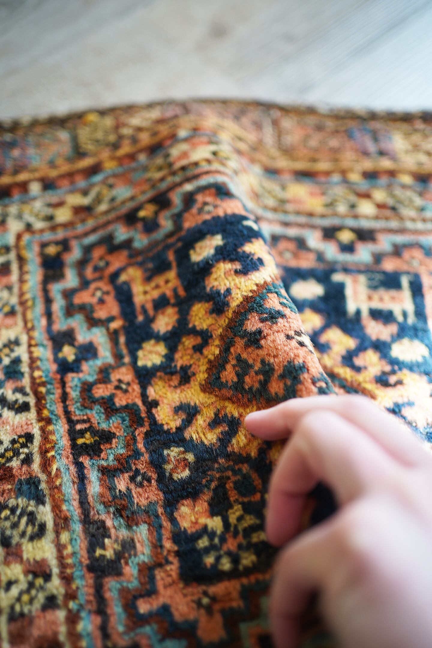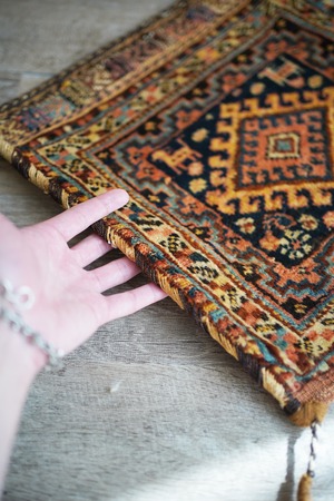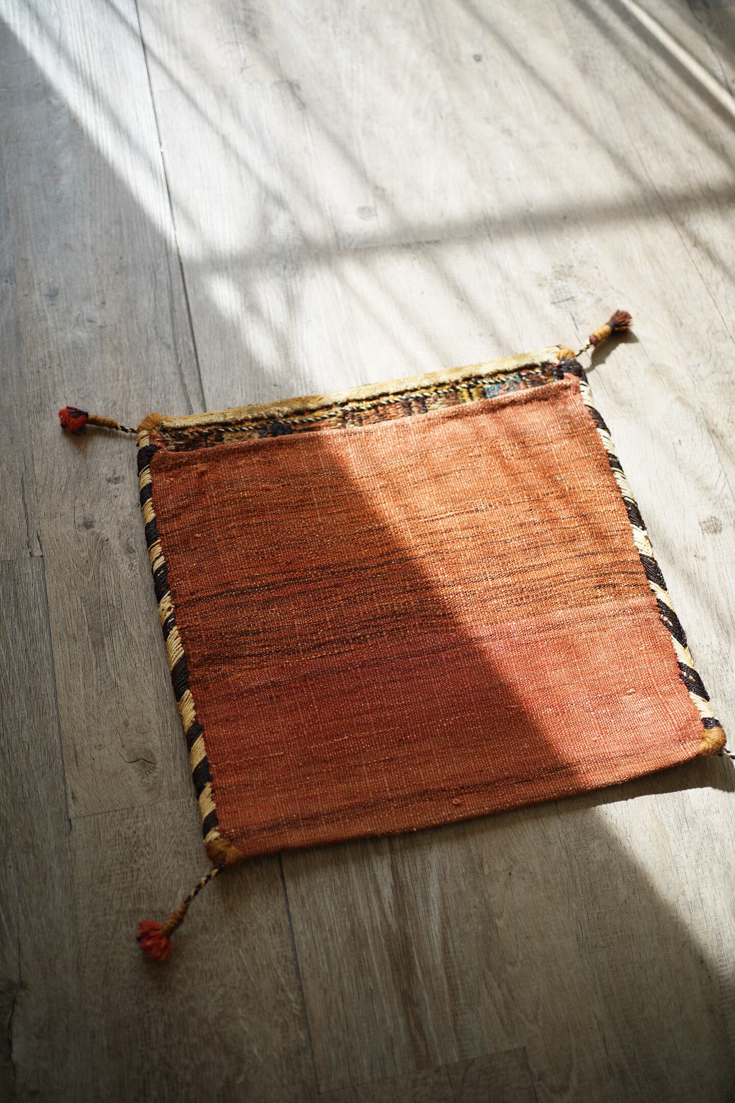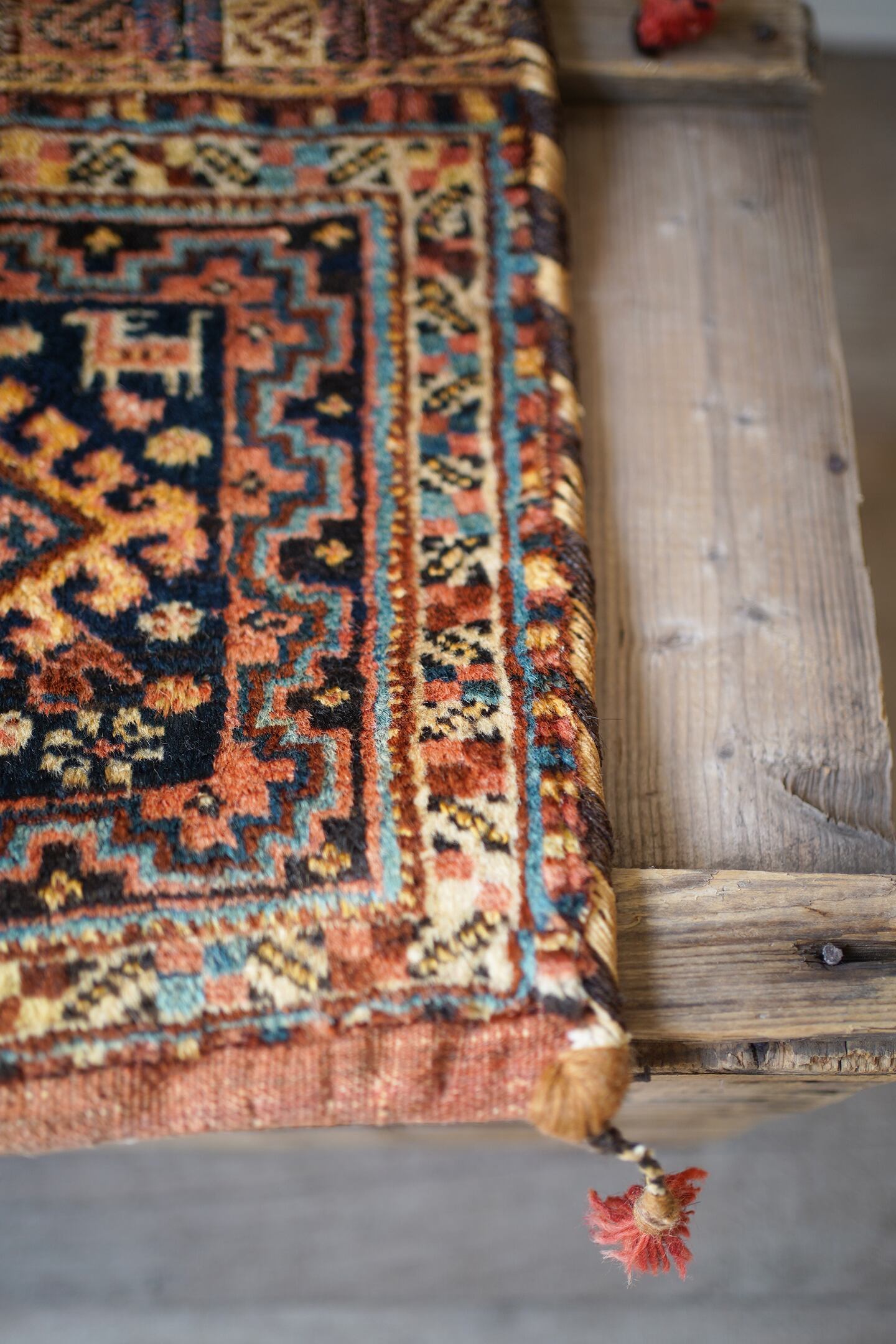約80年前にアフシャール族によって作られたソルトバッグです。遊牧民たちが移動する際に、岩塩の持ち運びに使ったと言われています。様々な色を使いつつも、バランスの良い配色が本当に美しく、小さいながらも存在感があります。中央のフックドメダリオンの周りには2匹の動物が織り込まれており、また可愛らしいポイントです。お付き合いのあるイランの職人さんにお願いして、周りの紐部分や裏側などを綺麗に修理していただきました。厚みは1.2cmほどで、表面の毛並みはサラふわっとした優しい肌触り。コンディションも大変良好です。壁に掛けてタペストリーとして飾ればとっても素敵にお部屋を彩ってくれますよ♪