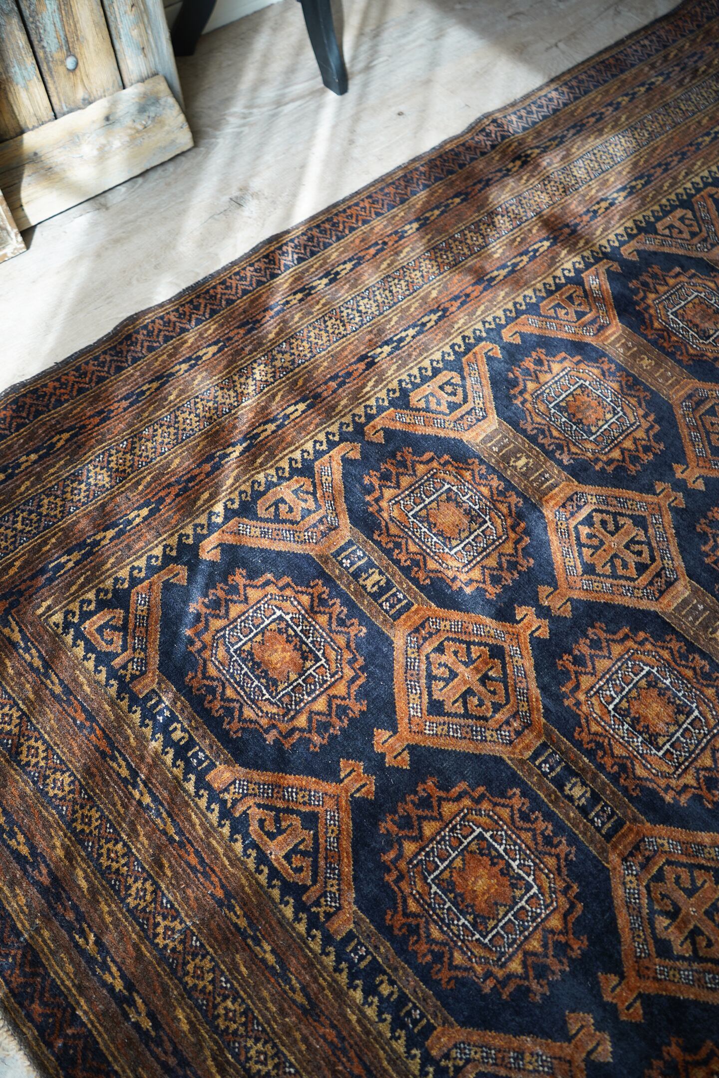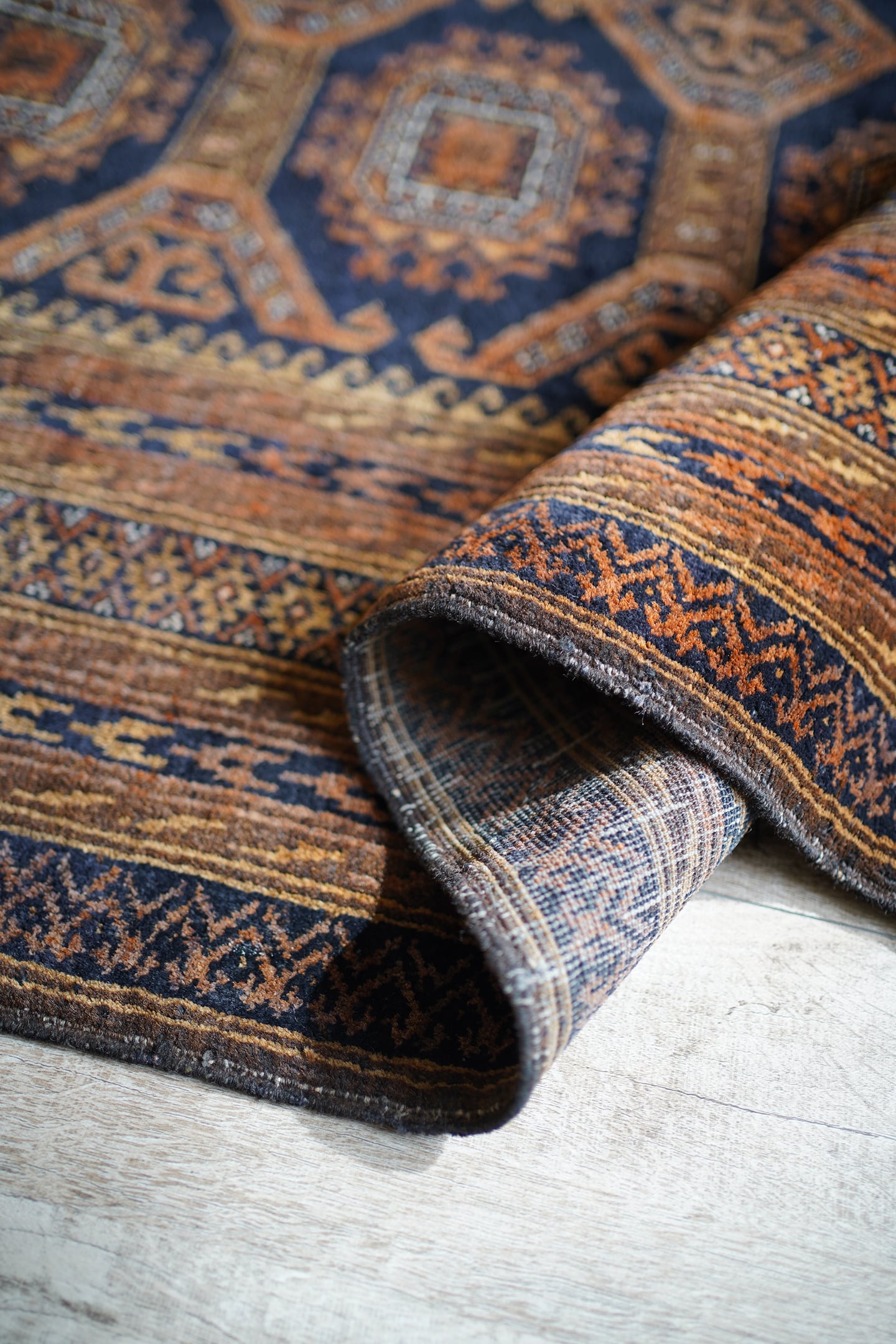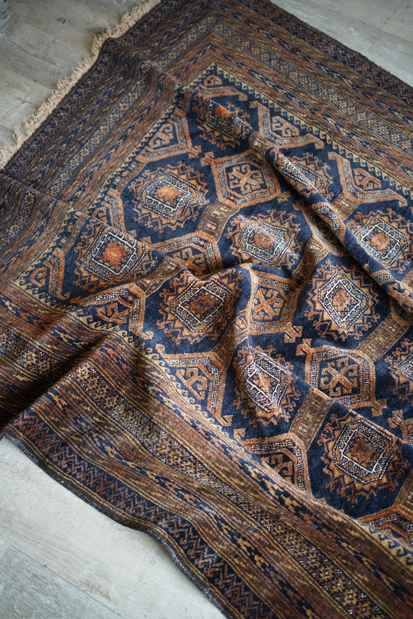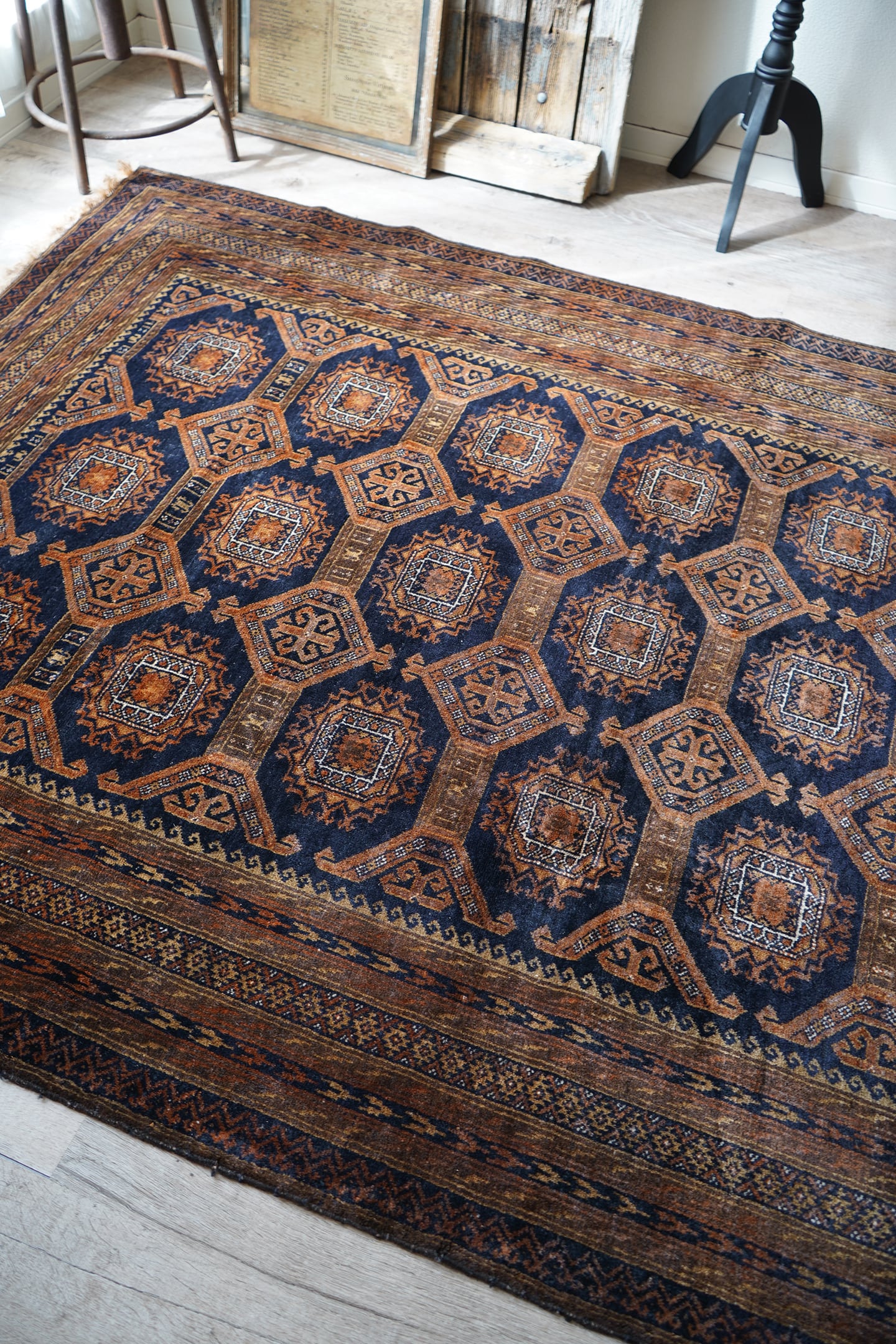 約50年ほど前にアフガニスタンのバルーチ族によって作られたラグです。デザインはトルクメン族のサロール支族が織っていた家紋である"サロールギュル"という柄が模して織り込まれています。落ち着きのあるブラウンカラーに濃紺の組み合わせの配色でとても渋くてカッコ良いです。表面はふわっとした柔らかい触り心地、厚みは7mmほどとなります。コンディションとしては、小さく2箇所補修跡がありますが、ほとんど目立ちません(お写真最後をご参照ください)。またフリンジの長さが不均一な箇所がございます(お写真最後から2番目をご参照ください)。落ち着いた雰囲気でありながら存在感も感じられる素晴らしいラグですので、ぜひリビングの主役としてお迎えいただければと思います♪