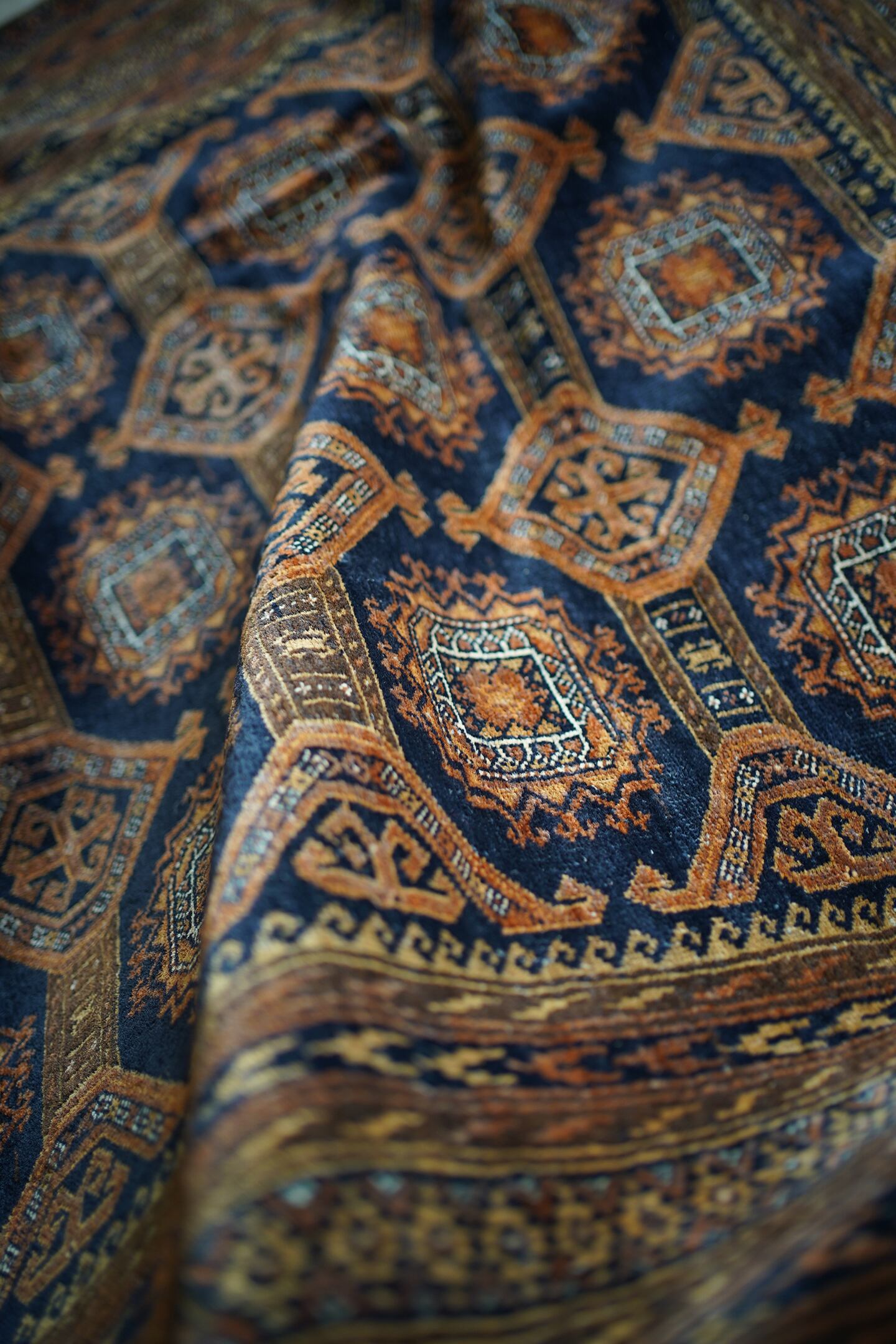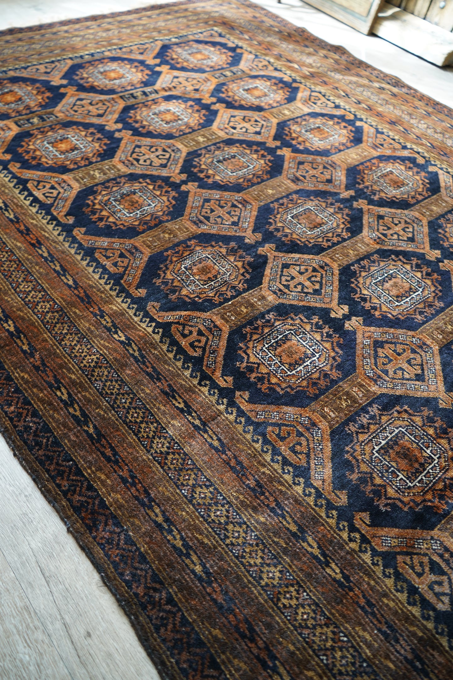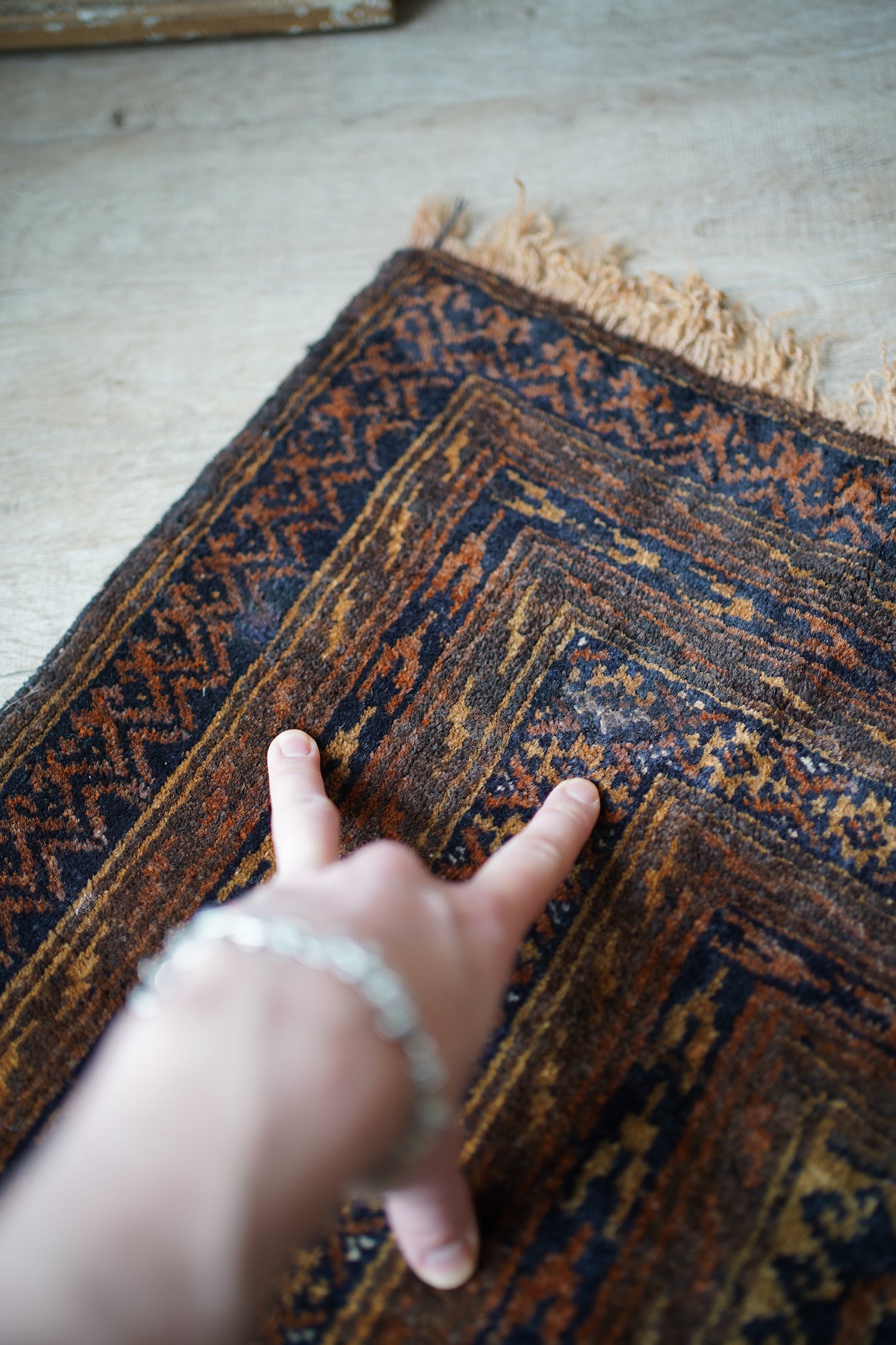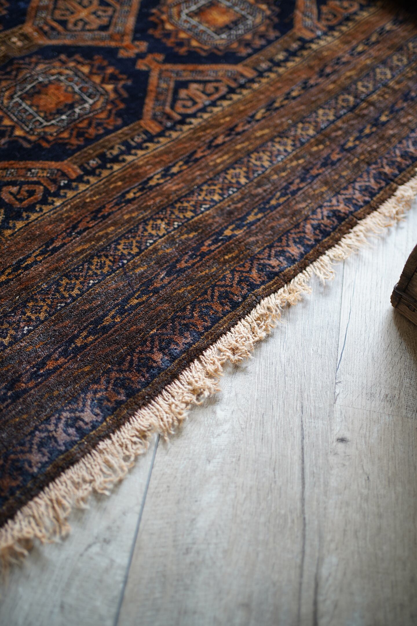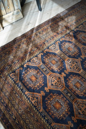 約50年ほど前にアフガニスタンのバルーチ族によって作られたラグです。デザインはトルクメン族のサロール支族が織っていた家紋である"サロールギュル"という柄が模して織り込まれています。落ち着きのあるブラウンカラーに濃紺の組み合わせの配色でとても渋くてカッコ良いです。表面はふわっとした柔らかい触り心地、厚みは7mmほどとなります。コンディションとしては、小さく2箇所補修跡がありますが、ほとんど目立ちません(お写真最後をご参照ください)。またフリンジの長さが不均一な箇所がございます(お写真最後から2番目をご参照ください)。落ち着いた雰囲気でありながら存在感も感じられる素晴らしいラグですので、ぜひリビングの主役としてお迎えいただければと思います♪