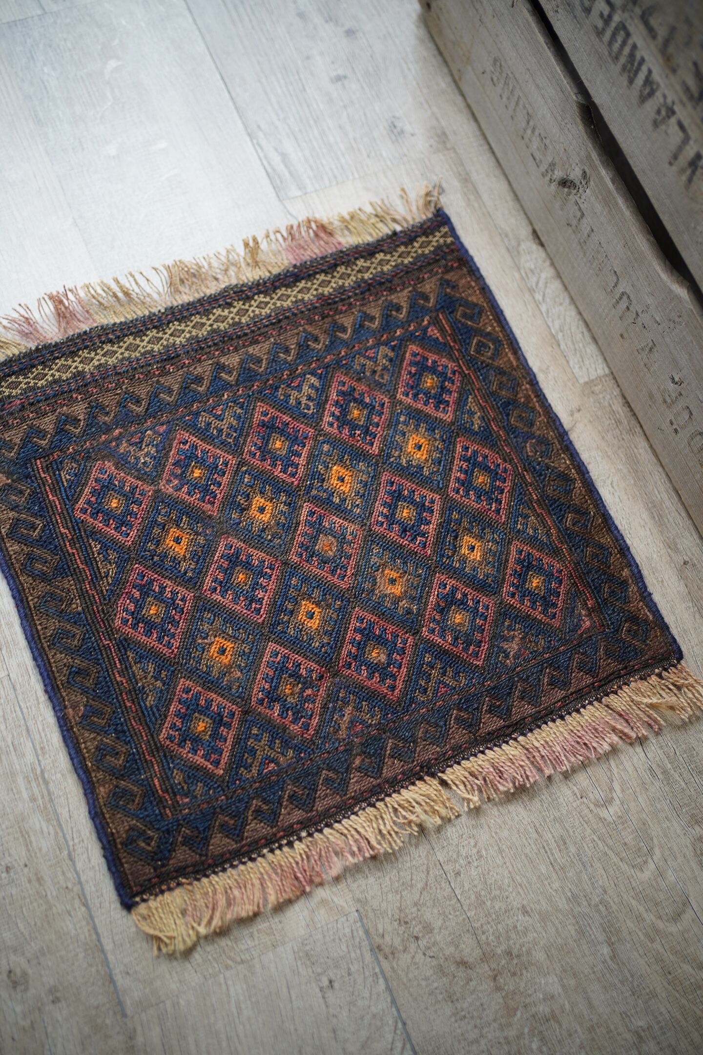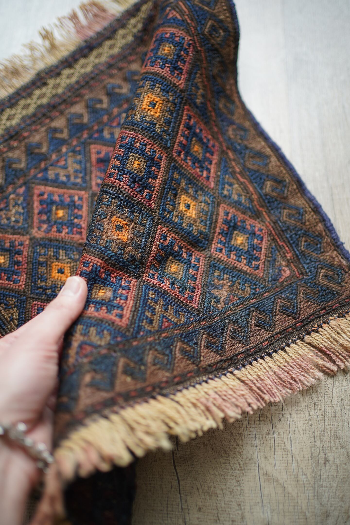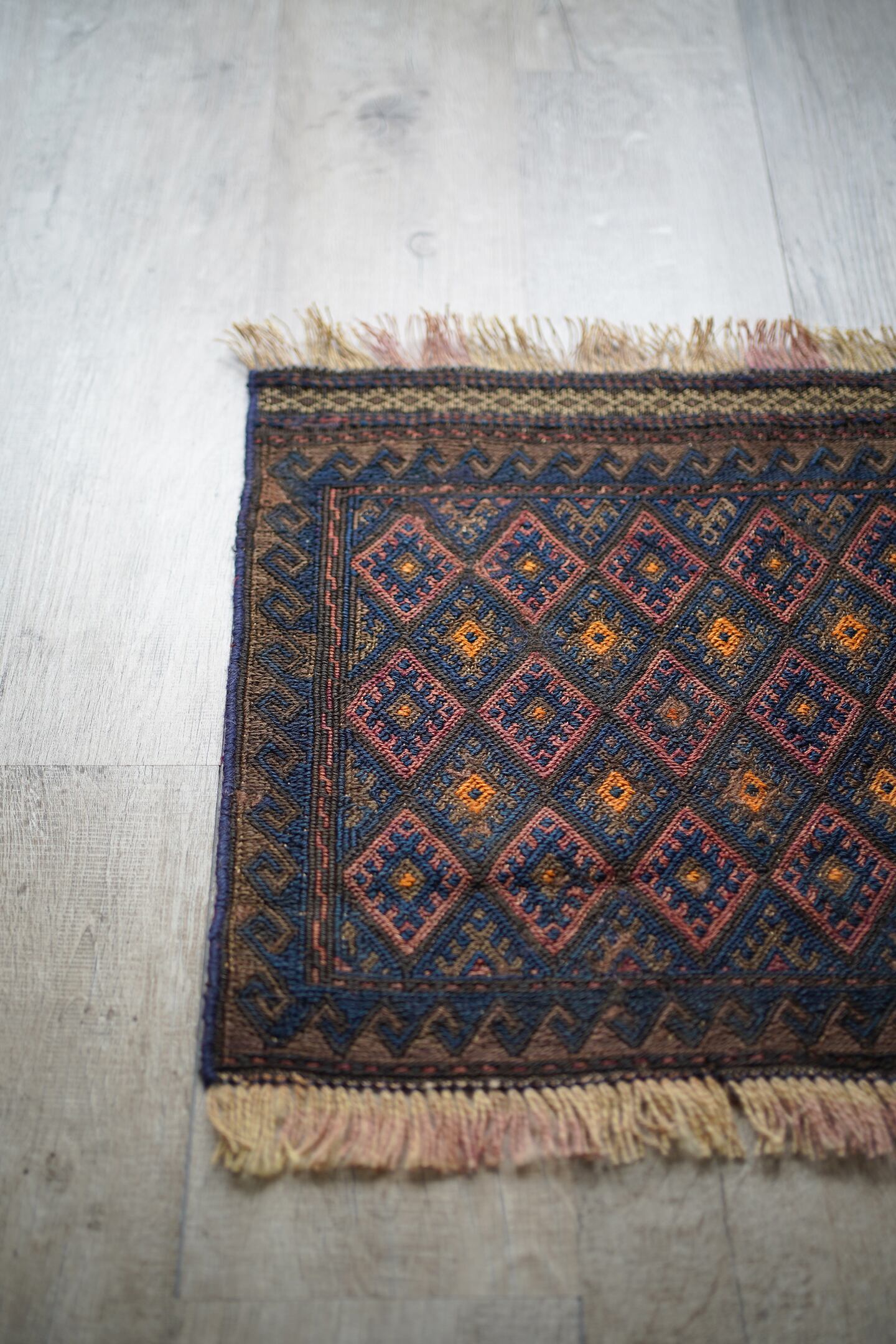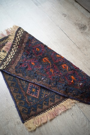 経年70年〜80年ほどの前にバルーチ族によって作られたスマック織りのキリムです。茶色と濃紺ベースの配色に、あずき色と薄いオレンジが使用されています。サラサラとした肌触りで、厚みは4mm程度。薄手で軽いので、壁に飾ってもとっても素敵です。コンディションも問題なくパーフェクト。