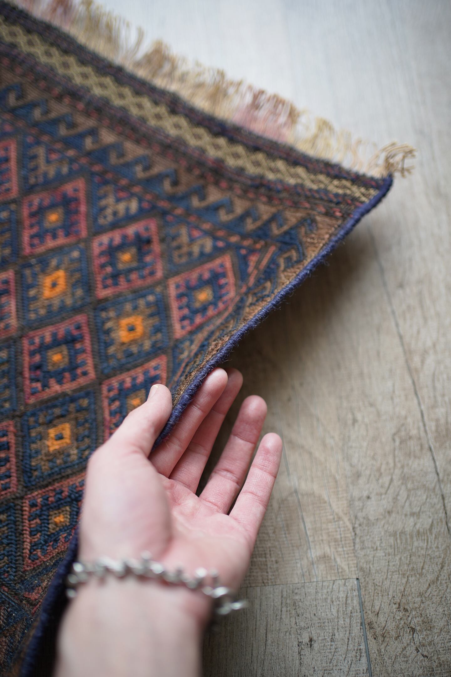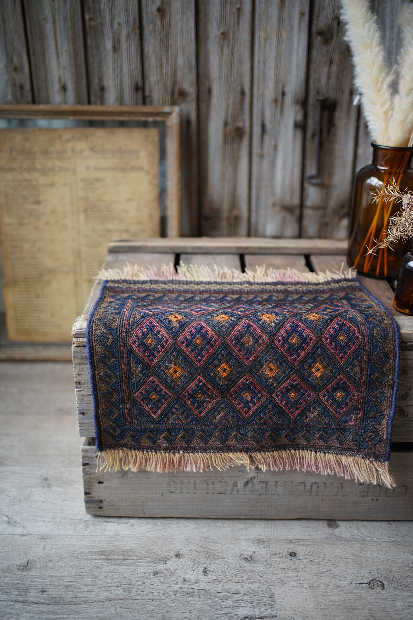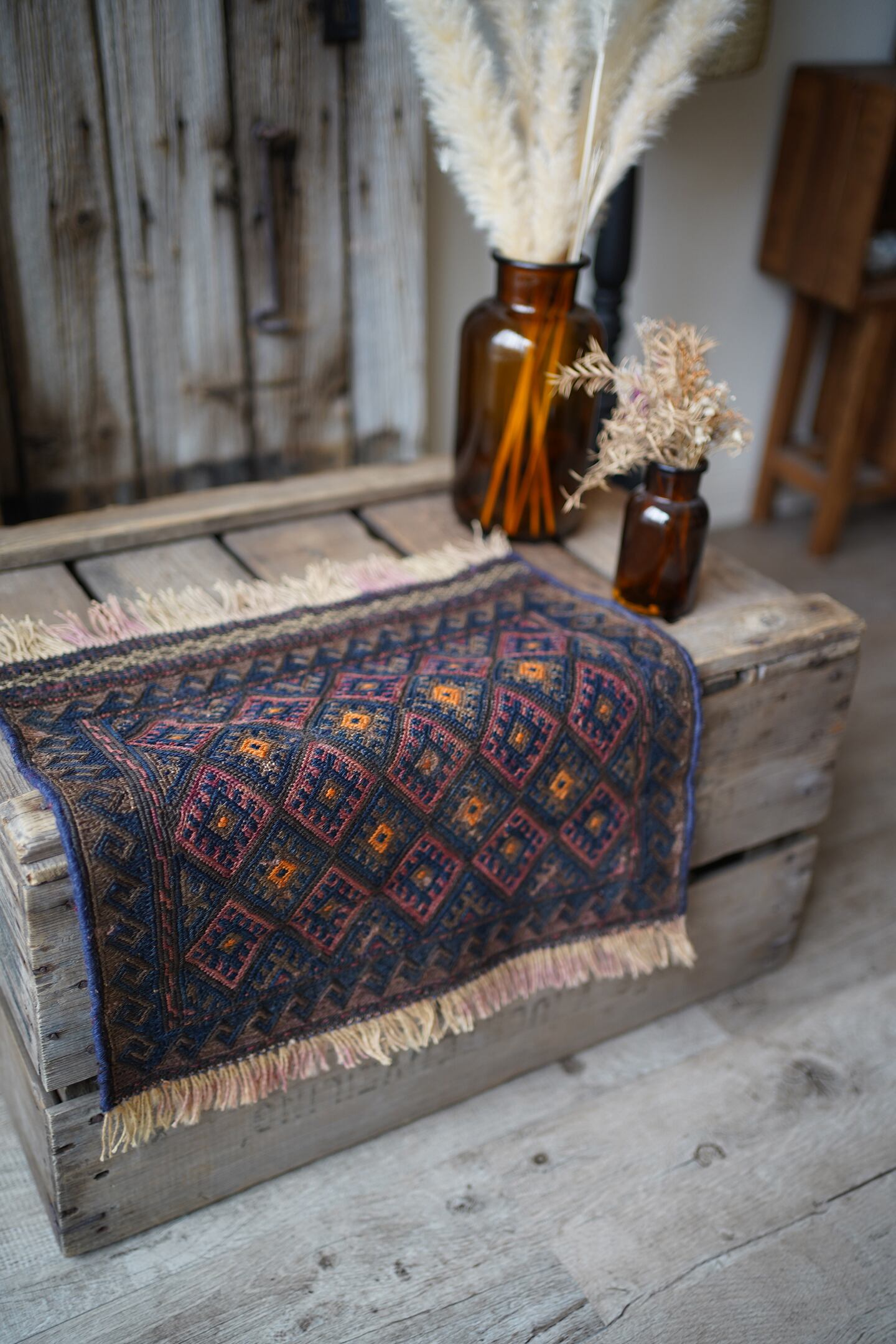 経年70年〜80年ほどの前にバルーチ族によって作られたスマック織りのキリムです。茶色と濃紺ベースの配色に、あずき色と薄いオレンジが使用されています。サラサラとした肌触りで、厚みは4mm程度。薄手で軽いので、壁に飾ってもとっても素敵です。コンディションも問題なくパーフェクト。