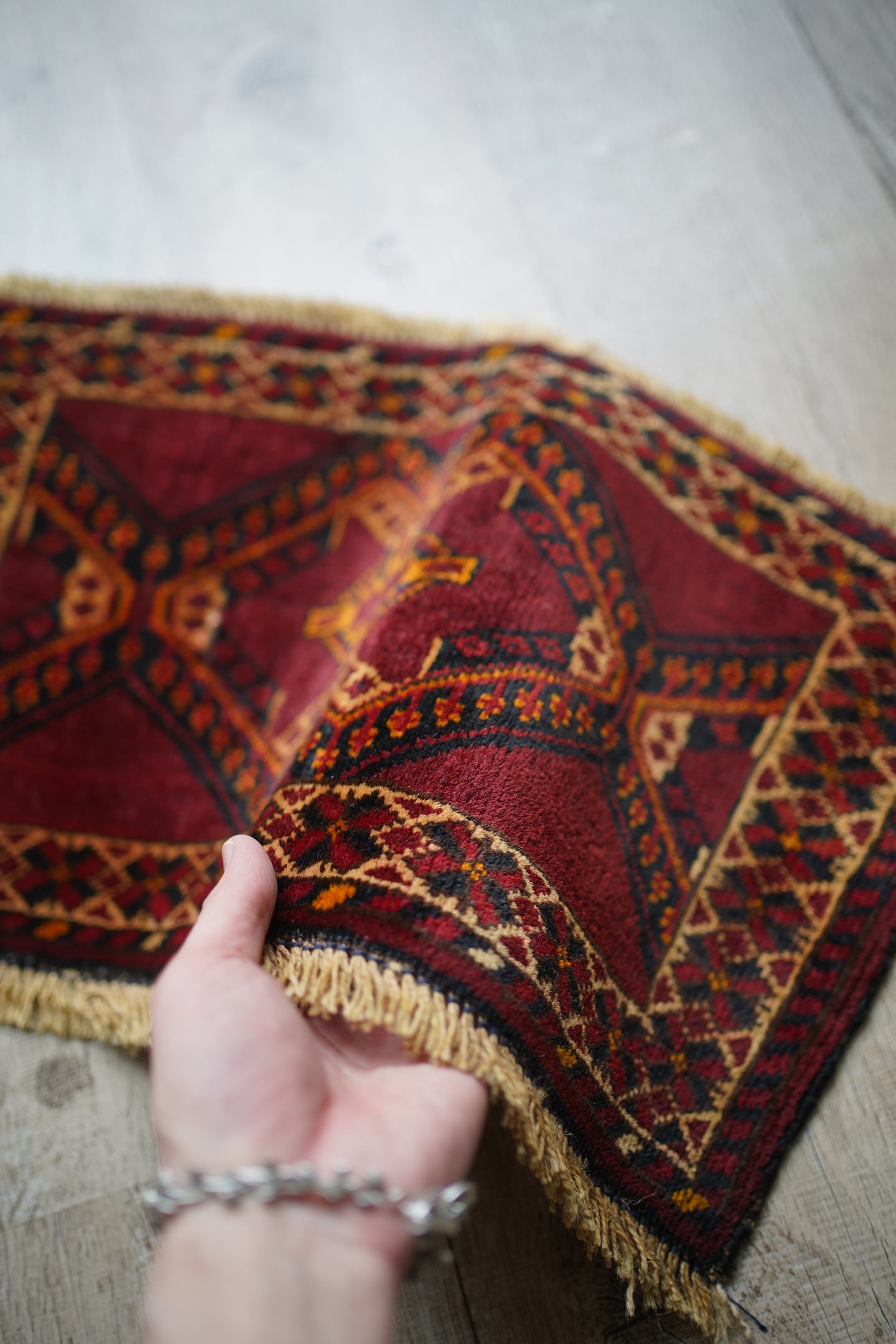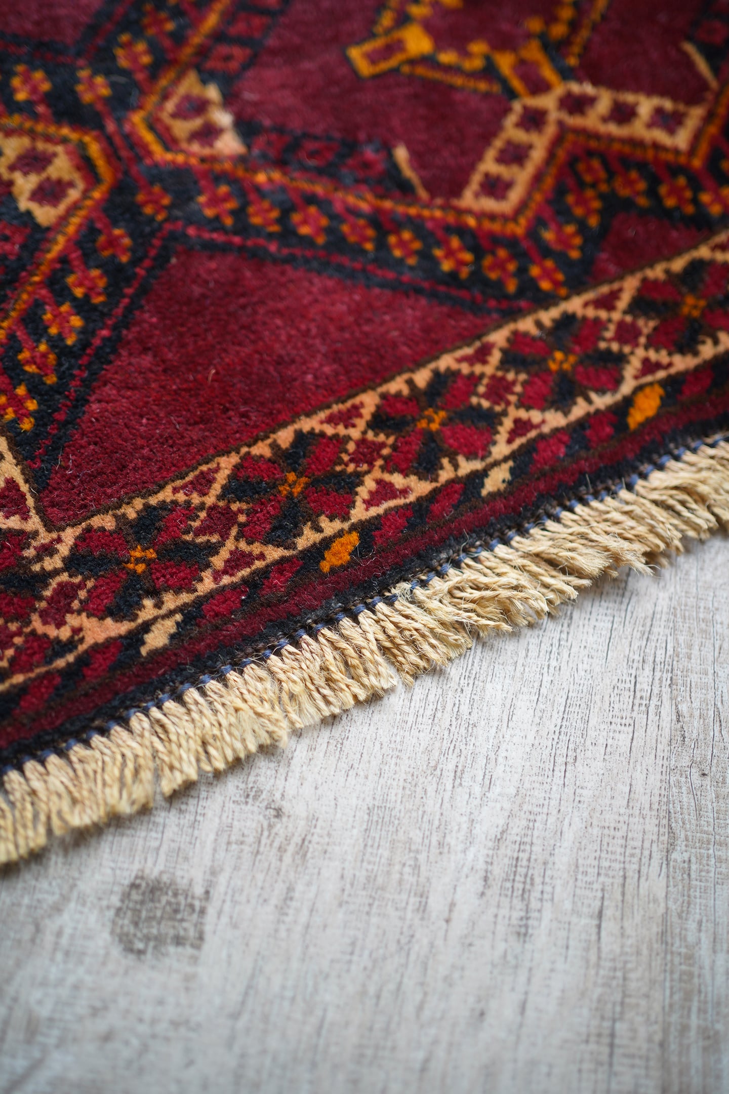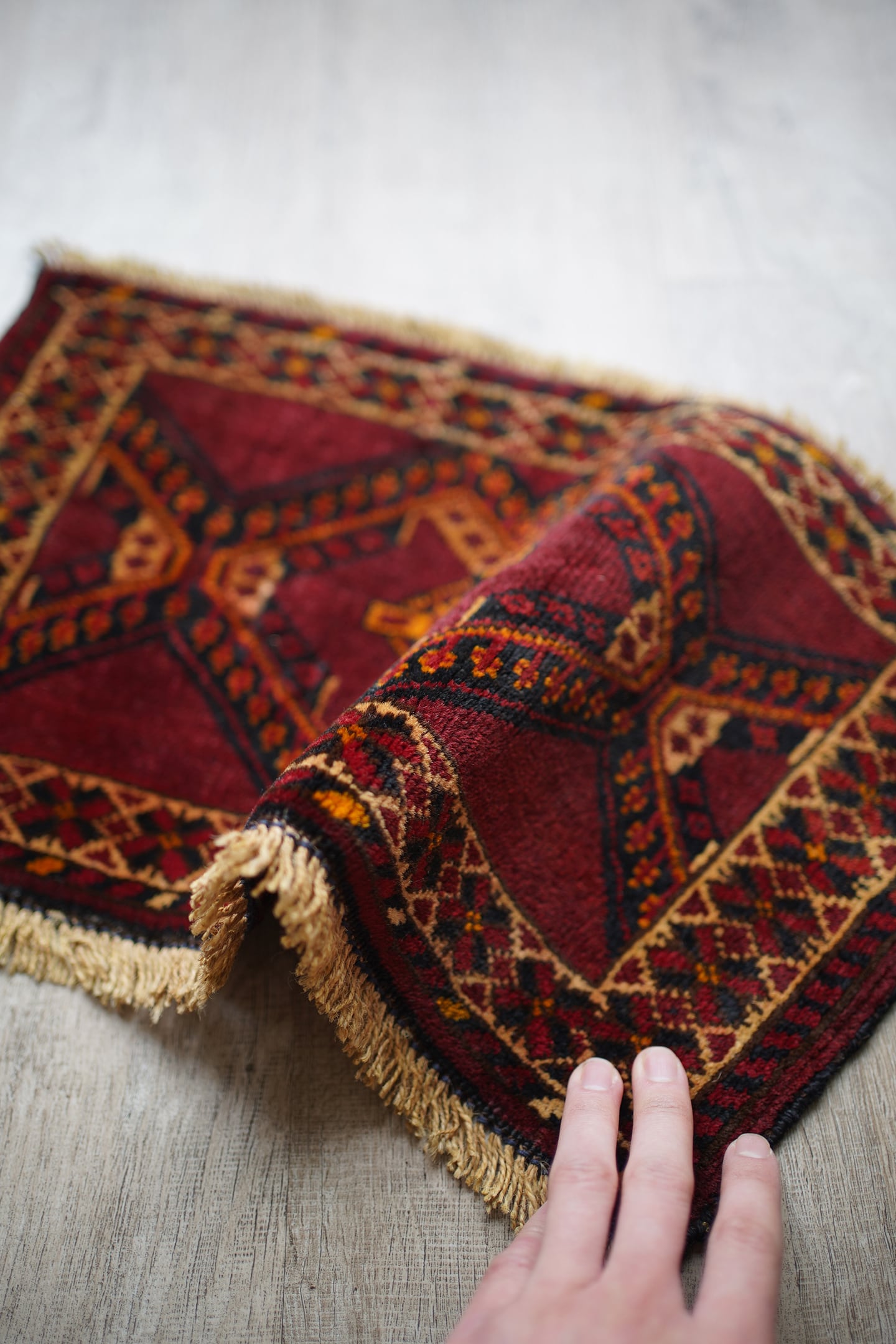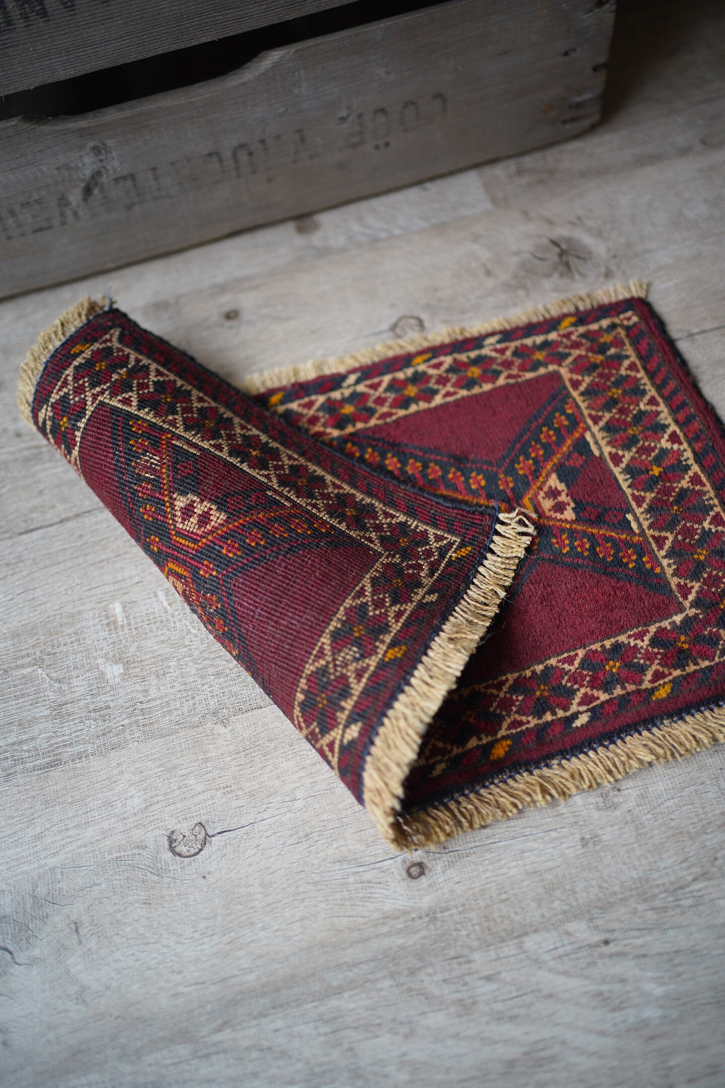 経年50年〜60年ほどのトルクメンラグ。暗めのボルドー色ベースで、艶もある美しい一枚です。柄はハザールギュルと呼ばれる紋様が大きく織り込まれています。ふわふわとした滑らかな肌触り、厚みは6mmほどになります。目立ちませんが1箇所、補修跡があります(お写真最後をご参照ください)。また手織りラグ特有の歪みが少しございますので俯瞰写真にてご確認ください。チェスト上に敷くのにオススメなサイズ感です♪