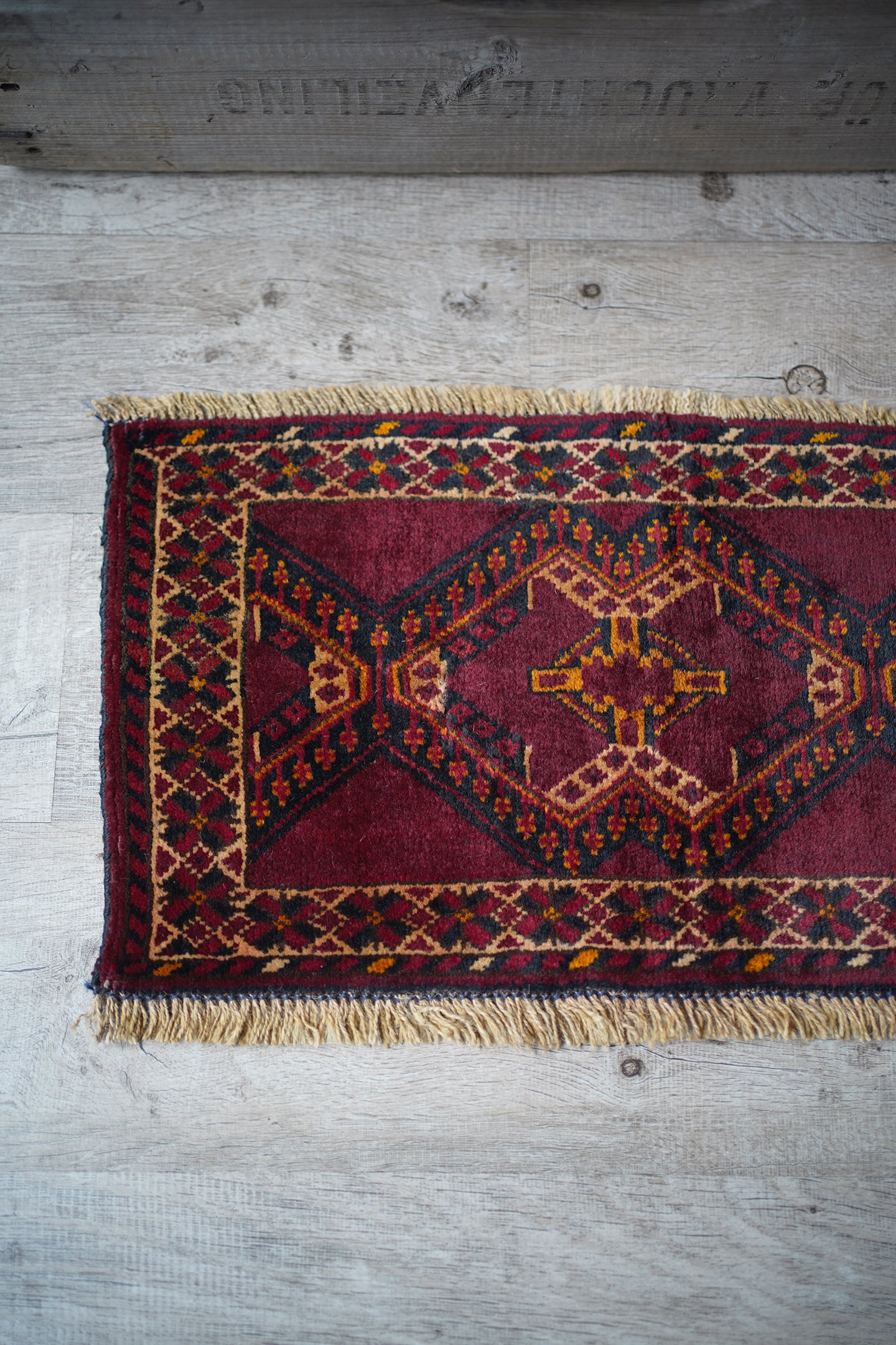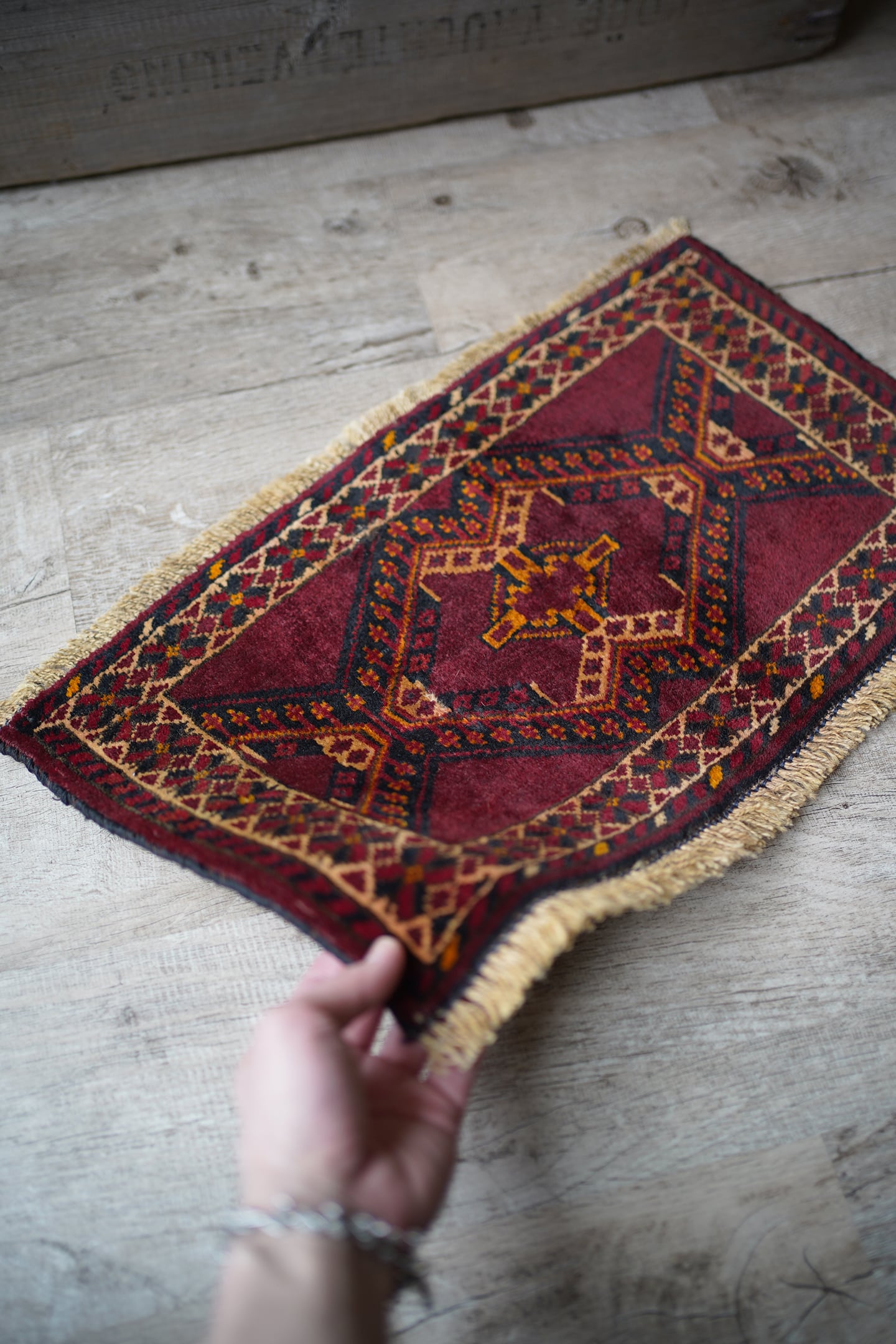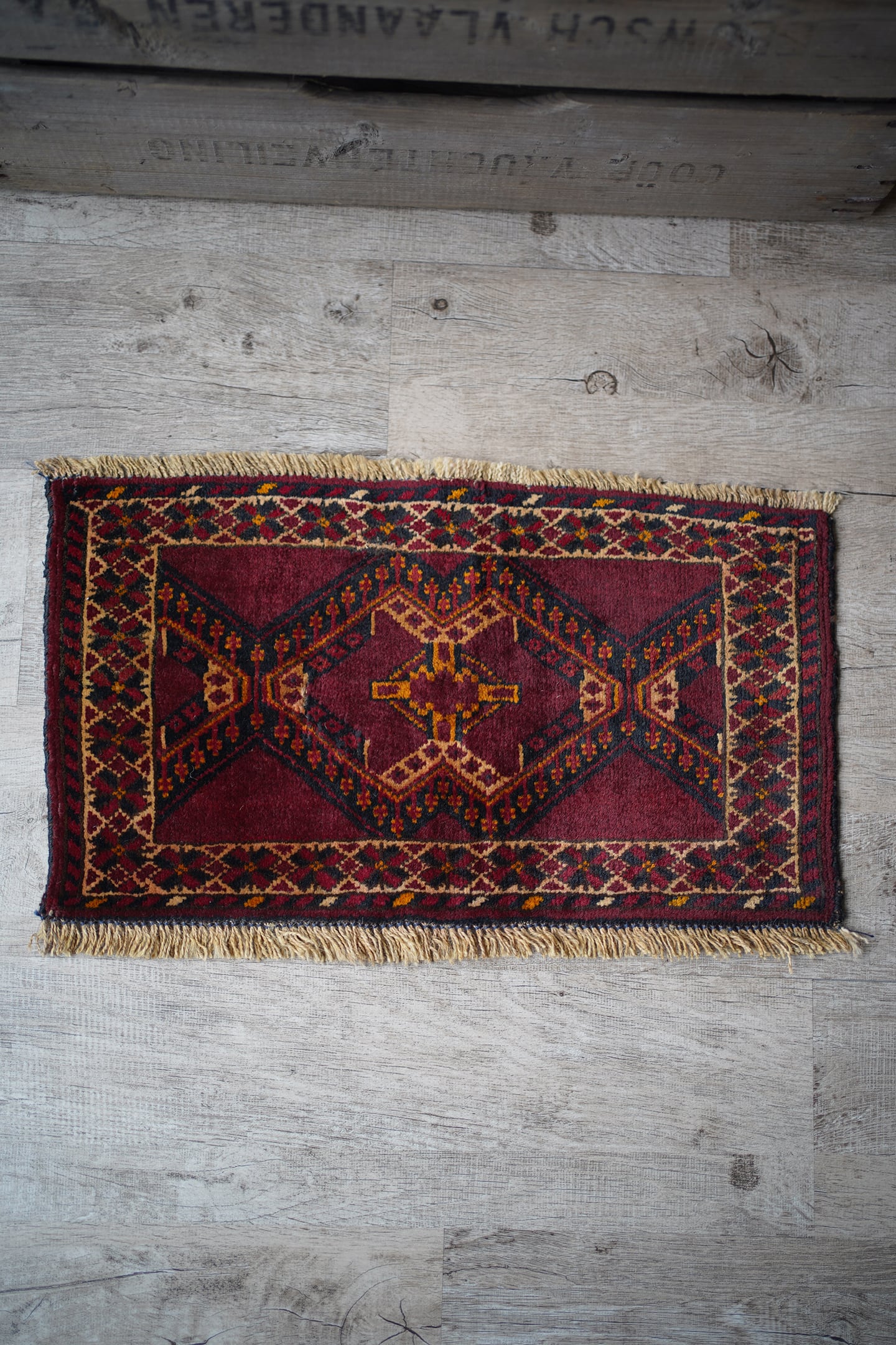 経年50年〜60年ほどのトルクメンラグ。暗めのボルドー色ベースで、艶もある美しい一枚です。柄はハザールギュルと呼ばれる紋様が大きく織り込まれています。ふわふわとした滑らかな肌触り、厚みは6mmほどになります。目立ちませんが1箇所、補修跡があります(お写真最後をご参照ください)。また手織りラグ特有の歪みが少しございますので俯瞰写真にてご確認ください。チェスト上に敷くのにオススメなサイズ感です♪