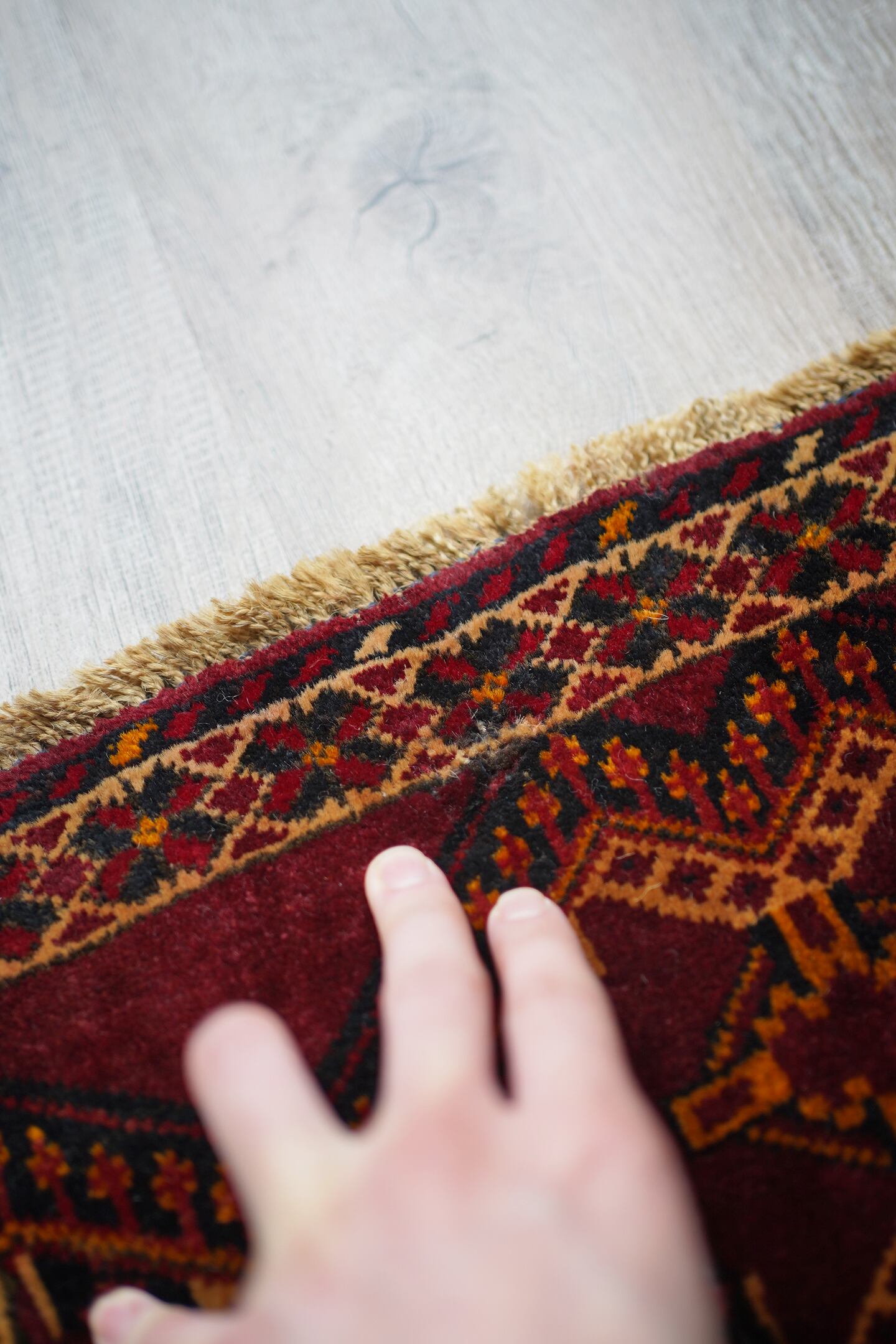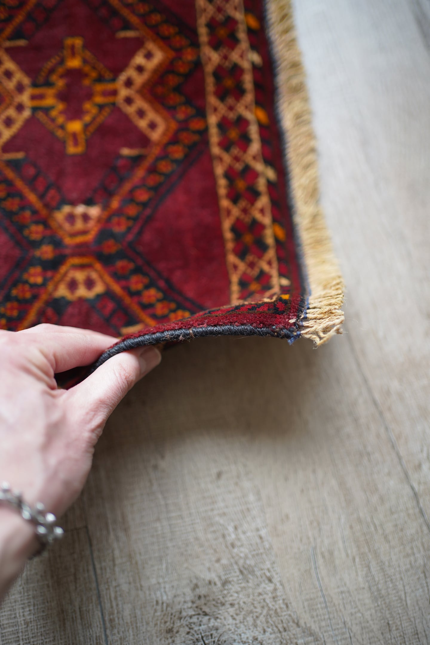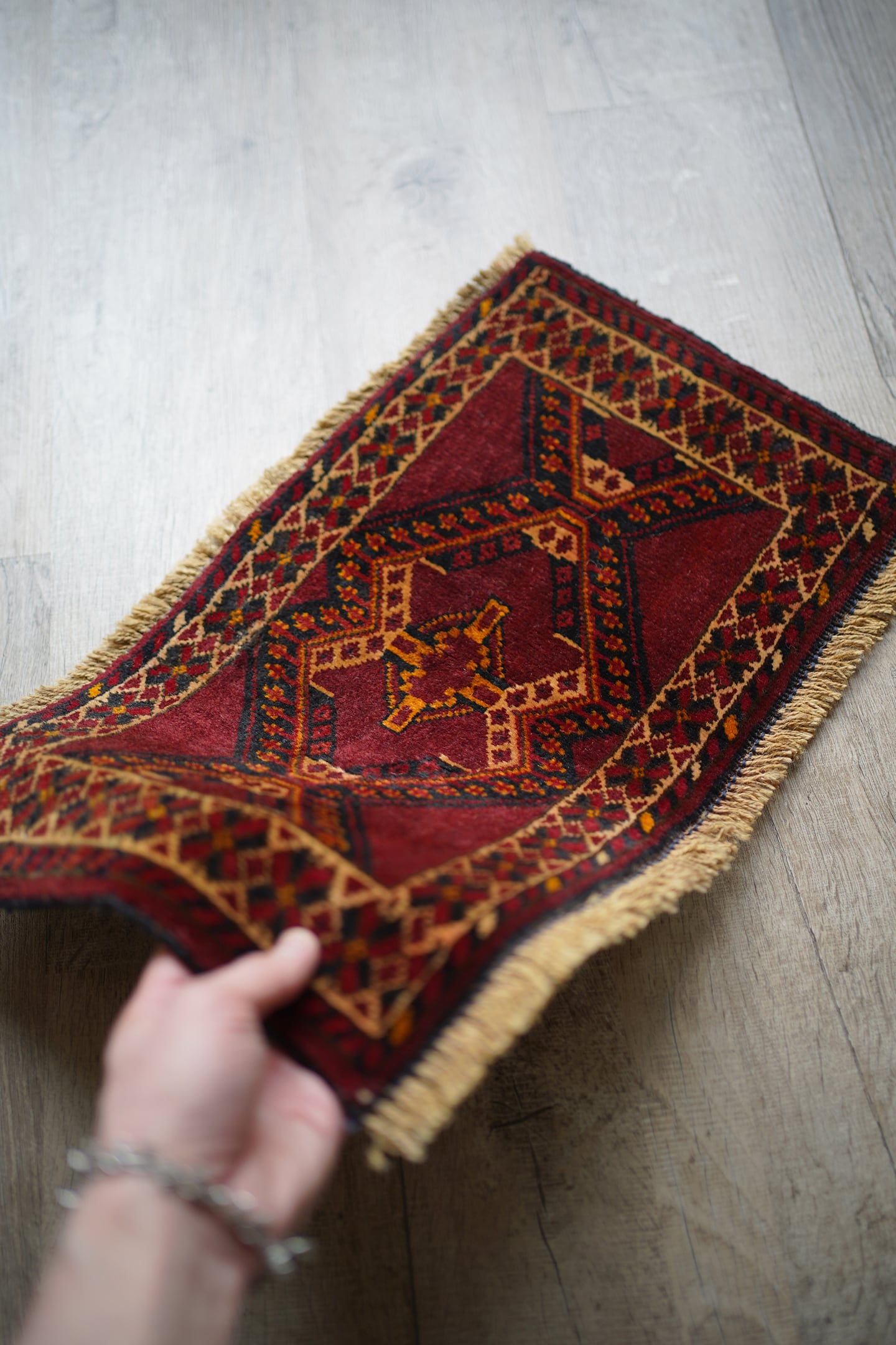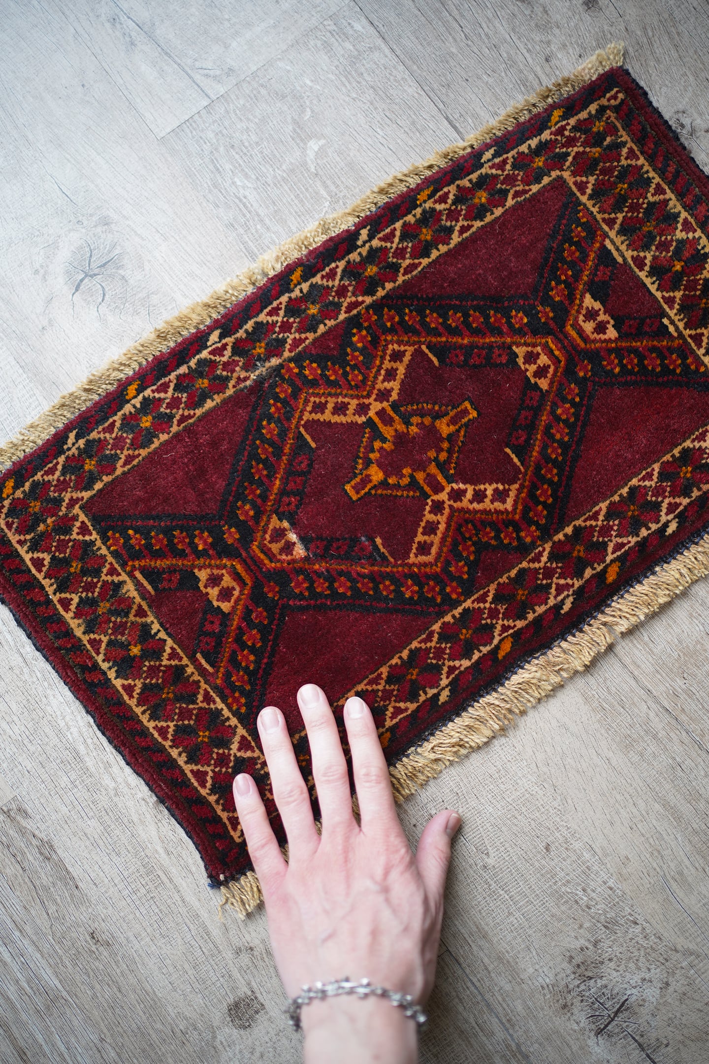 経年50年〜60年ほどのトルクメンラグ。暗めのボルドー色ベースで、艶もある美しい一枚です。柄はハザールギュルと呼ばれる紋様が大きく織り込まれています。ふわふわとした滑らかな肌触り、厚みは6mmほどになります。目立ちませんが1箇所、補修跡があります(お写真最後をご参照ください)。また手織りラグ特有の歪みが少しございますので俯瞰写真にてご確認ください。チェスト上に敷くのにオススメなサイズ感です♪