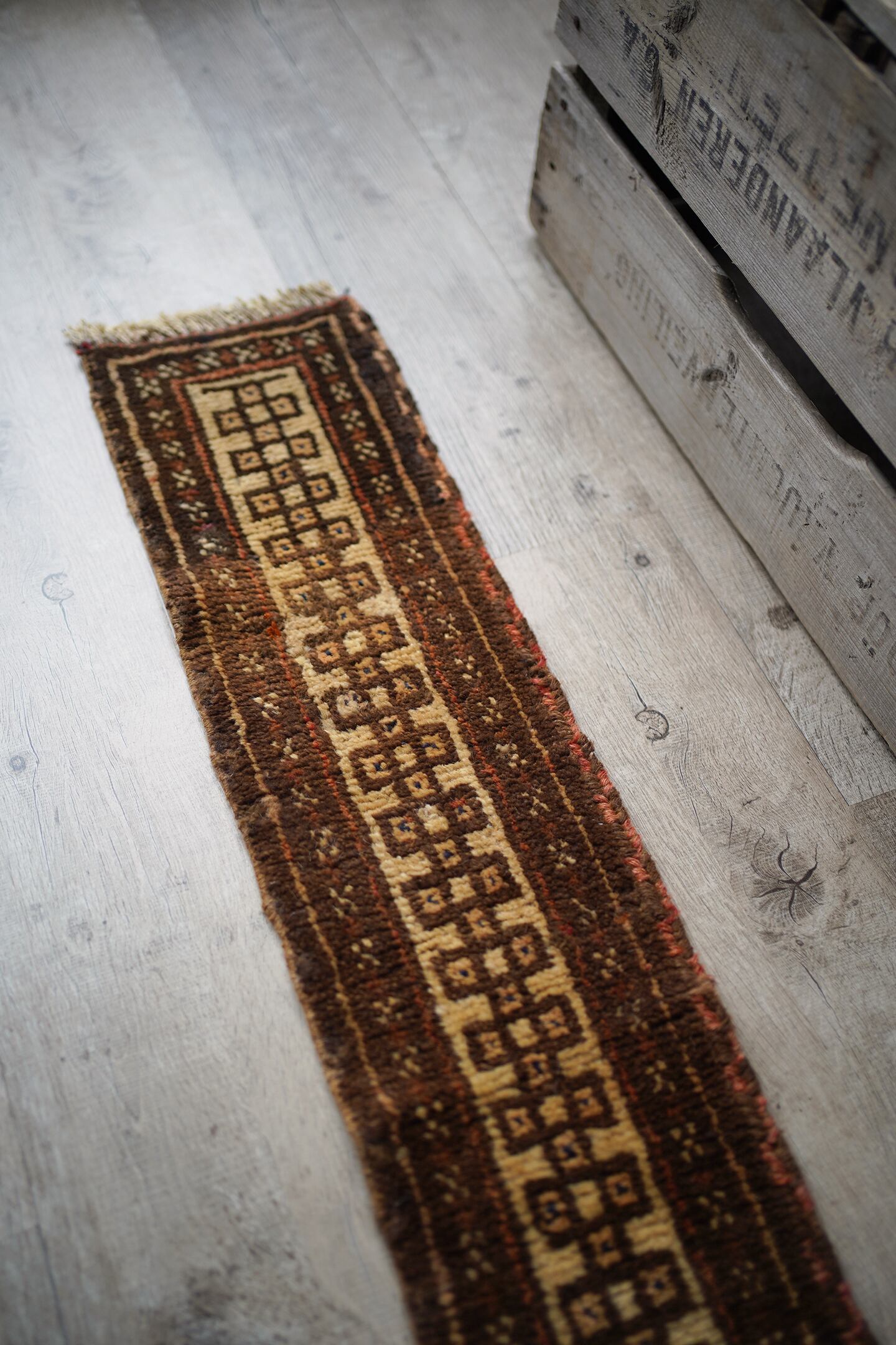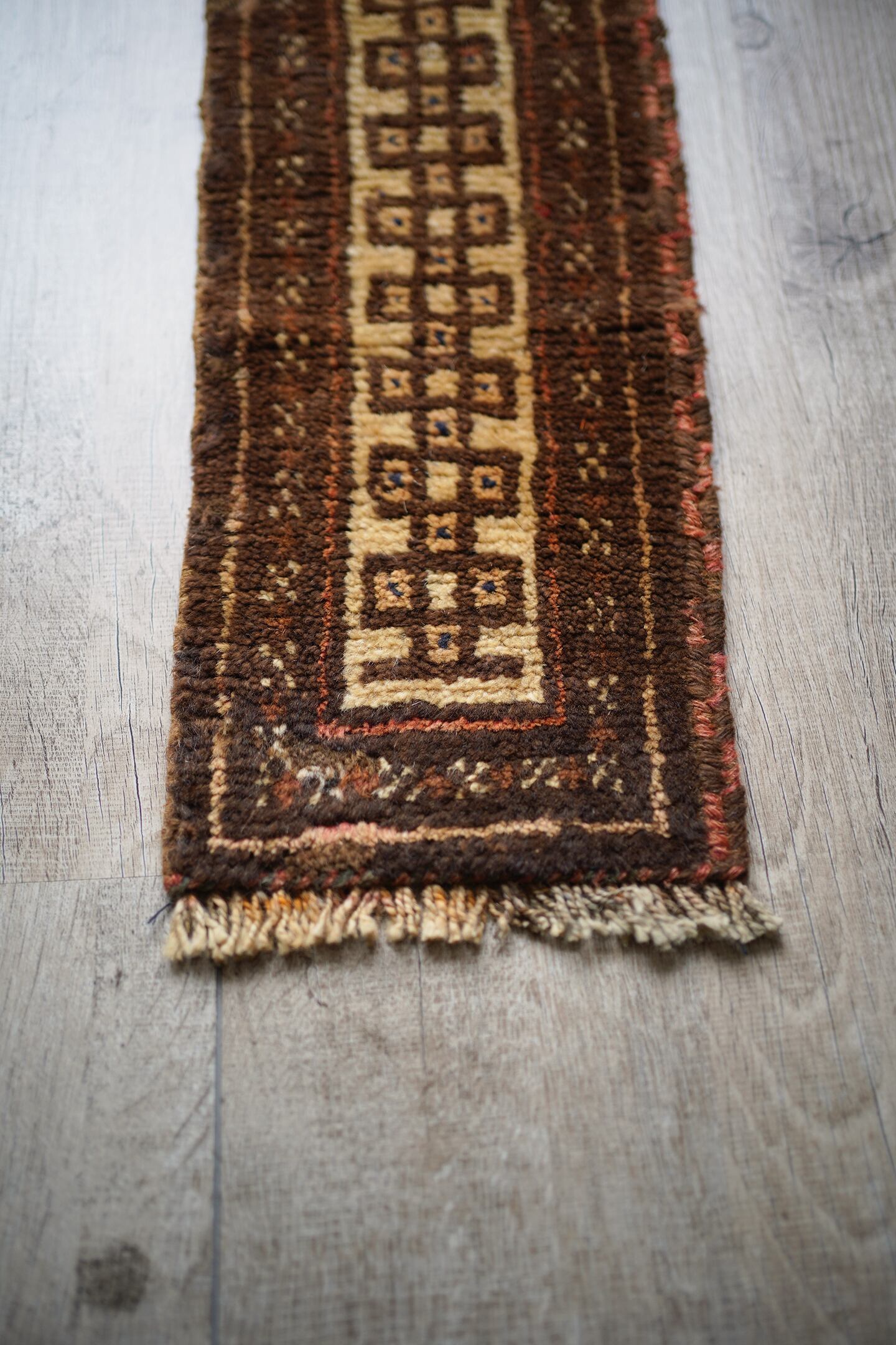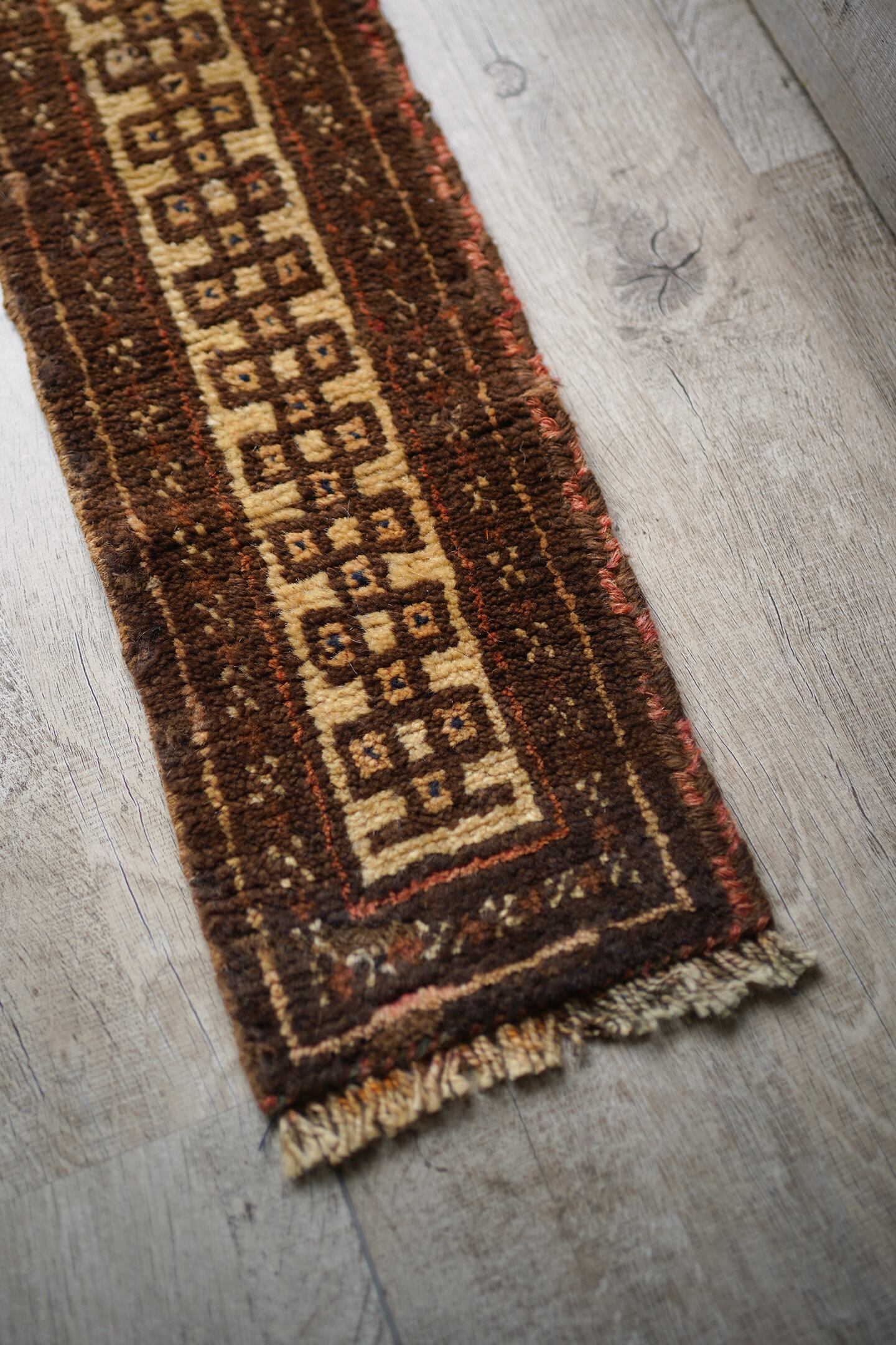 スモールランナーサイズのタイマニラグ。ネックバンドと呼ばれるラクダなどへの動物用の飾りとして使用されていたもので、こちらは装飾部分をカットして作成したラグとなります。濃いブラウンとベージュの落ち着いた配色で色んな家具に合わせやすいカラーリング。ふわっと優しい肌触りで、厚みは7mm〜8mm程度になります。棚の上に敷いて、香水やアクセサリーなどのお気に入りの小物を上に置いたりすると、とっても素敵になるのでオススメです♪