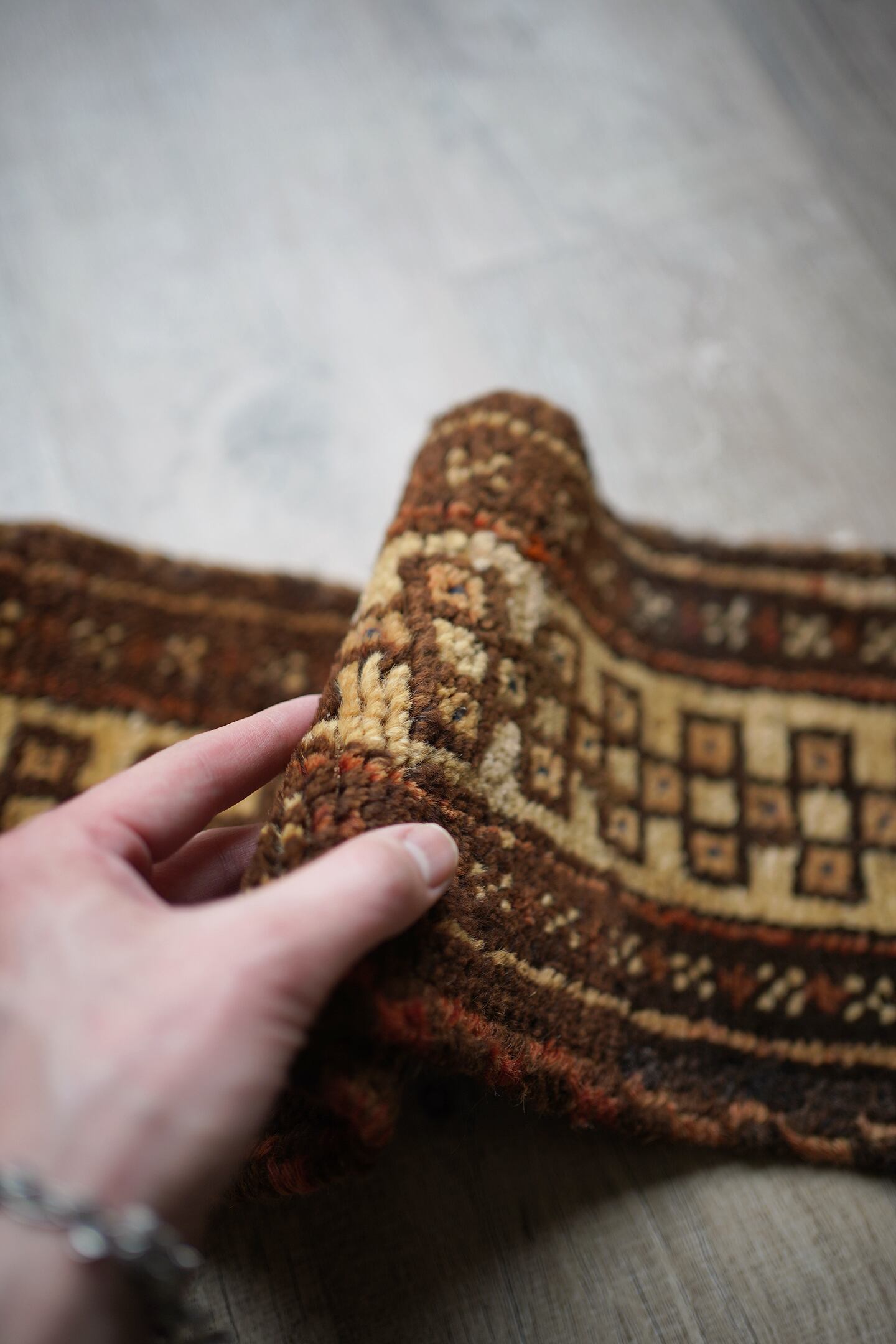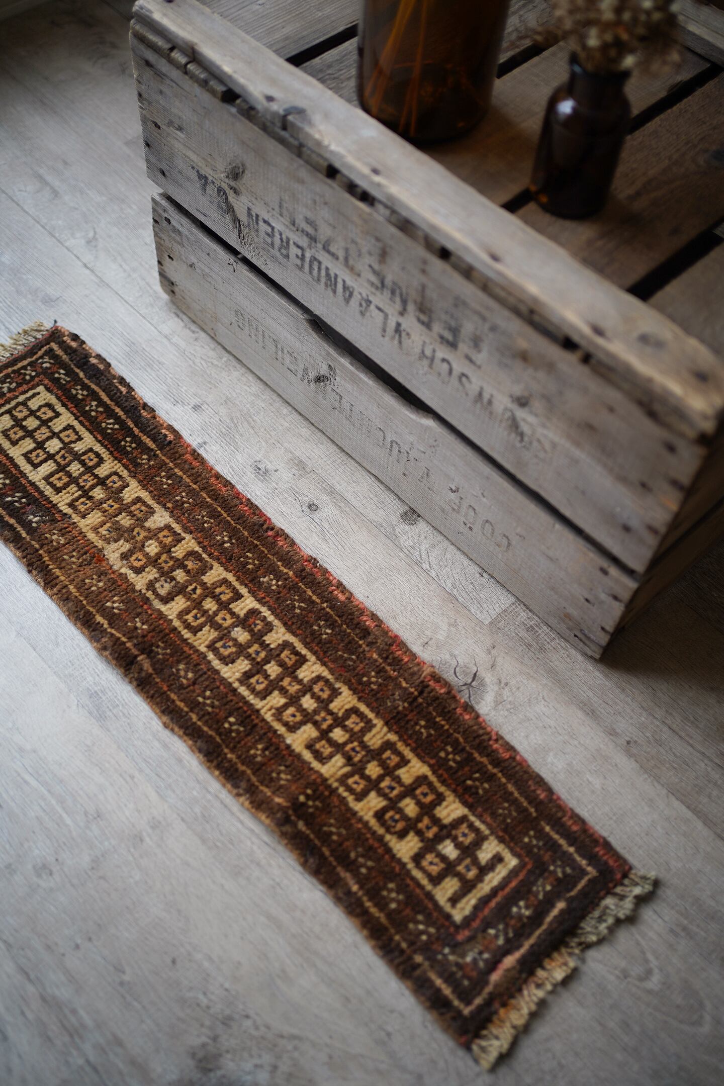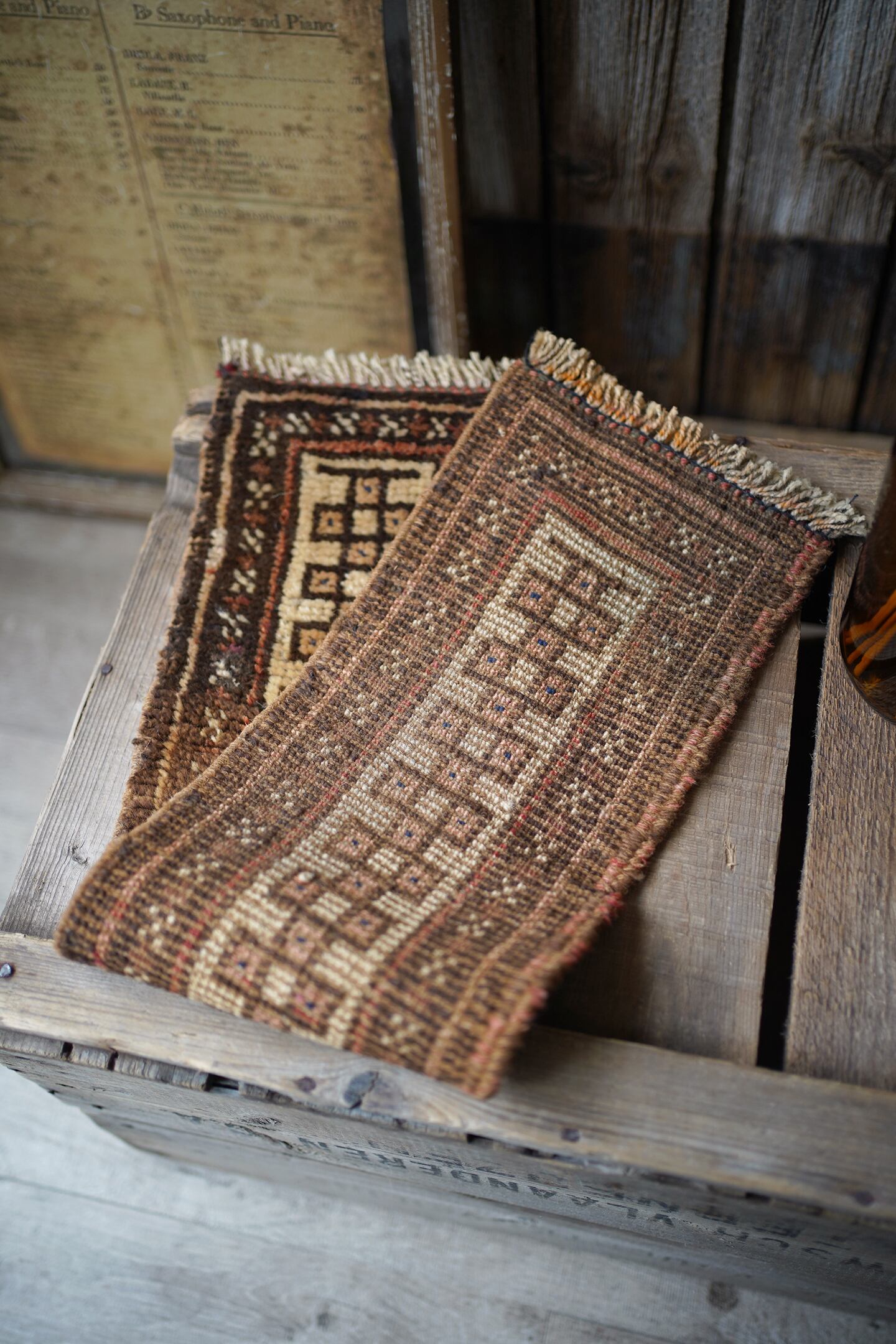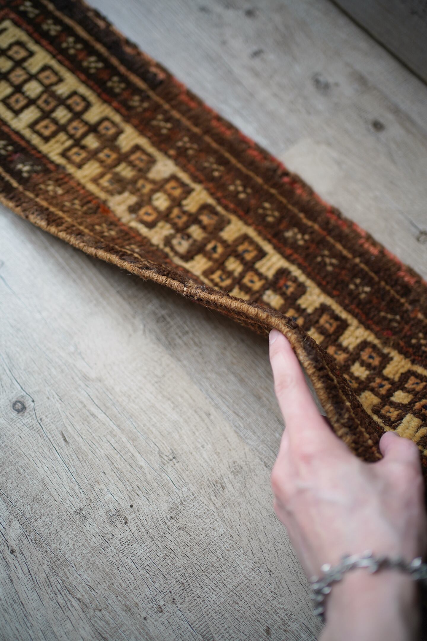 スモールランナーサイズのタイマニラグ。ネックバンドと呼ばれるラクダなどへの動物用の飾りとして使用されていたもので、こちらは装飾部分をカットして作成したラグとなります。濃いブラウンとベージュの落ち着いた配色で色んな家具に合わせやすいカラーリング。ふわっと優しい肌触りで、厚みは7mm〜8mm程度になります。棚の上に敷いて、香水やアクセサリーなどのお気に入りの小物を上に置いたりすると、とっても素敵になるのでオススメです♪