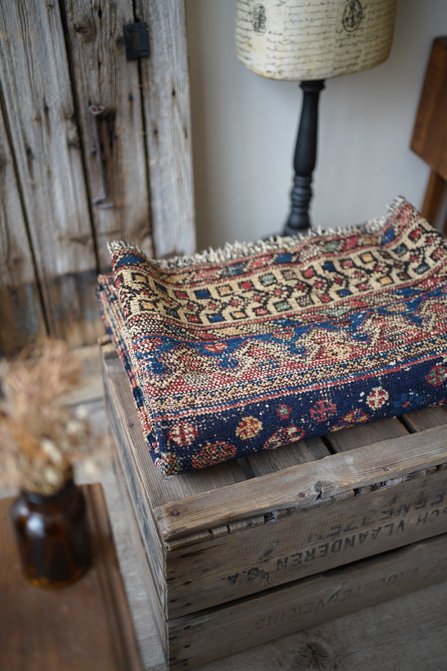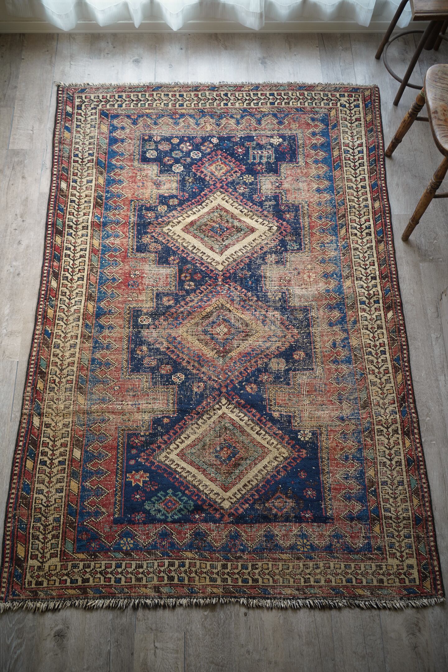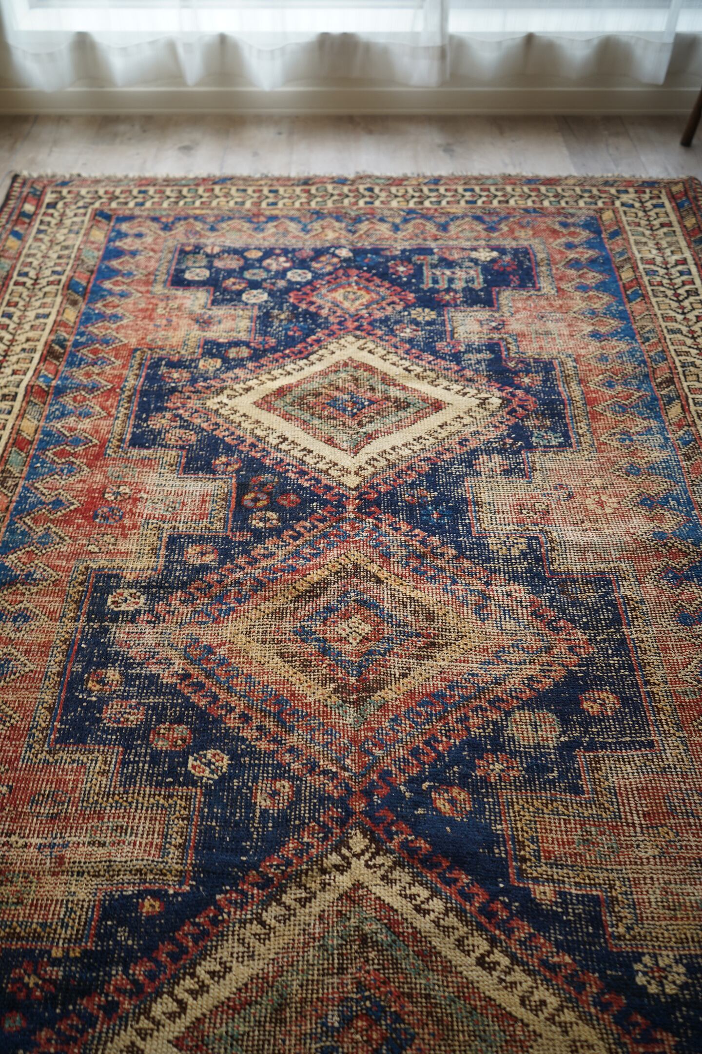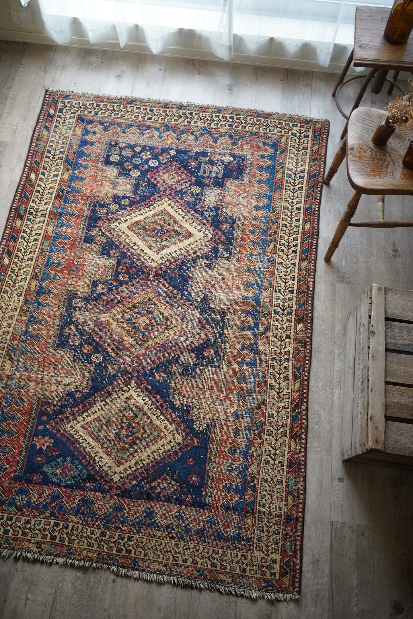 おおよそ70年 〜 80年前にアフシャール族によって織られたセミアンティークのラグです。ネイビーベースのお色味で経年による擦れ具合が強く、アンティークの風合い漂う一枚。メダリオンの上部には動物も1匹織り込まれているところも可愛らしいポイントです。ベージュに見える箇所は色褪せて少し黄み掛かった色味にも見えます。表面はサラッとした乾いた肌触りで厚みは5mm程度、全体的に張りある質感です。コンディションとしては1箇所だけ目立たない補修跡がございます(馴染んでいて目を凝らして探さないとほどんどわからない状態です)。リビングや書斎をはじめ、お気に入りのスペースにどうぞ♪