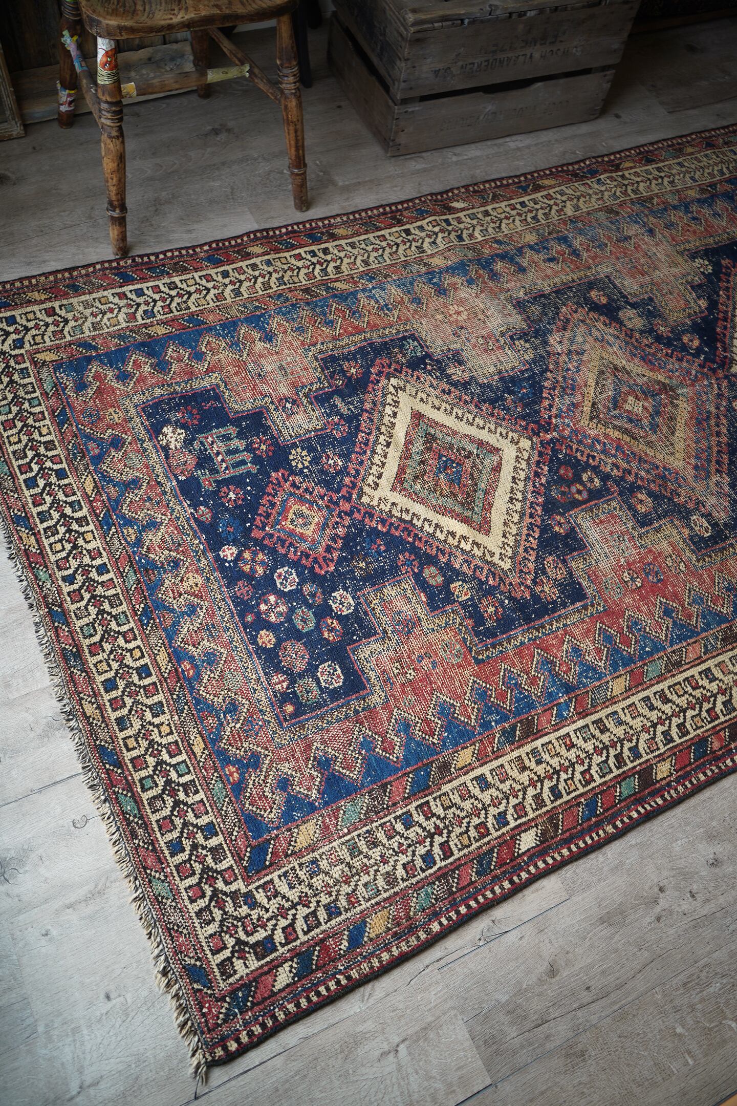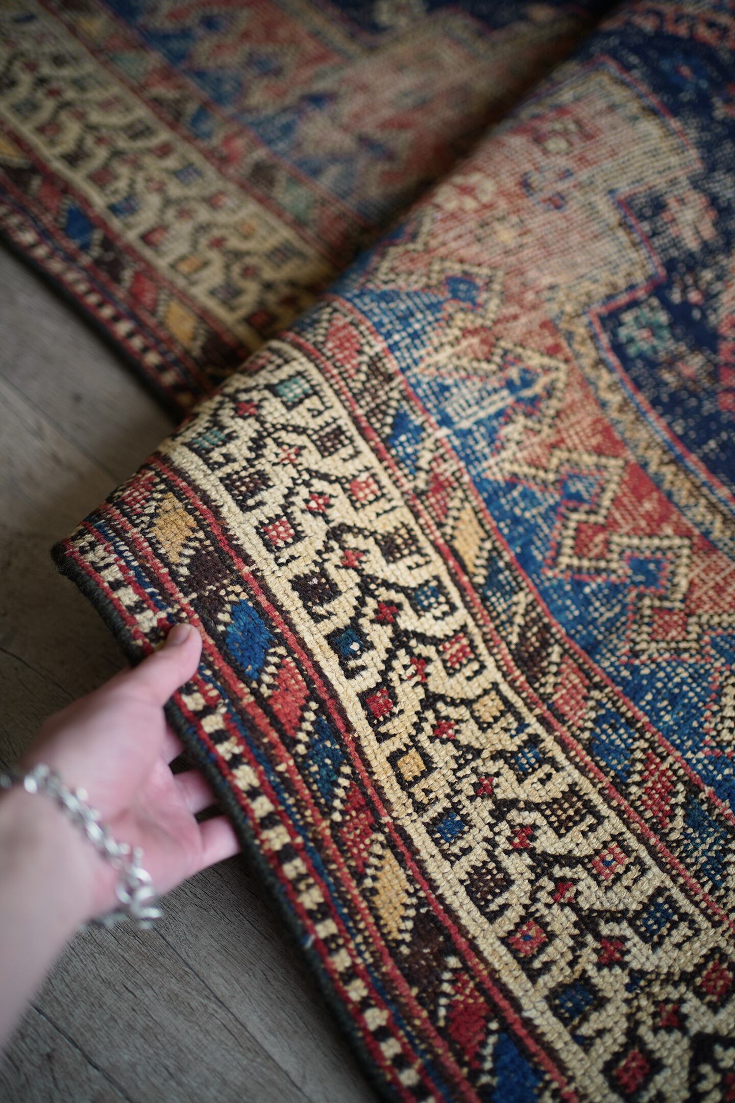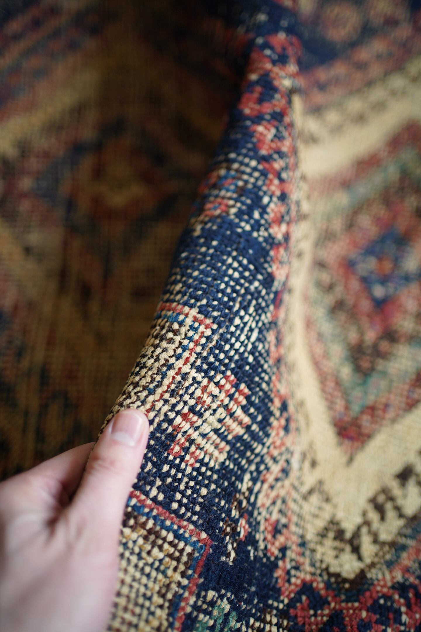おおよそ70年 〜 80年前にアフシャール族によって織られたセミアンティークのラグです。ネイビーベースのお色味で経年による擦れ具合が強く、アンティークの風合い漂う一枚。メダリオンの上部には動物も1匹織り込まれているところも可愛らしいポイントです。ベージュに見える箇所は色褪せて少し黄み掛かった色味にも見えます。表面はサラッとした乾いた肌触りで厚みは5mm程度、全体的に張りある質感です。コンディションとしては1箇所だけ目立たない補修跡がございます(馴染んでいて目を凝らして探さないとほどんどわからない状態です)。リビングや書斎をはじめ、お気に入りのスペースにどうぞ♪