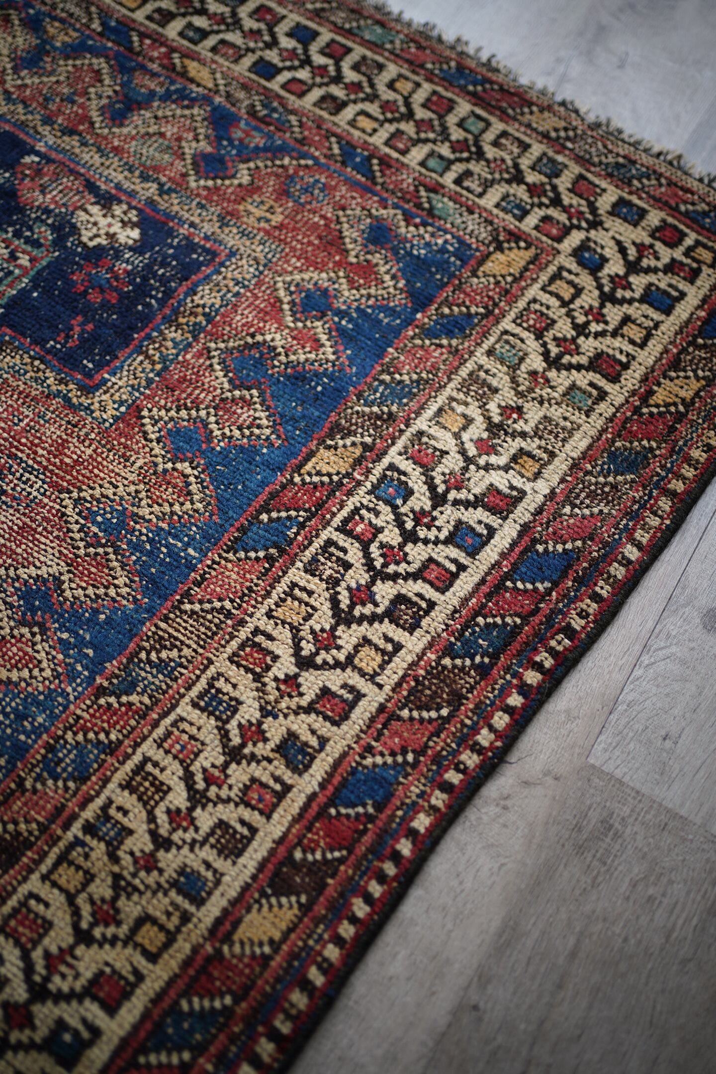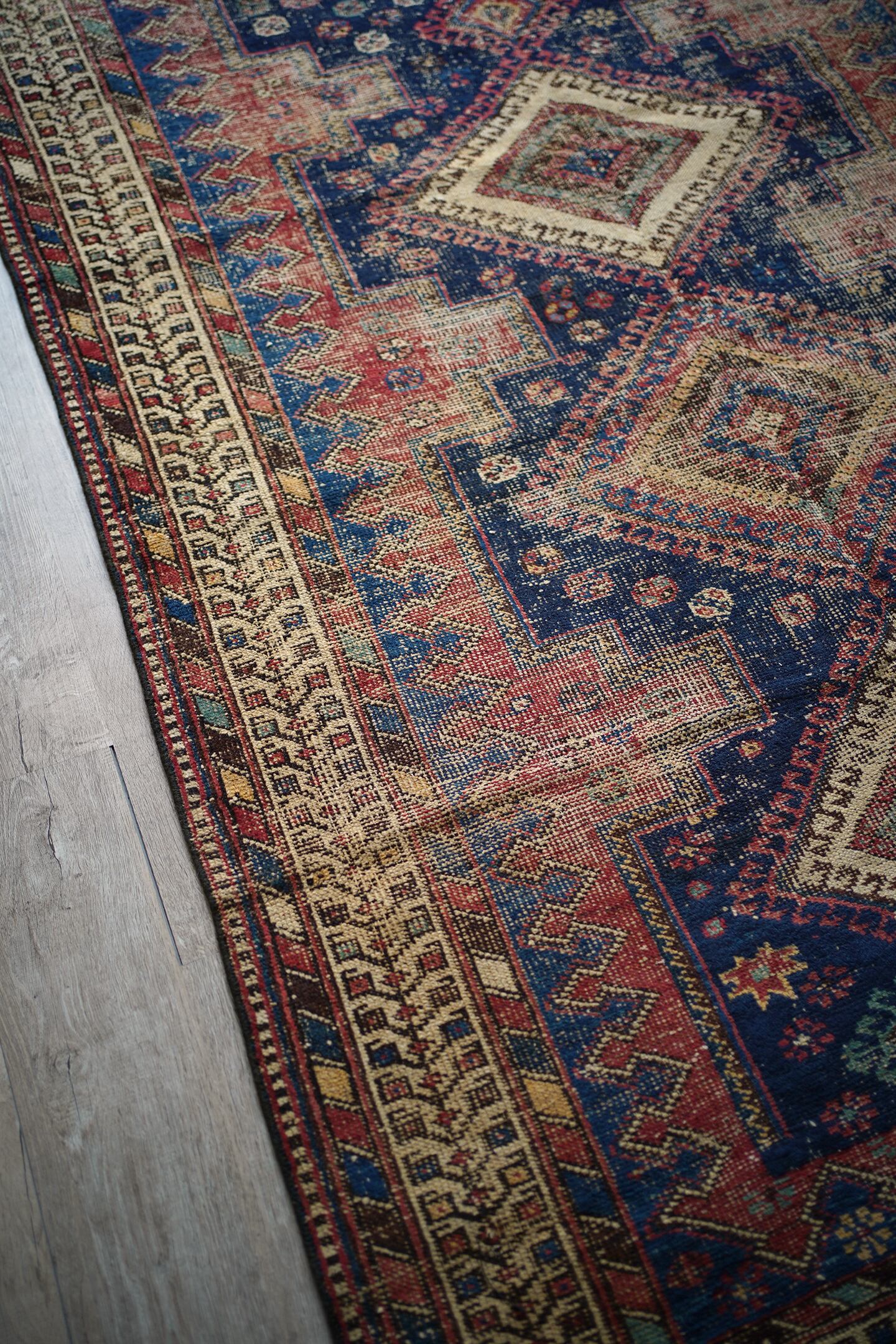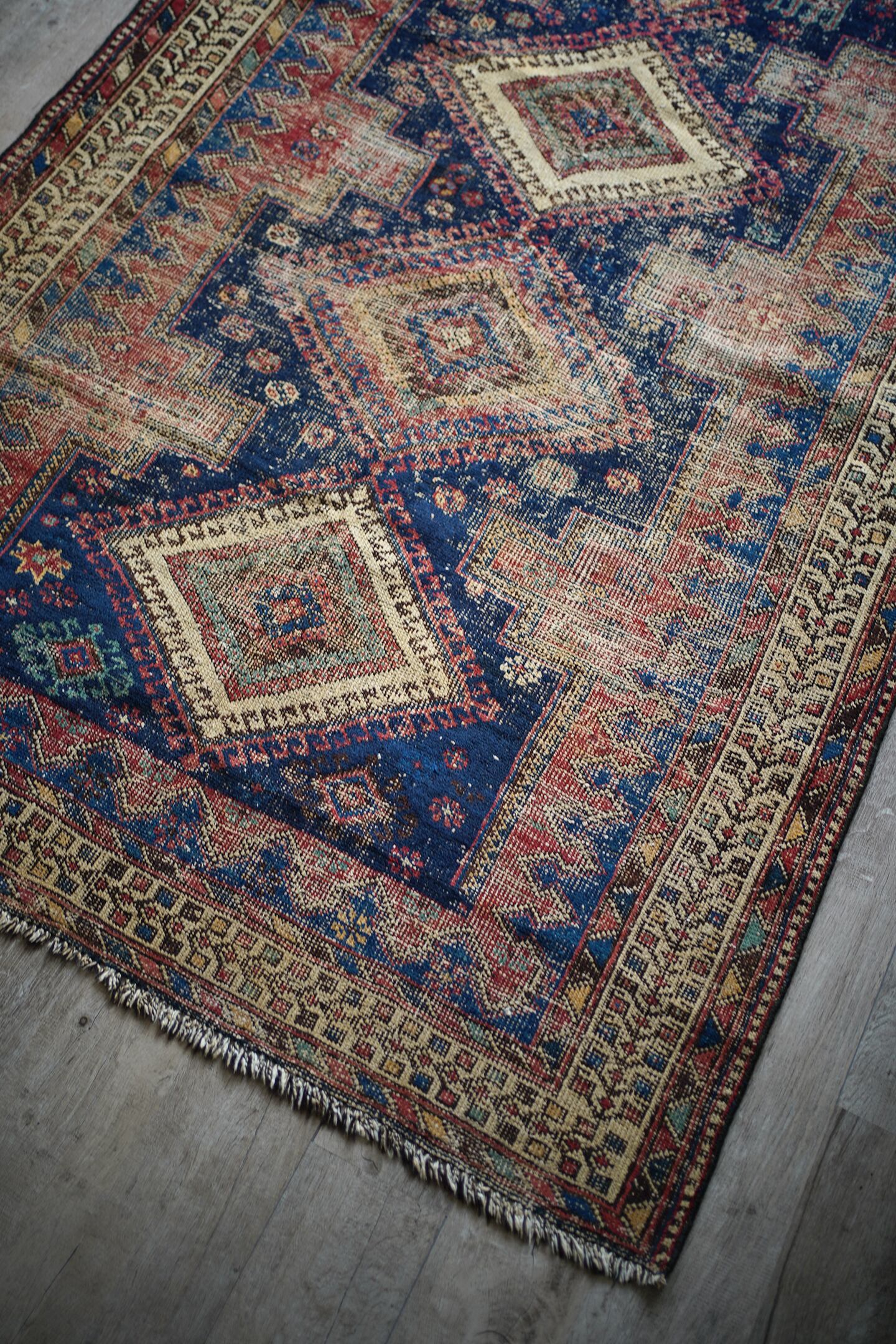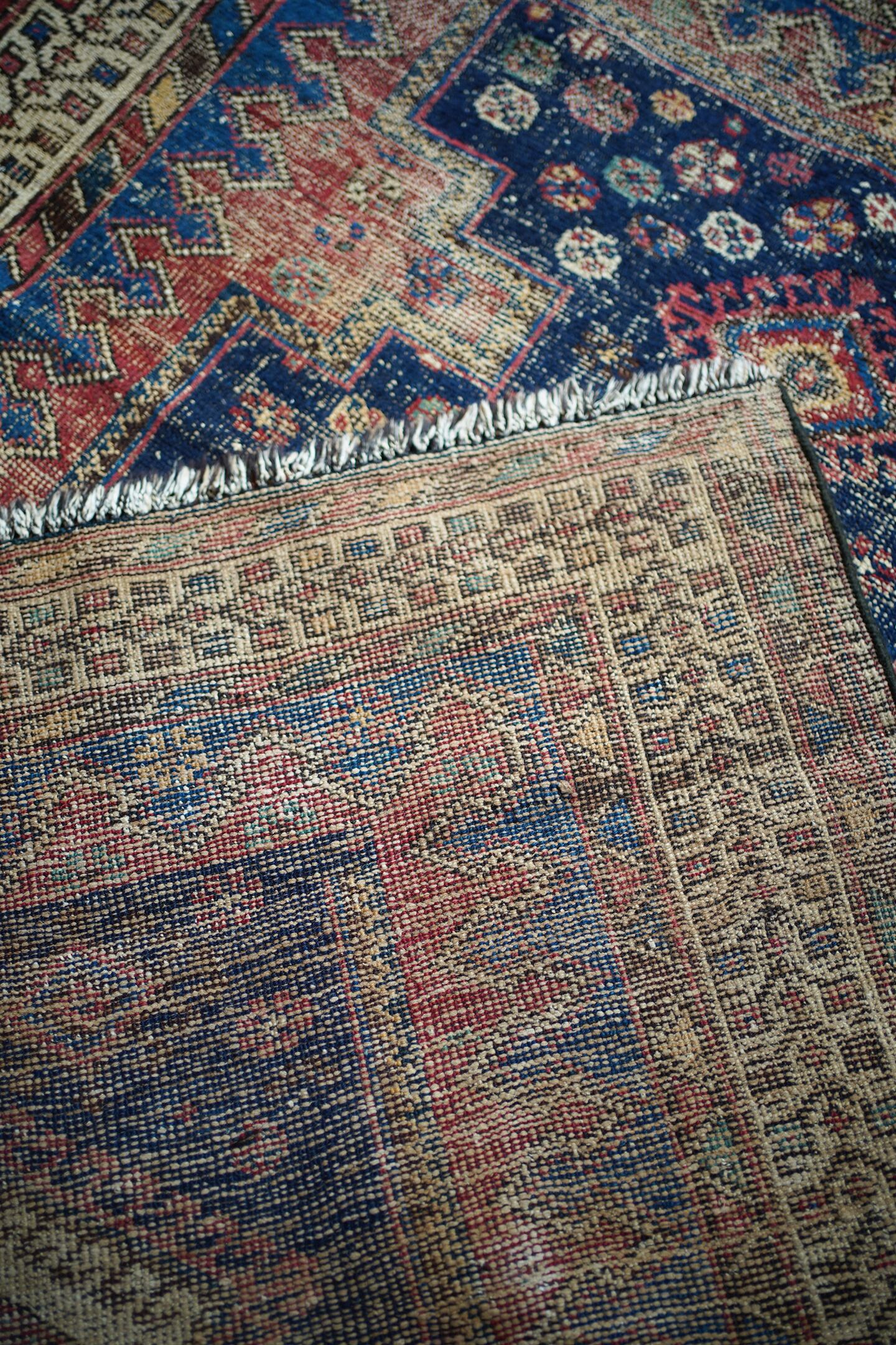 おおよそ70年 〜 80年前にアフシャール族によって織られたセミアンティークのラグです。ネイビーベースのお色味で経年による擦れ具合が強く、アンティークの風合い漂う一枚。メダリオンの上部には動物も1匹織り込まれているところも可愛らしいポイントです。ベージュに見える箇所は色褪せて少し黄み掛かった色味にも見えます。表面はサラッとした乾いた肌触りで厚みは5mm程度、全体的に張りある質感です。コンディションとしては1箇所だけ目立たない補修跡がございます(馴染んでいて目を凝らして探さないとほどんどわからない状態です)。リビングや書斎をはじめ、お気に入りのスペースにどうぞ♪
