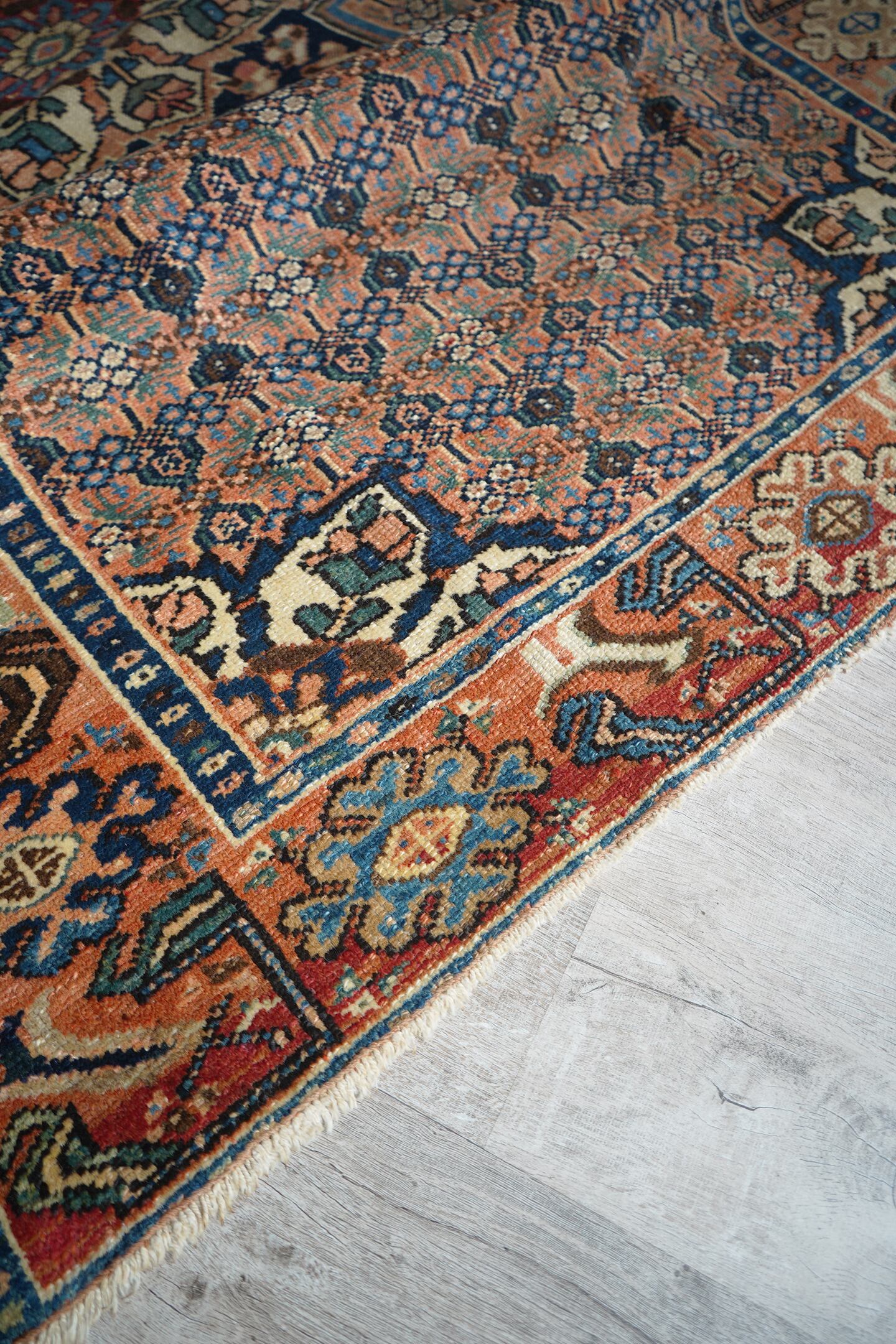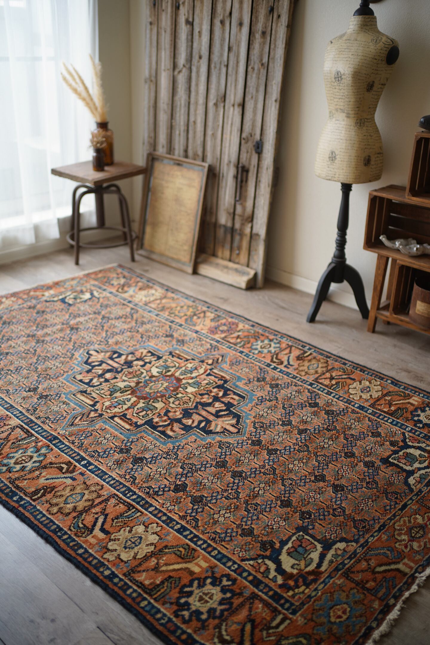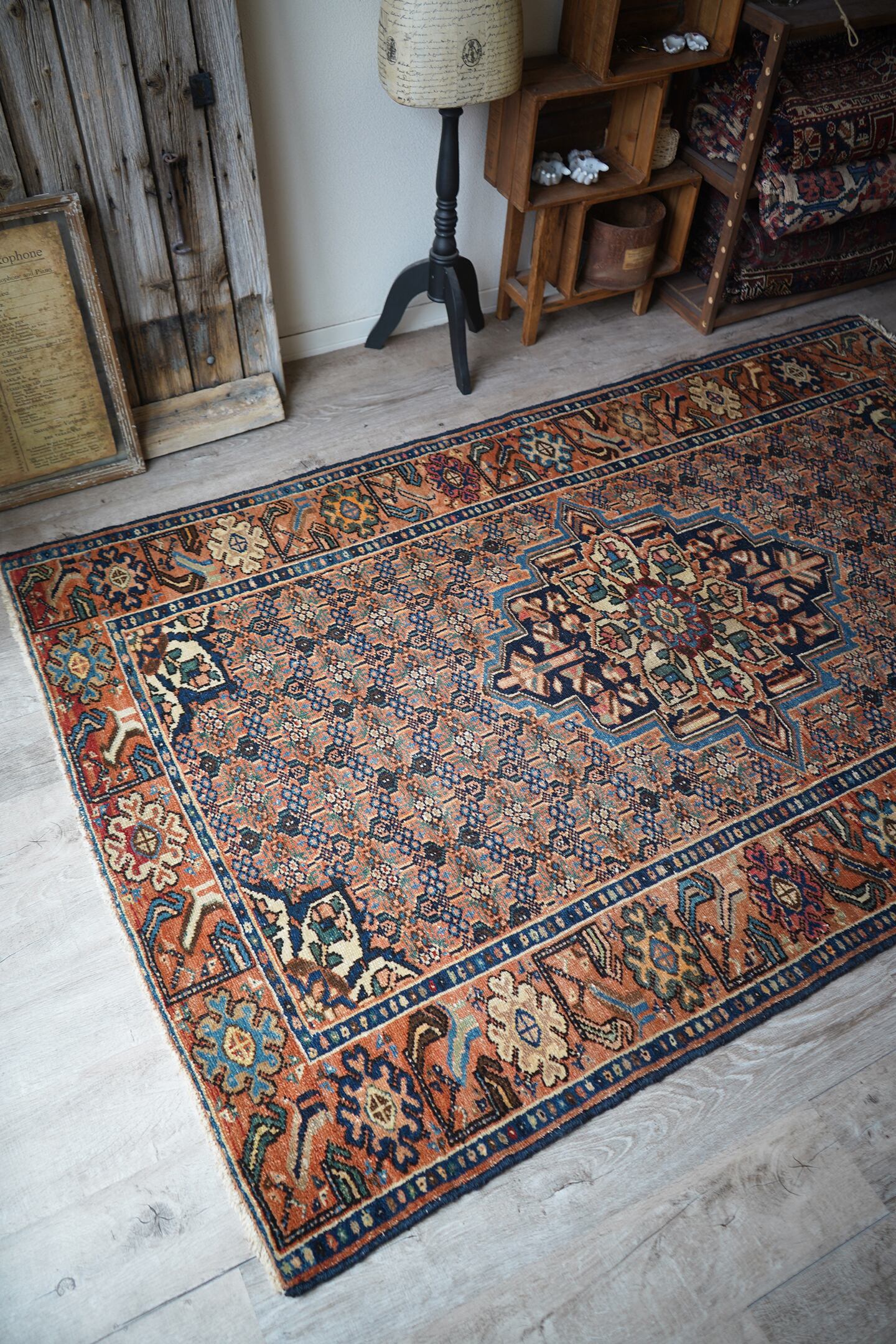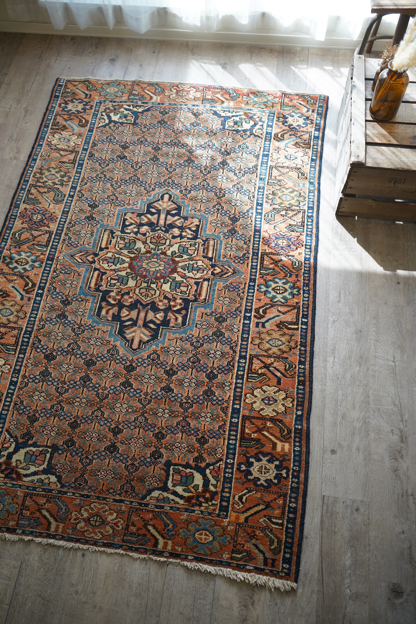 イラン北西部ザンジャン州で織られた経年約80年のラグです。サーモンピンクとオレンジ色の間のような淡い色合いをベースに、差し色でブルーグリーンやライトブルーが使われた優しい風合いが素敵な一枚。毛並みはサラッとした肌触りで、厚みは7mmと程よい厚みがあります。目立った補修跡もなく状態も良好です。ソファ前やベッドサイドなど、お洒落にお部屋を彩ってくれそう♪