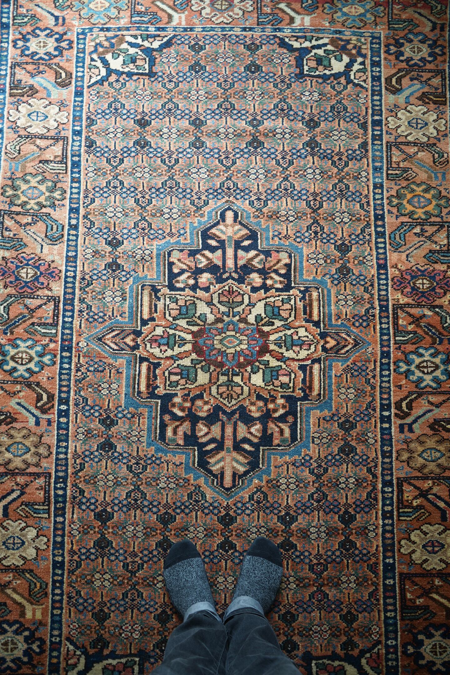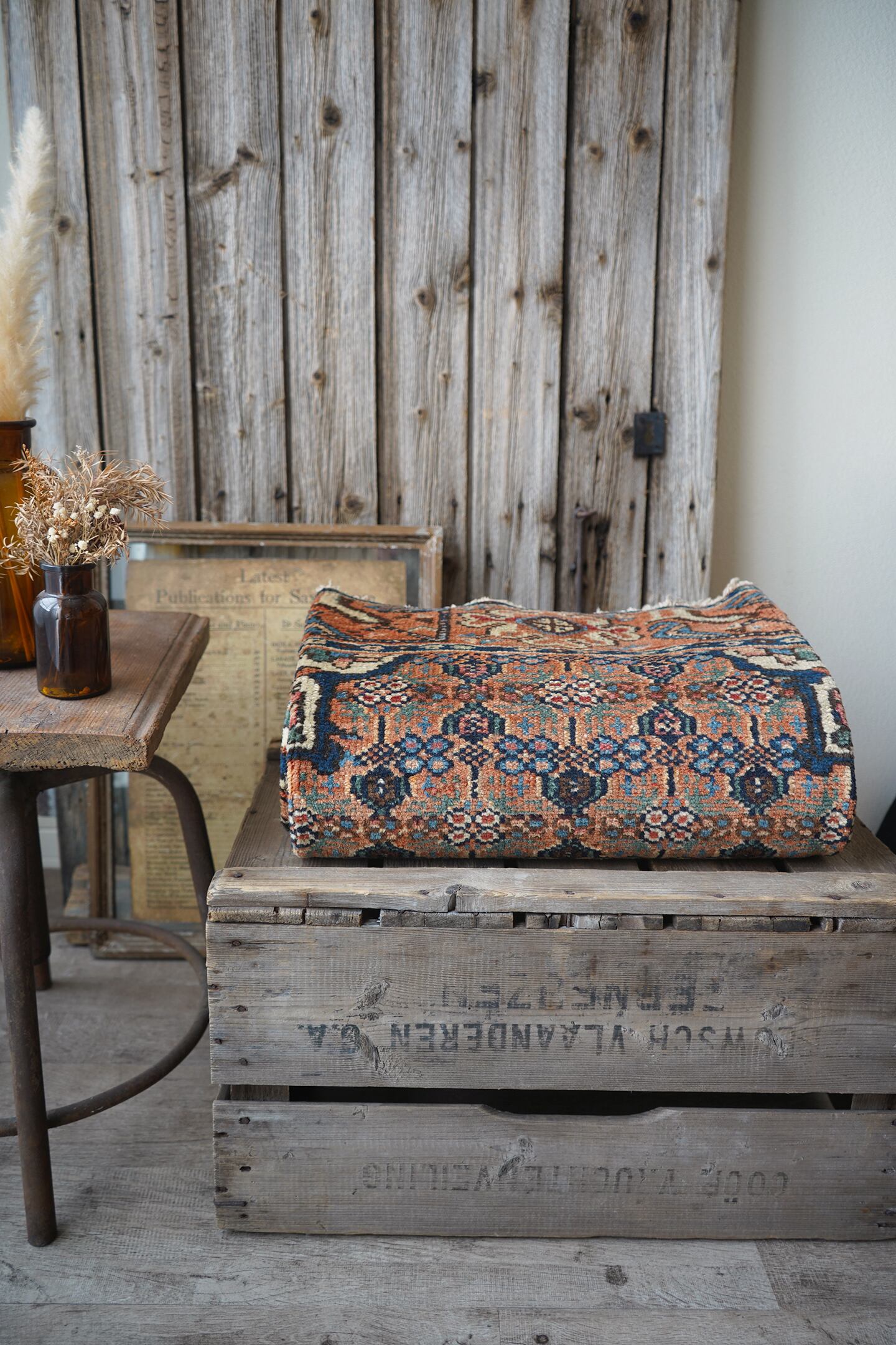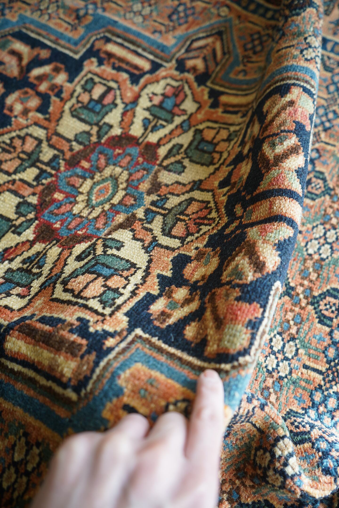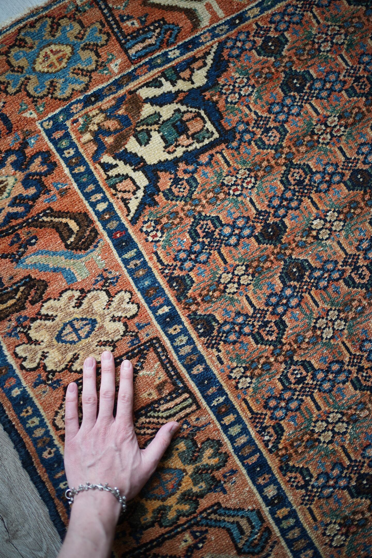 イラン北西部ザンジャン州で織られた経年約80年のラグです。サーモンピンクとオレンジ色の間のような淡い色合いをベースに、差し色でブルーグリーンやライトブルーが使われた優しい風合いが素敵な一枚。毛並みはサラッとした肌触りで、厚みは7mmと程よい厚みがあります。目立った補修跡もなく状態も良好です。ソファ前やベッドサイドなど、お洒落にお部屋を彩ってくれそう♪