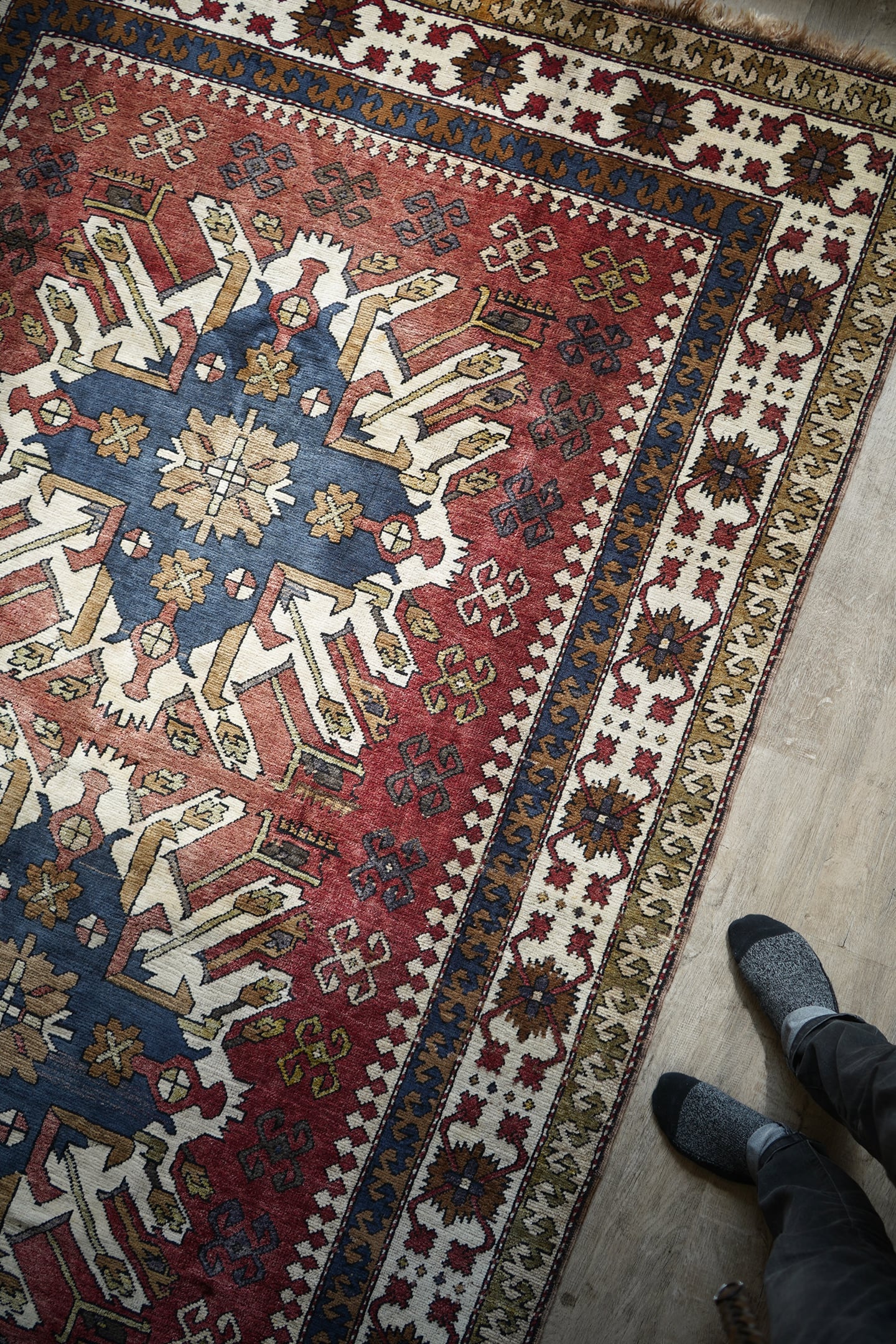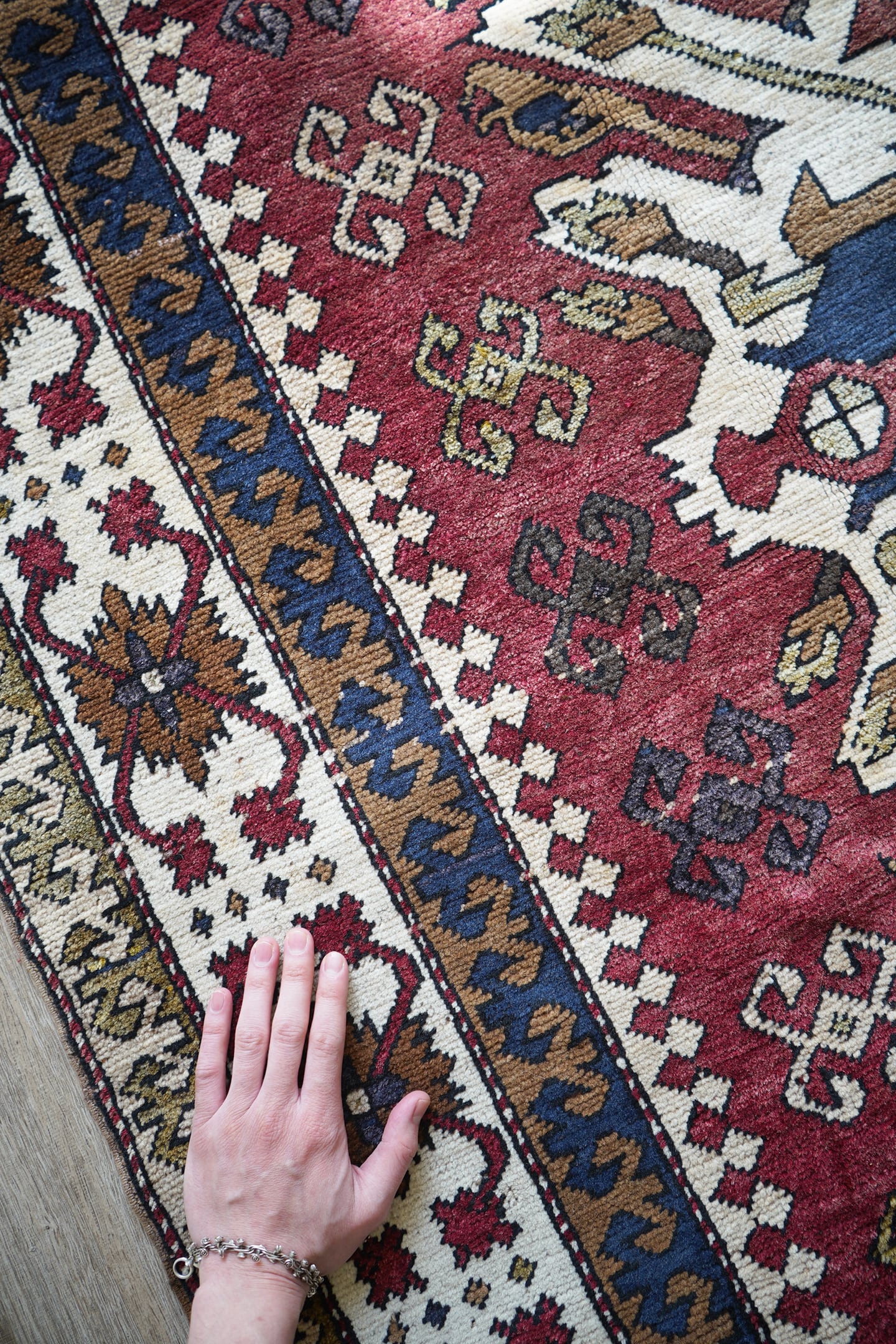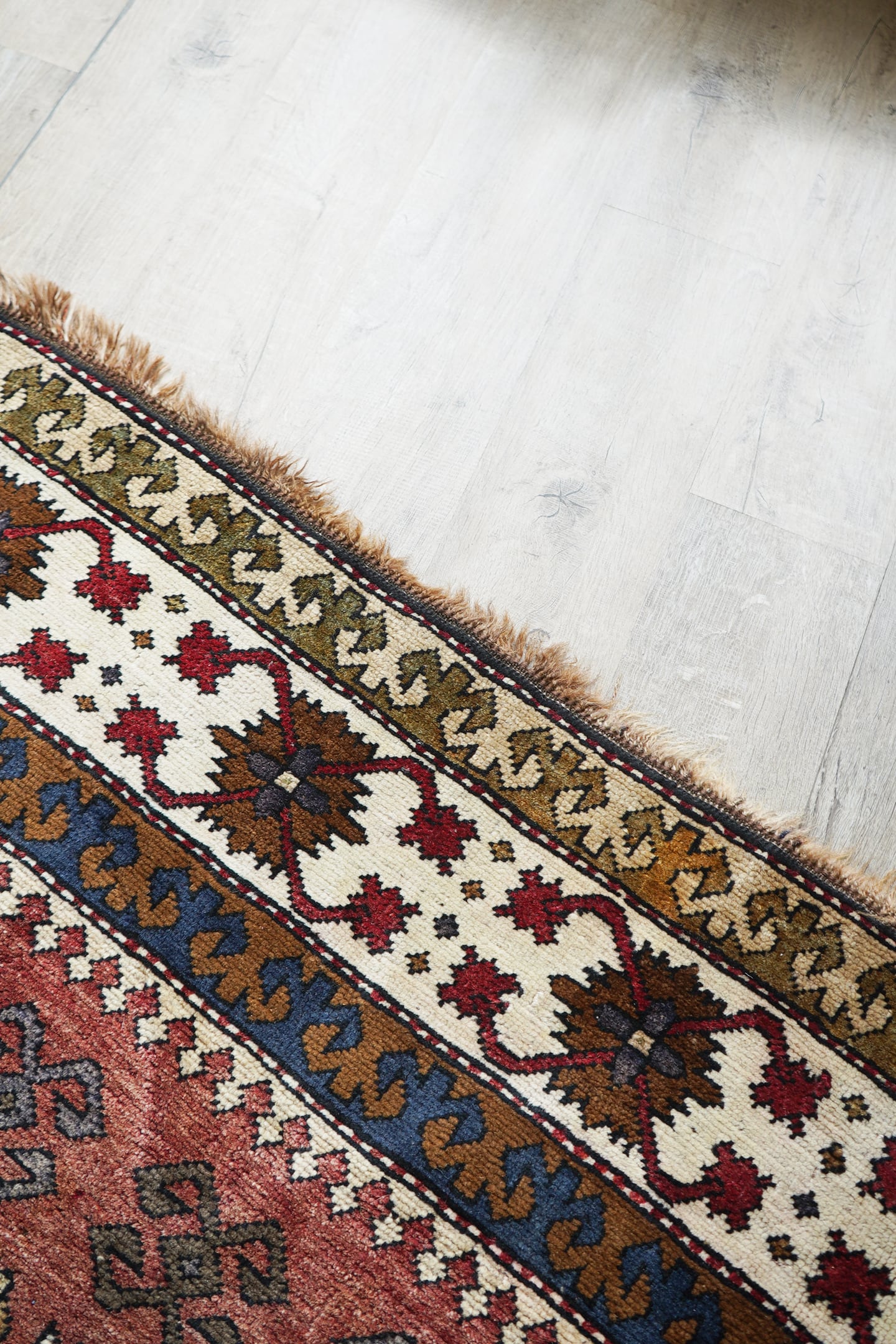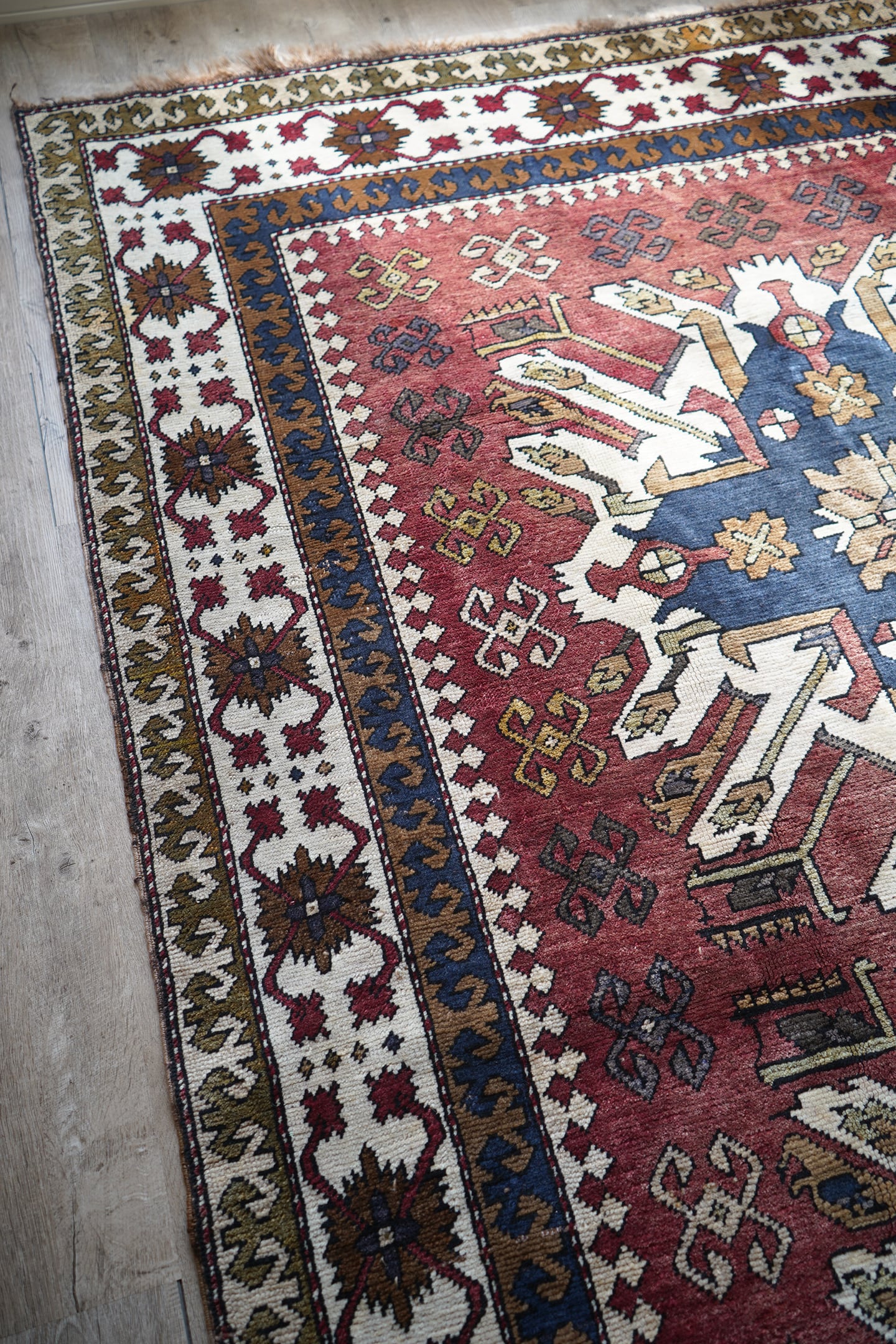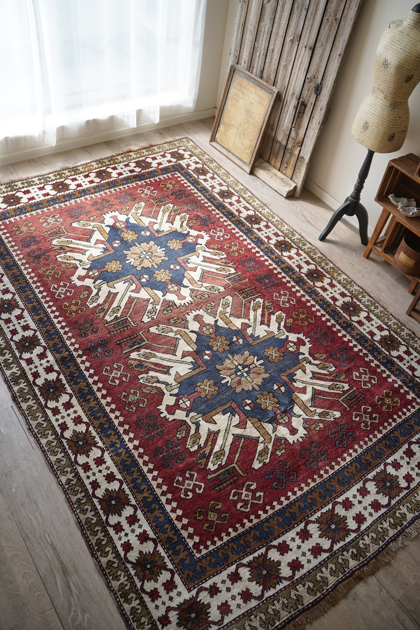 約1950年〜1960年頃にコーカサス地方で織られたヴィンテージのカザックラグです。フィールドの中央にはコーカサス地方に伝わる太陽の紋様から図案化されたとされる"サンバースト紋様(イーグルカザック紋様とも呼ばれています)"、そしてボーダーには蟹を模したとも言われているクラッブボーダーが見受けられます。フィールドの色味は赤紫の箇所と褪色により薄めのピンク色になっているところがございます(お写真最後をご参照ください)。毛並みも十分残っており、ふわふわとした気持ちの良い肌触り、厚みは6mmほどあります。コンディションとしては一部目立たないパイル抜けが1箇所ございます。このラグを一目見て、すぐに仕入れを決めたほど店主お気に入りのデザイン。「カッコいい」その一言に尽きます。リビングにこの大判のラグを一枚敷くだけで、お部屋の雰囲気もたちまち様変わりすることでしょう。インテリアの主役として、ぜひお迎えください♪