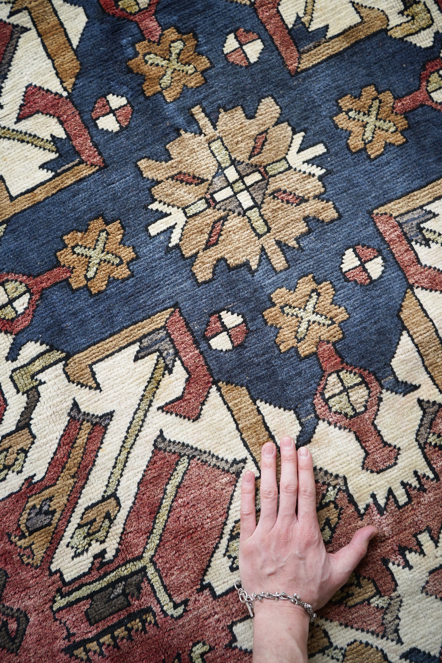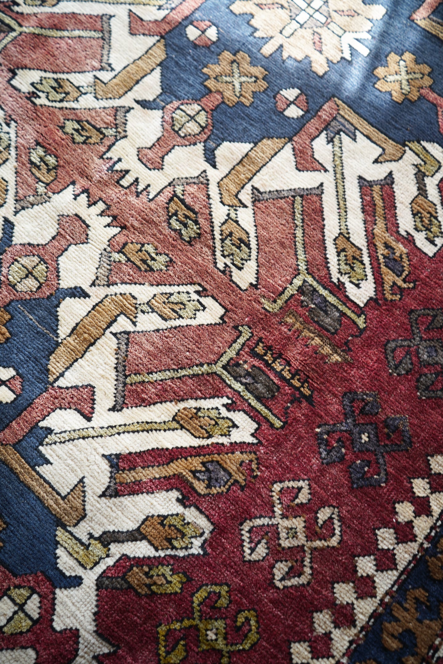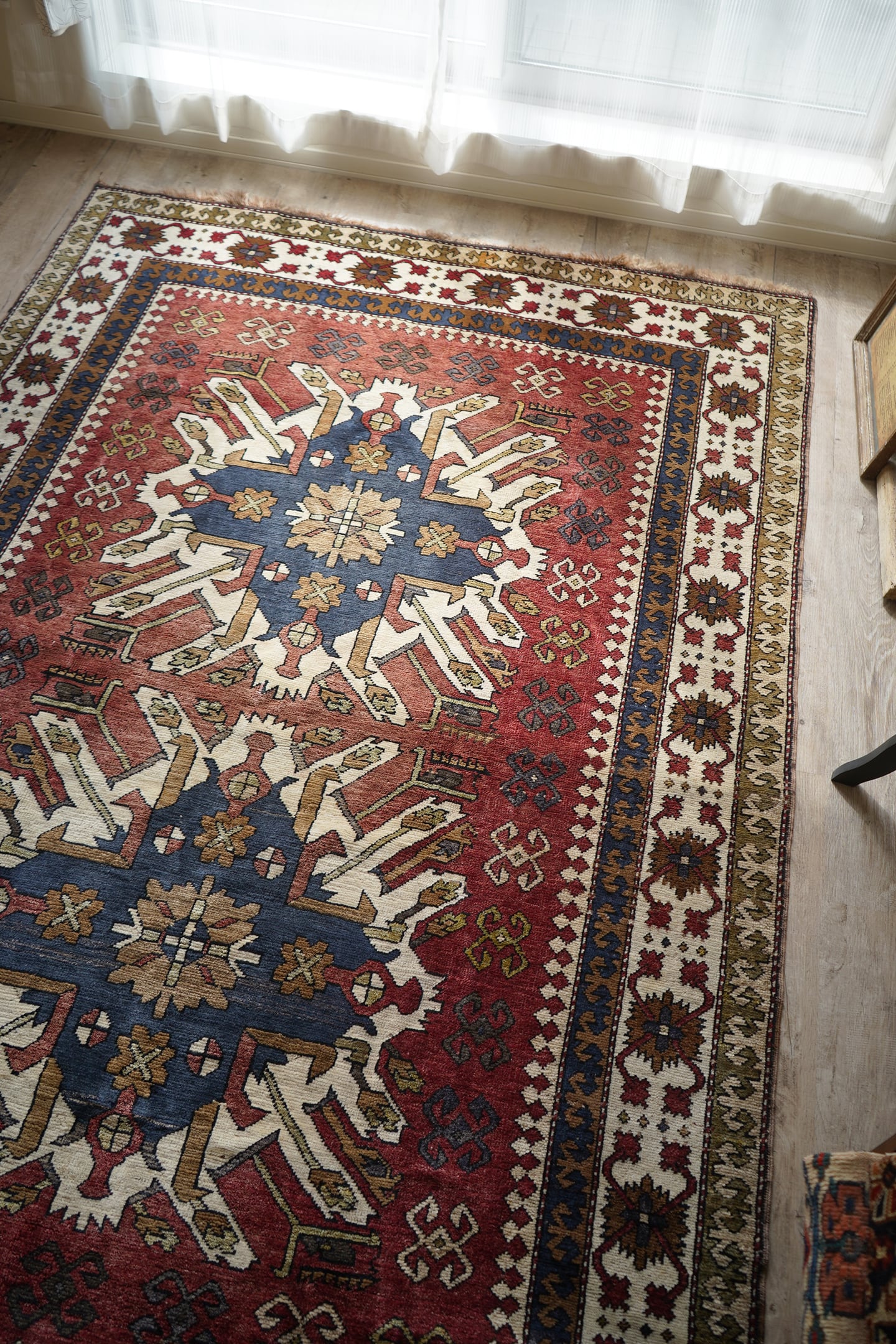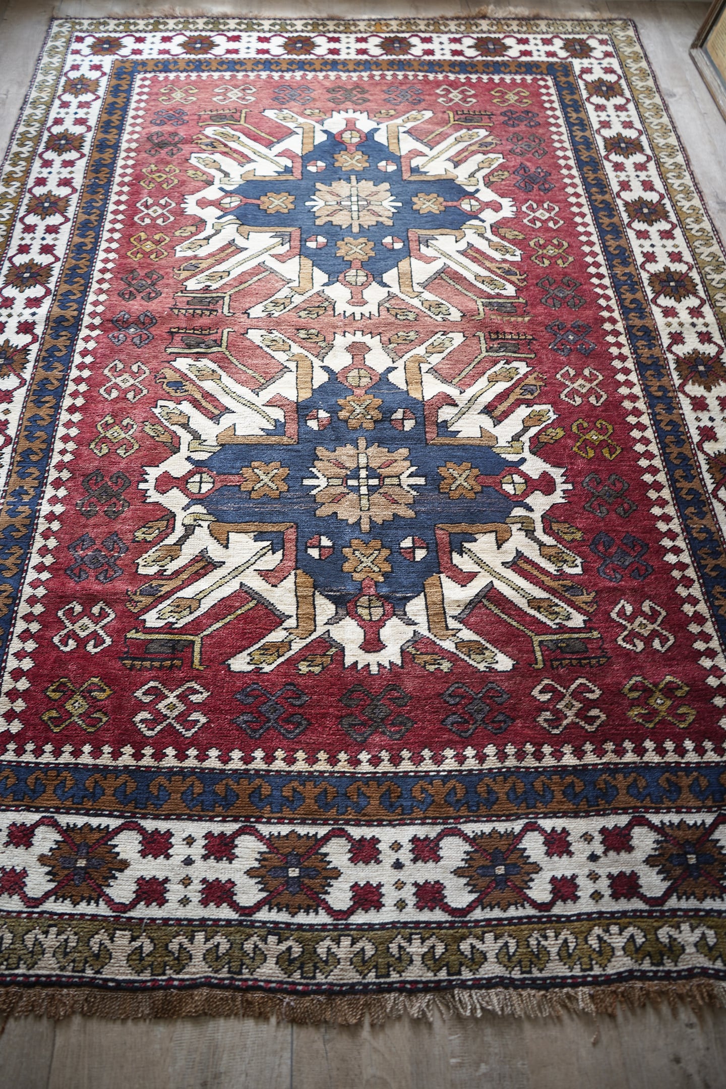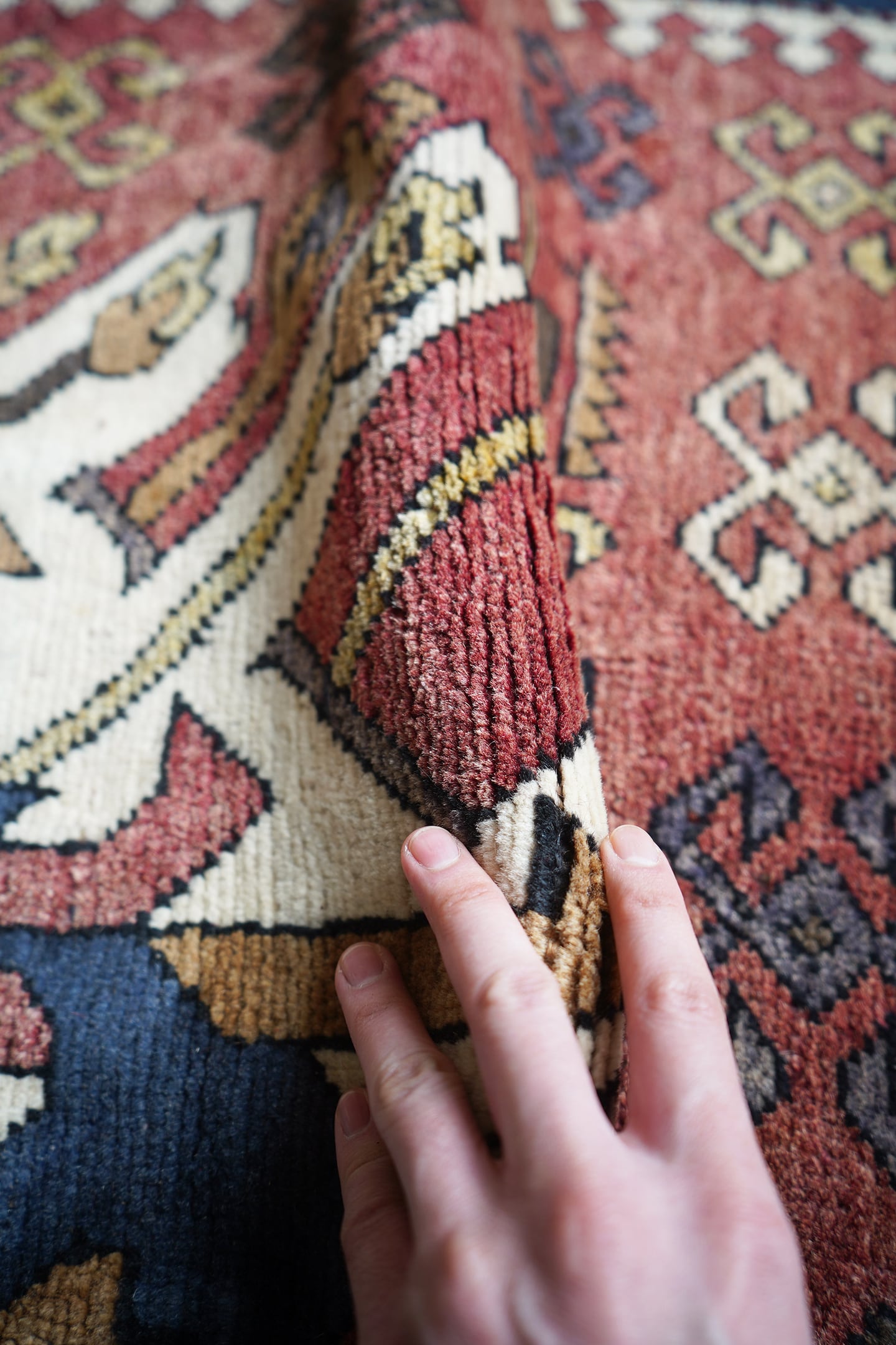 約1950年〜1960年頃にコーカサス地方で織られたヴィンテージのカザックラグです。フィールドの中央にはコーカサス地方に伝わる太陽の紋様から図案化されたとされる"サンバースト紋様(イーグルカザック紋様とも呼ばれています)"、そしてボーダーには蟹を模したとも言われているクラッブボーダーが見受けられます。フィールドの色味は赤紫の箇所と褪色により薄めのピンク色になっているところがございます(お写真最後をご参照ください)。毛並みも十分残っており、ふわふわとした気持ちの良い肌触り、厚みは6mmほどあります。コンディションとしては一部目立たないパイル抜けが1箇所ございます。このラグを一目見て、すぐに仕入れを決めたほど店主お気に入りのデザイン。「カッコいい」その一言に尽きます。リビングにこの大判のラグを一枚敷くだけで、お部屋の雰囲気もたちまち様変わりすることでしょう。インテリアの主役として、ぜひお迎えください♪