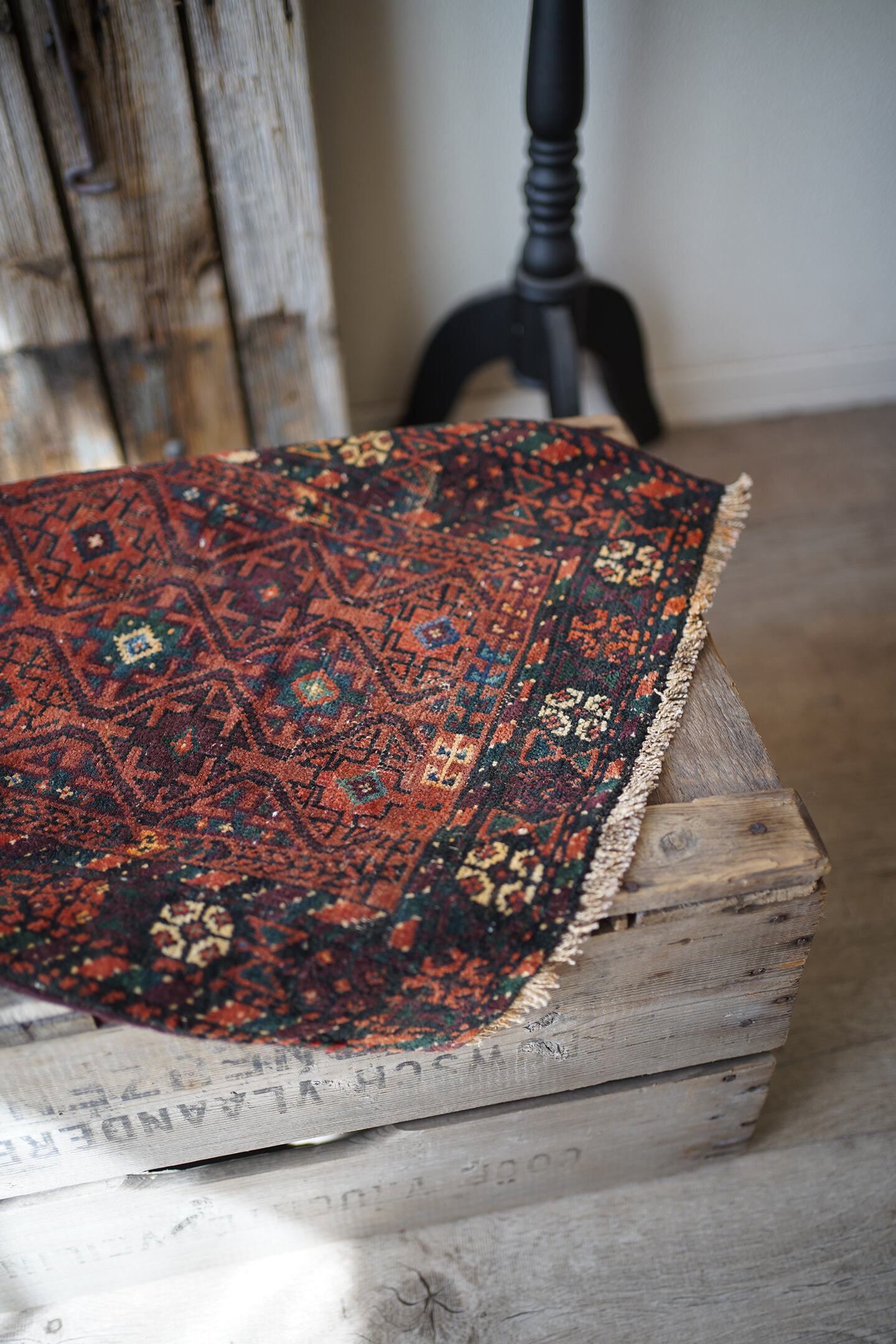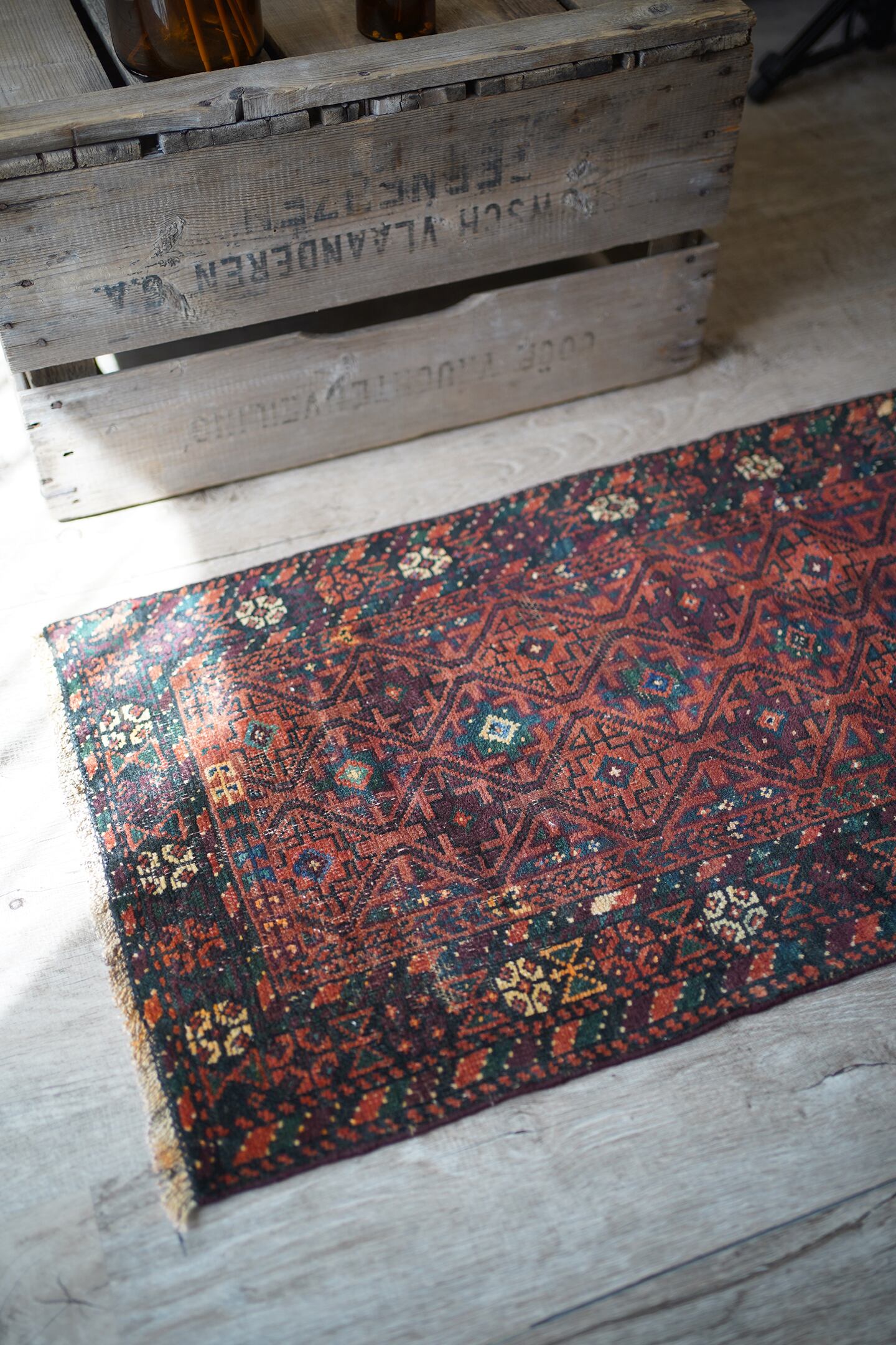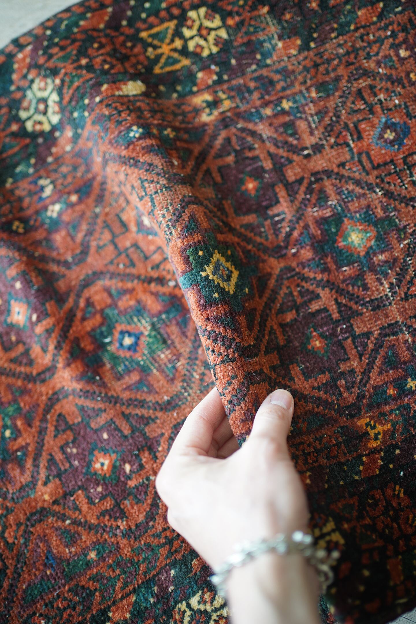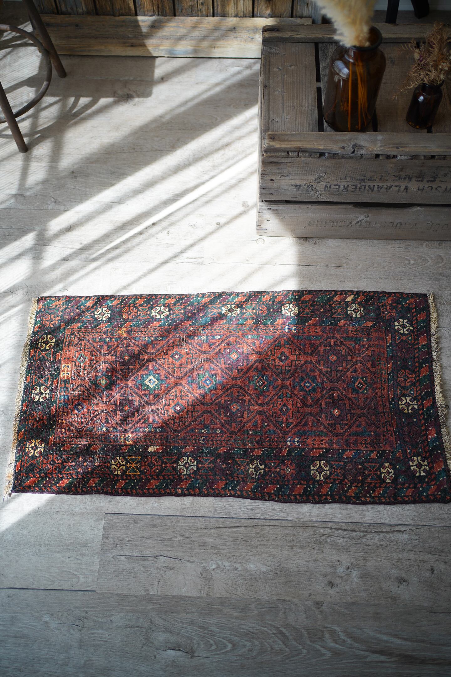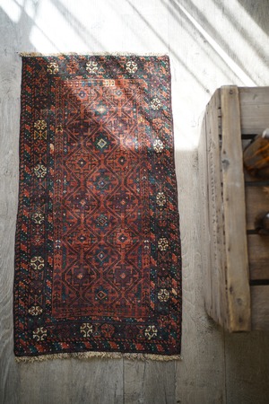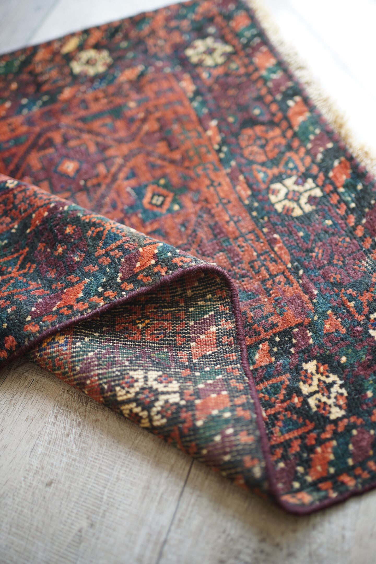 約100年ほど前にイラン南東部のシスターン地方で織られたアンティークのバルーチラグです。ブラウンと深い緑をベースとしたカラーリングで、経年による擦れ感も見受けられます。全体的にクタッと柔らかい質感で、表面はサラッとした肌触りです。こちらのラグは手織り特有の歪みがありますのでお写真最後の2枚をご参照ください(横にして見た時の方が、やや歪みが目立ちます)。厚みは3.5mm程度と薄いため、タペストリーとして壁に飾っても素敵かと思います♫