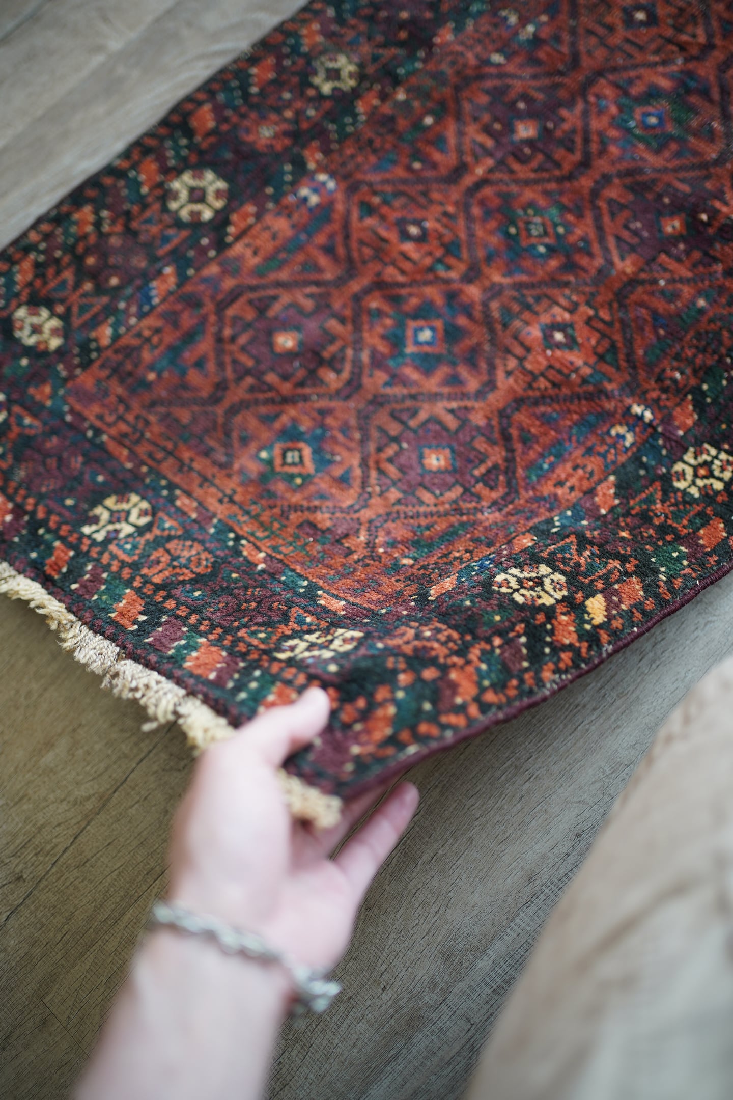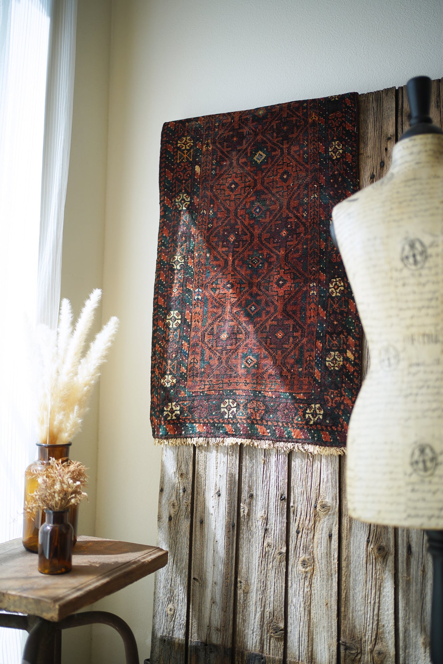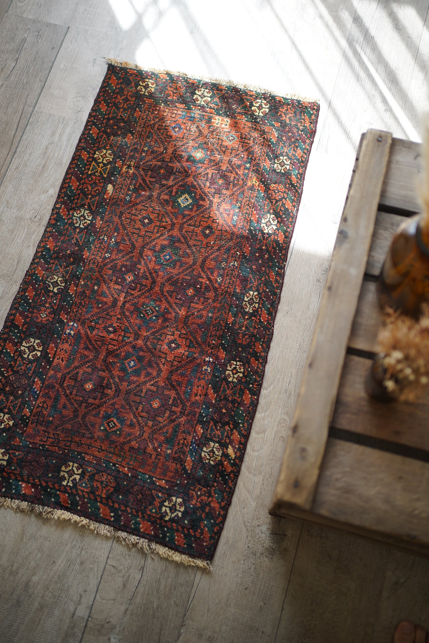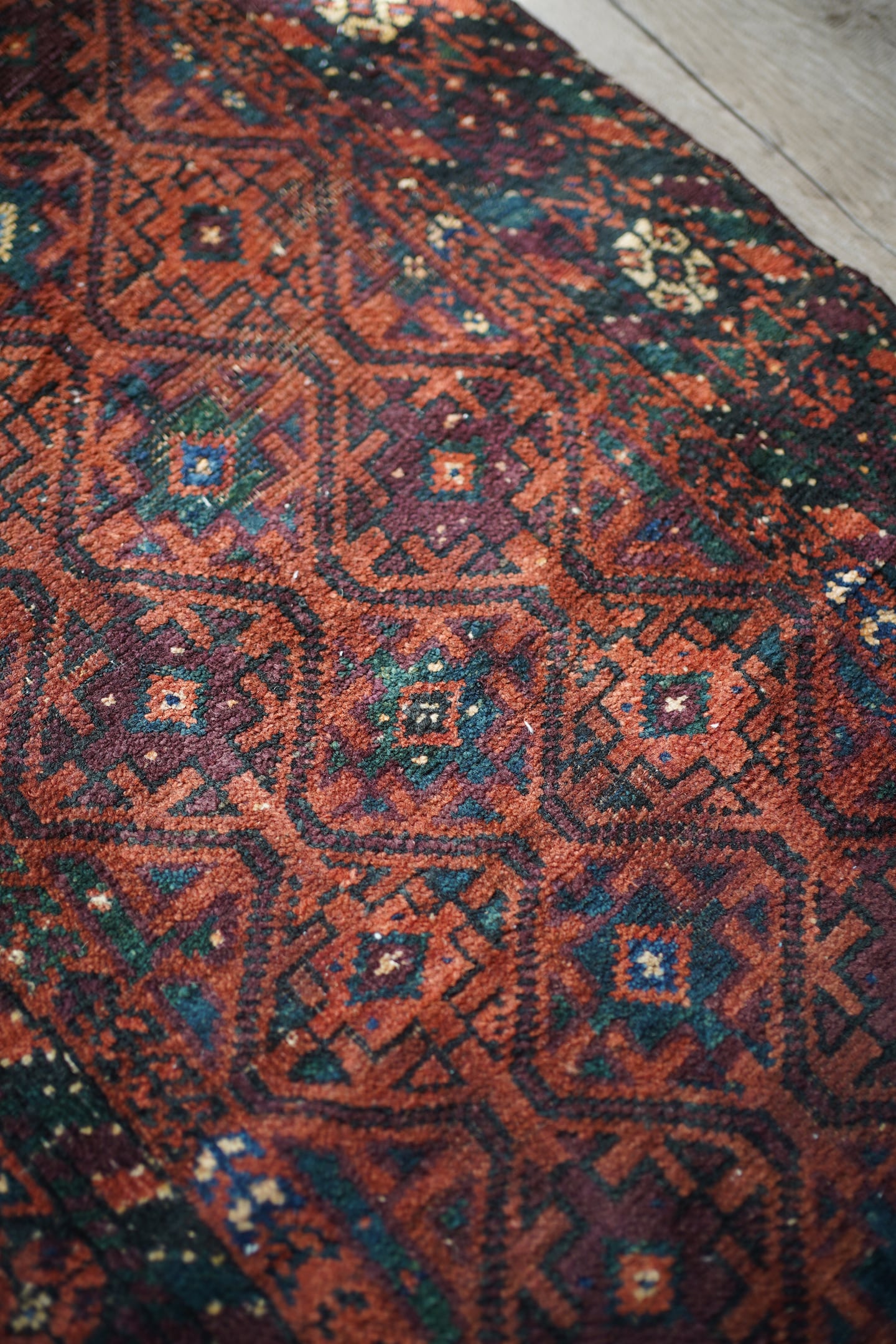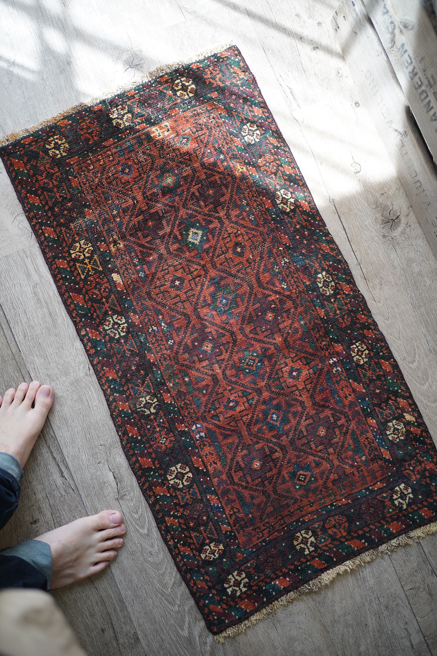 約100年ほど前にイラン南東部のシスターン地方で織られたアンティークのバルーチラグです。ブラウンと深い緑をベースとしたカラーリングで、経年による擦れ感も見受けられます。全体的にクタッと柔らかい質感で、表面はサラッとした肌触りです。こちらのラグは手織り特有の歪みがありますのでお写真最後の2枚をご参照ください(横にして見た時の方が、やや歪みが目立ちます)。厚みは3.5mm程度と薄いため、タペストリーとして壁に飾っても素敵かと思います♫