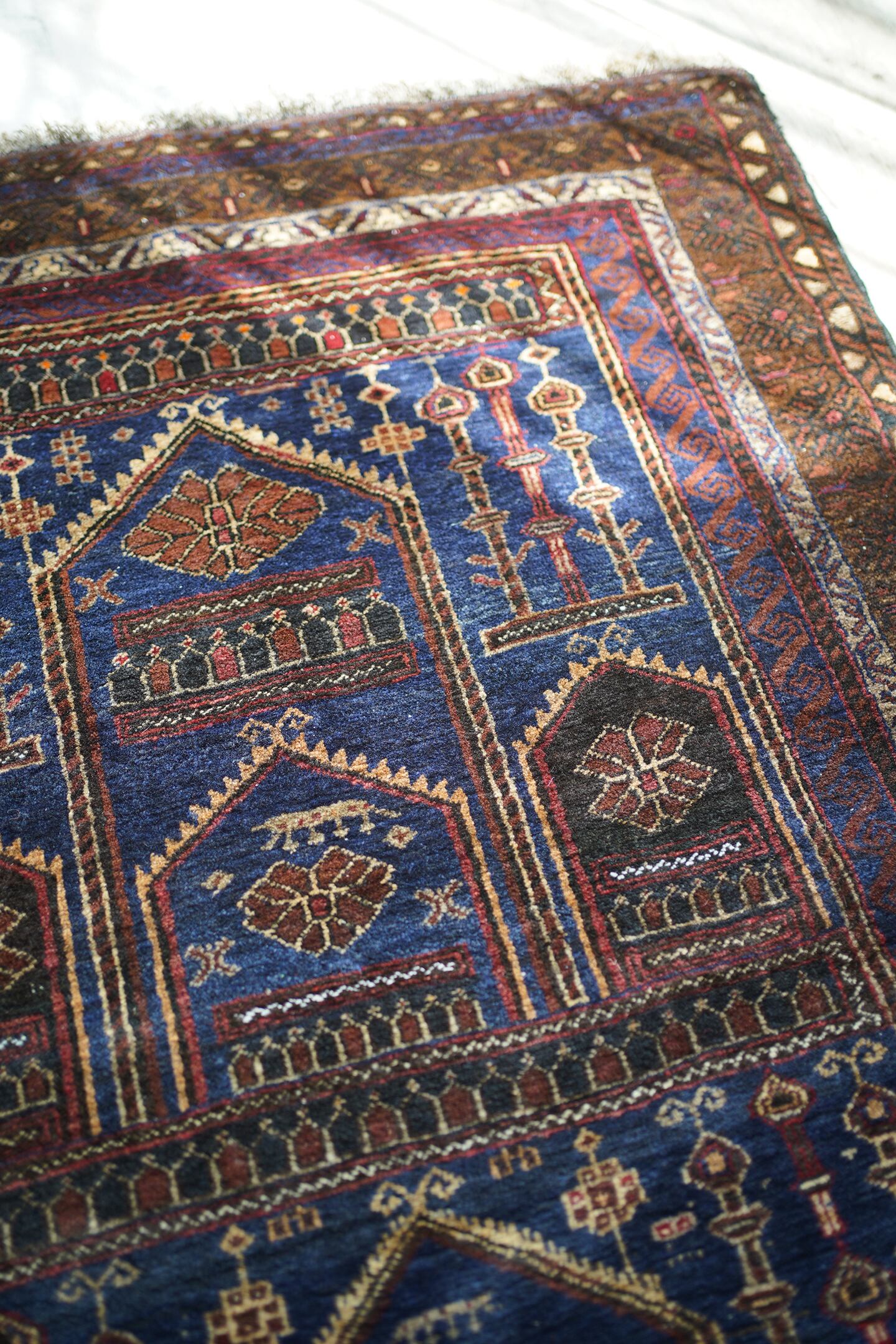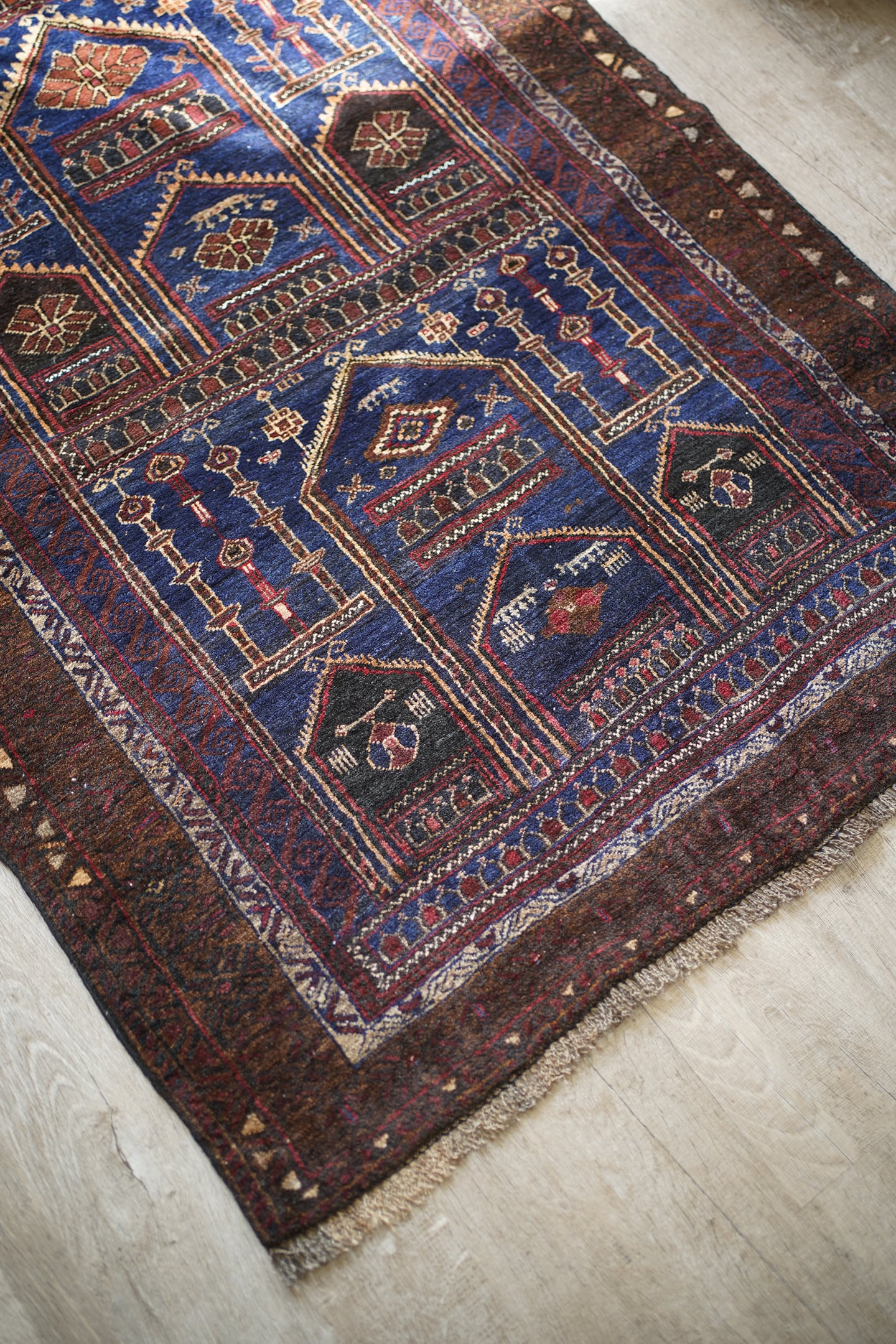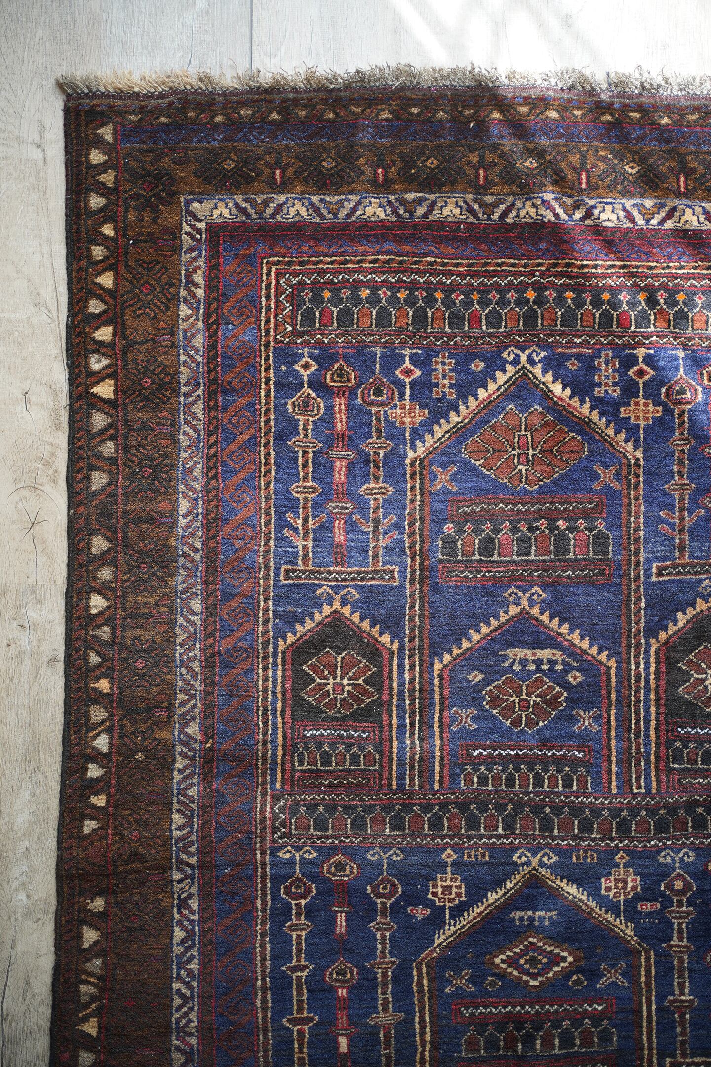 "ミフラーブ"と呼ばれるイスラム建築由来の紋様が特徴的な経年約60年のアフガンバルーチ。ネイビーと濃いブラウンをベースカラーにした配色で、このラグを一目見た瞬間にバランスの取れた細かい色使いにとてもセンスを感じました。ミフラーブ紋様のラグはよく見かけますが、ここまで惚れ惚れするカッコ良さのものはなかなかなく、眺めているだけでうっとりしてしまうほど。表面の毛並みはサラふわっとした優しい肌触りで、7mm程度の程よい厚みがあります。補修跡もなく、コンディションも良好です。ベッドサイドに敷いたり、一人掛けの椅子とコーディネートしても大変素敵かと思います♪