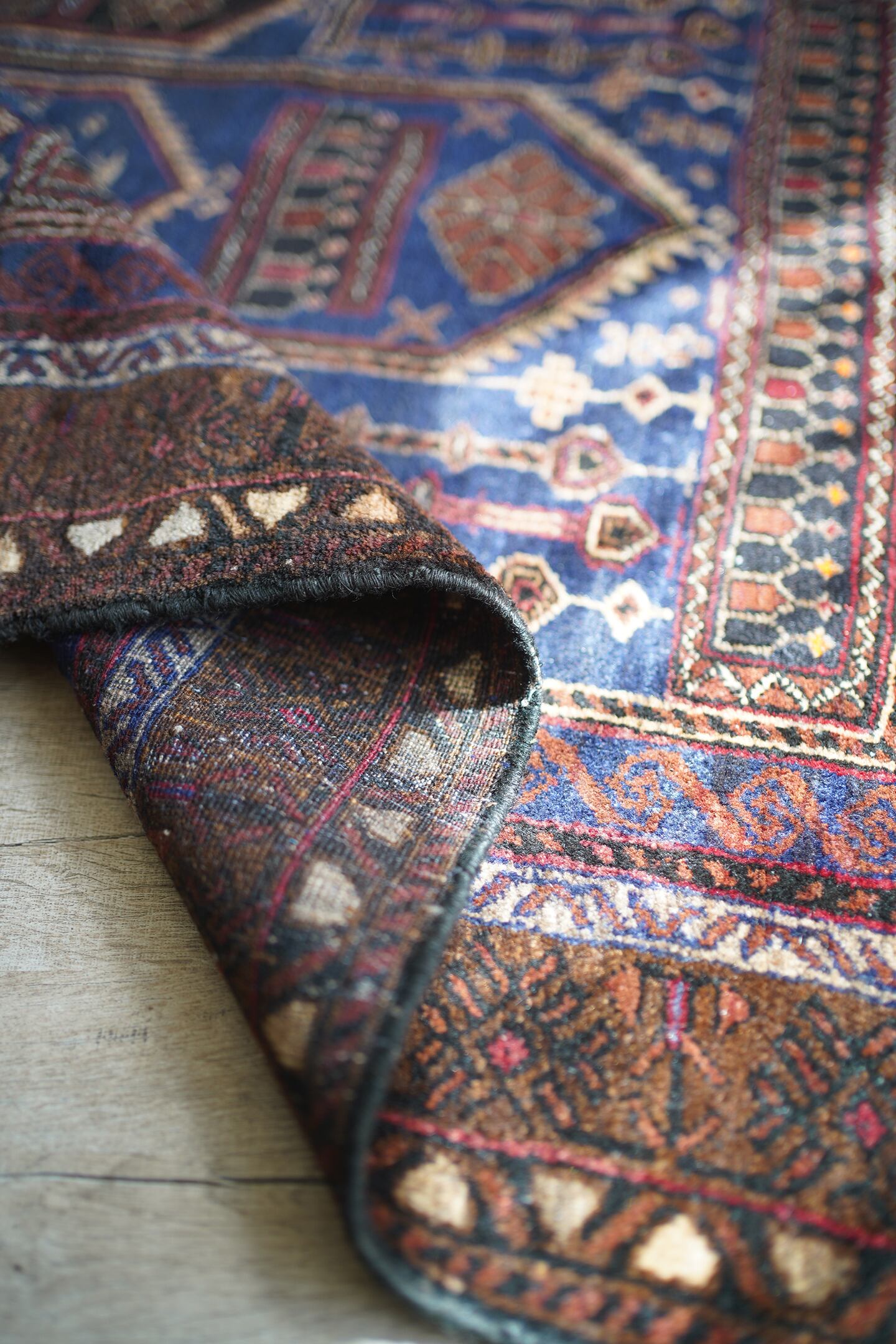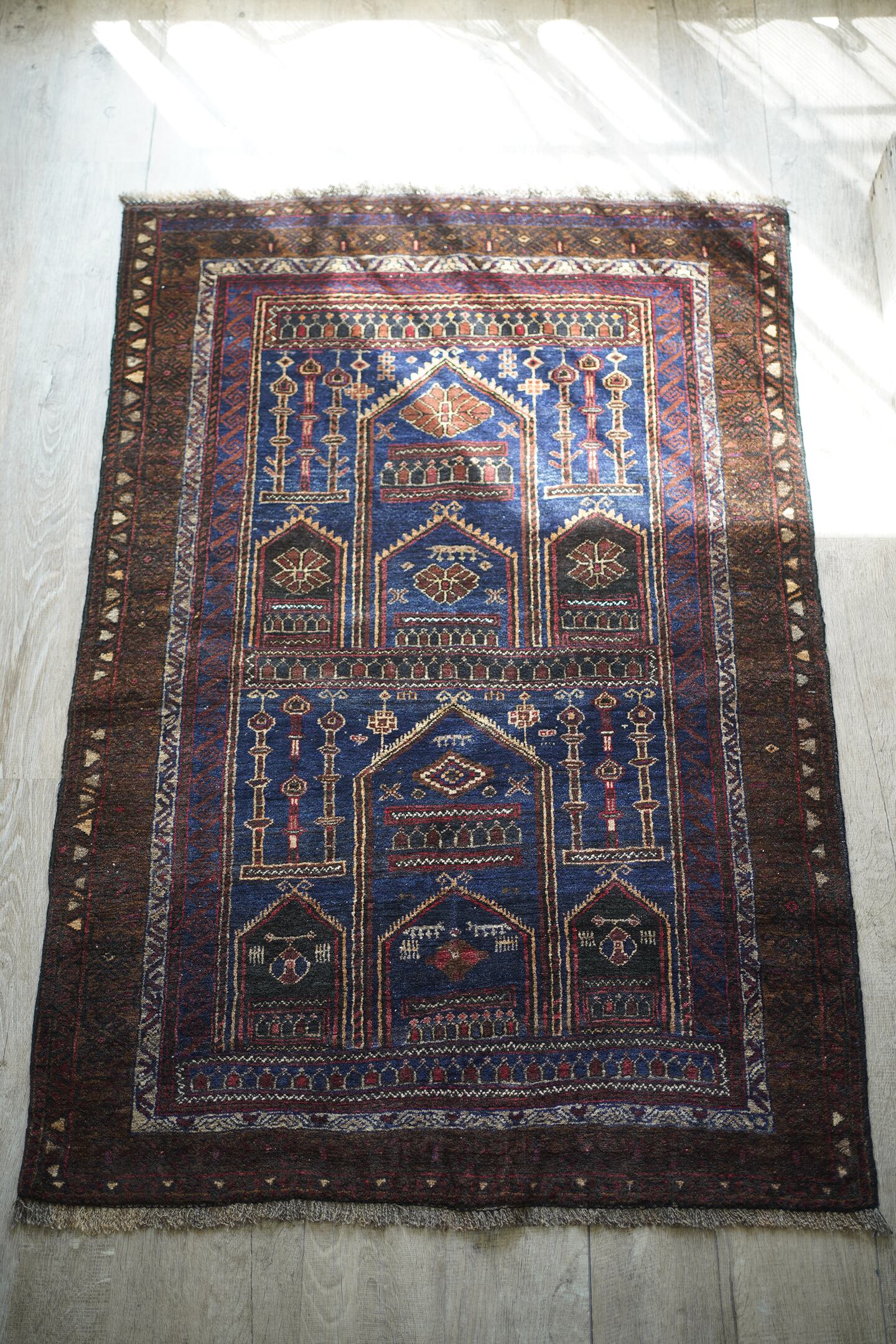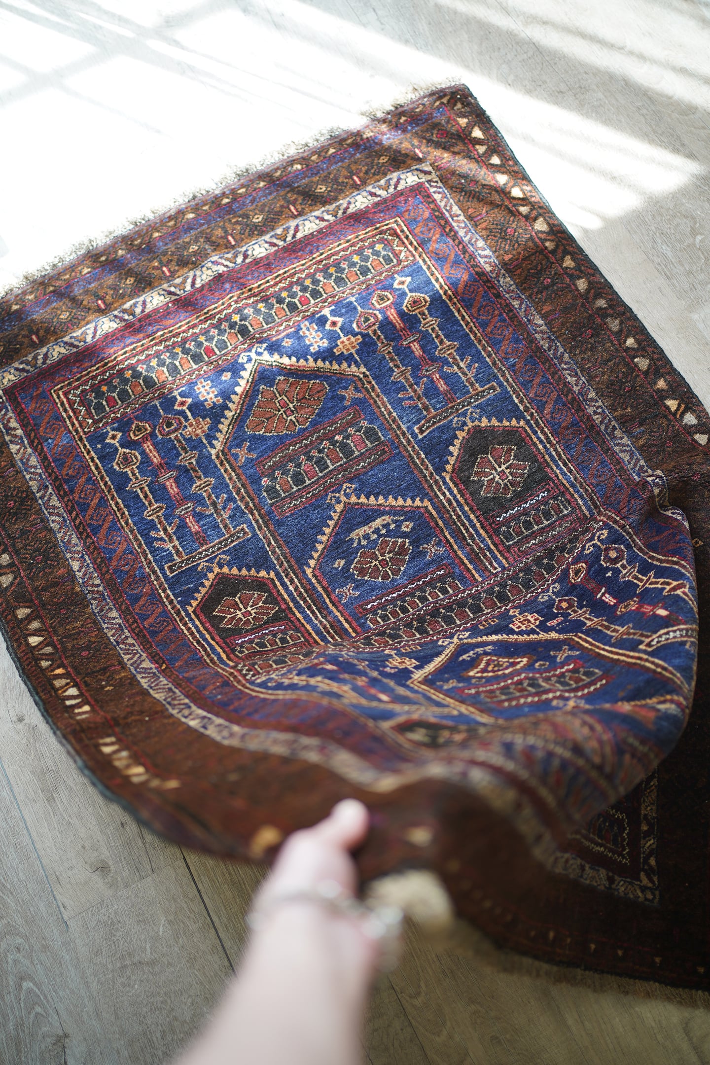"ミフラーブ"と呼ばれるイスラム建築由来の紋様が特徴的な経年約60年のアフガンバルーチ。ネイビーと濃いブラウンをベースカラーにした配色で、このラグを一目見た瞬間にバランスの取れた細かい色使いにとてもセンスを感じました。ミフラーブ紋様のラグはよく見かけますが、ここまで惚れ惚れするカッコ良さのものはなかなかなく、眺めているだけでうっとりしてしまうほど。表面の毛並みはサラふわっとした優しい肌触りで、7mm程度の程よい厚みがあります。補修跡もなく、コンディションも良好です。ベッドサイドに敷いたり、一人掛けの椅子とコーディネートしても大変素敵かと思います♪