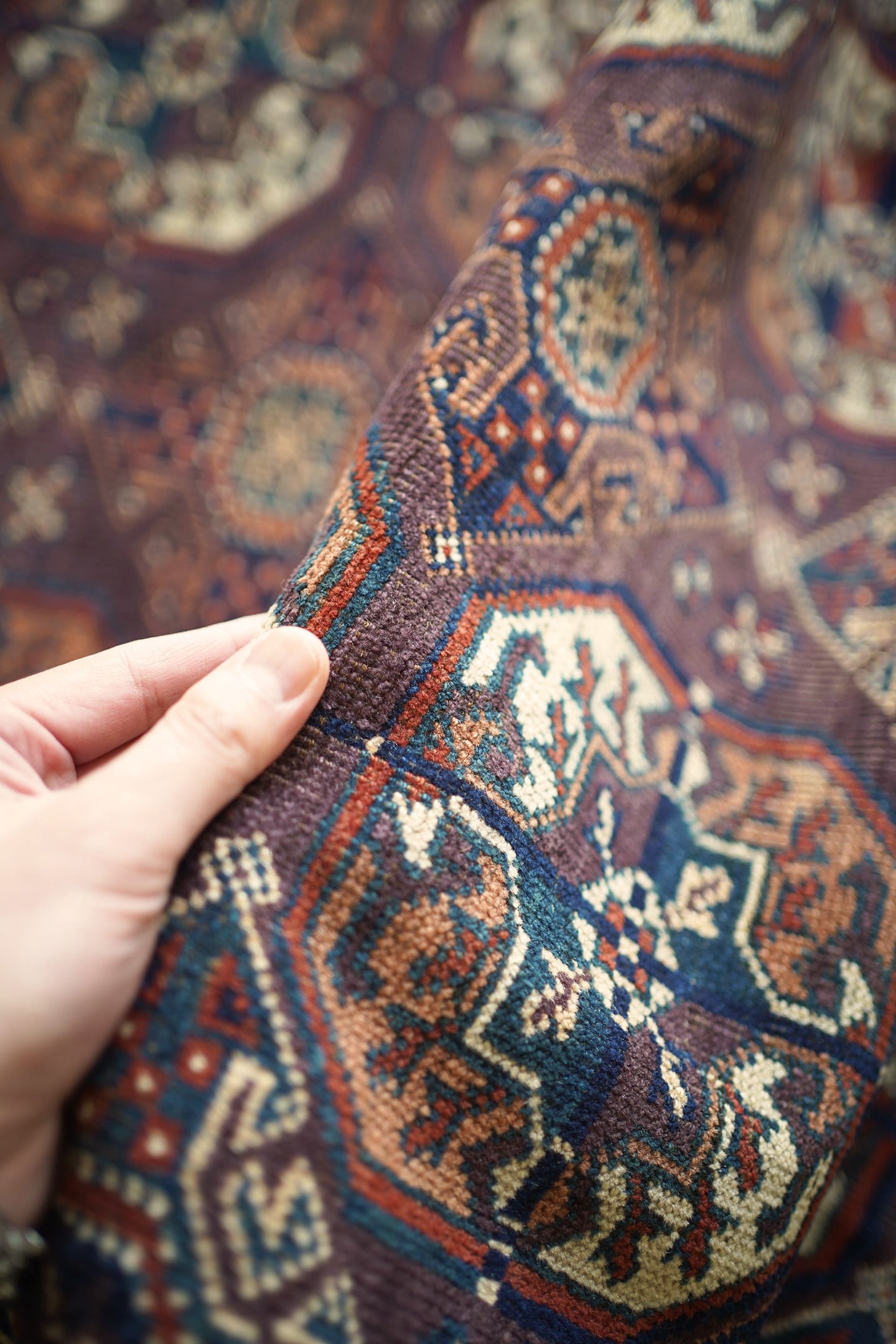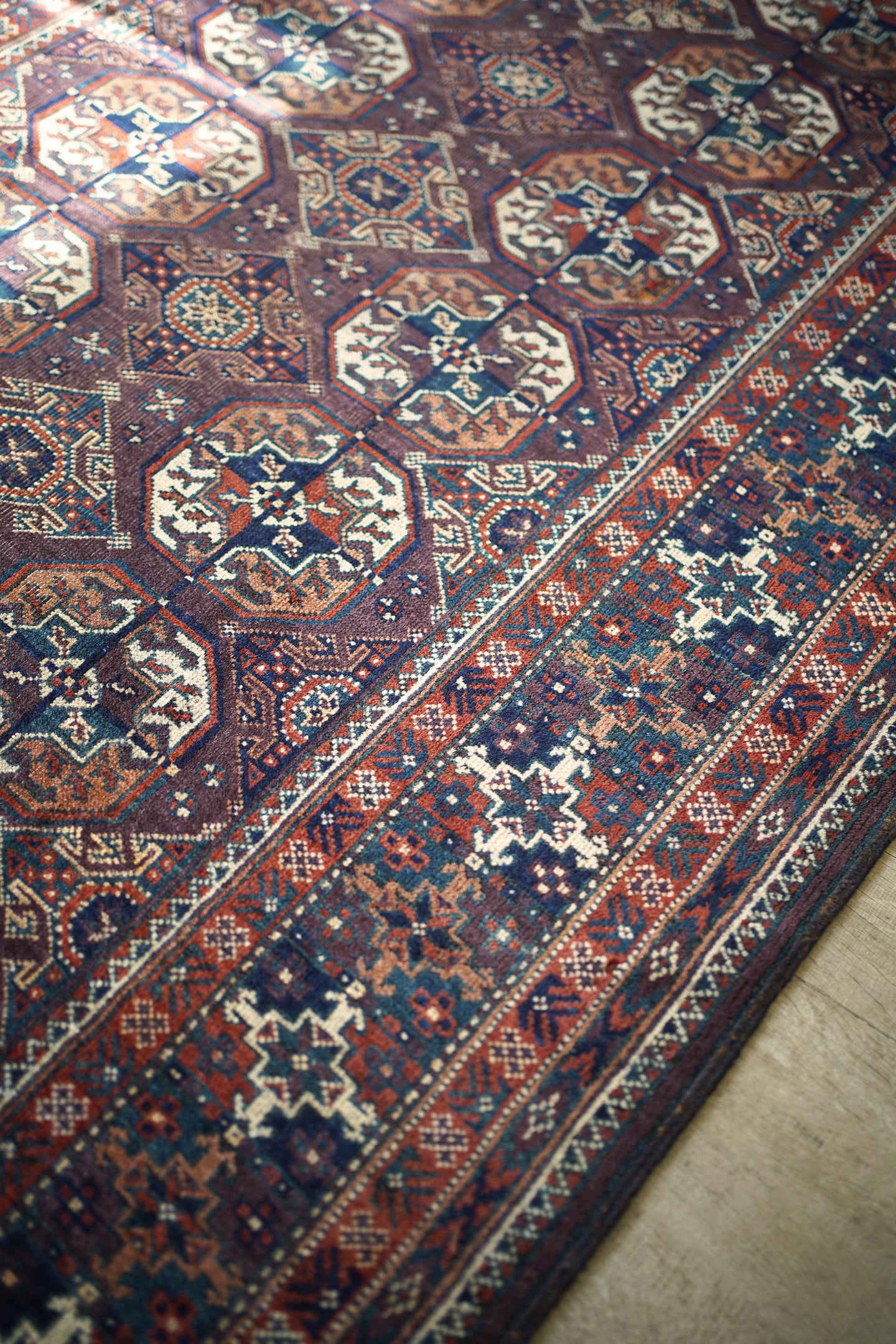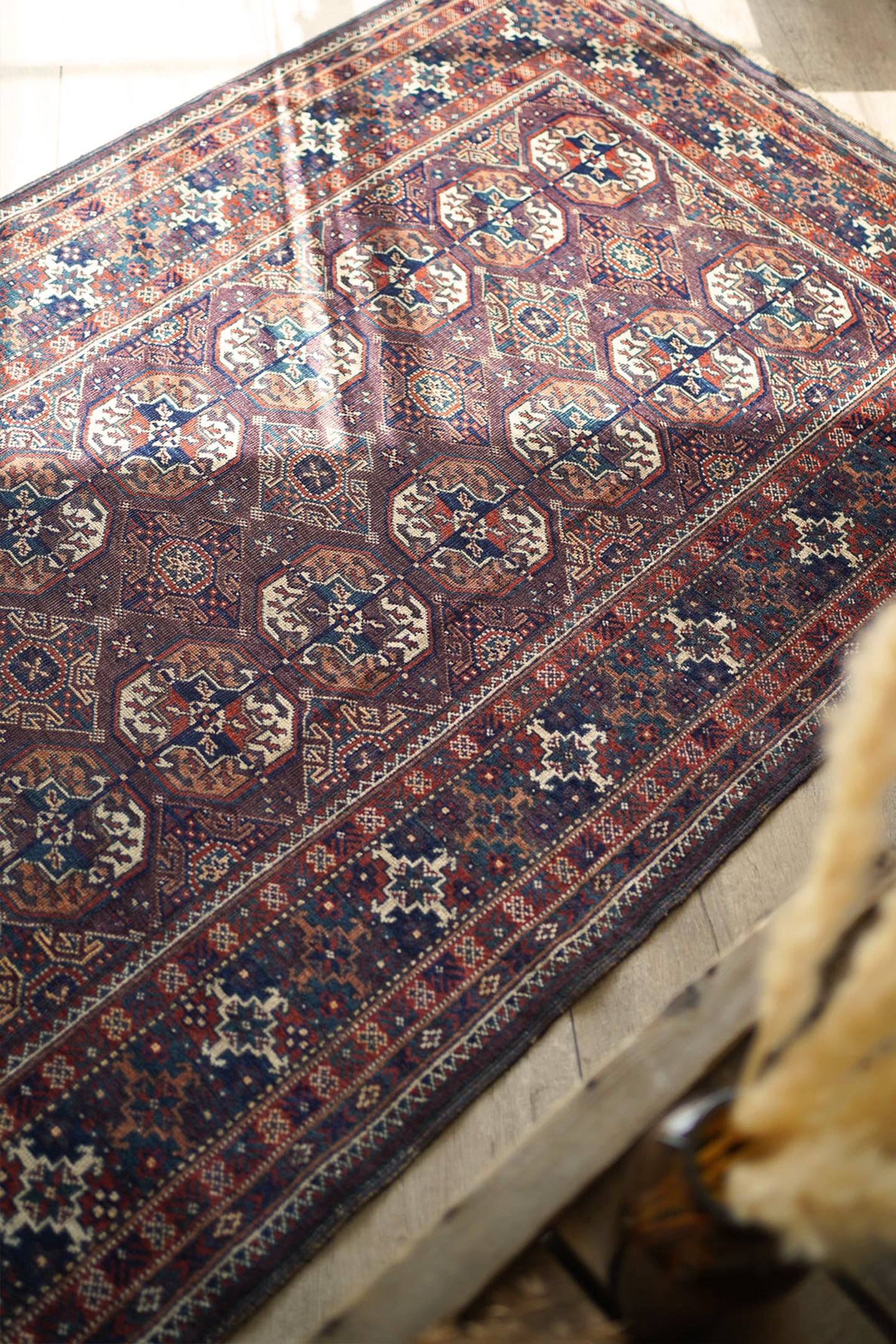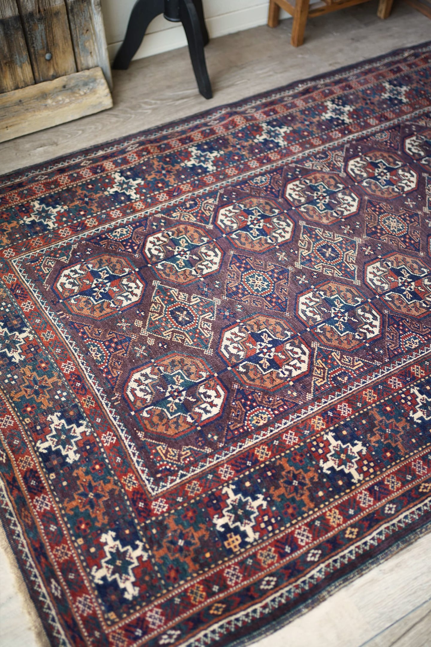 約110年ほど前に織られたアンティークのイラン産バルーチラグです。小豆色にも見えるブラウンカラーをベースにテッケギュルと十字型のグルバゲギュルの紋様が綺麗に配置されたデザイン。全体的に繊細な織りで紋様が美しく浮かび上がっている大変素晴らしいクオリティのラグです。補修跡もなく、この年代のラグでは珍しいほどパーフェクトなコンディション。表面はサラッと優しい肌触りです。厚みが約3.5mmほどと薄手のため、折り畳んでの収納も場所を取らないところも利点です。ベッドサイドや書斎などお気に入りの場所にどうぞ♪