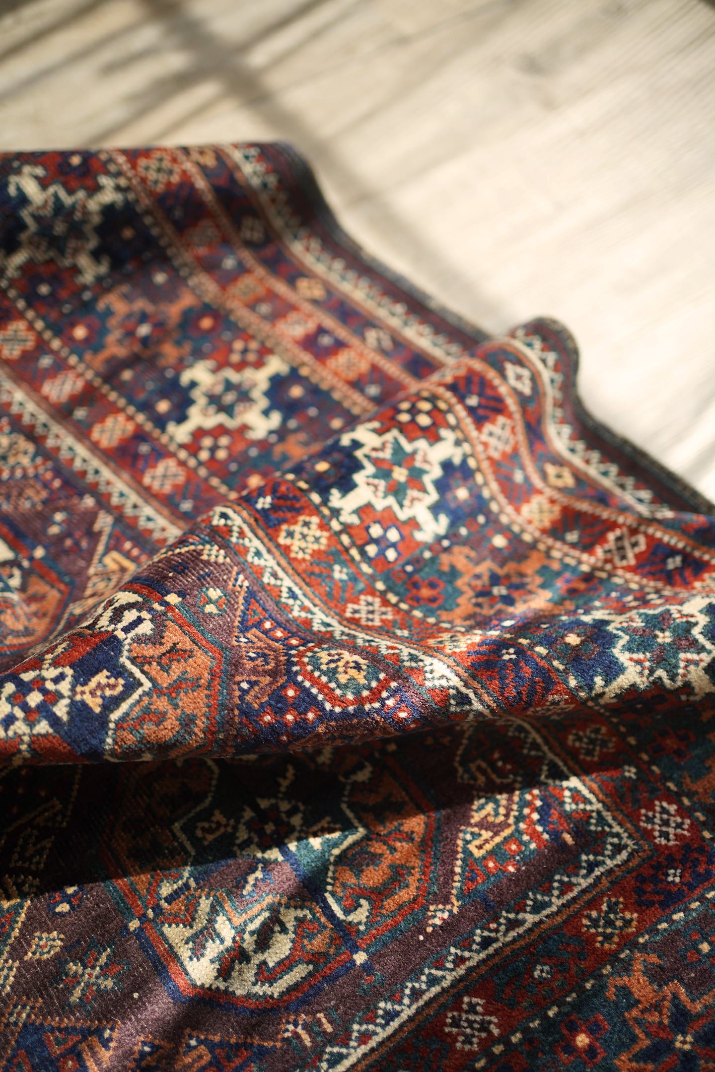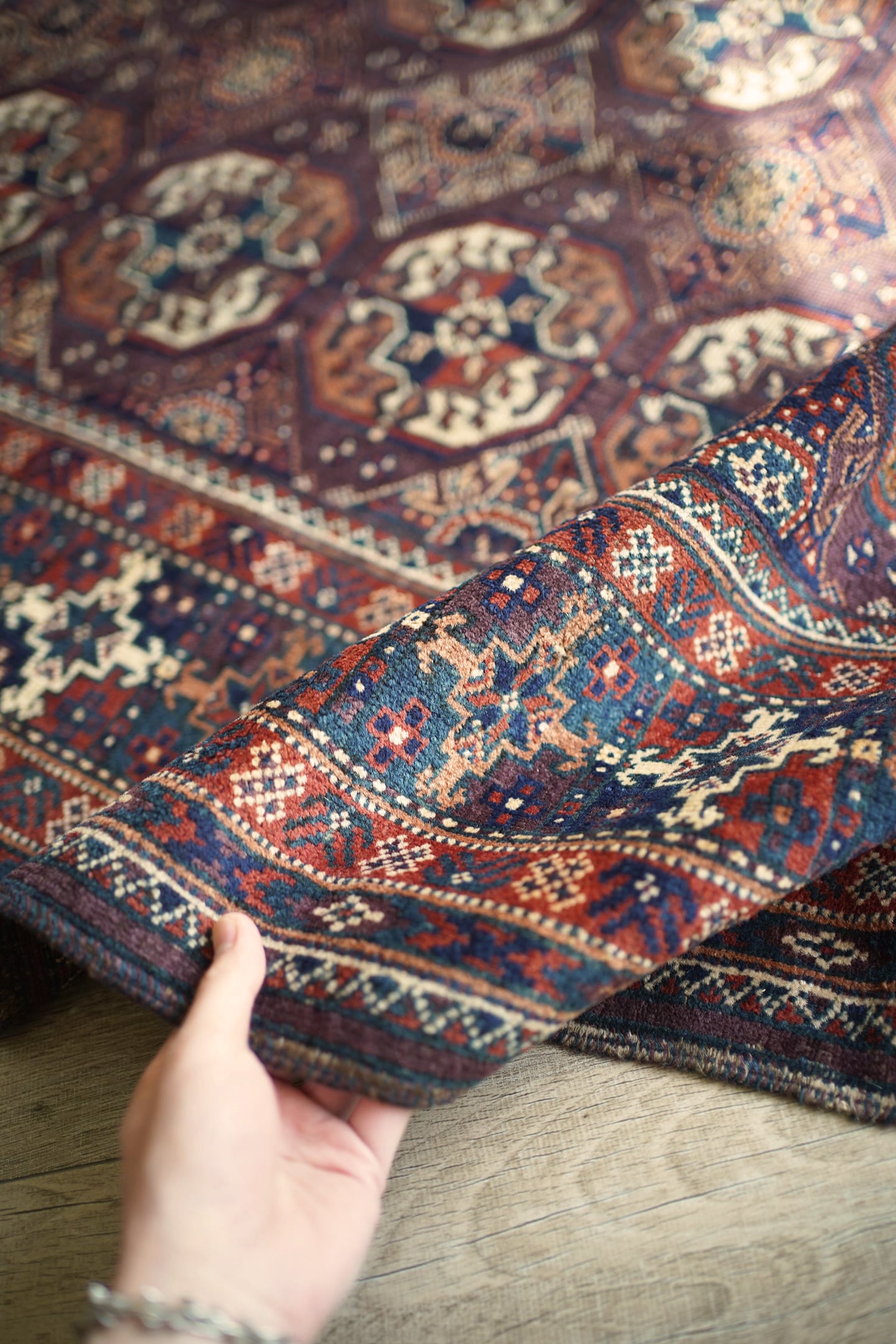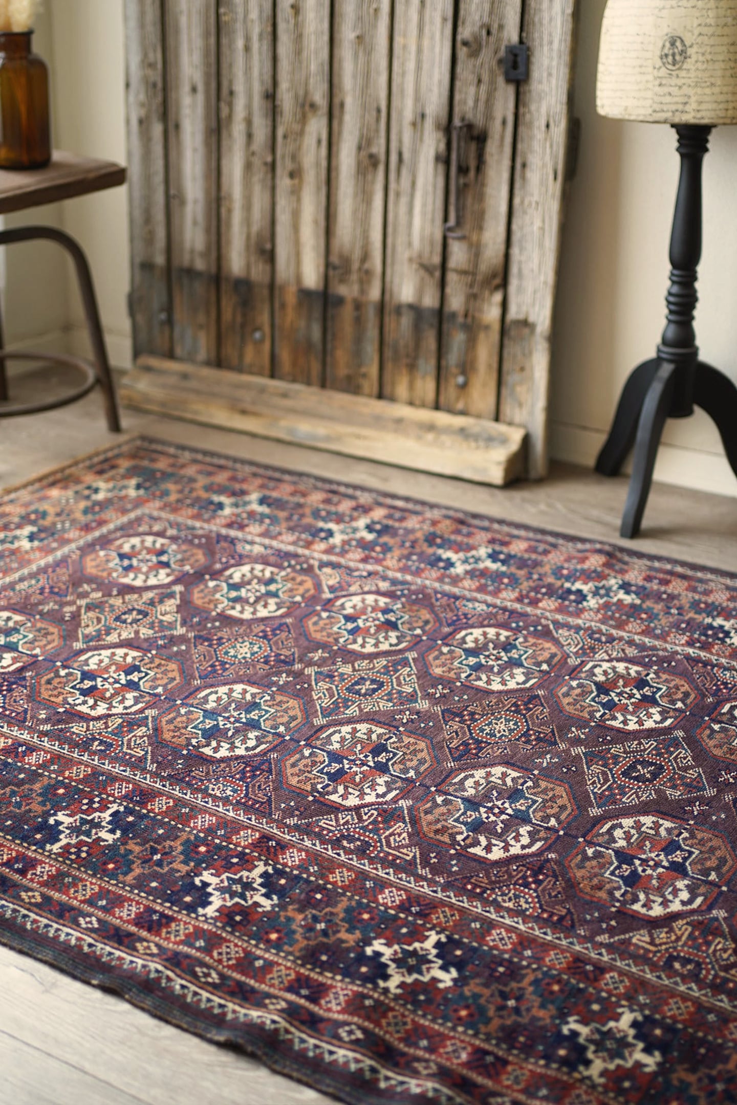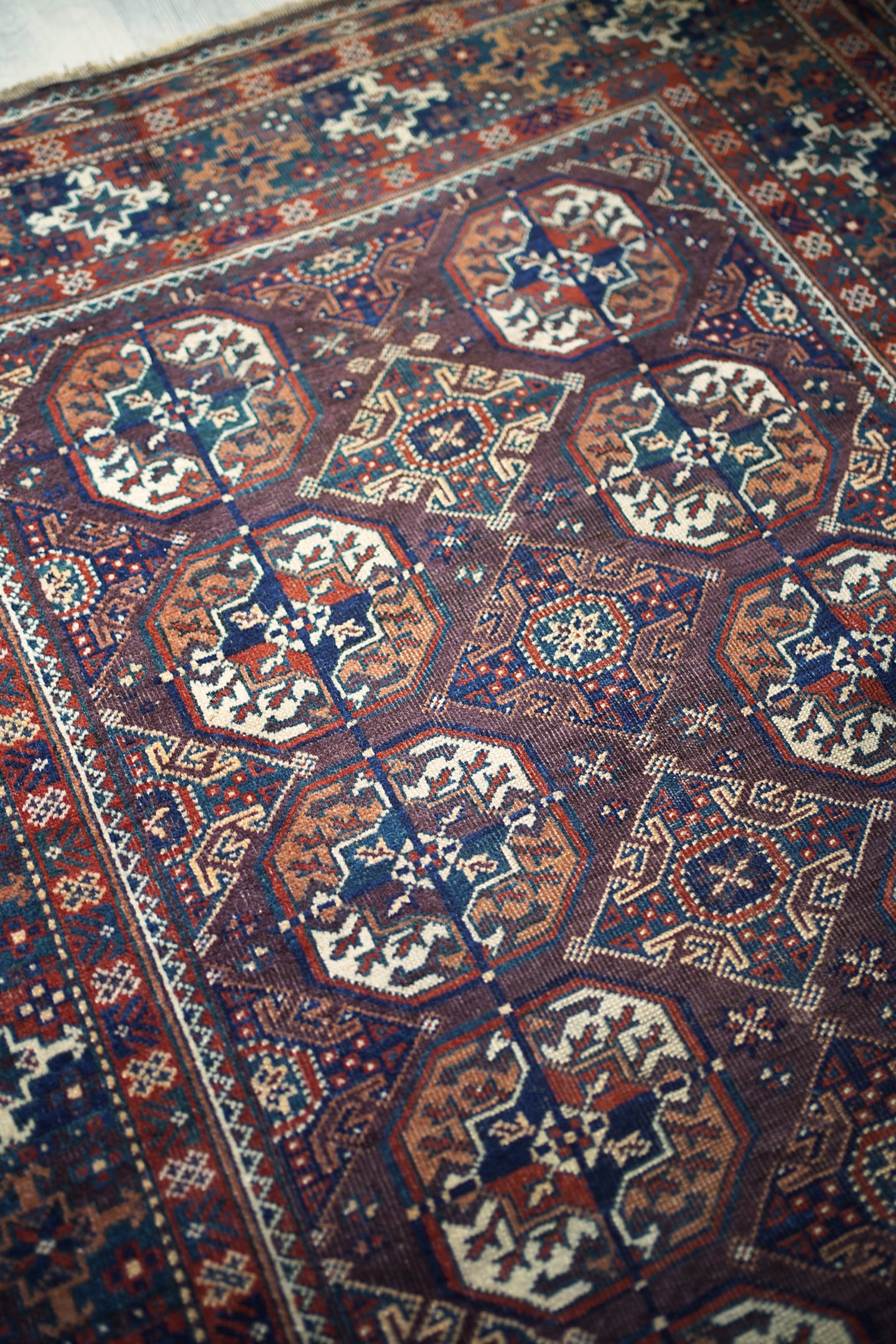 約110年ほど前に織られたアンティークのイラン産バルーチラグです。小豆色にも見えるブラウンカラーをベースにテッケギュルと十字型のグルバゲギュルの紋様が綺麗に配置されたデザイン。全体的に繊細な織りで紋様が美しく浮かび上がっている大変素晴らしいクオリティのラグです。補修跡もなく、この年代のラグでは珍しいほどパーフェクトなコンディション。表面はサラッと優しい肌触りです。厚みが約3.5mmほどと薄手のため、折り畳んでの収納も場所を取らないところも利点です。ベッドサイドや書斎などお気に入りの場所にどうぞ♪