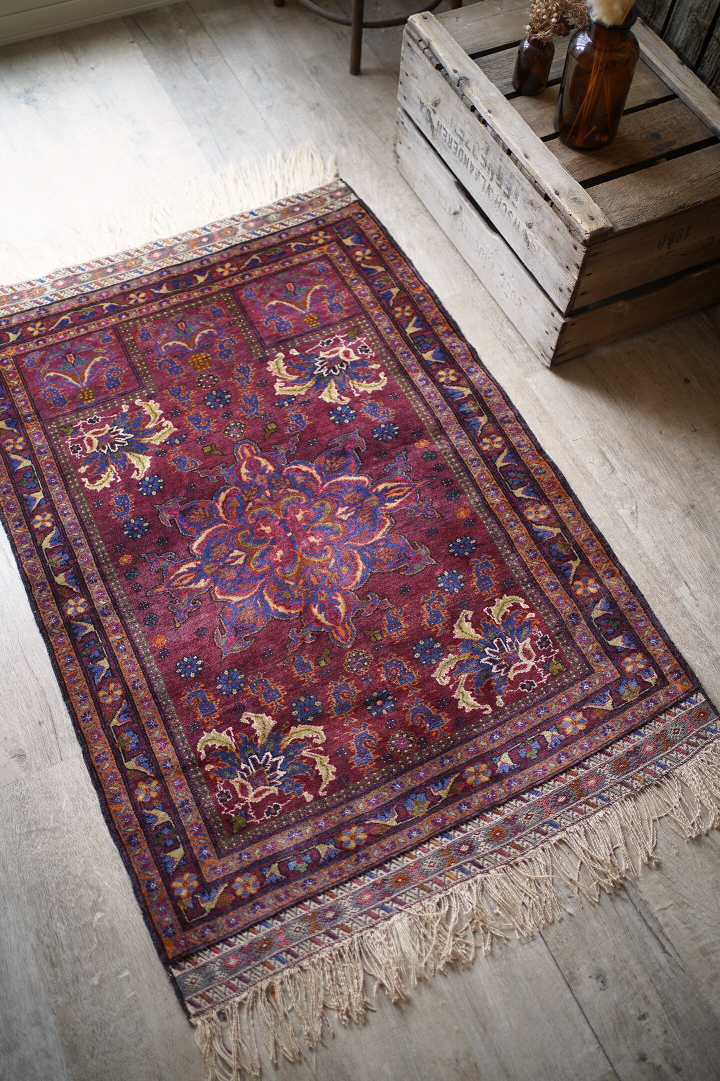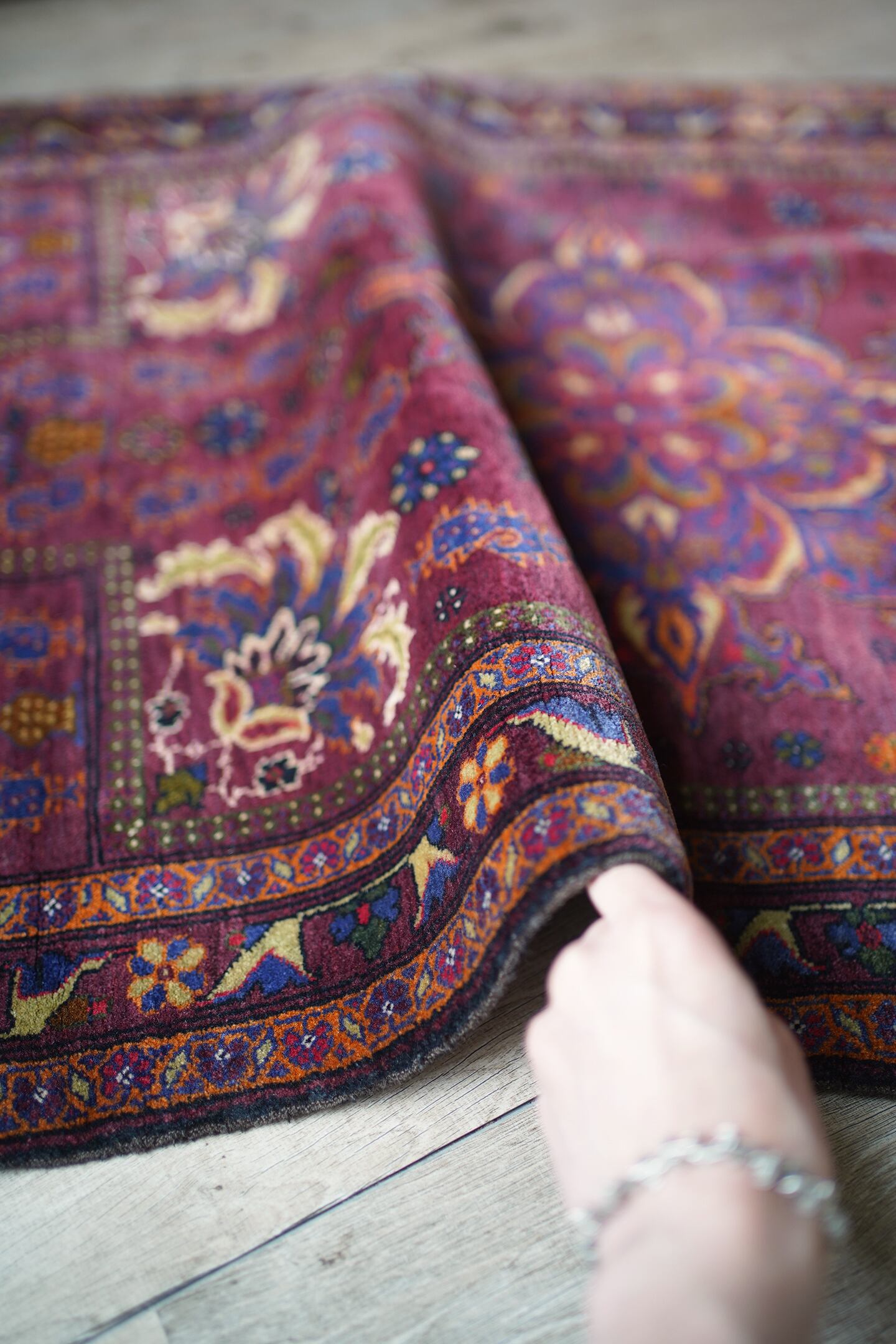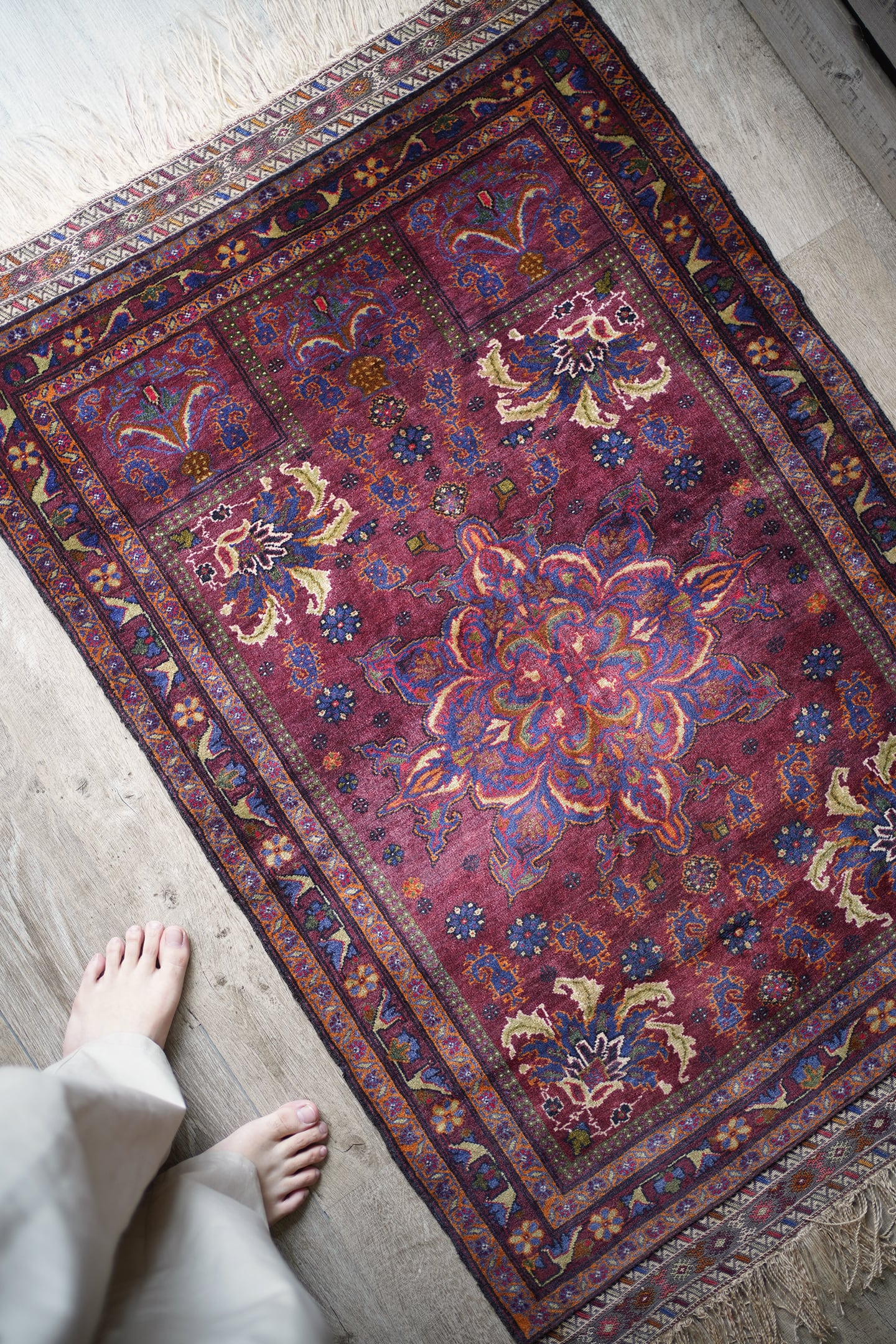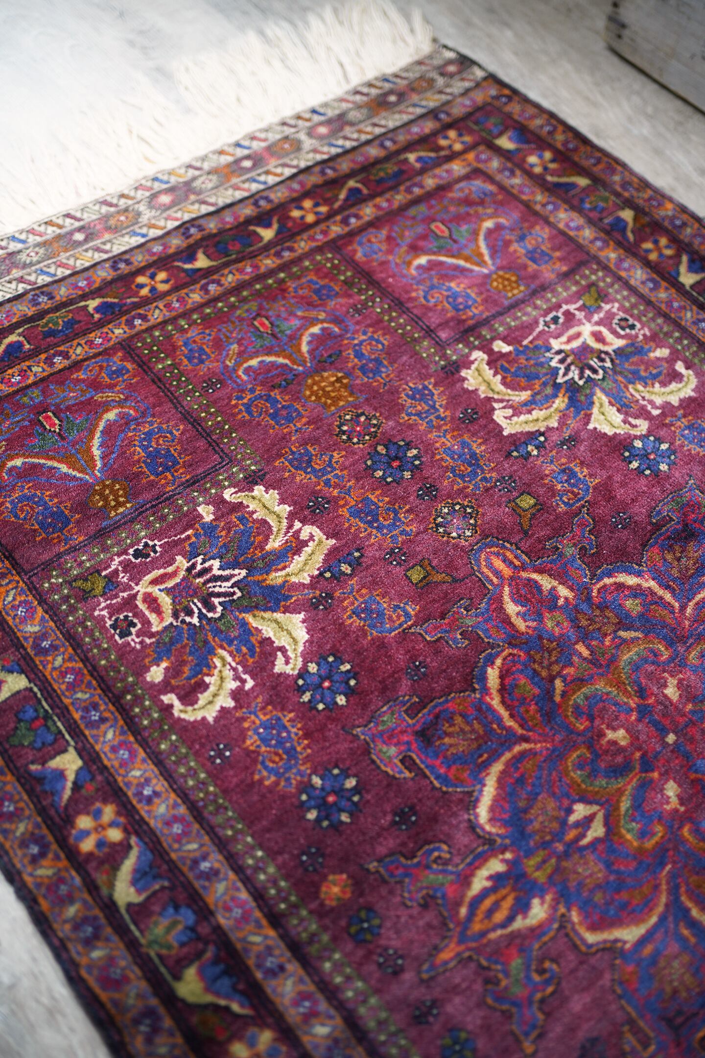 ソフトウールでふわっと滑らか、上質な優しい肌触りのアフガニスタン産のバルーチラグ。気品溢れるバイオレットカラーと織り込まれた花柄が美しく、両サイドの綺麗なキリムエンドもポイントです。フリンジで一部短くなっている箇所や隙間が空いてしまっている箇所がありますが、全体的に長めのフリンジのため、あまり目立つことなく気にならないかと思われます(お写真最後の2枚をご参照ください)。厚みは6mmほど。玄関をはじめ洗面スペースなど色んな場所に敷けそうです♫