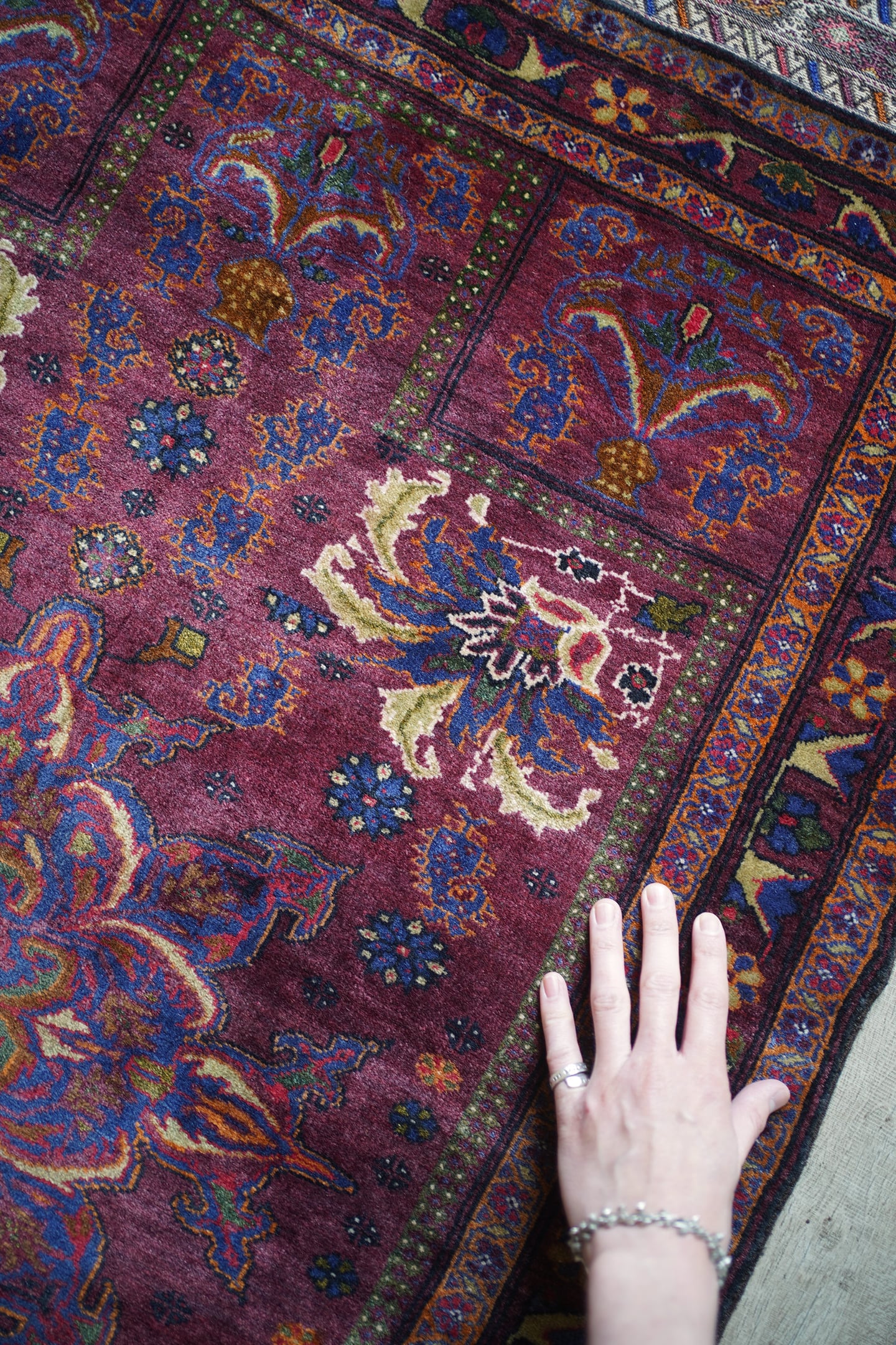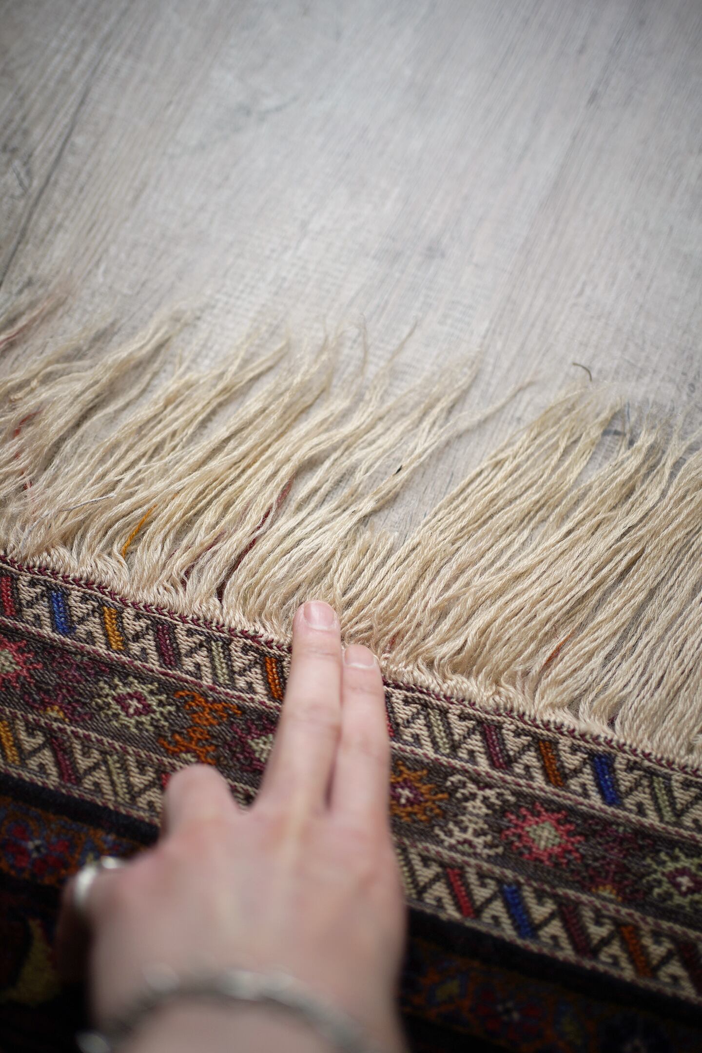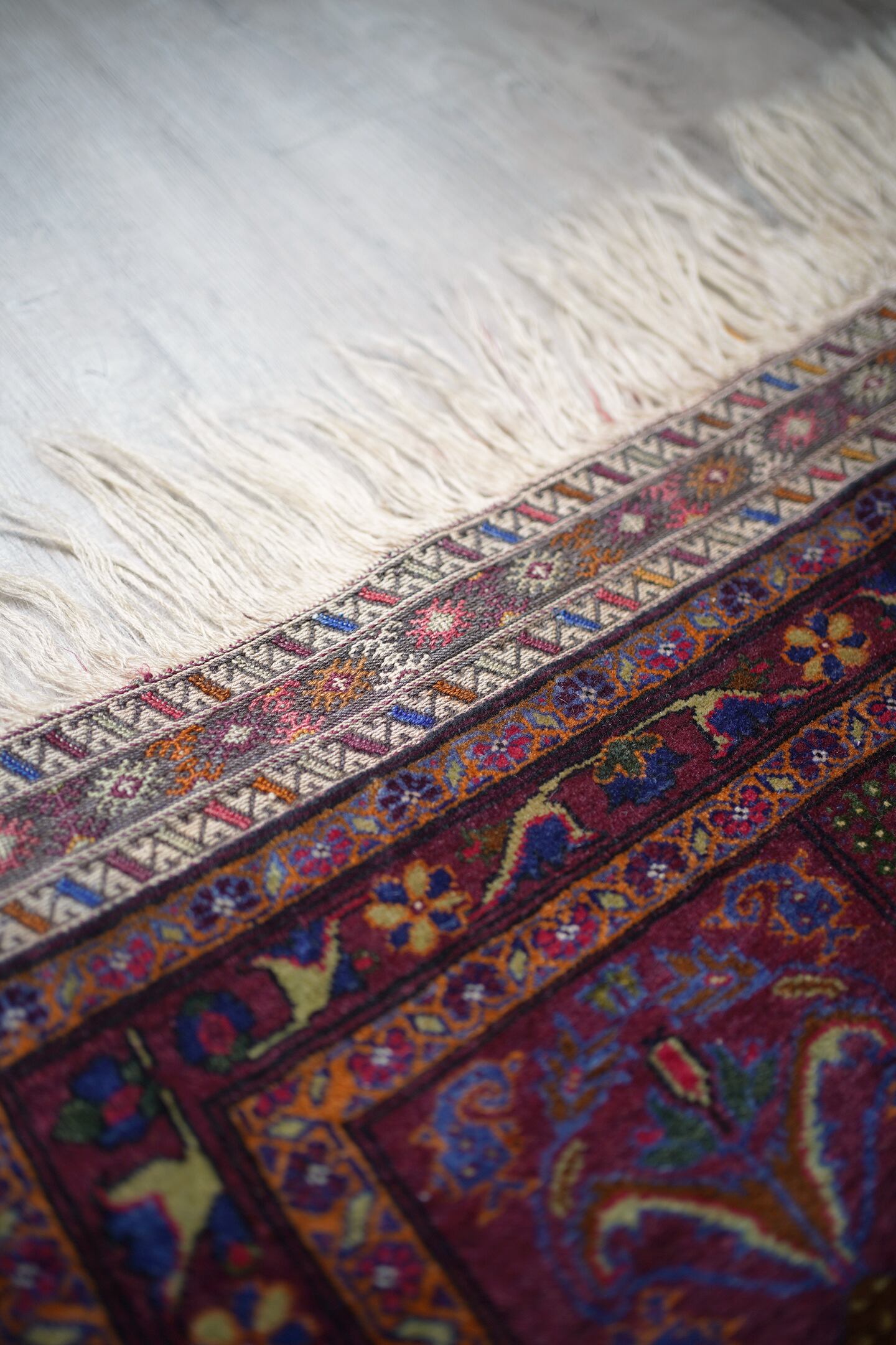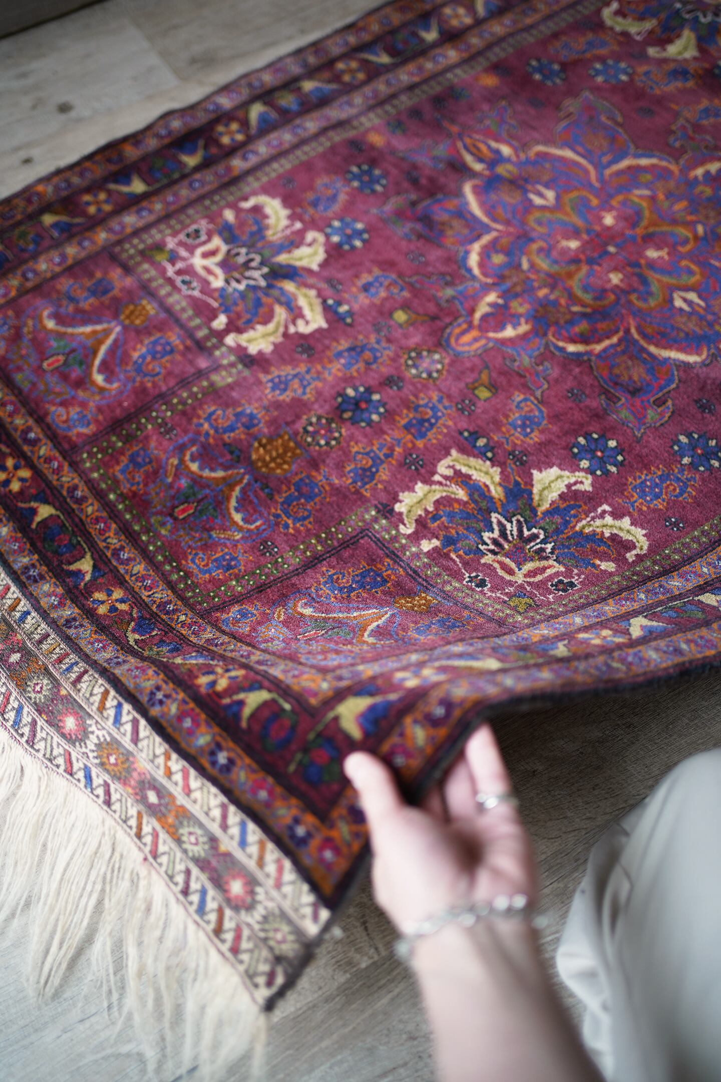 ソフトウールでふわっと滑らか、上質な優しい肌触りのアフガニスタン産のバルーチラグ。気品溢れるバイオレットカラーと織り込まれた花柄が美しく、両サイドの綺麗なキリムエンドもポイントです。フリンジで一部短くなっている箇所や隙間が空いてしまっている箇所がありますが、全体的に長めのフリンジのため、あまり目立つことなく気にならないかと思われます(お写真最後の2枚をご参照ください)。厚みは6mmほど。玄関をはじめ洗面スペースなど色んな場所に敷けそうです♫