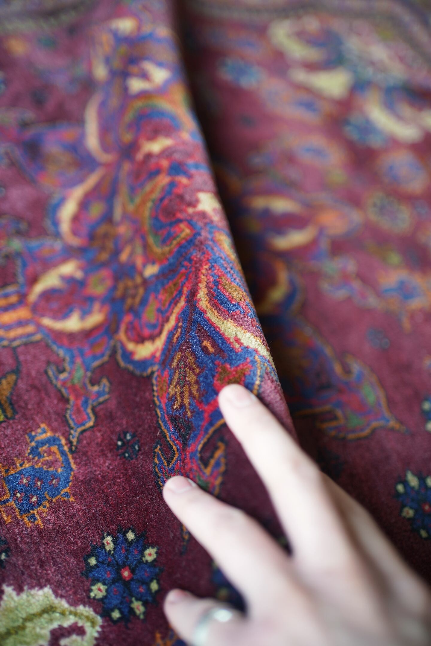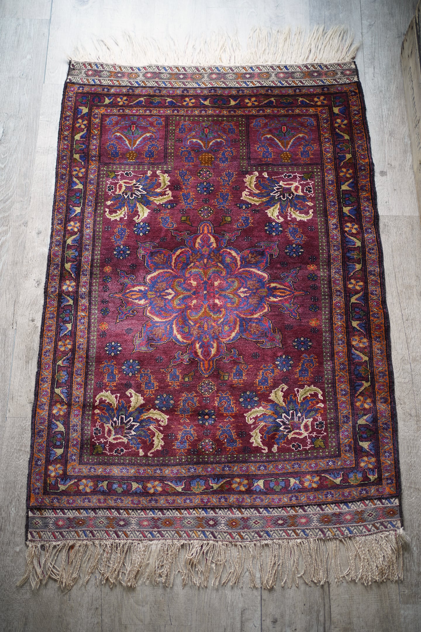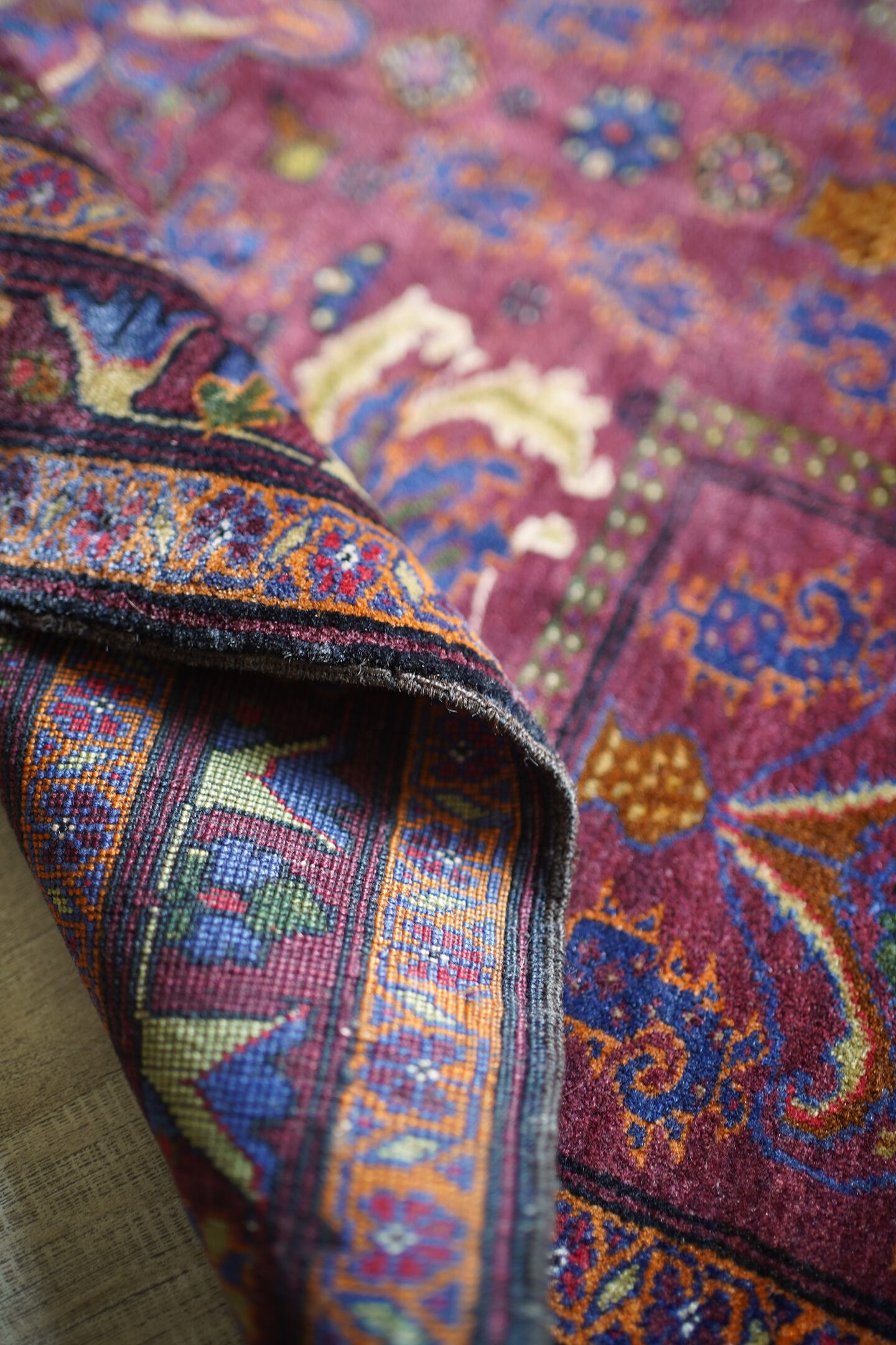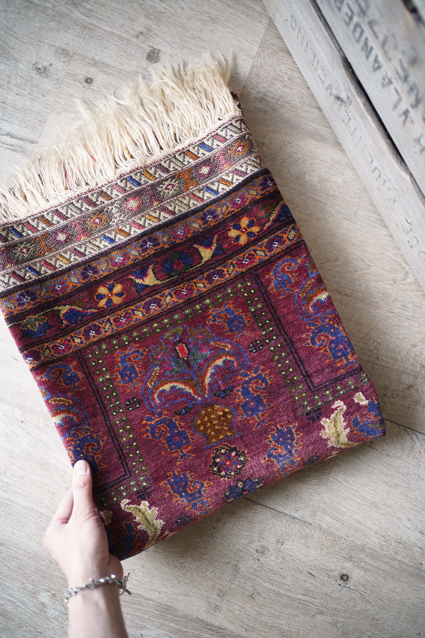 ソフトウールでふわっと滑らか、上質な優しい肌触りのアフガニスタン産のバルーチラグ。気品溢れるバイオレットカラーと織り込まれた花柄が美しく、両サイドの綺麗なキリムエンドもポイントです。フリンジで一部短くなっている箇所や隙間が空いてしまっている箇所がありますが、全体的に長めのフリンジのため、あまり目立つことなく気にならないかと思われます(お写真最後の2枚をご参照ください)。厚みは6mmほど。玄関をはじめ洗面スペースなど色んな場所に敷けそうです♫