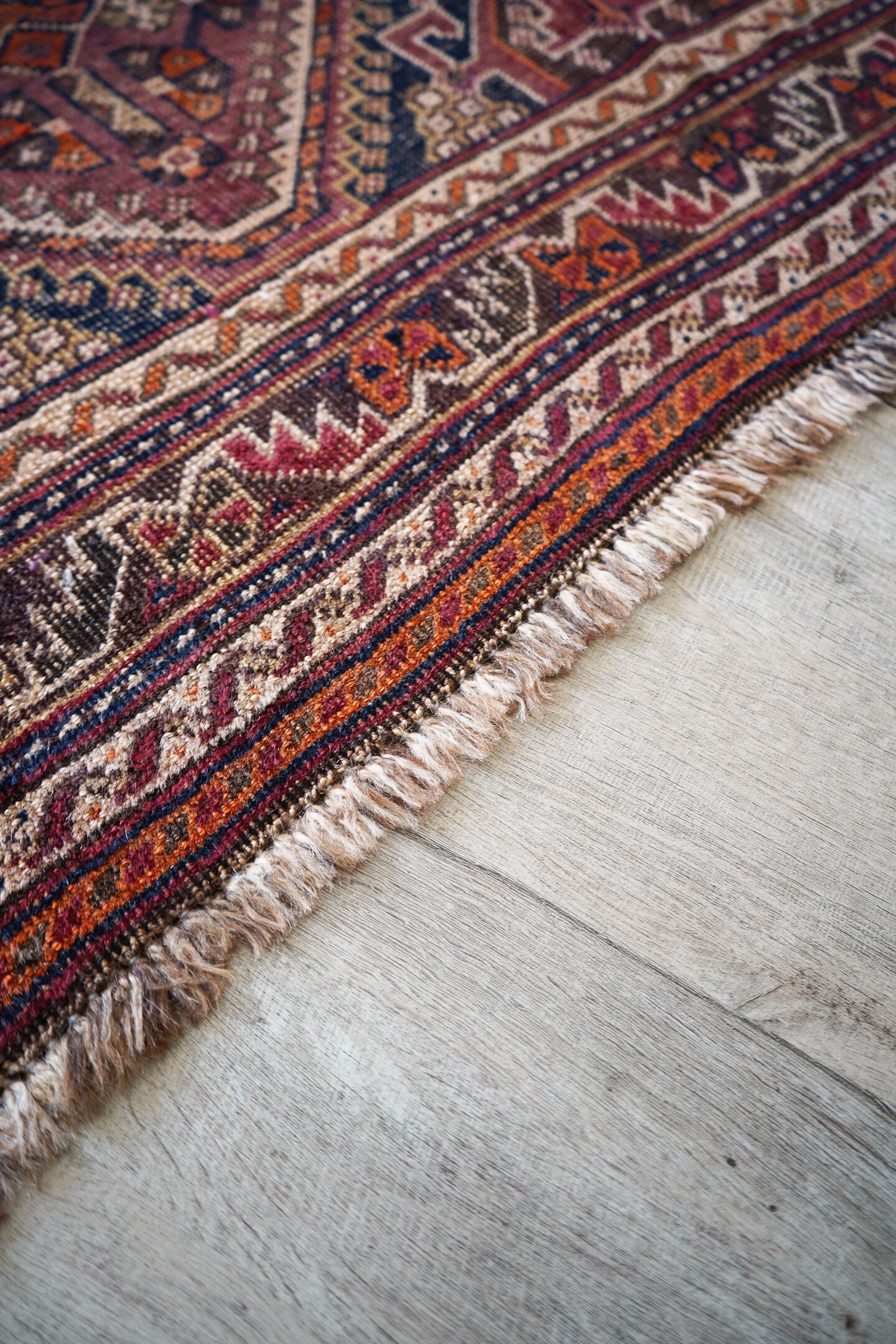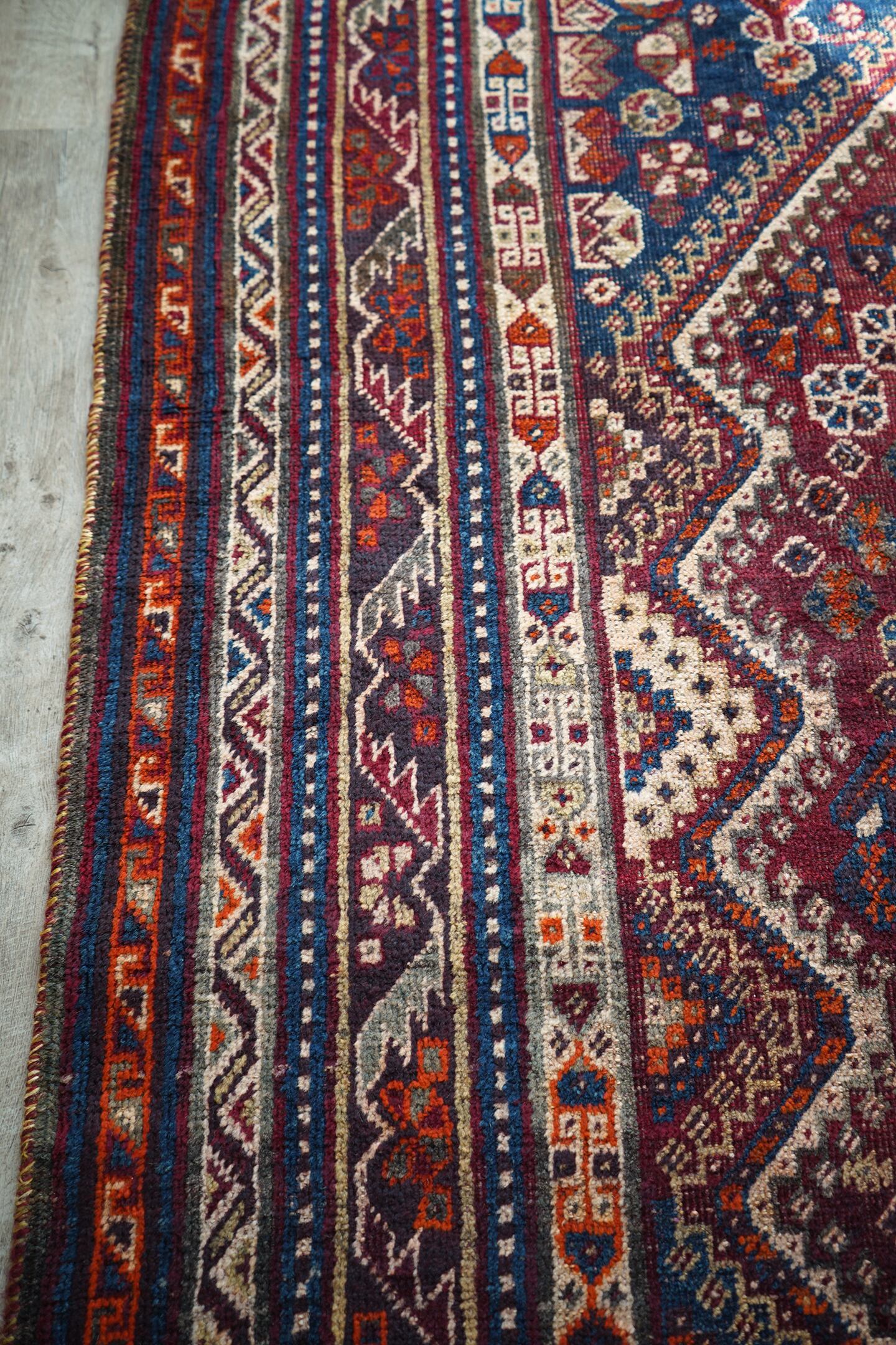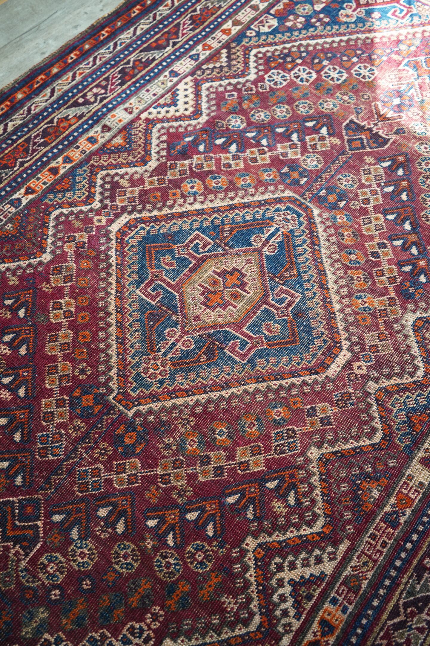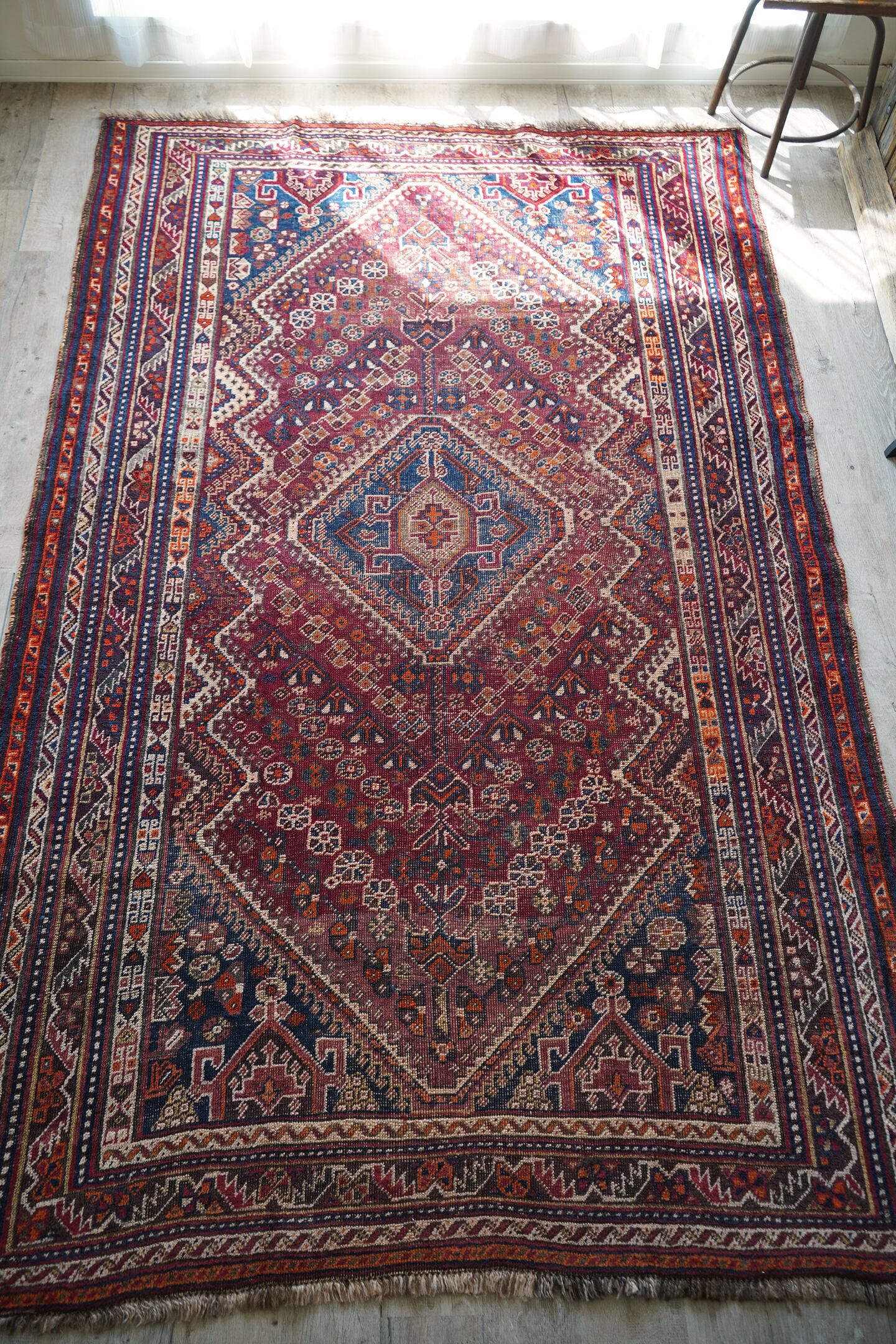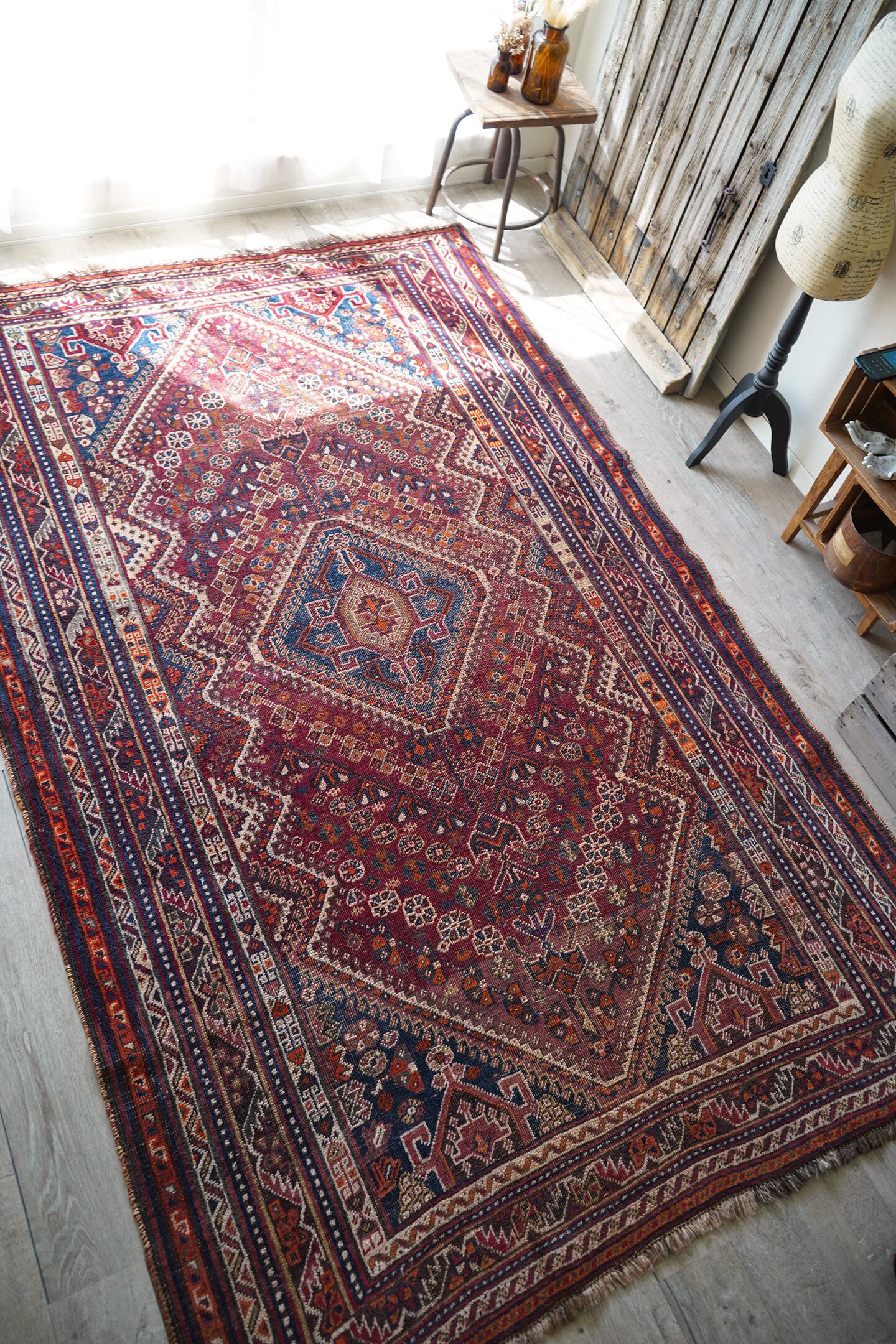 おおよそ80年前にイラン南西部に居住するカシュガイ族によって織られたセミアンティークのラグ。経年により深みを増した色合いが素晴らしく、美しい配列で織り込まれた紋様の数々は、まさに絵画のようで芸術的な一枚。配色は赤茶をベースにメダリオンと四角のコーナーは深いネイビーに近いブルーグリーン、その他オレンジやベージュの色味が使用されています。サラふわっとした肌触りで、厚みは7〜8mm程度と程よく厚みがあり、耐久性にも不安は感じさせないしっかりとした質感です。目立った補修跡はなく、コンディションも大変良好です。一生物のラグとしてあなたの宝物になりましたら幸いです♫