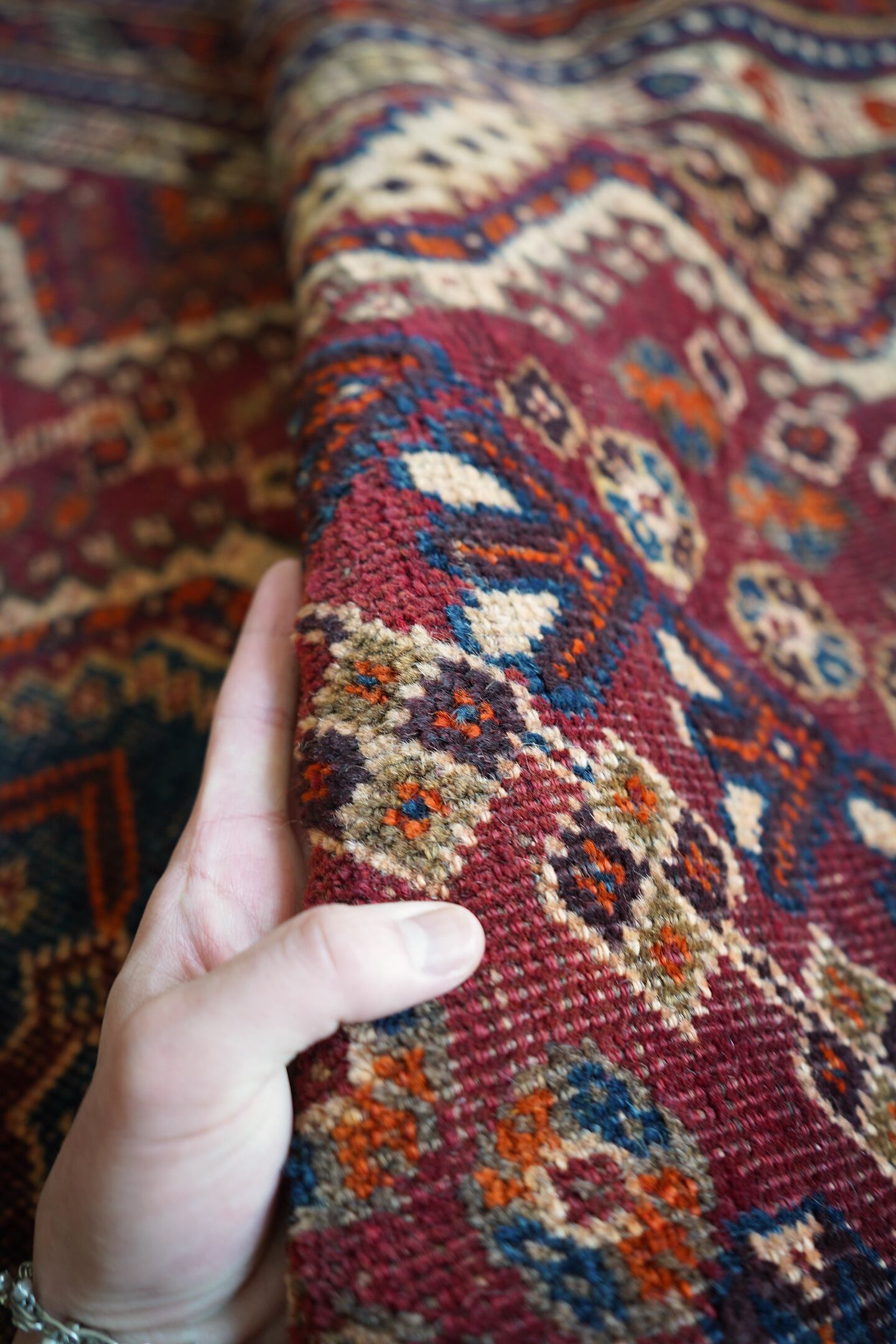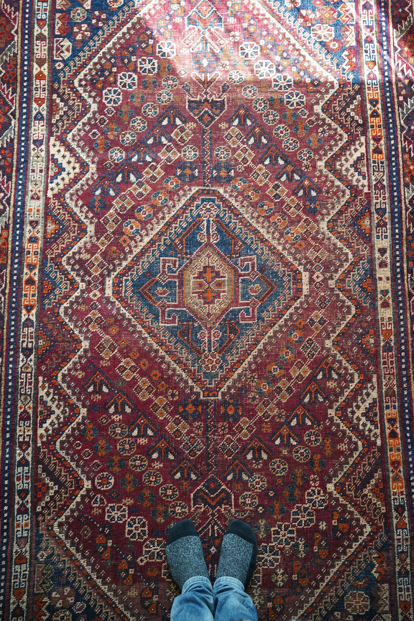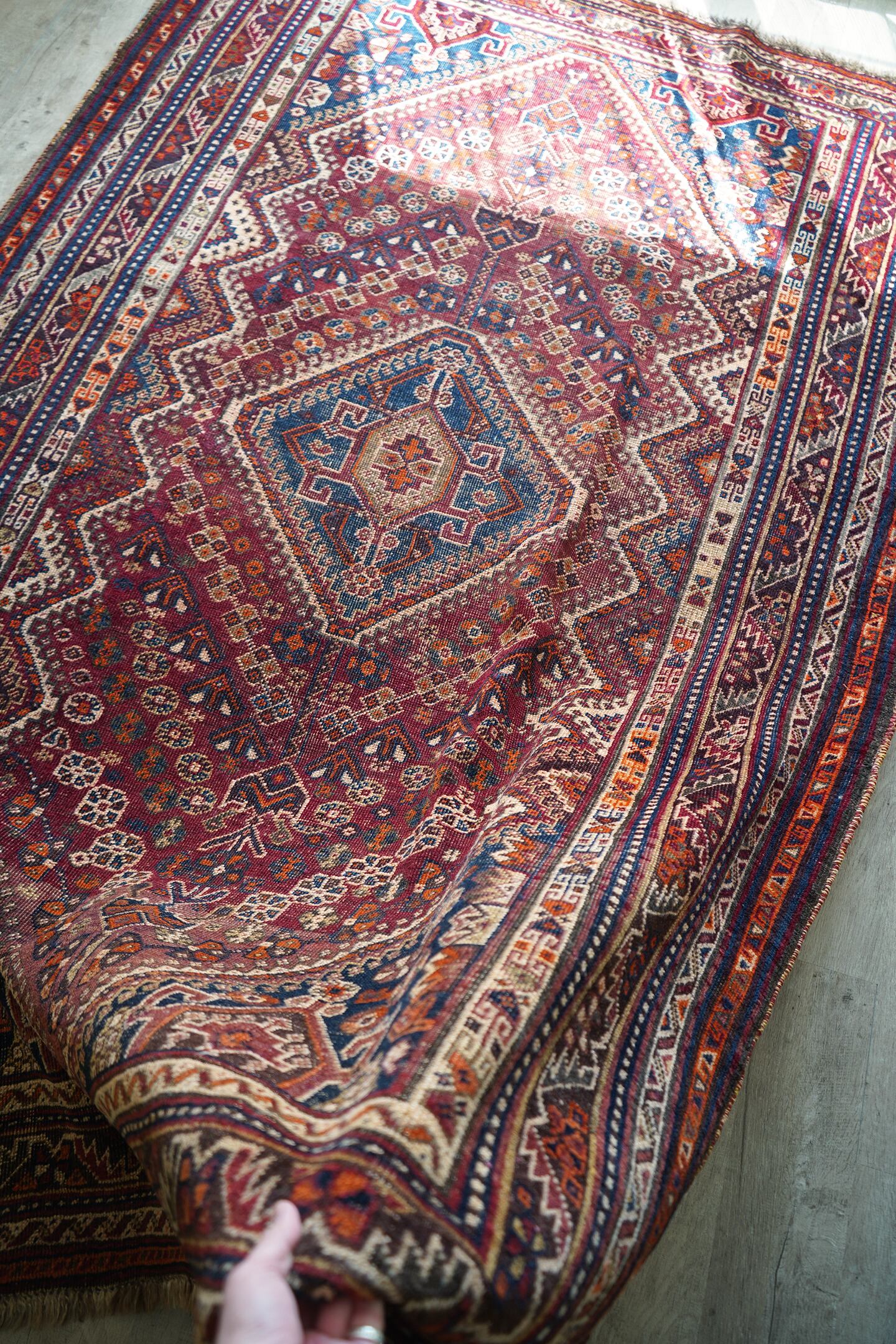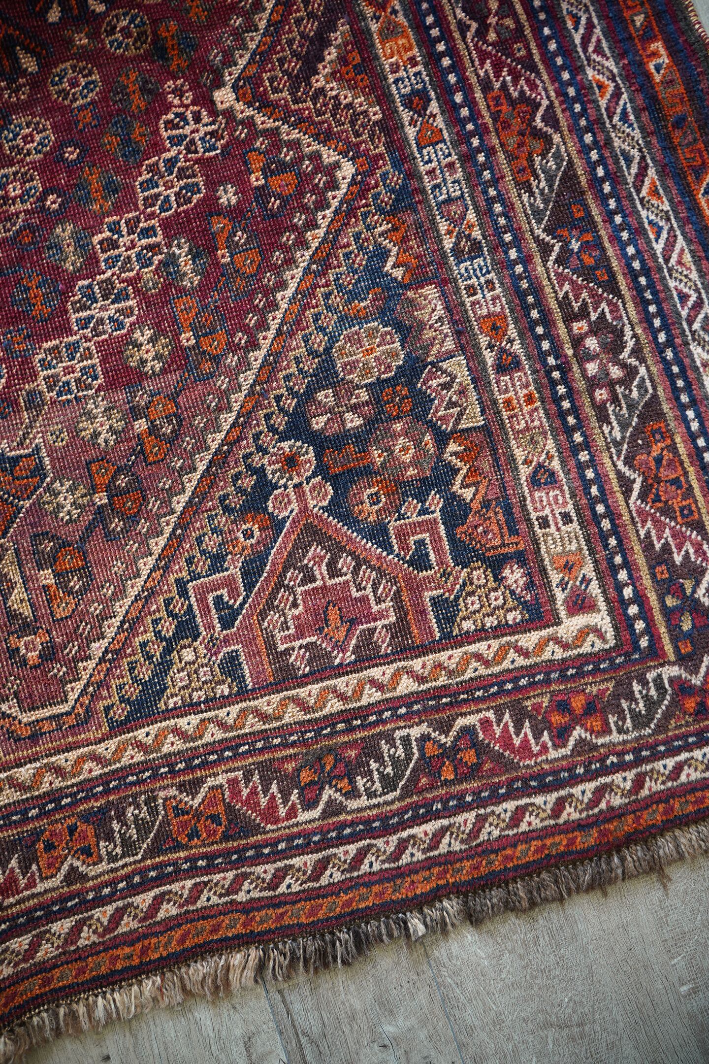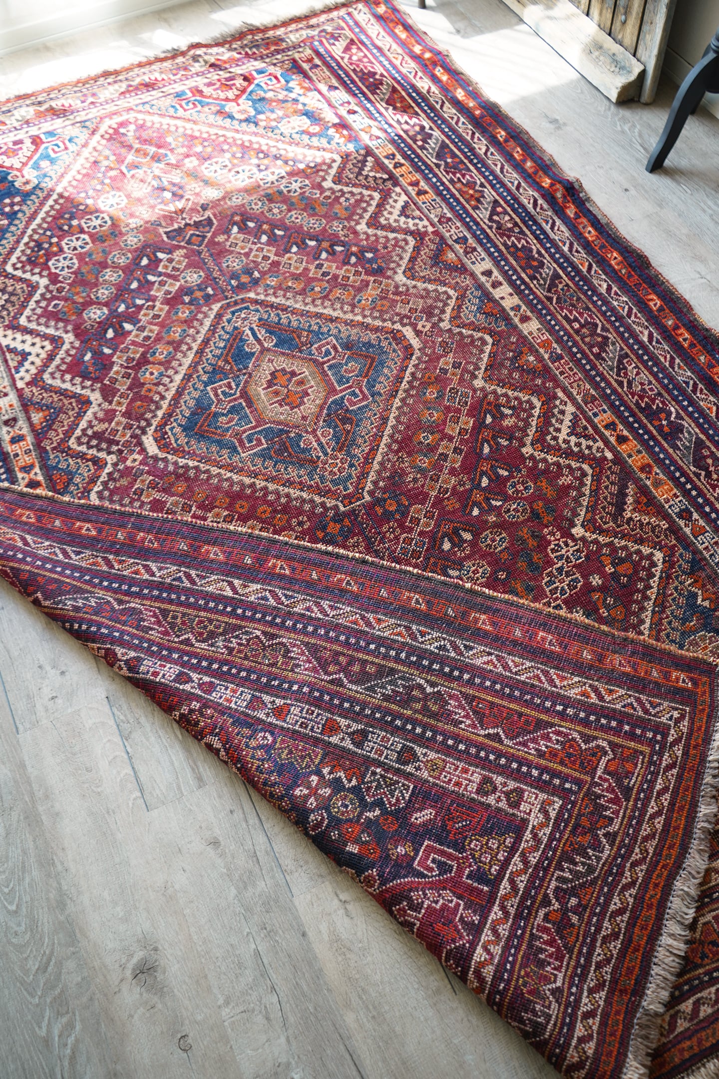 おおよそ80年前にイラン南西部に居住するカシュガイ族によって織られたセミアンティークのラグ。経年により深みを増した色合いが素晴らしく、美しい配列で織り込まれた紋様の数々は、まさに絵画のようで芸術的な一枚。配色は赤茶をベースにメダリオンと四角のコーナーは深いネイビーに近いブルーグリーン、その他オレンジやベージュの色味が使用されています。サラふわっとした肌触りで、厚みは7〜8mm程度と程よく厚みがあり、耐久性にも不安は感じさせないしっかりとした質感です。目立った補修跡はなく、コンディションも大変良好です。一生物のラグとしてあなたの宝物になりましたら幸いです♫