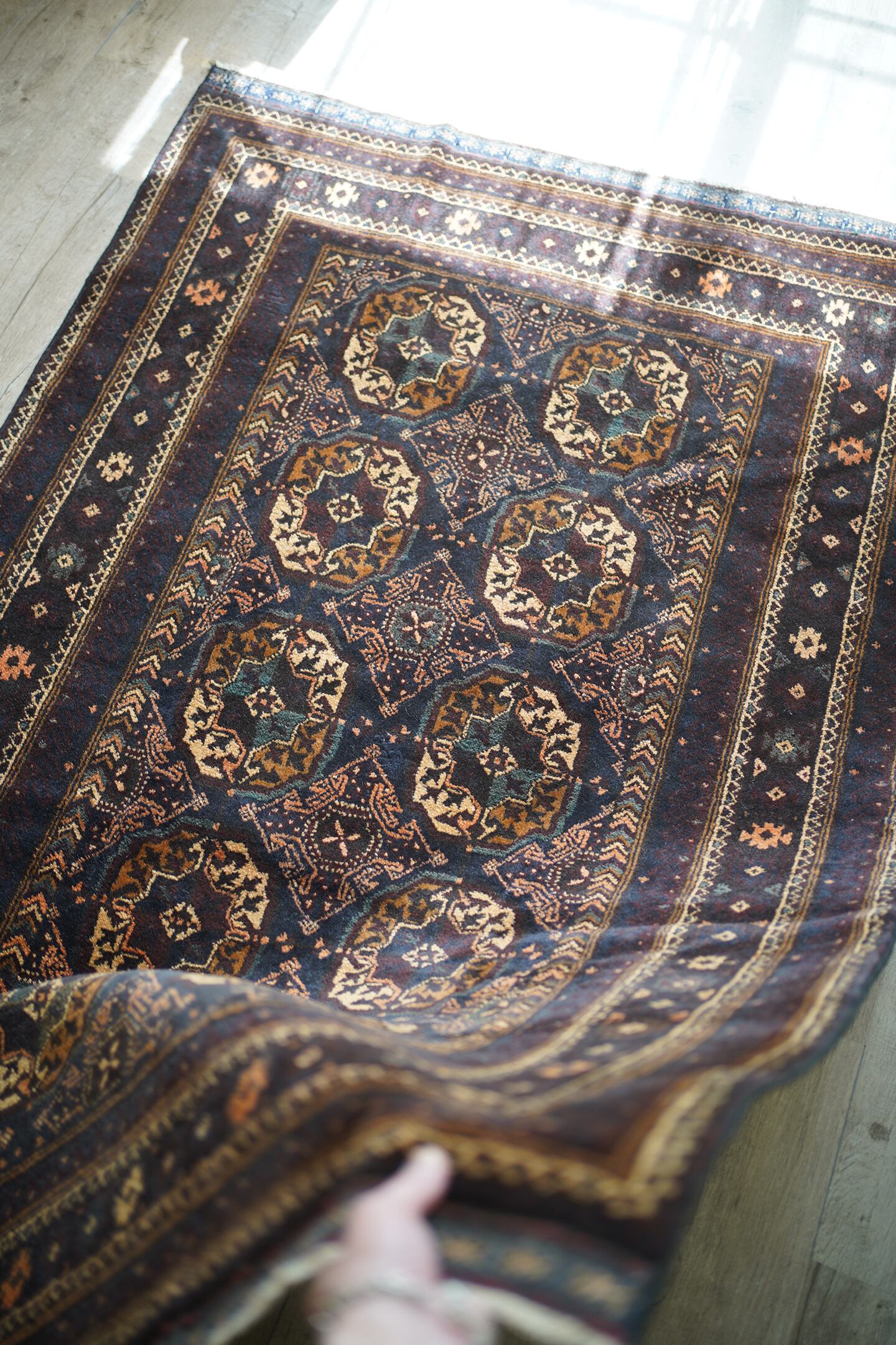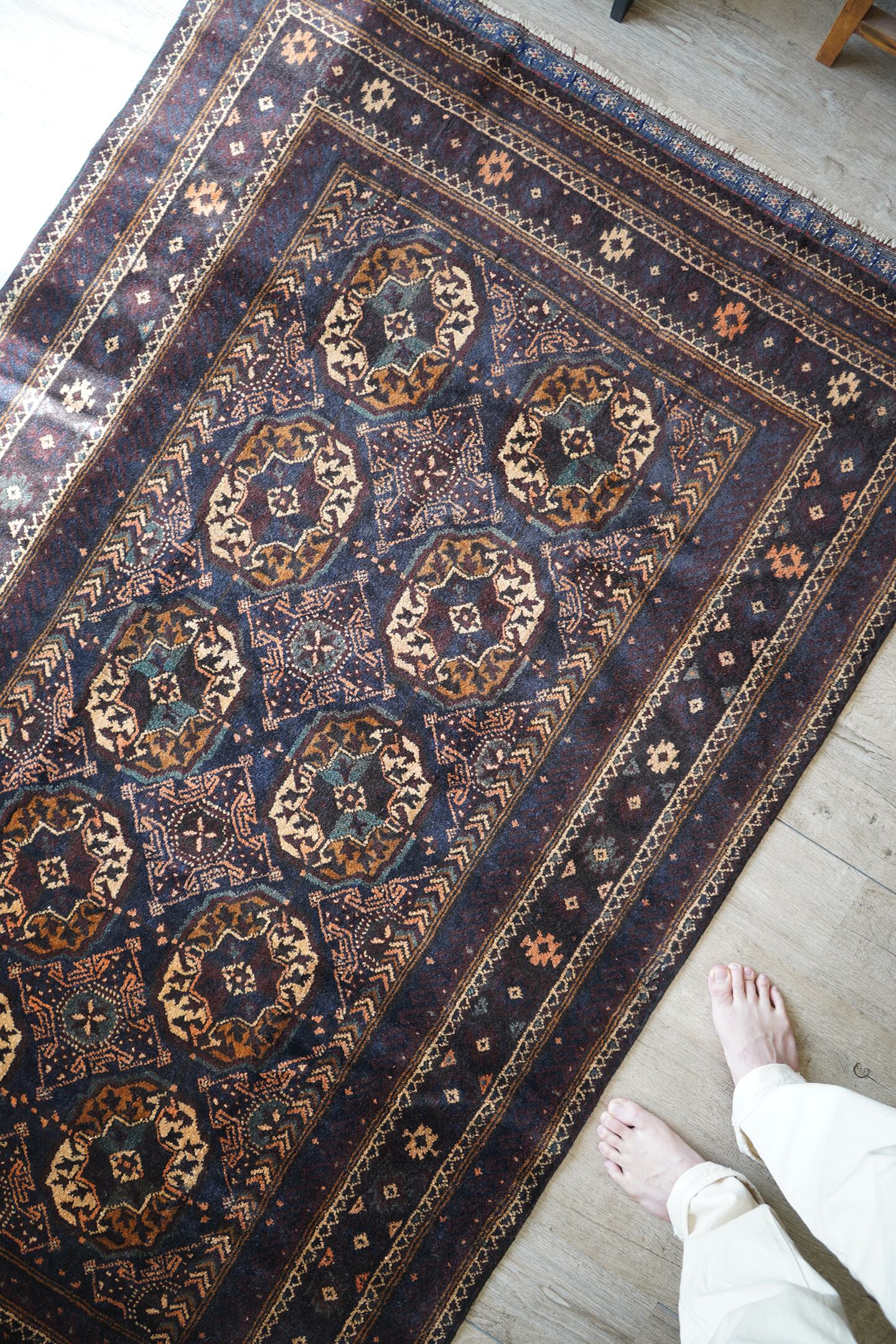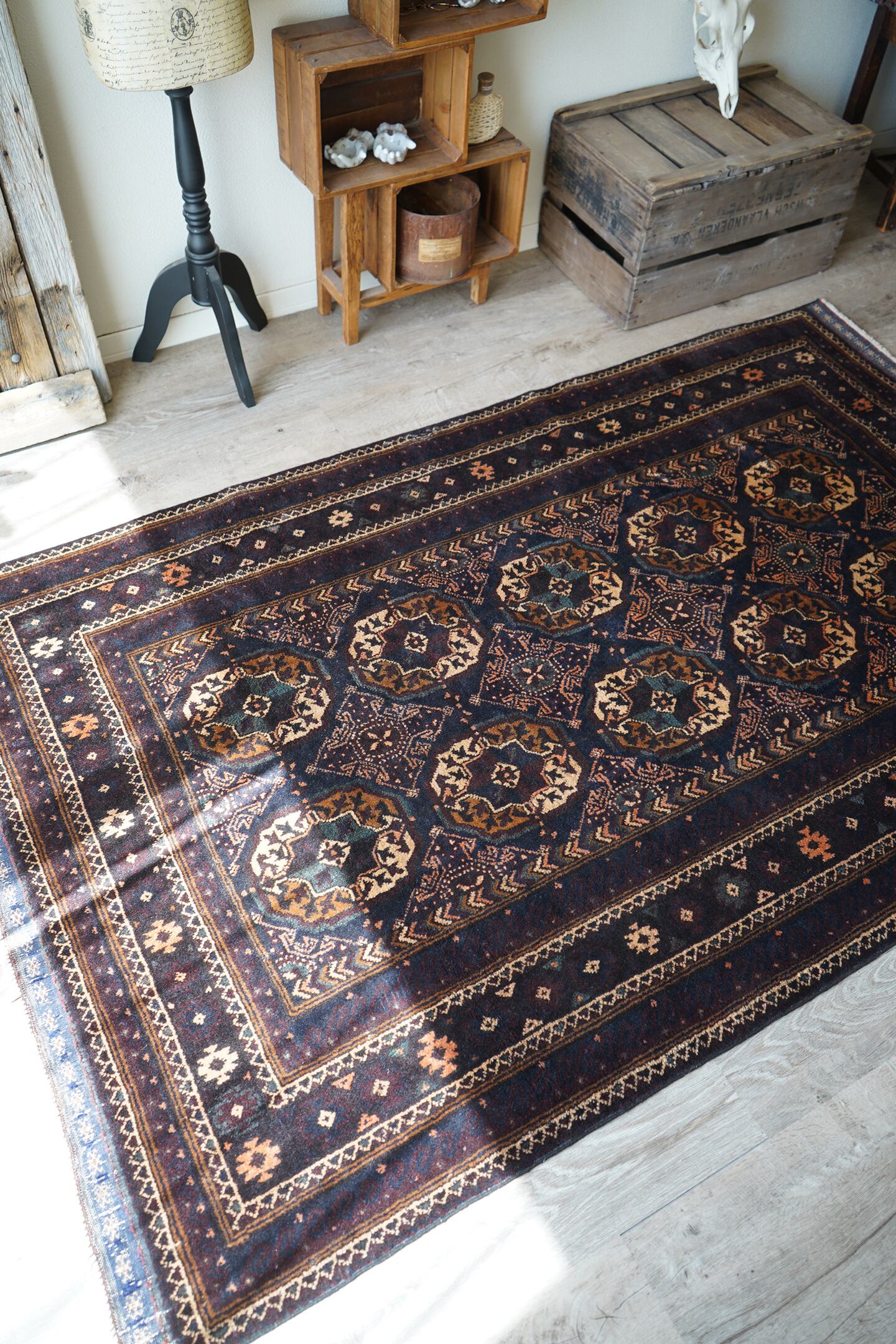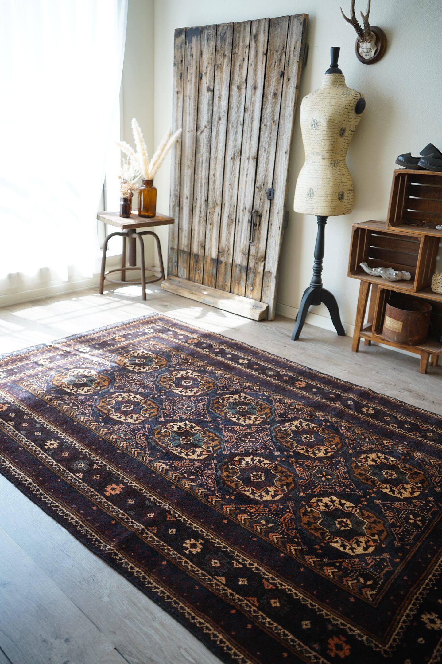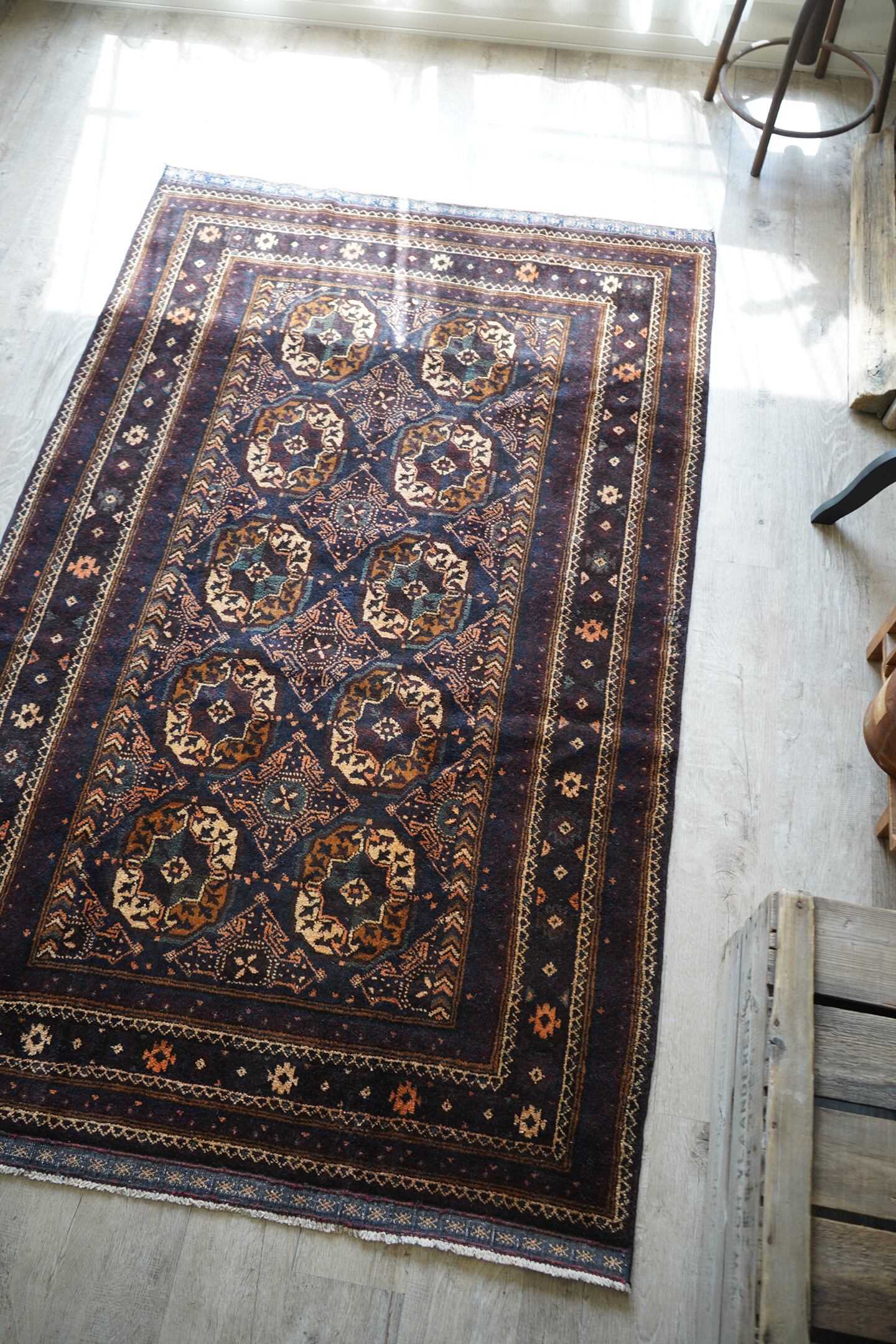 テッケ族のギュルの紋様が特徴的なアフガニスタン産のバルーチラグ。濃いブラウン× 薄めの黒ベースの落ち着いた配色で、ベージュとブラウンカラーのギュルには淡いグリーンが使われているところもポイント。上下のオシャレなキリムエンド部分も大変素敵です。フワフワとした柔らかい優しい肌触りで、8mmほどの程よい厚みです。コンディションも大変良好。どんなインテリアのお部屋にもスッと馴染んでくれそうな一枚です♫