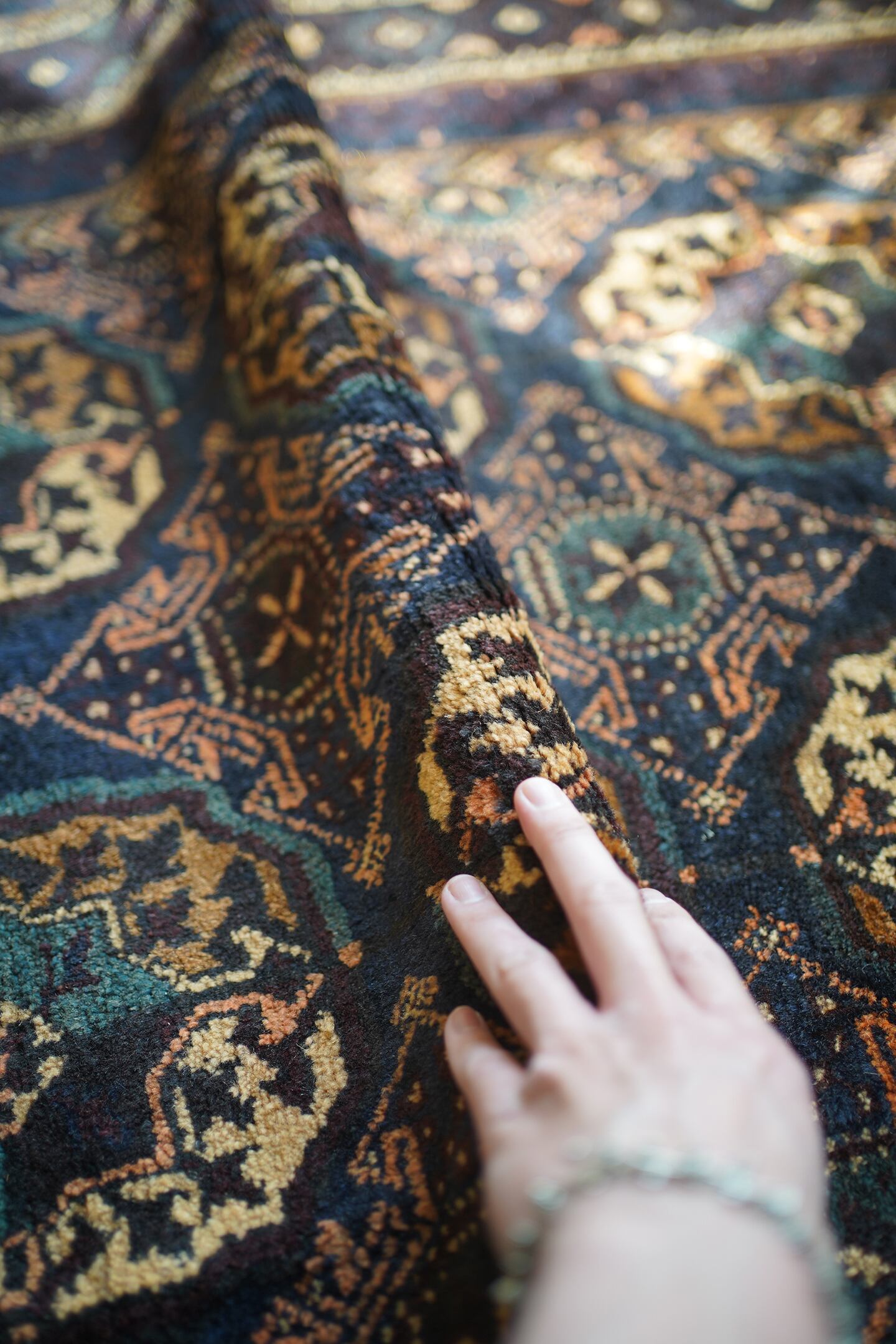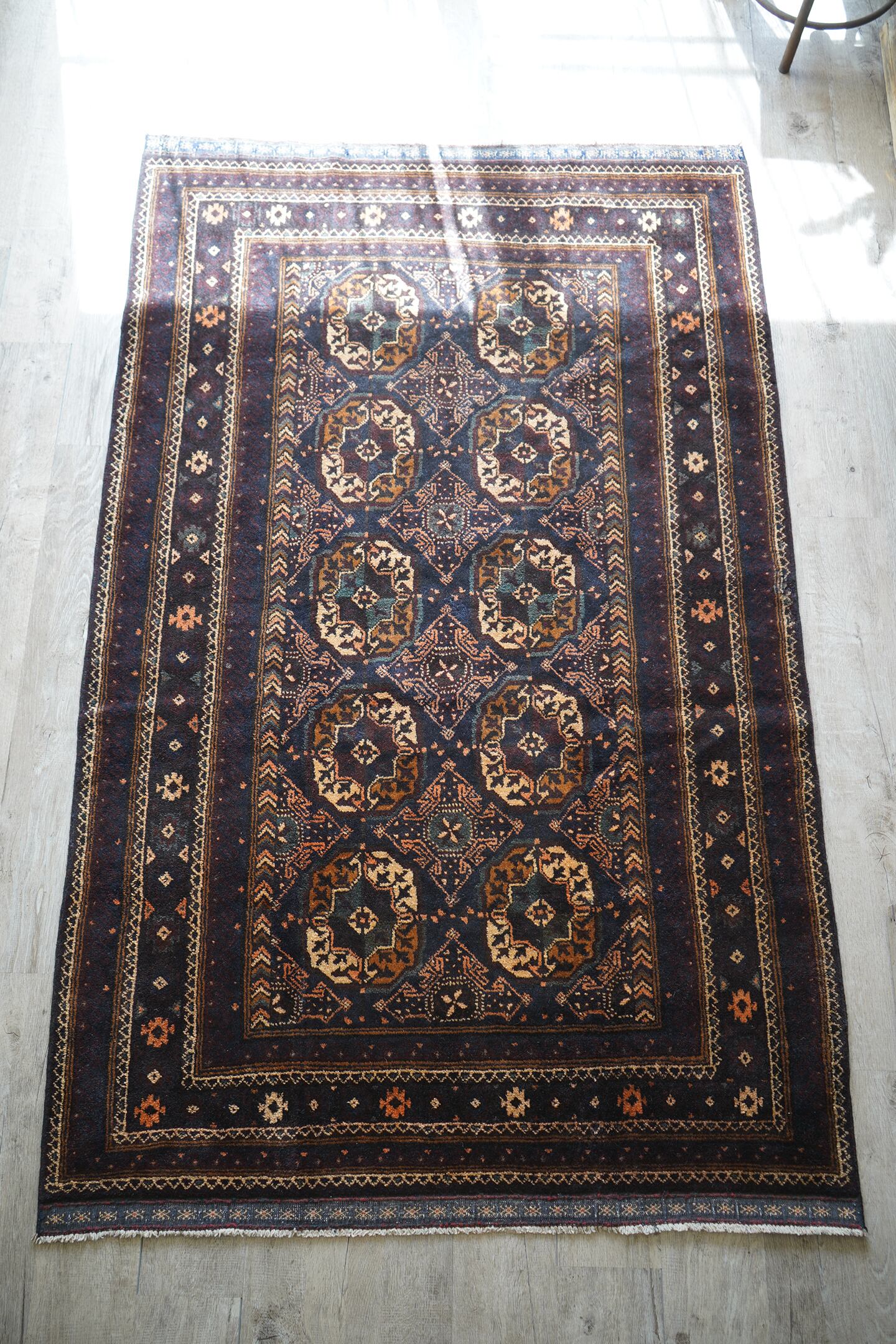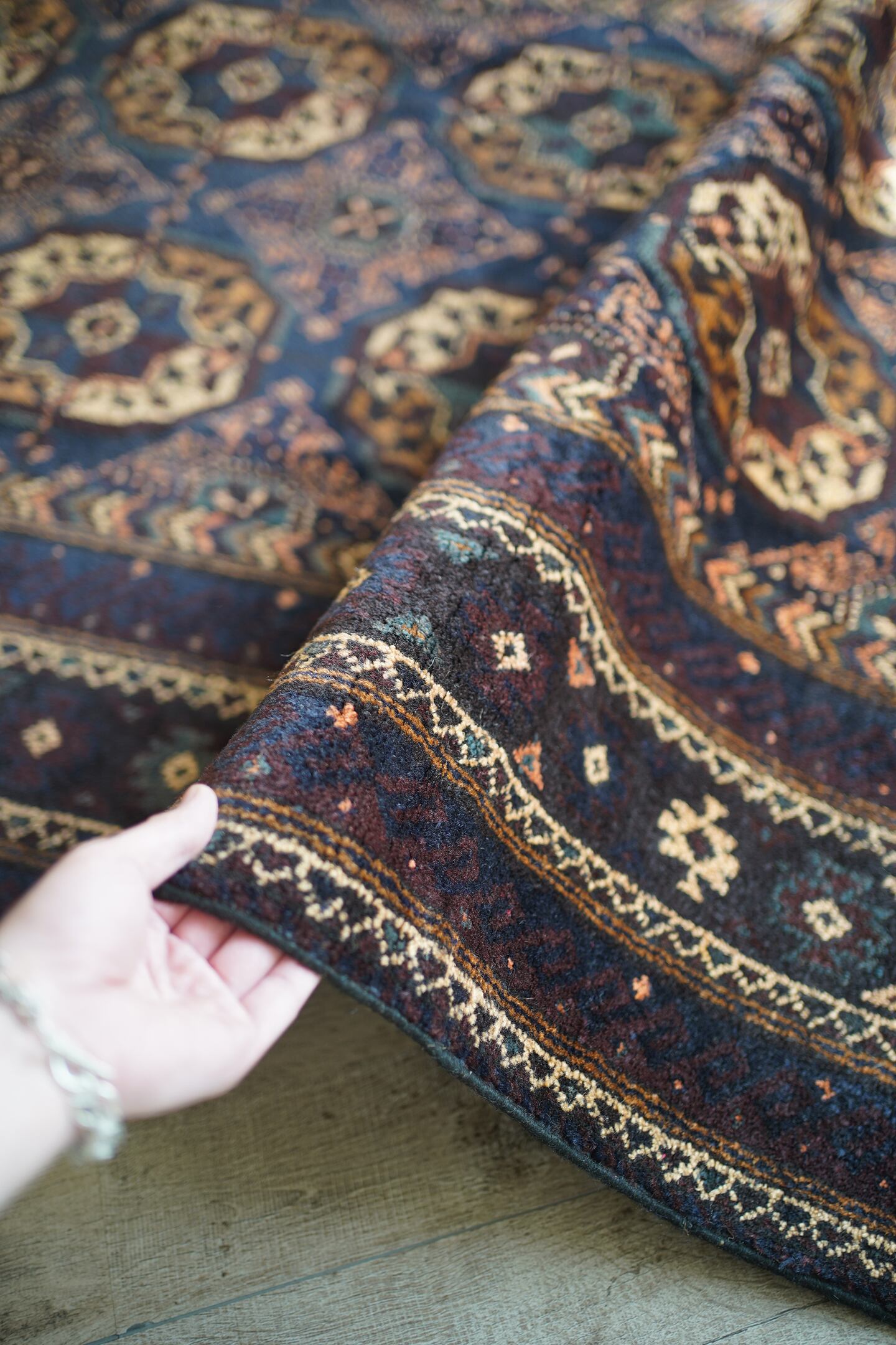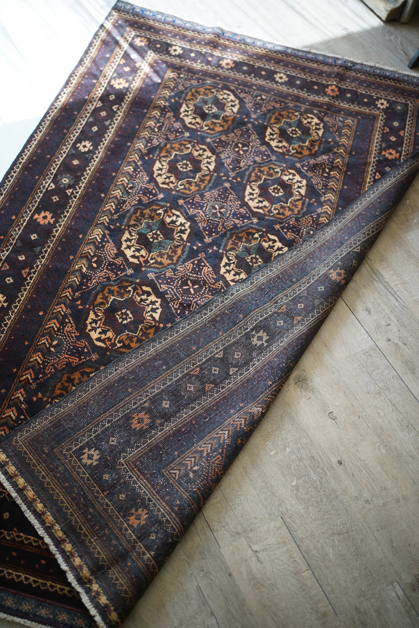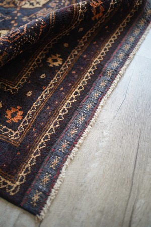 テッケ族のギュルの紋様が特徴的なアフガニスタン産のバルーチラグ。濃いブラウン× 薄めの黒ベースの落ち着いた配色で、ベージュとブラウンカラーのギュルには淡いグリーンが使われているところもポイント。上下のオシャレなキリムエンド部分も大変素敵です。フワフワとした柔らかい優しい肌触りで、8mmほどの程よい厚みです。コンディションも大変良好。どんなインテリアのお部屋にもスッと馴染んでくれそうな一枚です♫