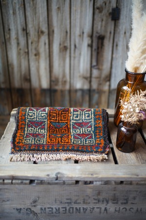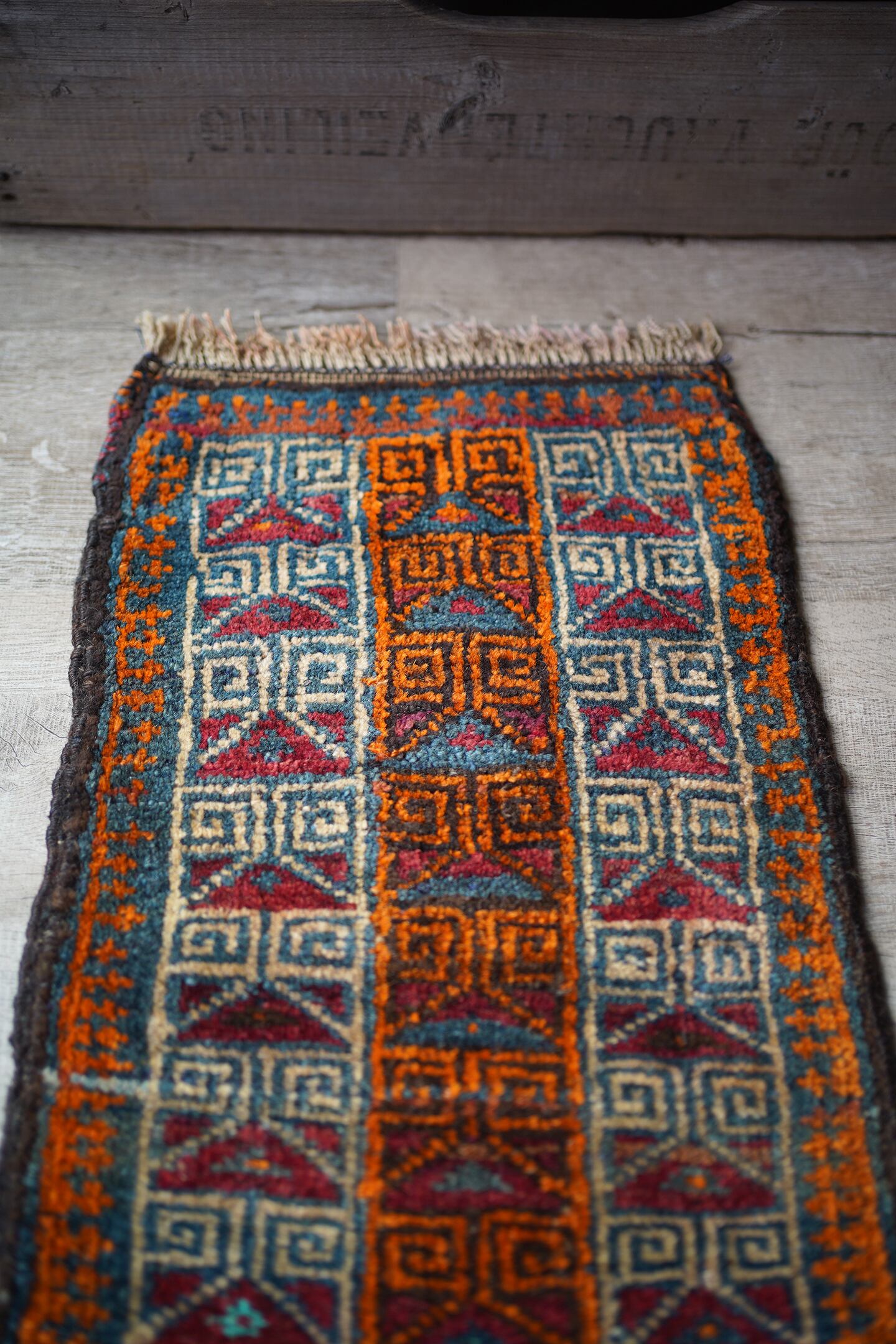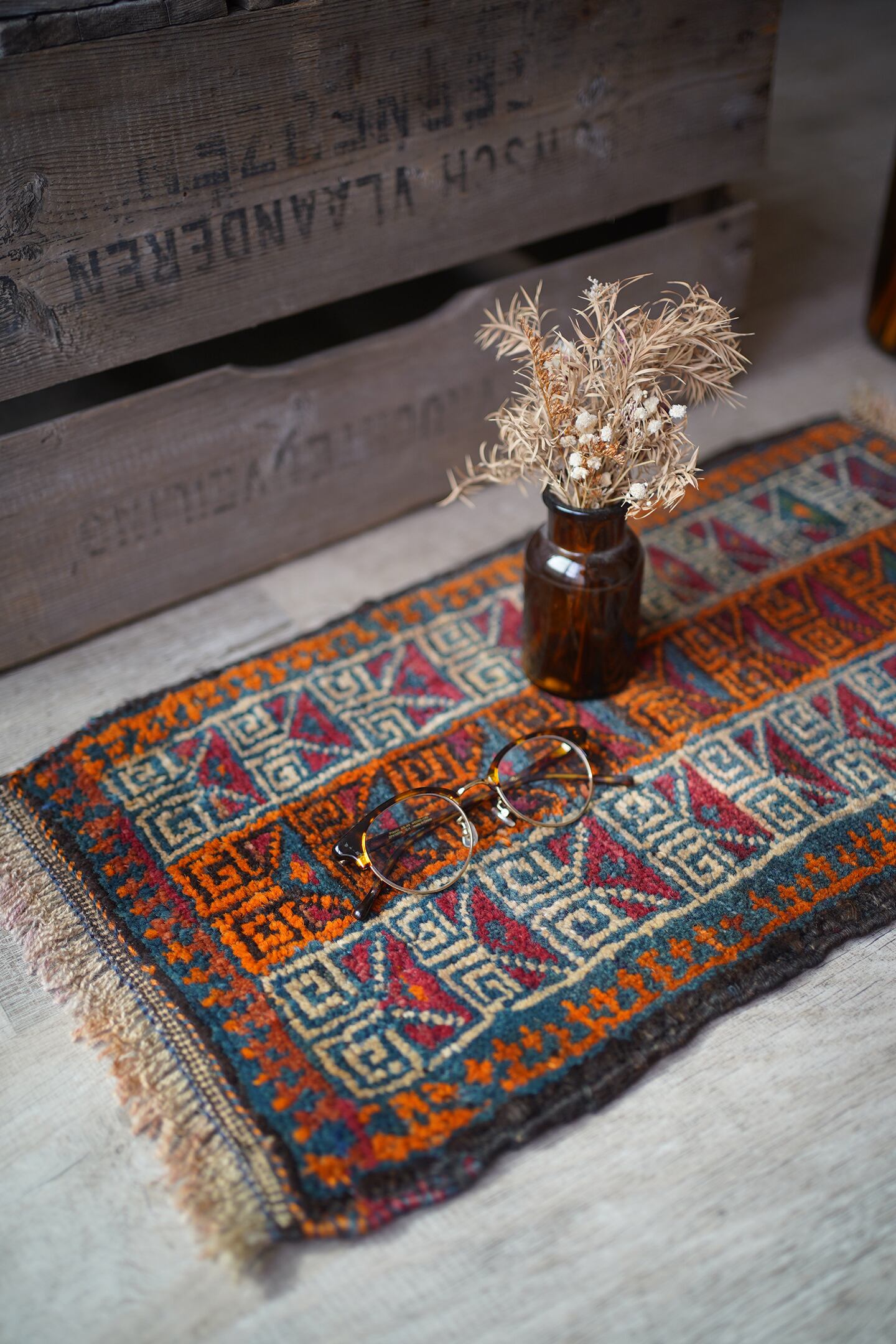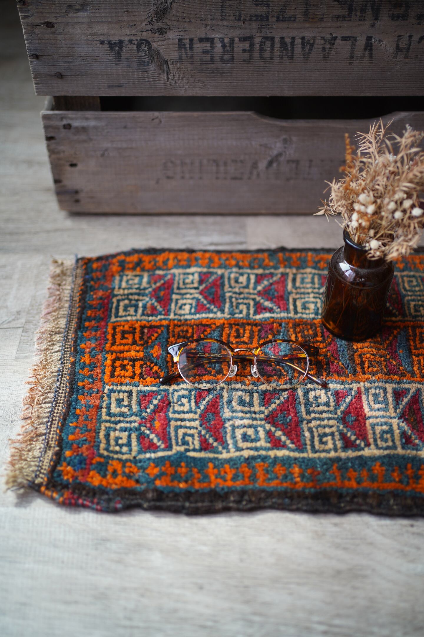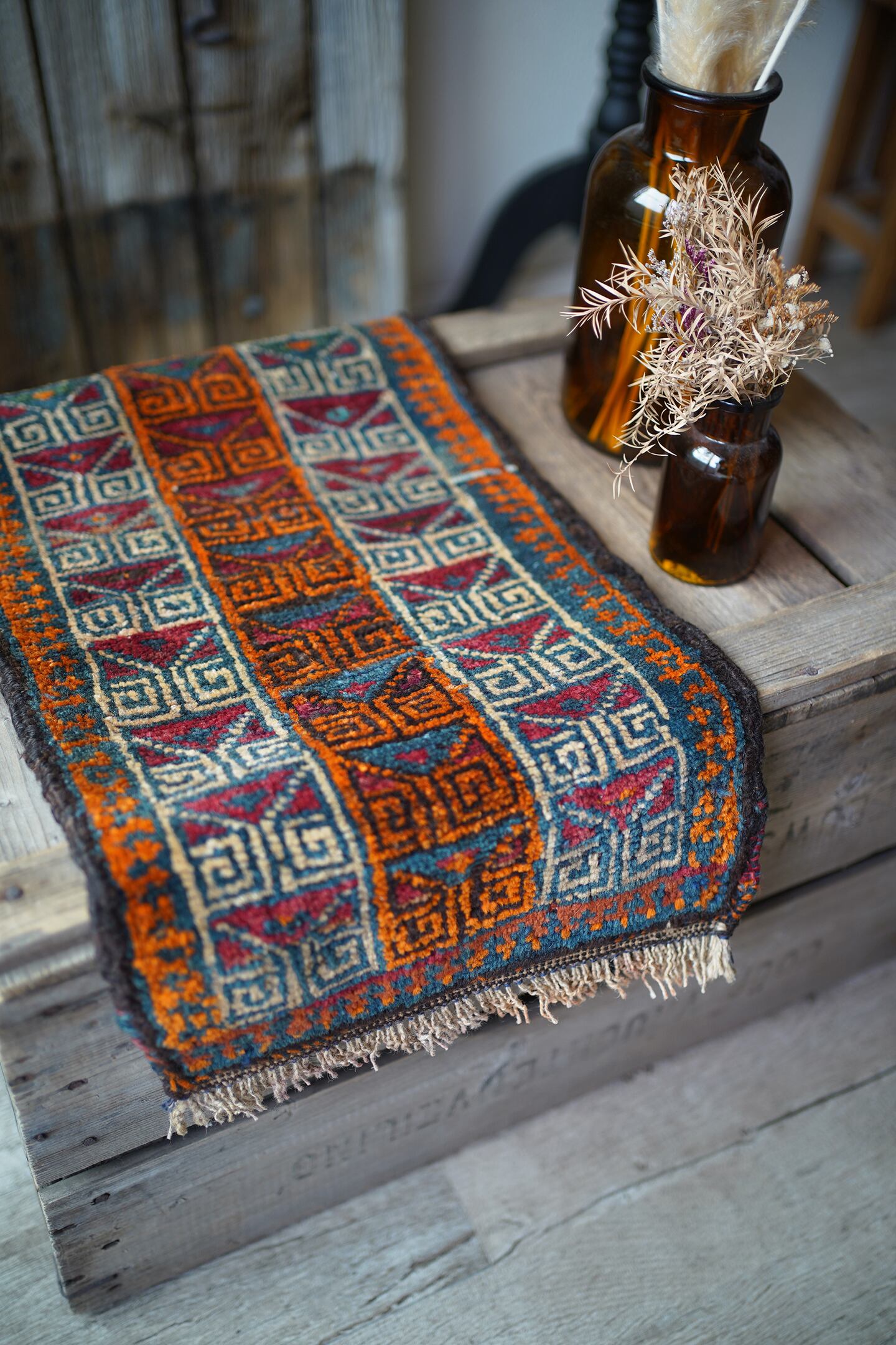 約70年前にバルーチ族によって織られたミニラグです。ネックバンドと呼ばれるラクダなどへの動物用の飾りとして使用されていたもので、こちらは装飾部分をカットして作成したラグとなります。オレンジとブルーグリーンベースの素敵な配色です。サラふわっとした肌触りで、厚みは6mm程度になります。棚の上に敷いて、香水やアクセサリーなどのお気に入りの小物を上に置いたりすると、とっても素敵になるのでオススメです♪
