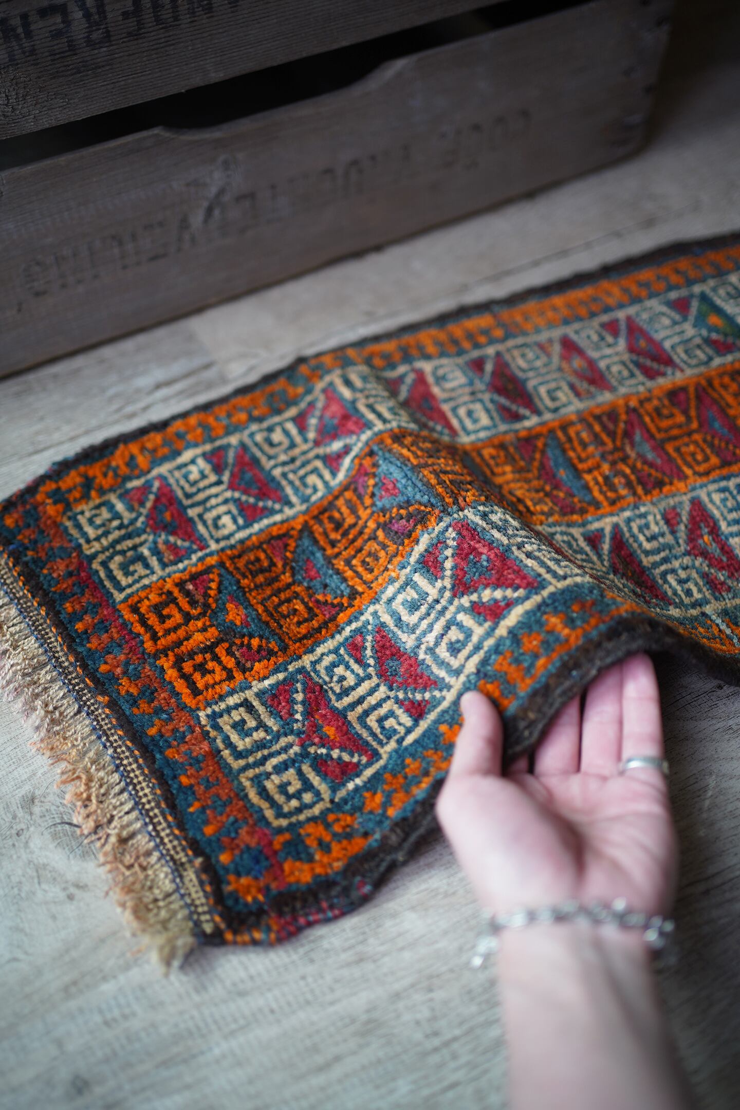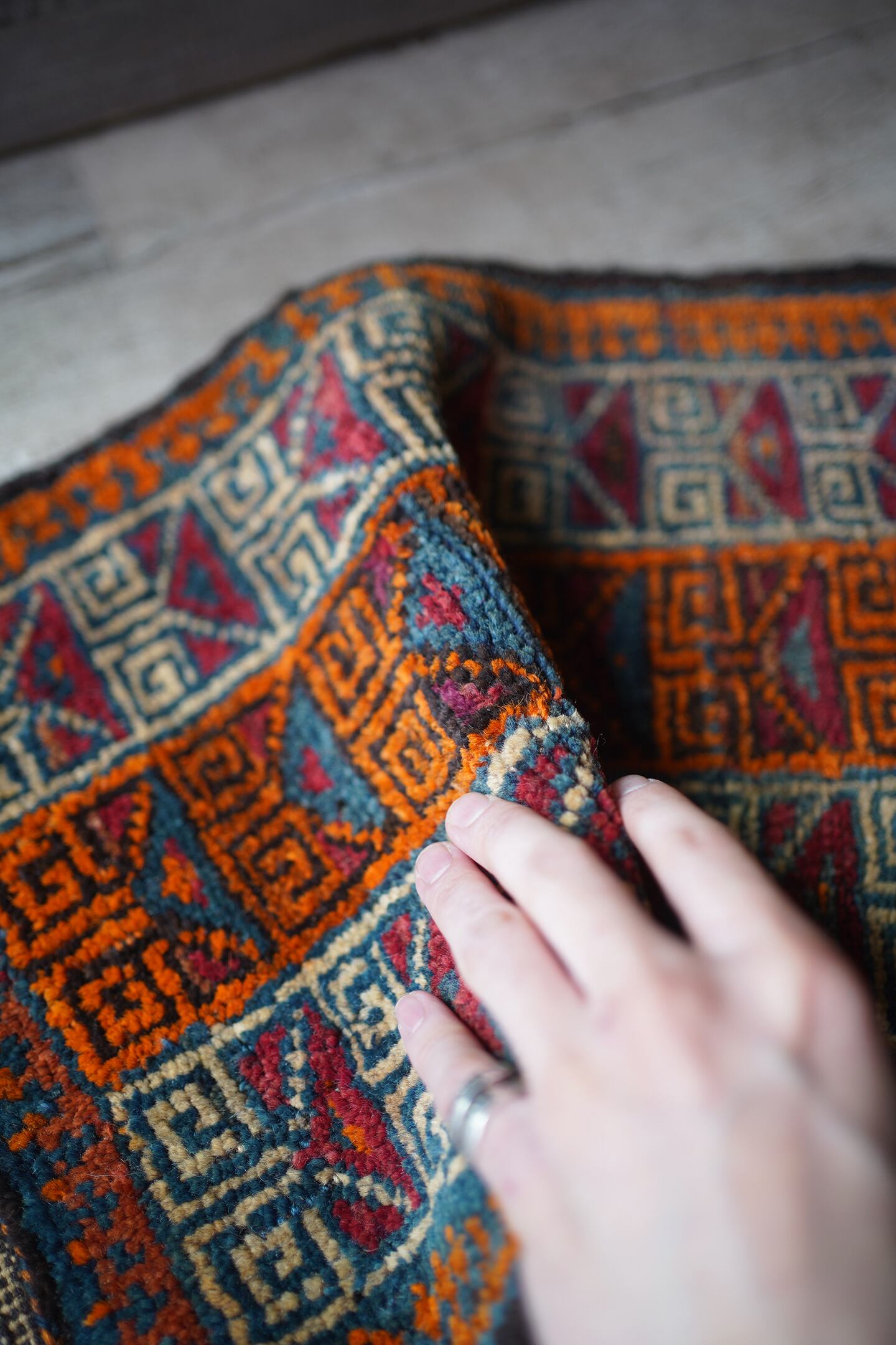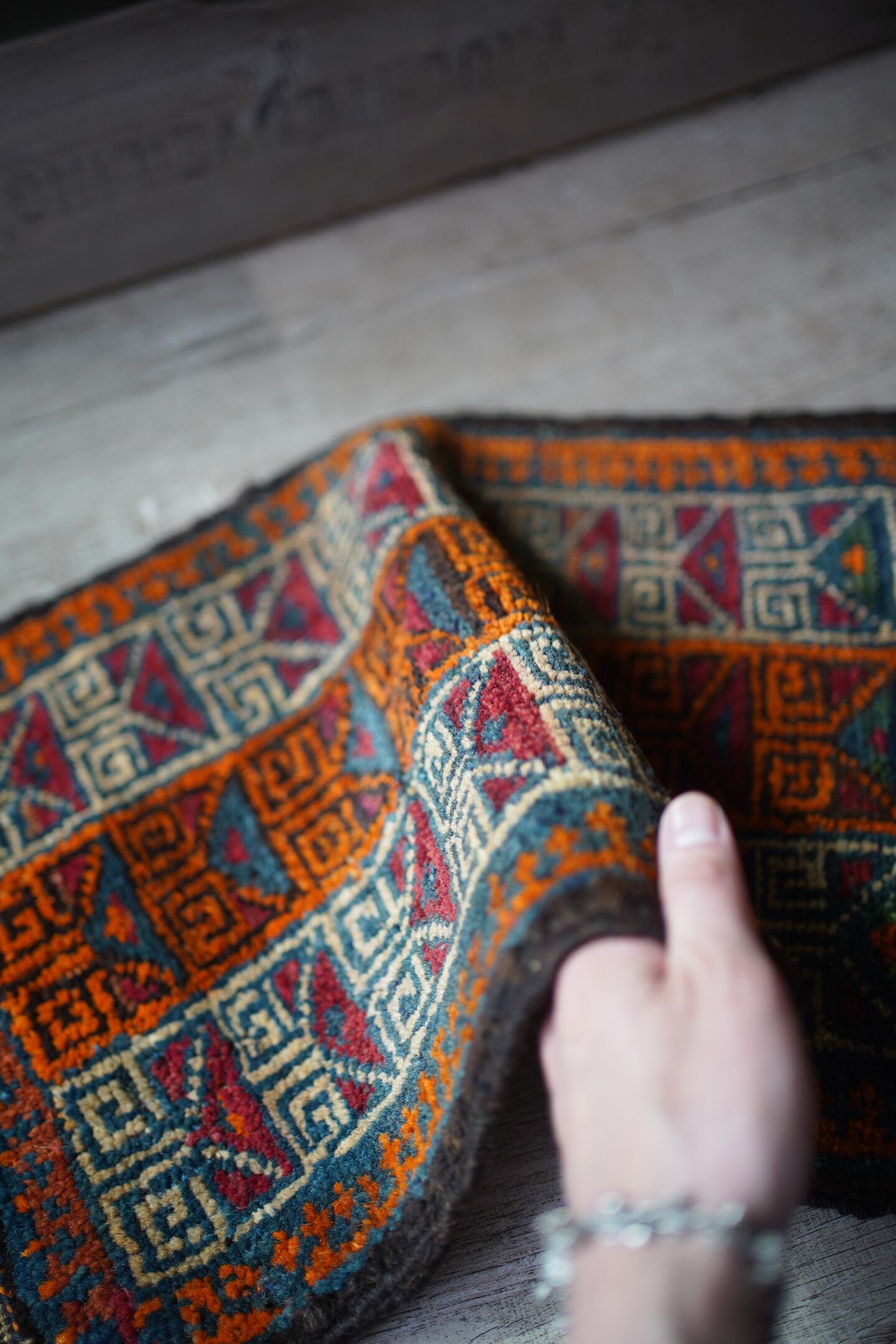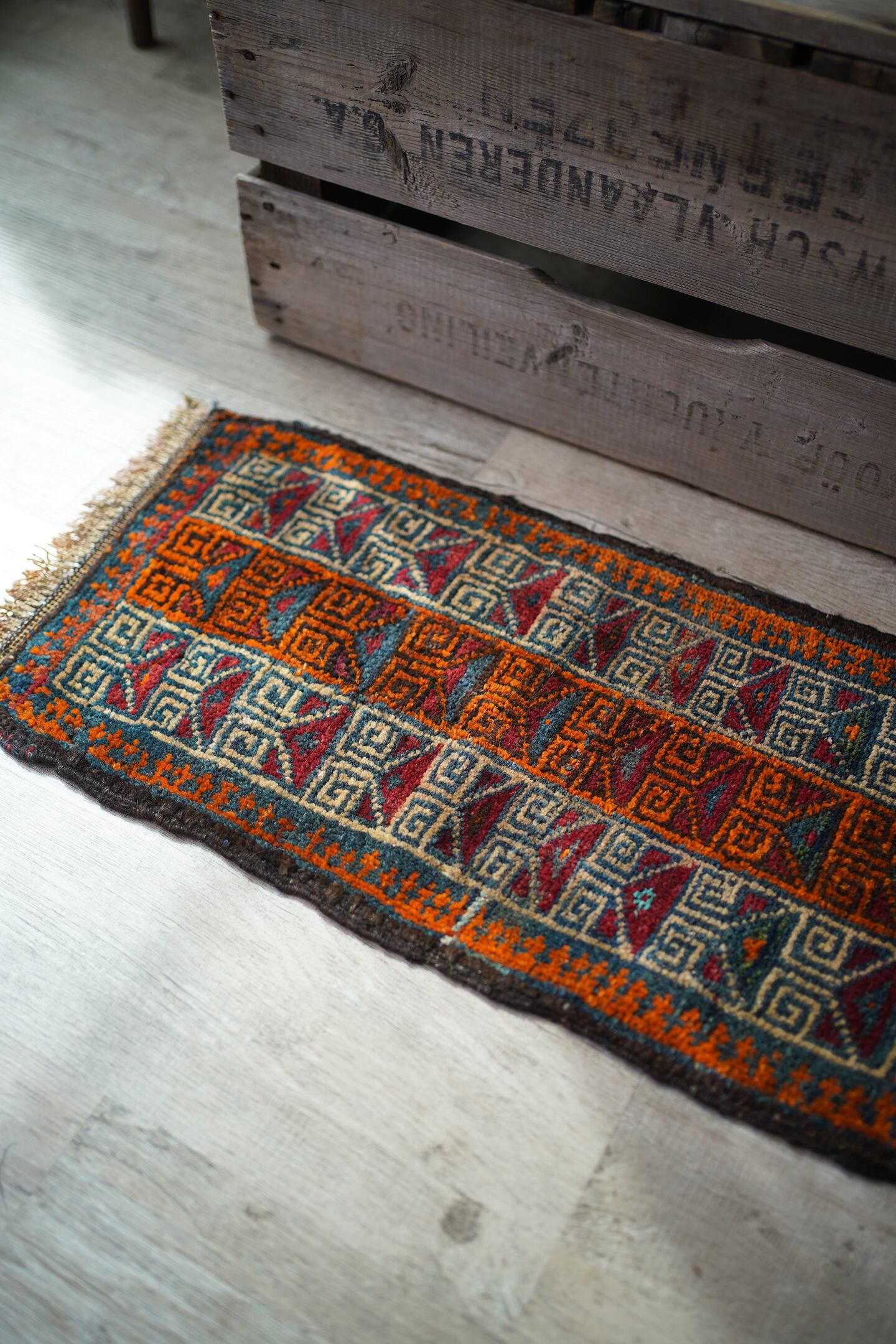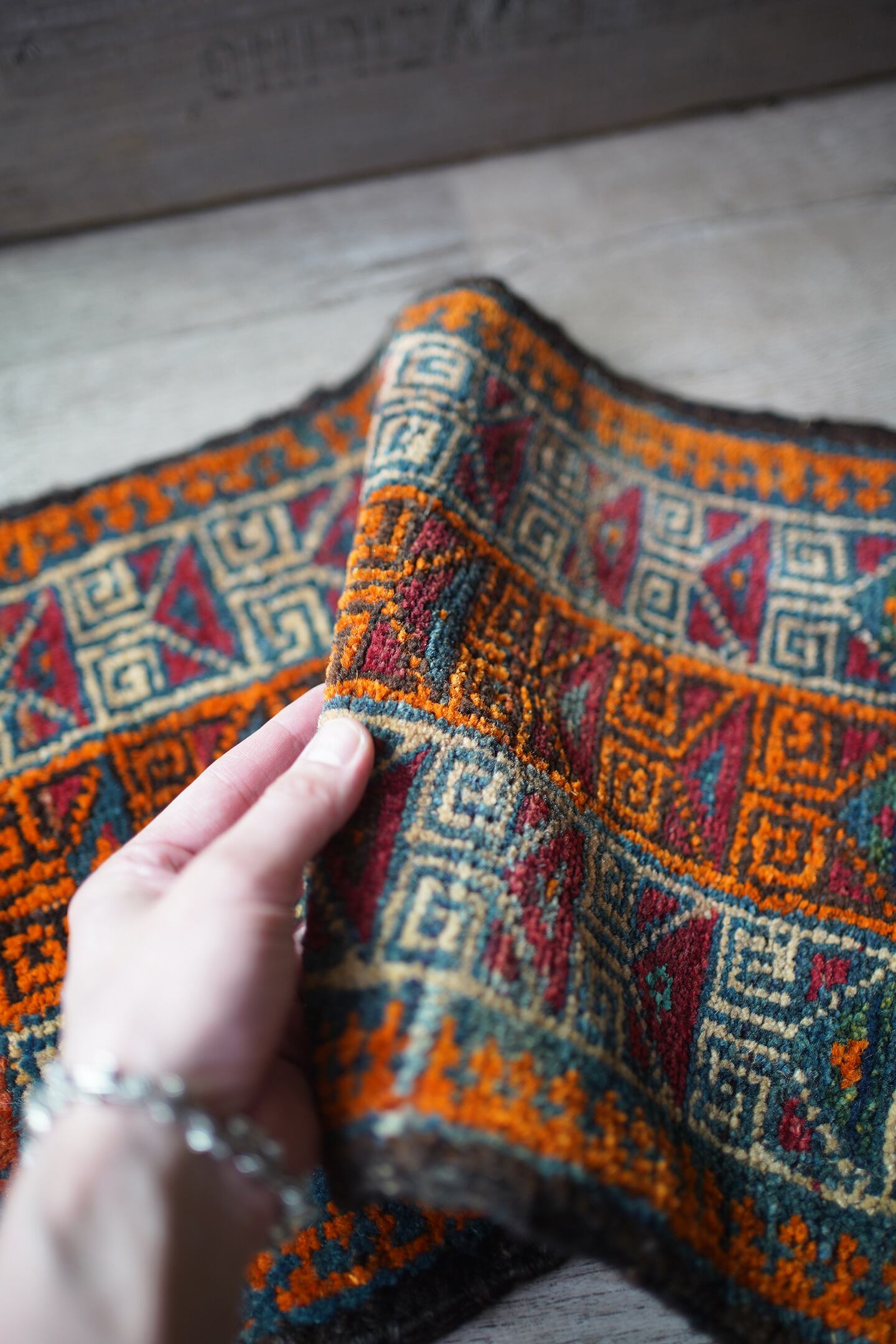 約70年前にバルーチ族によって織られたミニラグです。ネックバンドと呼ばれるラクダなどへの動物用の飾りとして使用されていたもので、こちらは装飾部分をカットして作成したラグとなります。オレンジとブルーグリーンベースの素敵な配色です。サラふわっとした肌触りで、厚みは6mm程度になります。棚の上に敷いて、香水やアクセサリーなどのお気に入りの小物を上に置いたりすると、とっても素敵になるのでオススメです♪