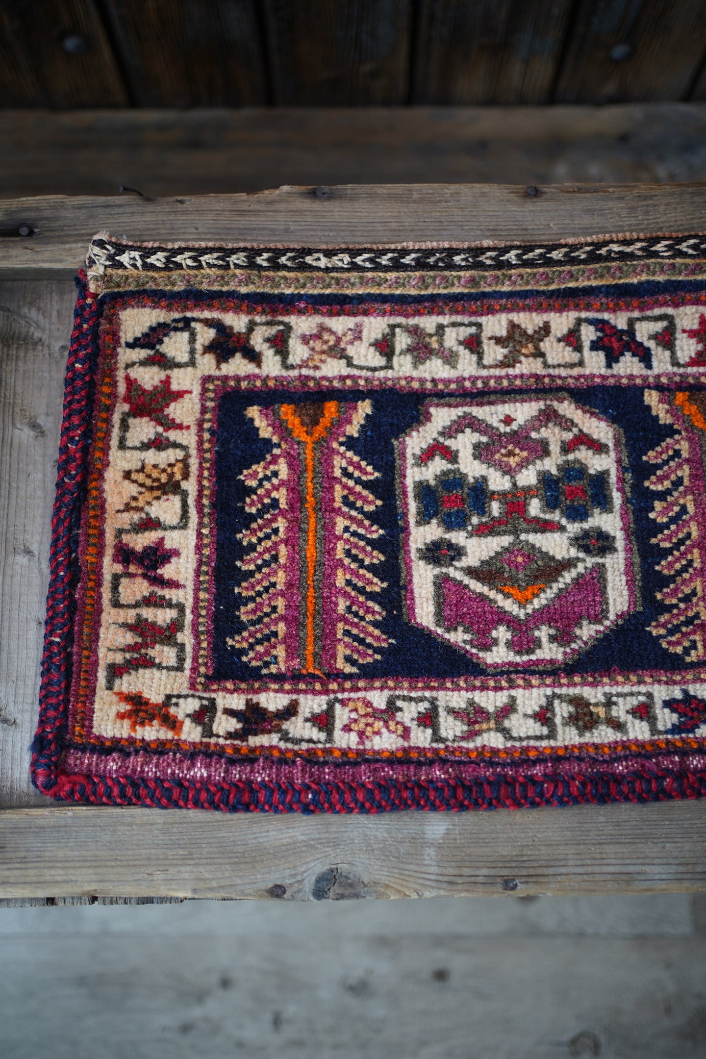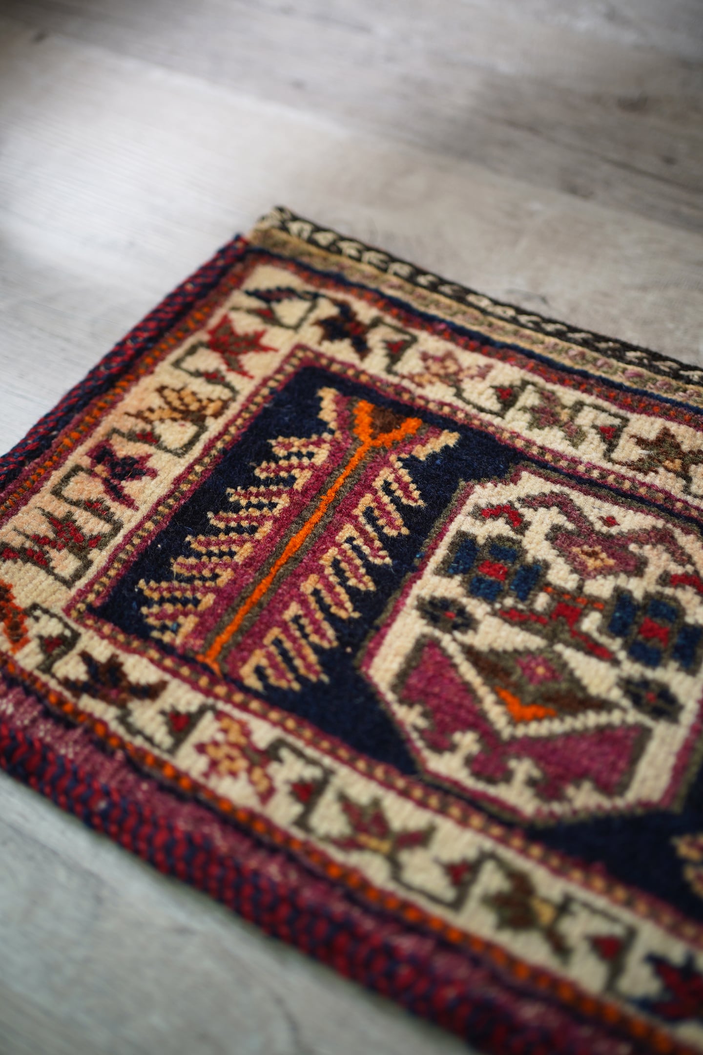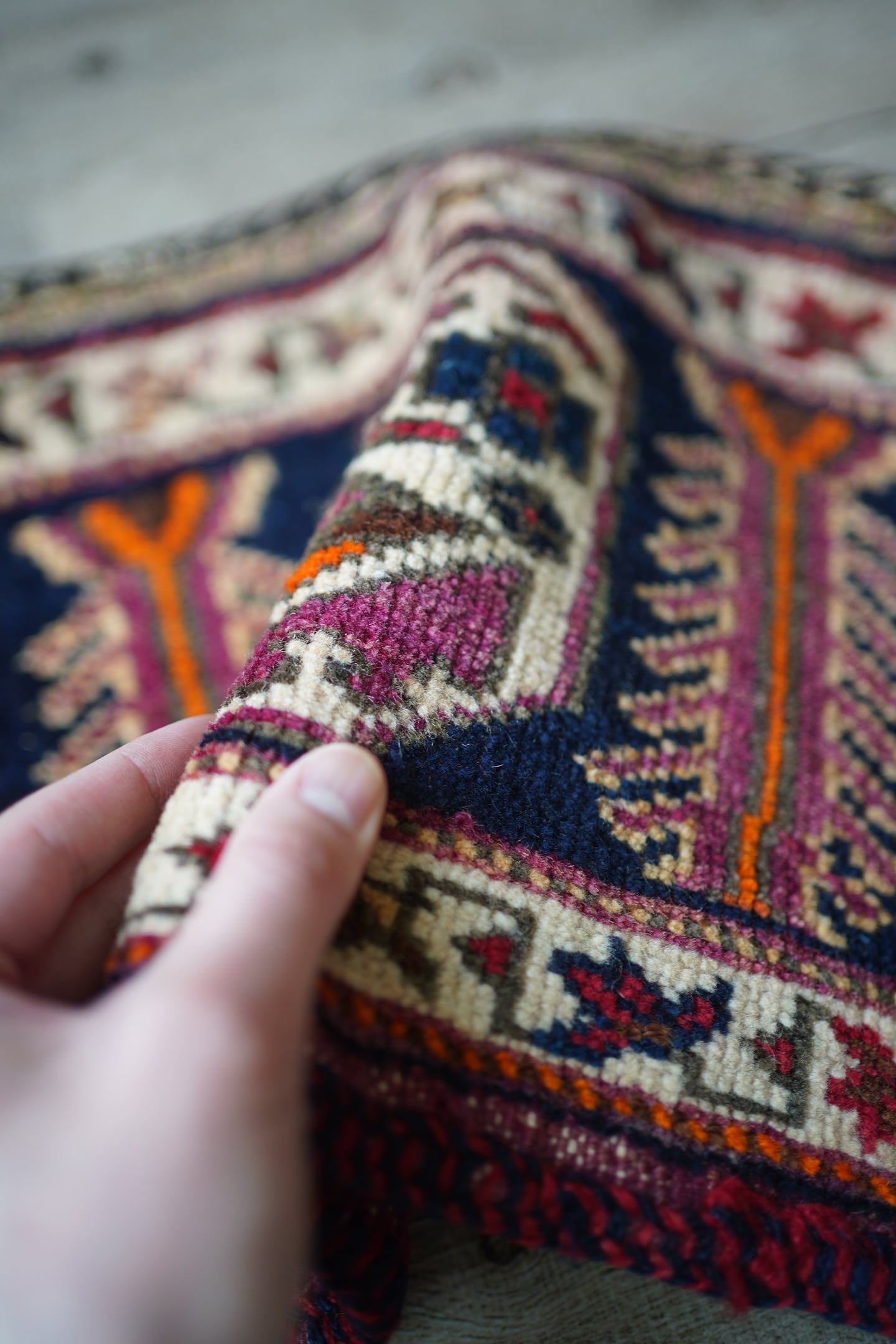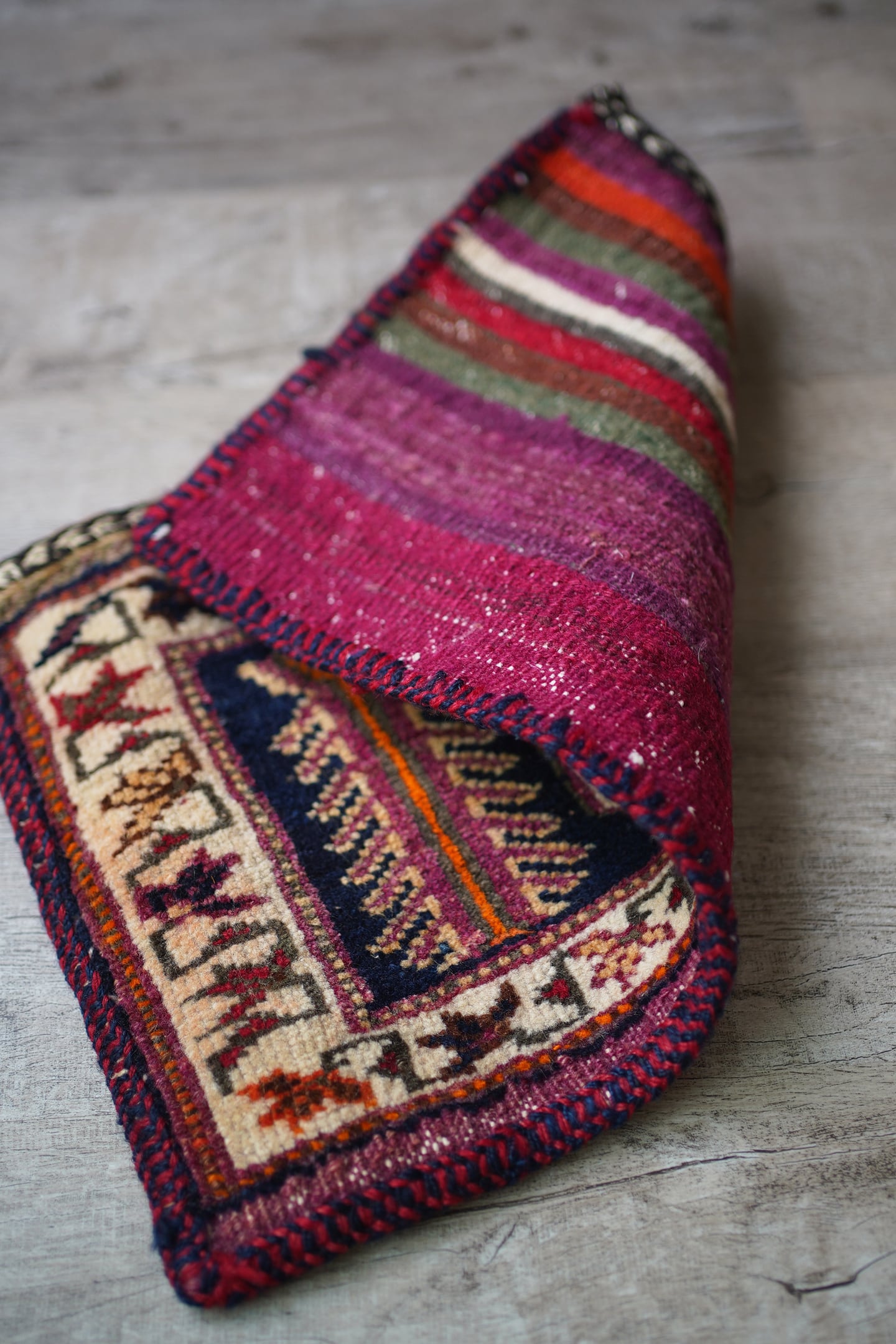 約80年前にアフシャール族によって織られた袋状のバッグです。白色と薄めの紫色をベースにした素敵な配色で、小さめながら存在感があります。表面はサラふわっとした優しい肌触りで、袋状になっているため厚みも9mm〜1cmほどあり、弾力があります。サイドの部分で1箇所、結び目が玉になっている箇所がございますのでお写真最後の2枚をご参照ください。また少しだけ台形のような形をしていますので俯瞰写真にてご確認ください。チェストの上に敷いて、アクセサリーや小物を上に置いたりすると、とっても可愛いかと思います♪