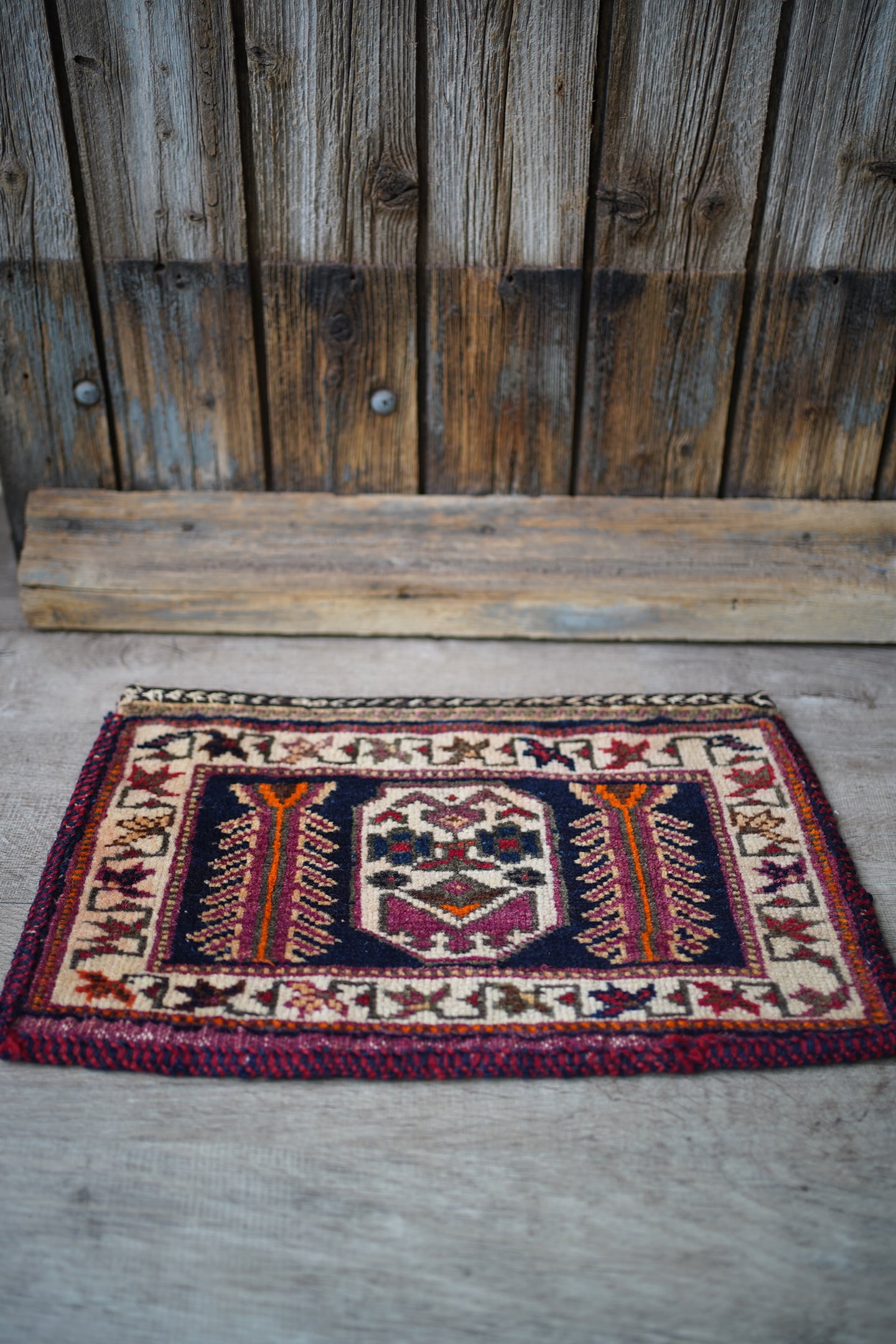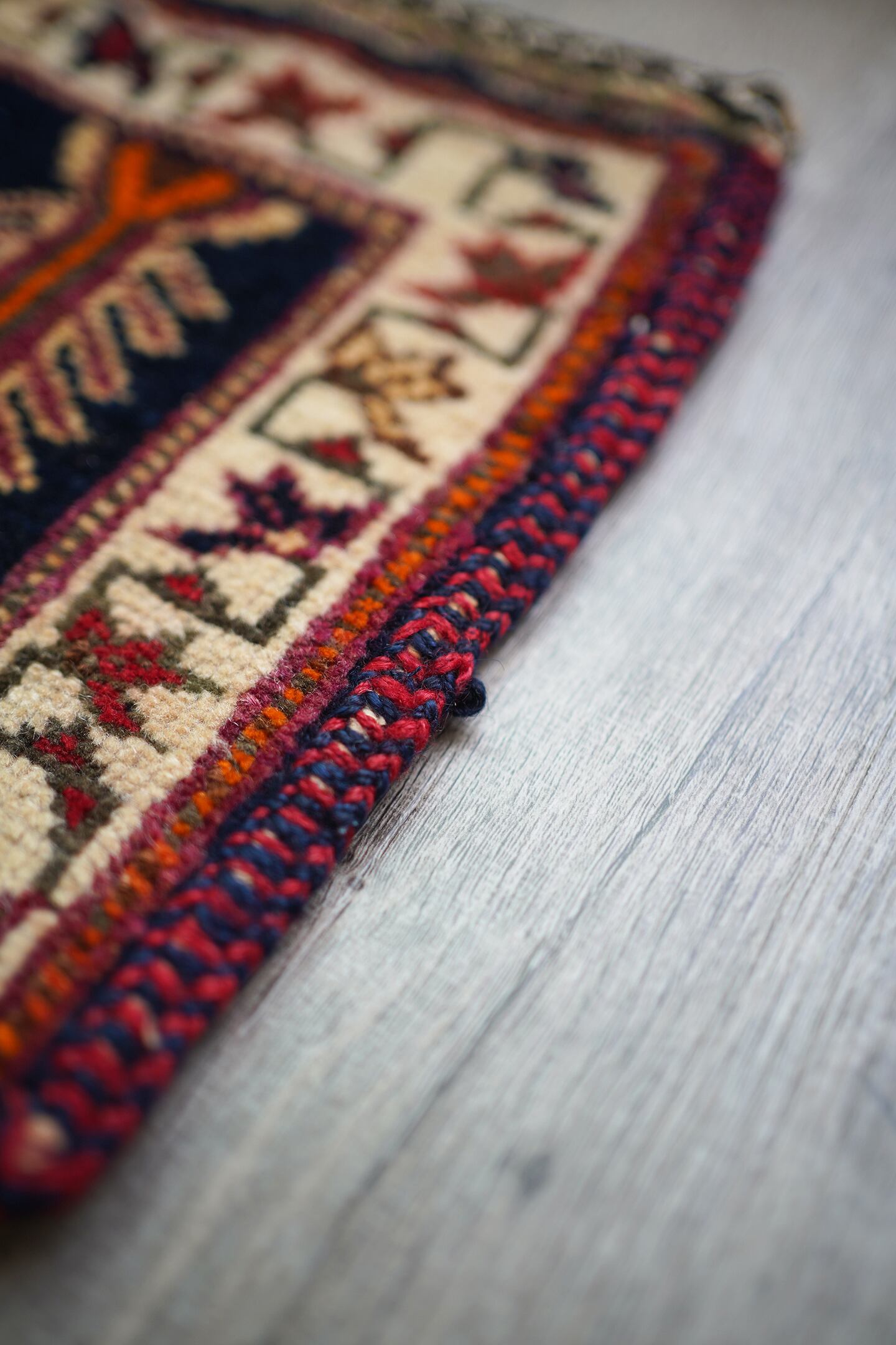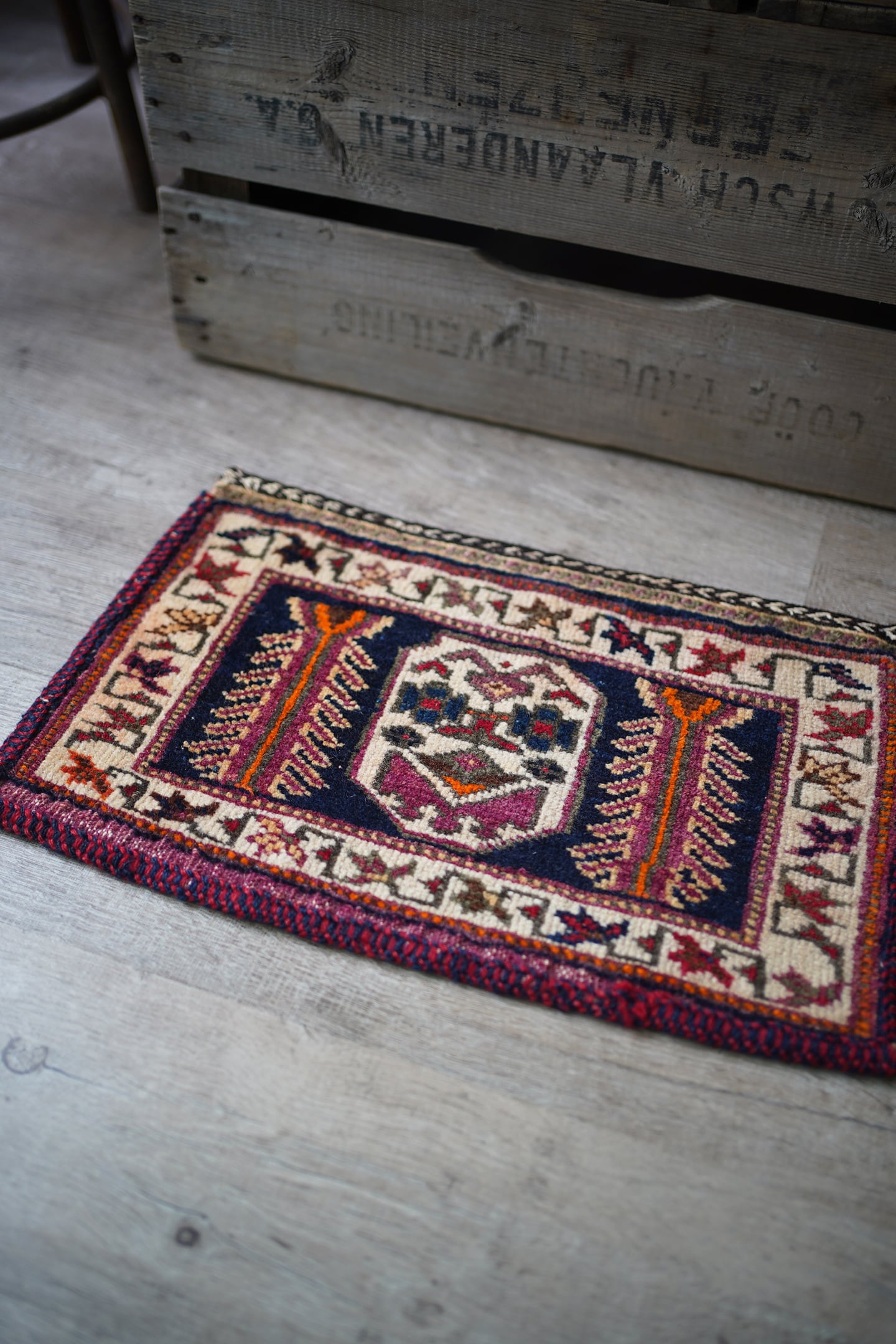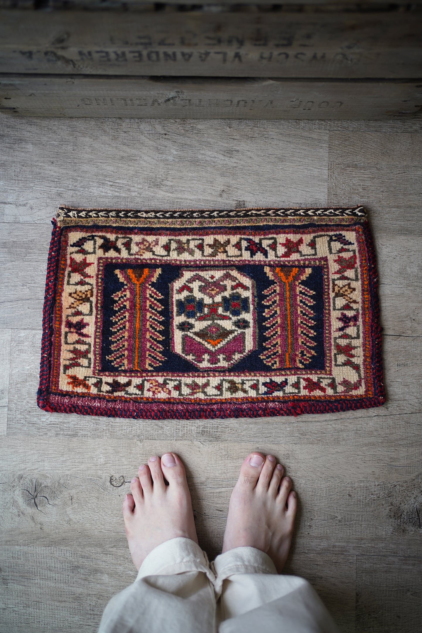 約80年前にアフシャール族によって織られた袋状のバッグです。白色と薄めの紫色をベースにした素敵な配色で、小さめながら存在感があります。表面はサラふわっとした優しい肌触りで、袋状になっているため厚みも9mm〜1cmほどあり、弾力があります。サイドの部分で1箇所、結び目が玉になっている箇所がございますのでお写真最後の2枚をご参照ください。また少しだけ台形のような形をしていますので俯瞰写真にてご確認ください。チェストの上に敷いて、アクセサリーや小物を上に置いたりすると、とっても可愛いかと思います♪