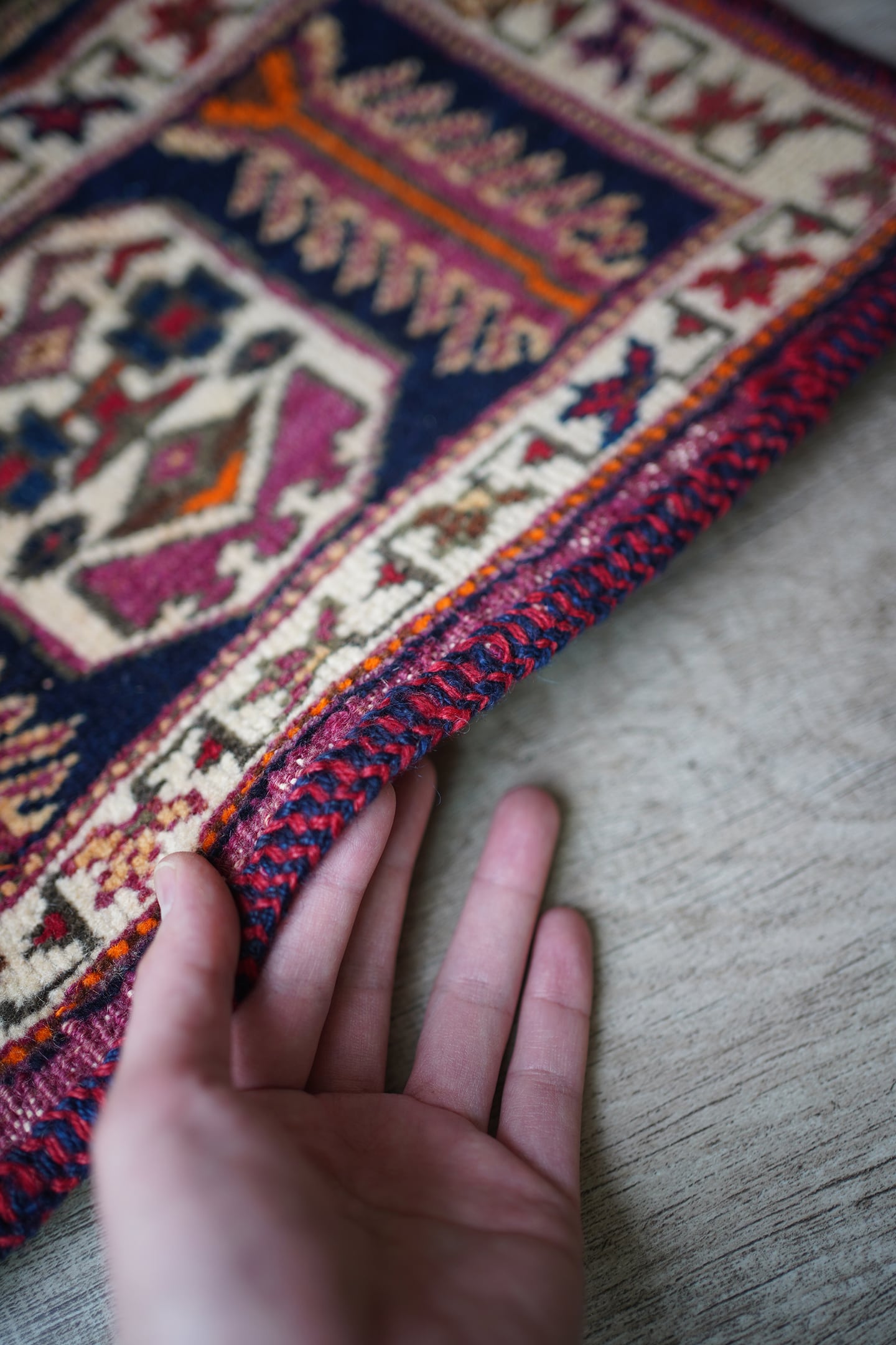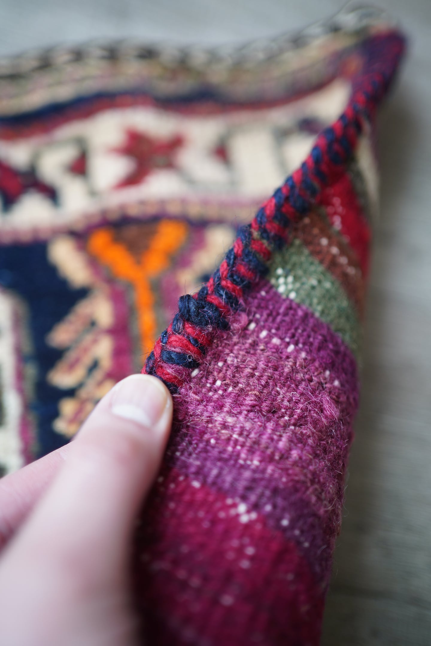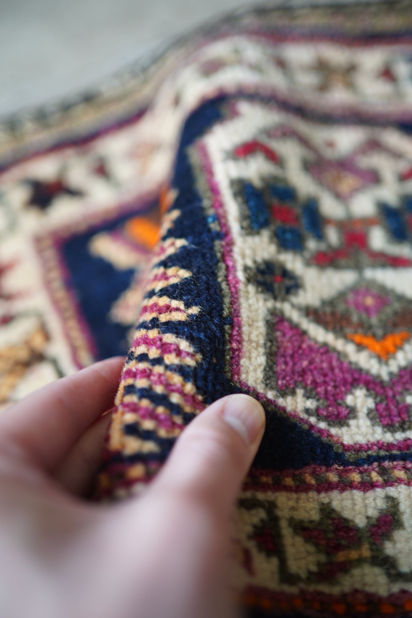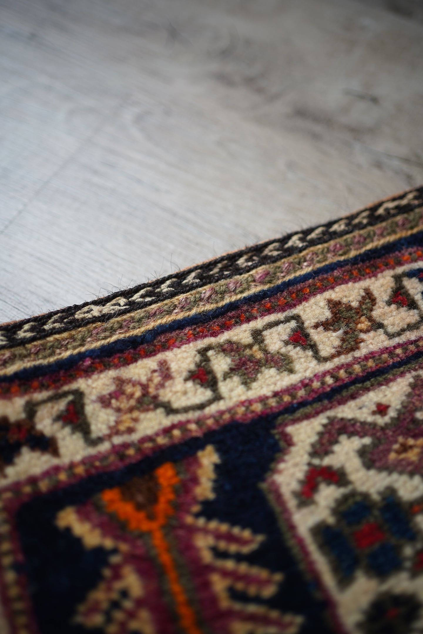約80年前にアフシャール族によって織られた袋状のバッグです。白色と薄めの紫色をベースにした素敵な配色で、小さめながら存在感があります。表面はサラふわっとした優しい肌触りで、袋状になっているため厚みも9mm〜1cmほどあり、弾力があります。サイドの部分で1箇所、結び目が玉になっている箇所がございますのでお写真最後の2枚をご参照ください。また少しだけ台形のような形をしていますので俯瞰写真にてご確認ください。チェストの上に敷いて、アクセサリーや小物を上に置いたりすると、とっても可愛いかと思います♪