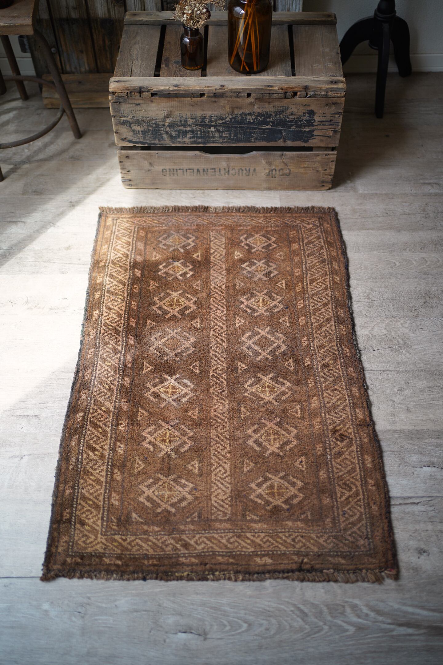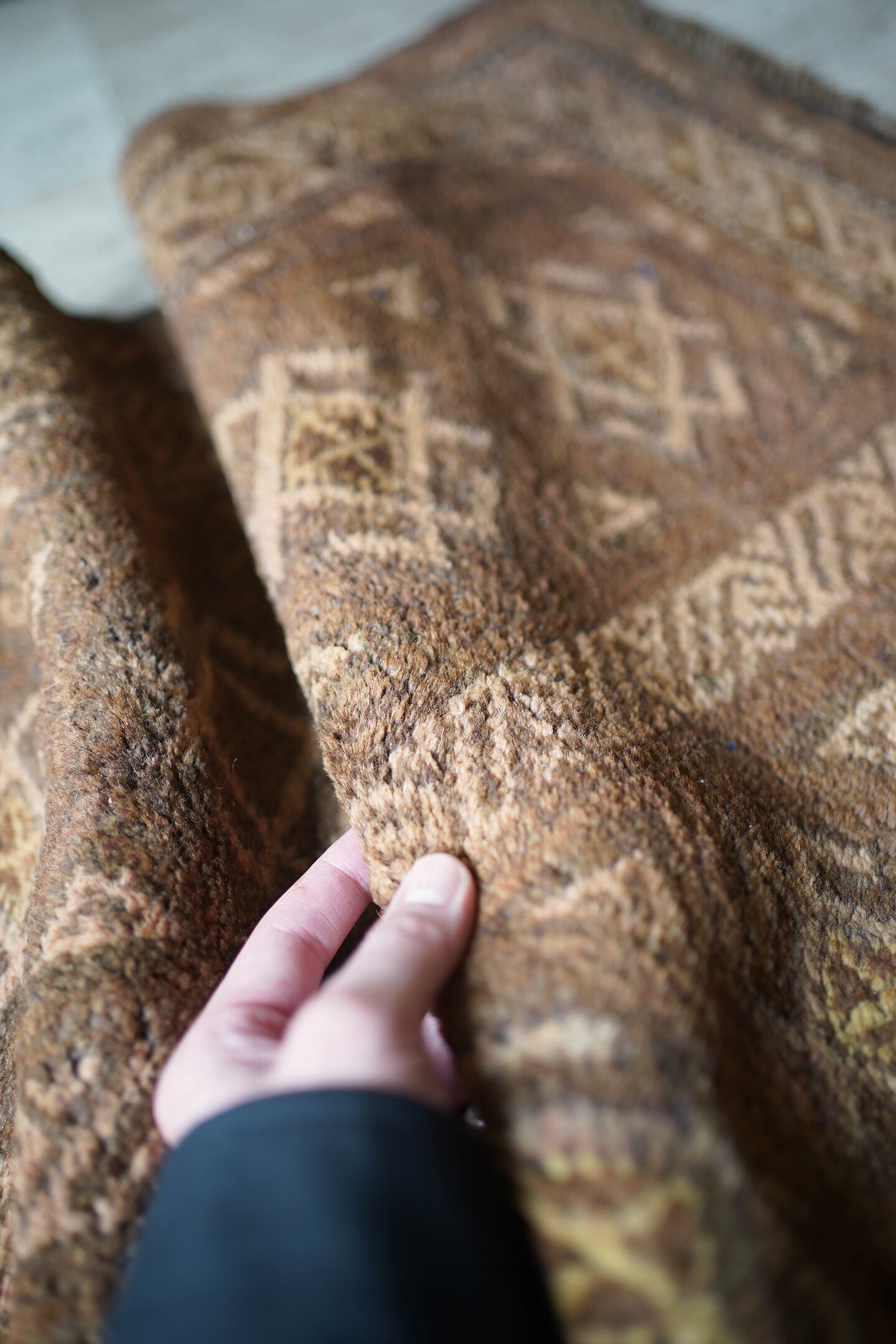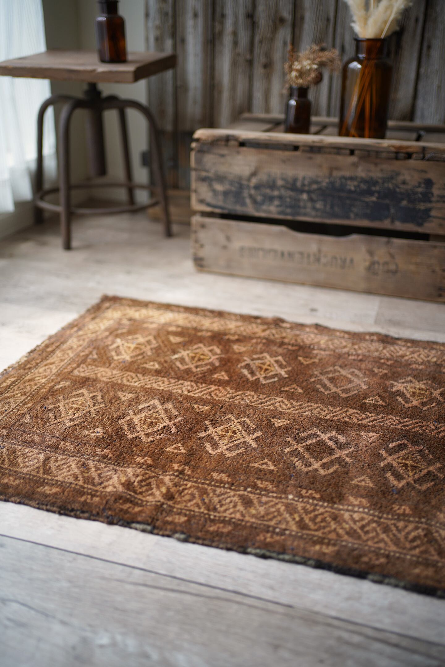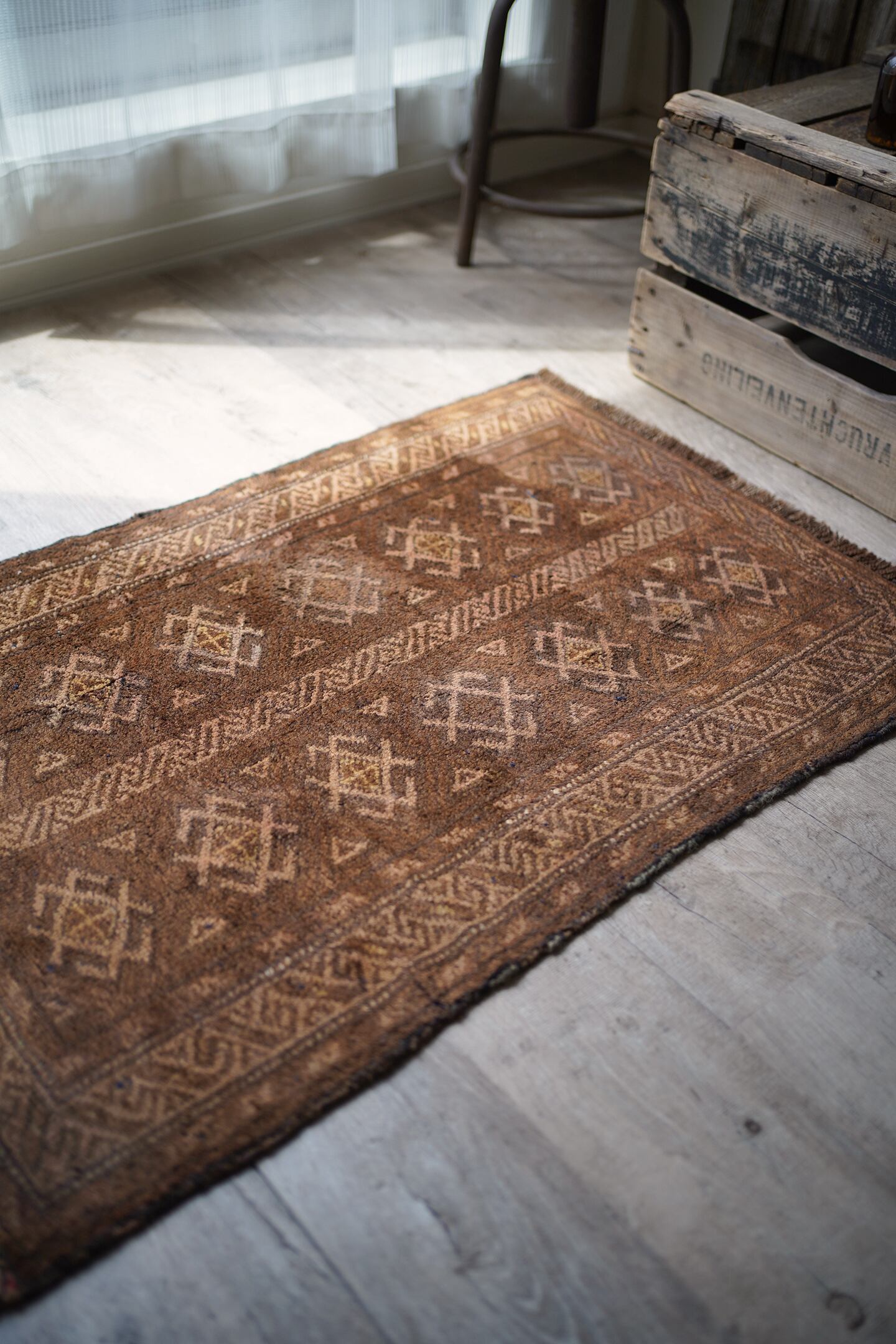 落ち着いたブラウンカラーの経年約50年のアフガンバルーチラグです。ふわっと柔らかい肌触り、厚みは6mm〜7mm程度となります。特に目立ったダメージはなく、状態良好です。様々な家具やインテリアに合わせやすい色味でスッとお部屋に馴染んでくれるはずです♪