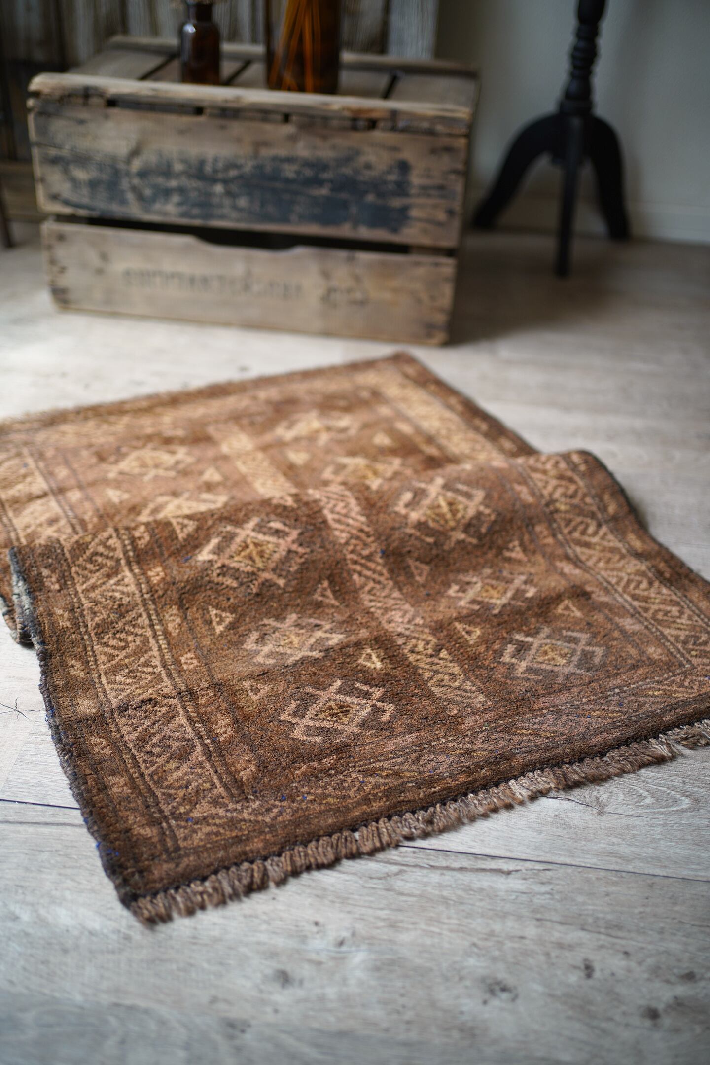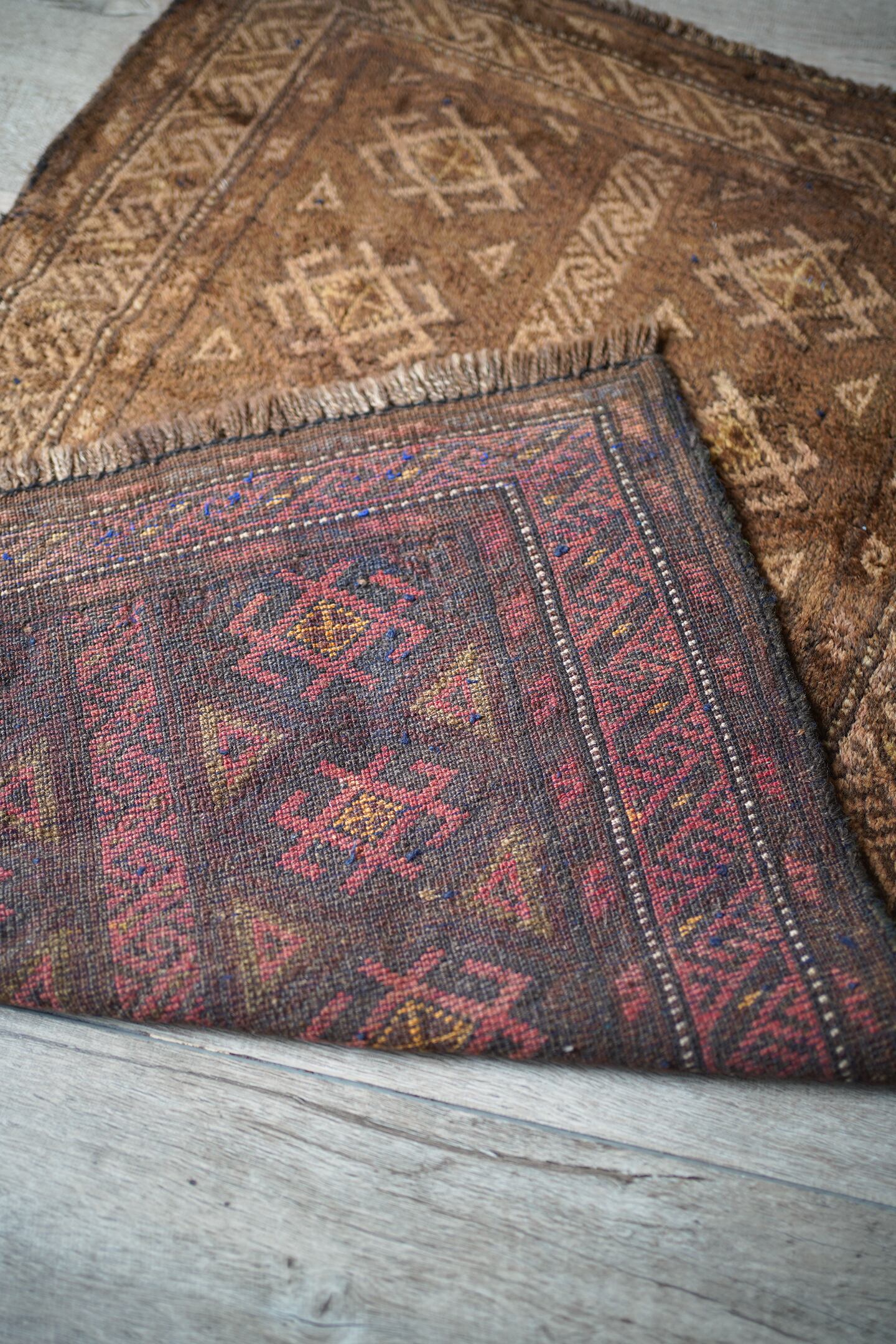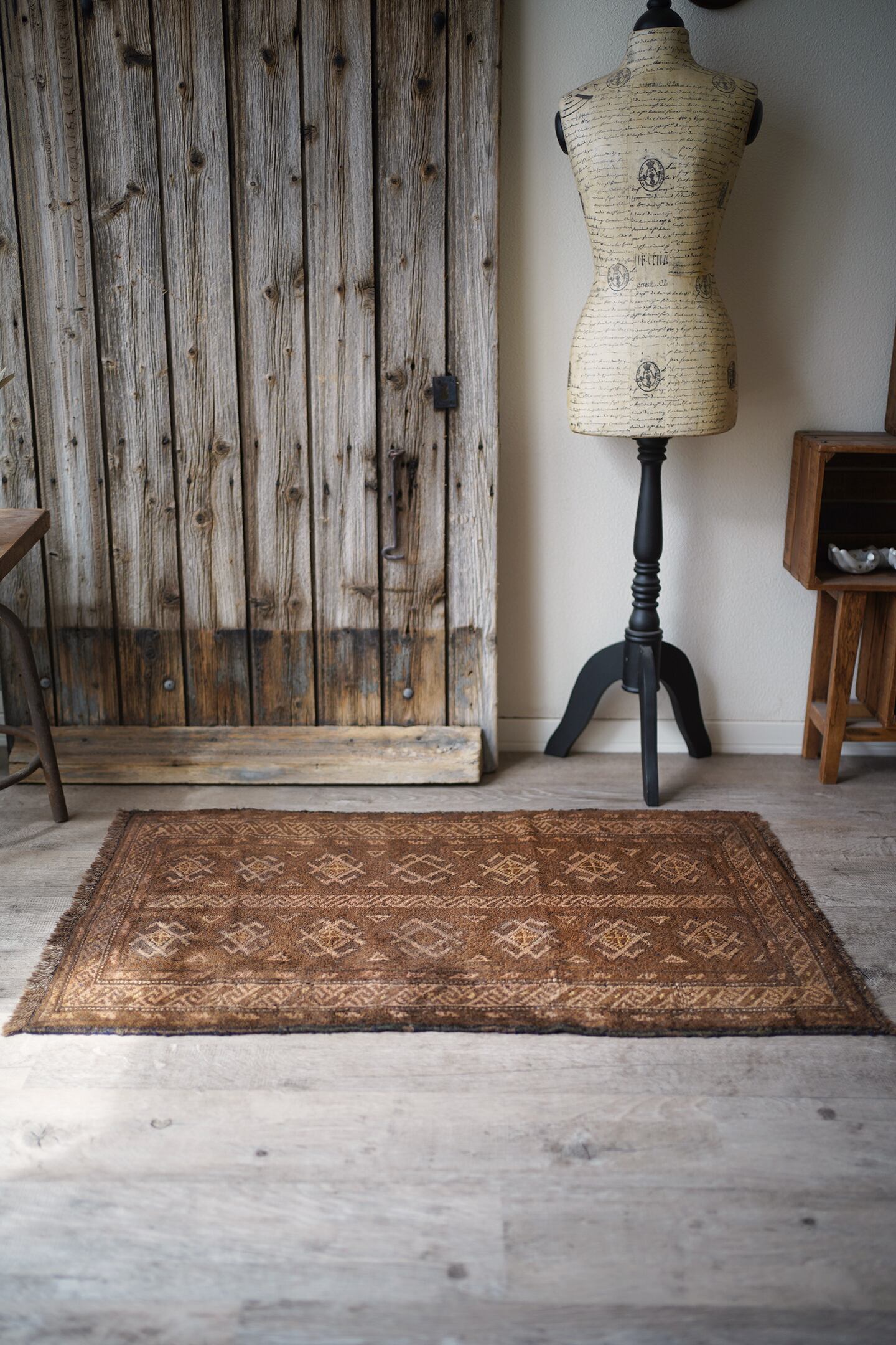 落ち着いたブラウンカラーの経年約50年のアフガンバルーチラグです。ふわっと柔らかい肌触り、厚みは6mm〜7mm程度となります。特に目立ったダメージはなく、状態良好です。様々な家具やインテリアに合わせやすい色味でスッとお部屋に馴染んでくれるはずです♪
