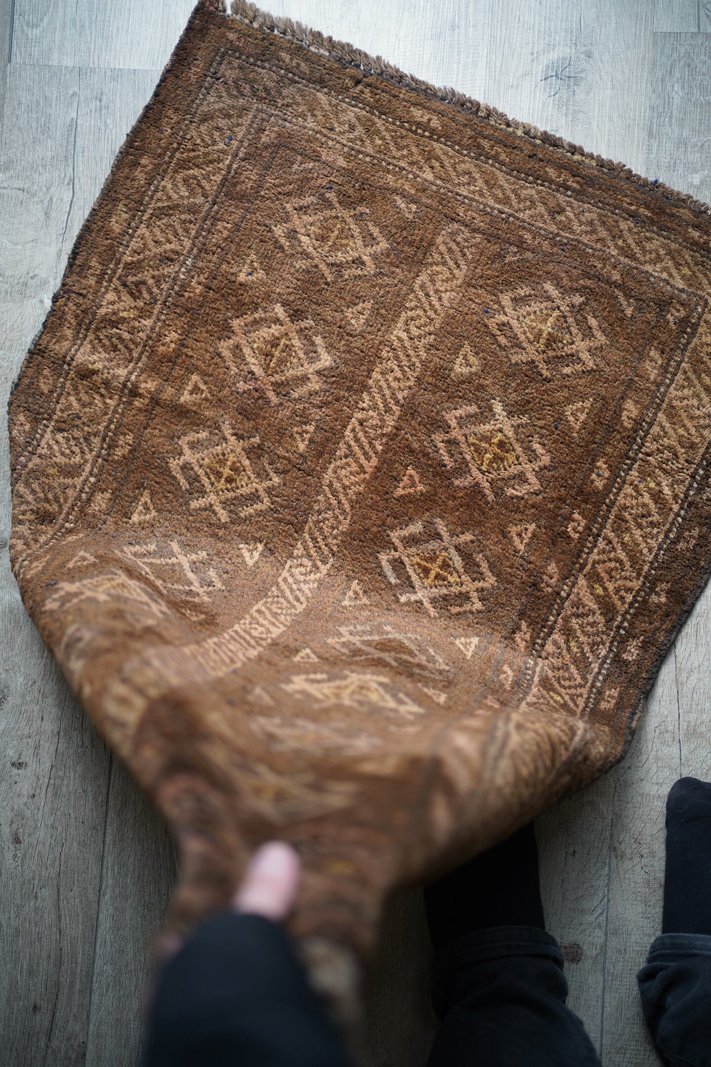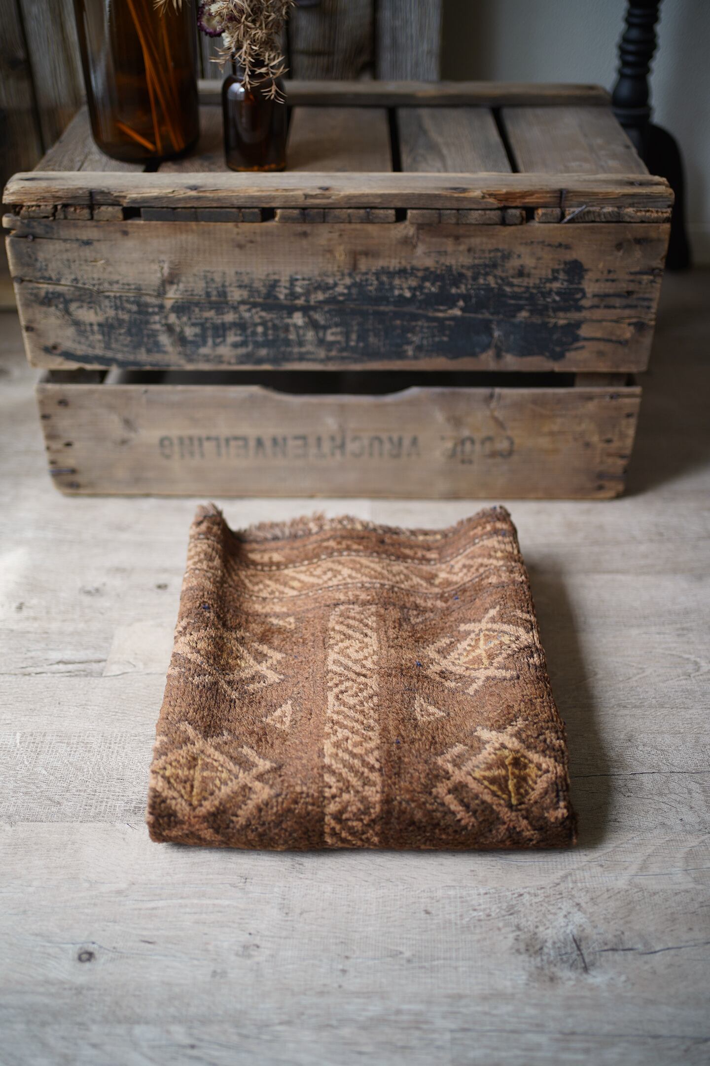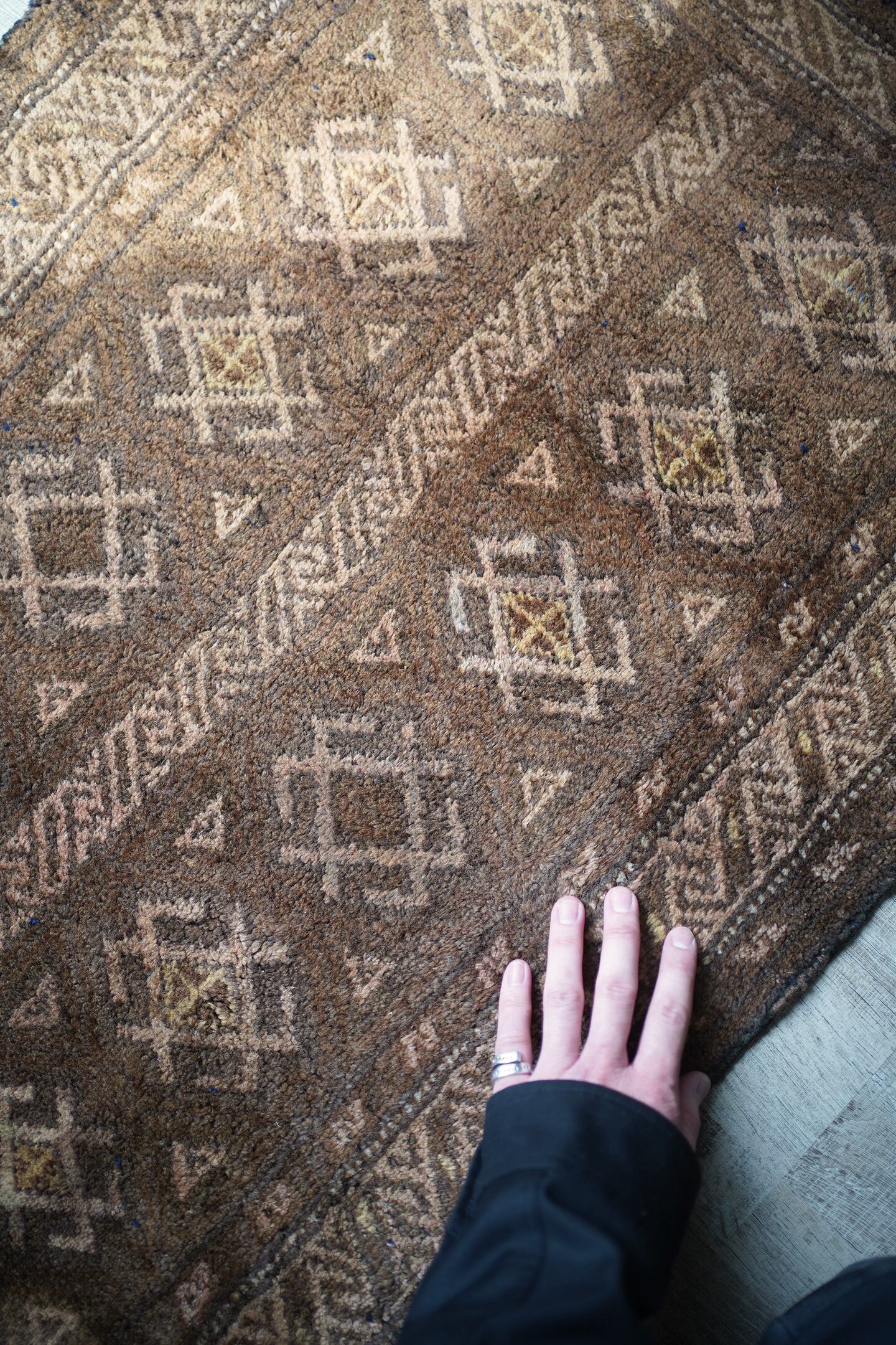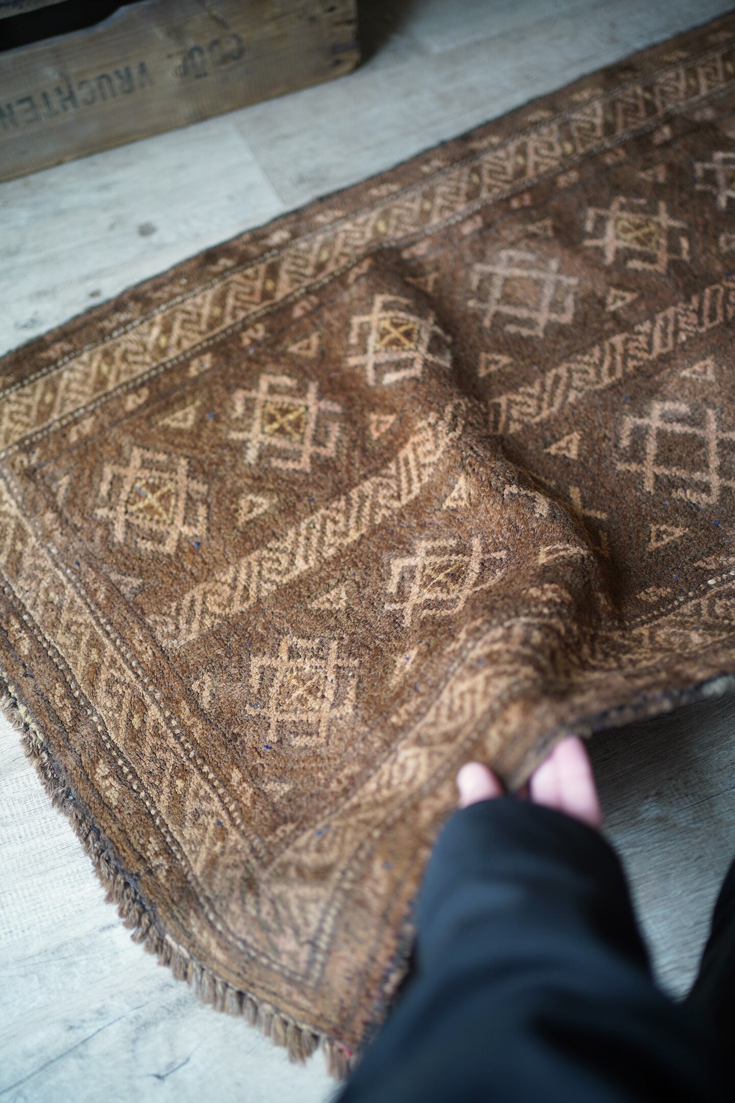 落ち着いたブラウンカラーの経年約50年のアフガンバルーチラグです。ふわっと柔らかい肌触り、厚みは6mm〜7mm程度となります。特に目立ったダメージはなく、状態良好です。様々な家具やインテリアに合わせやすい色味でスッとお部屋に馴染んでくれるはずです♪