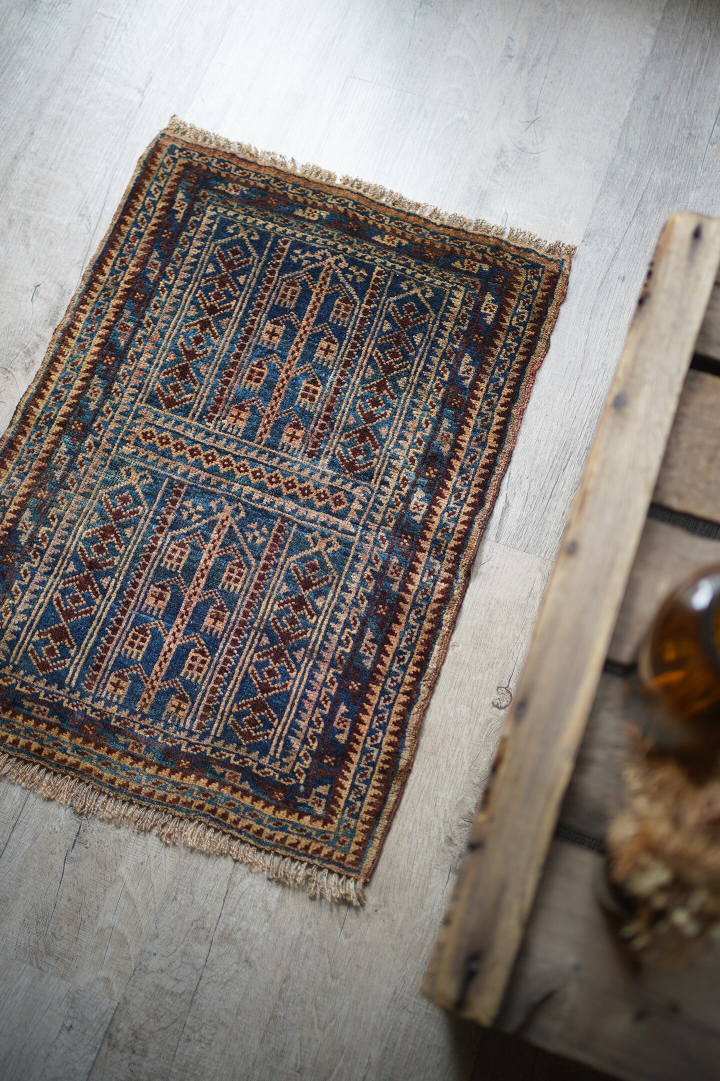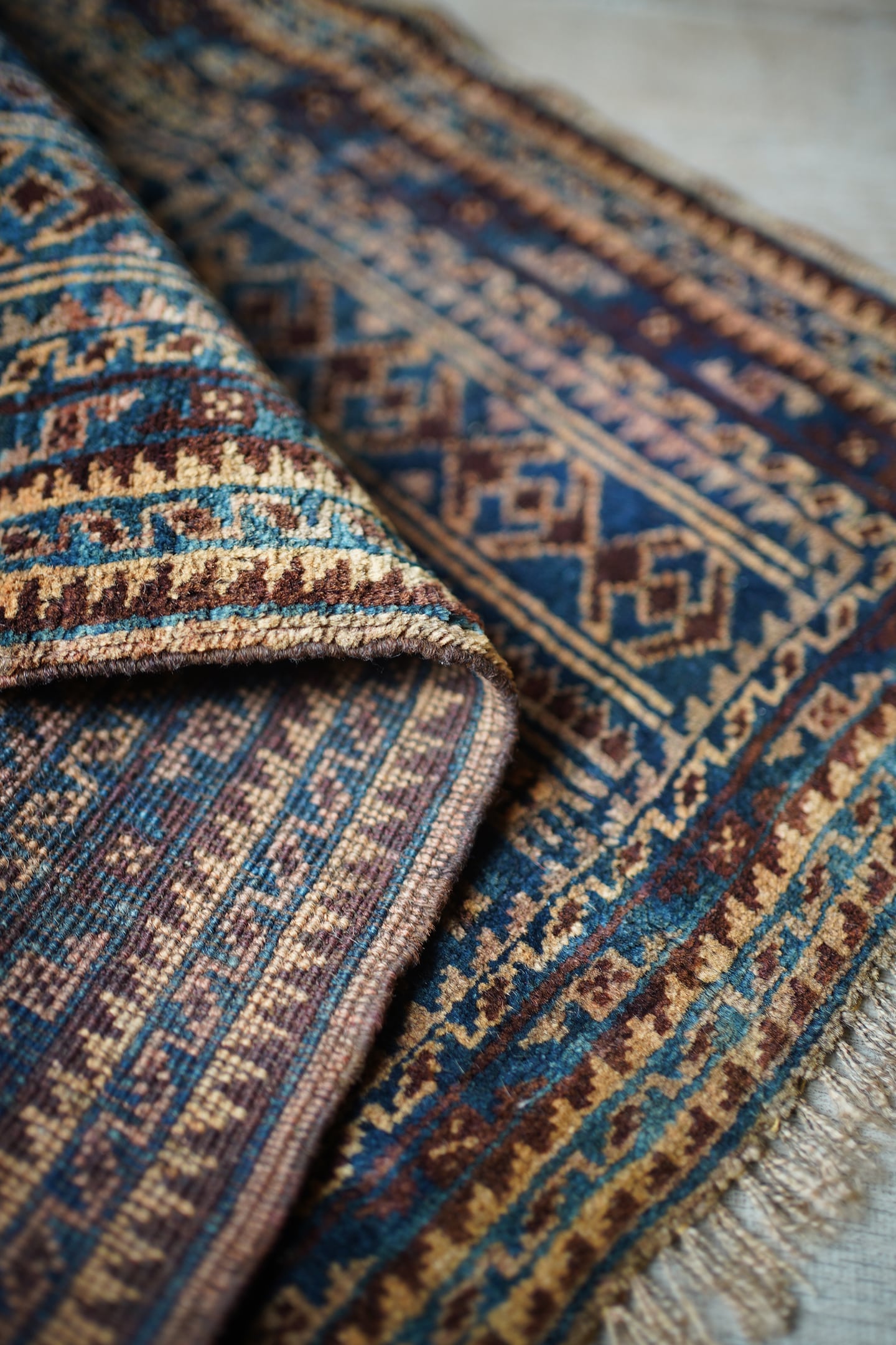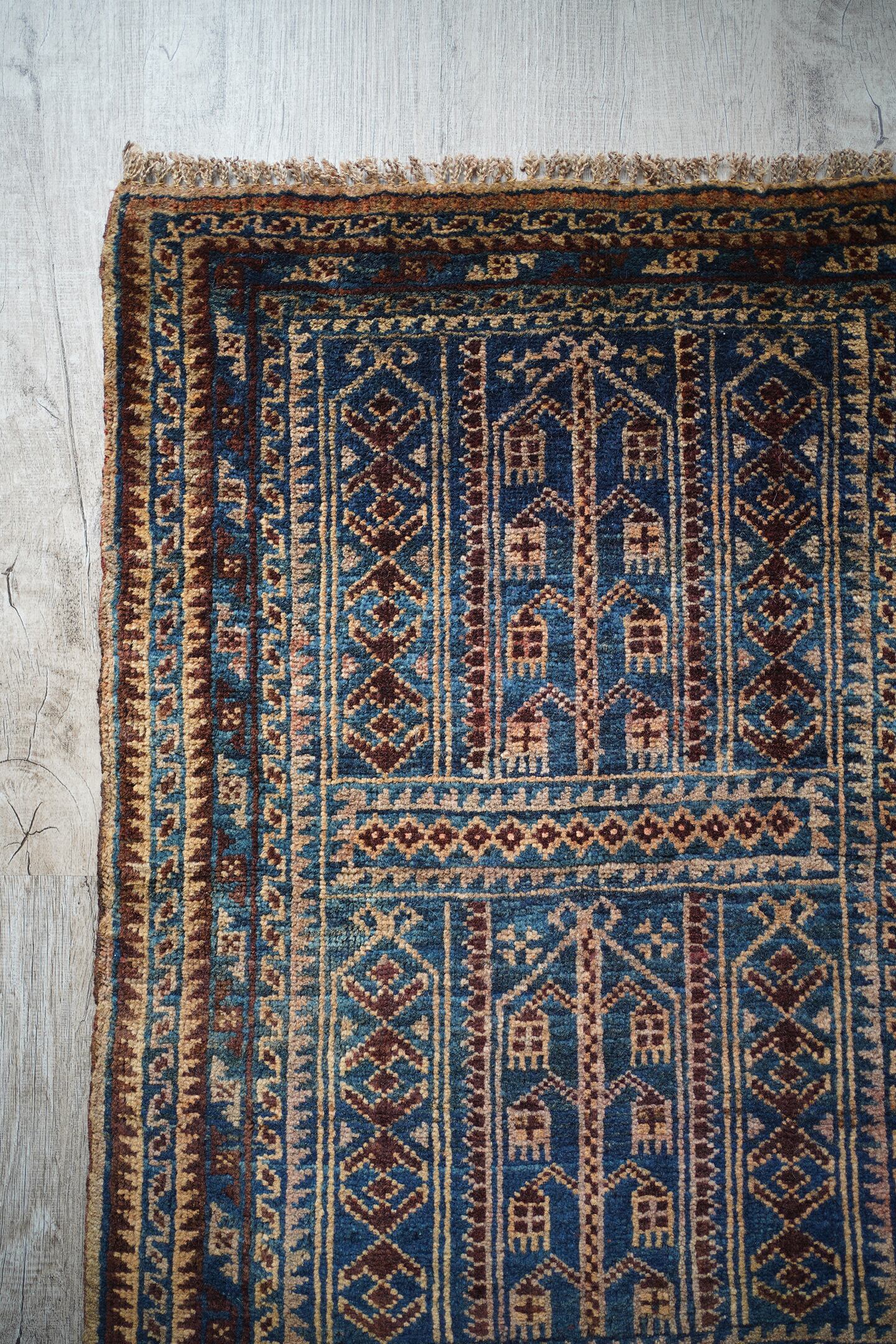 光沢感のある艶に輝くブルーグリーンの美しい色味が魅力的な経年50年ほどのアリホジャラグ。デザインは"ミフラーブ"と呼ばれるイスラム建築由来の紋様です。サラふわっとした滑らかな肌触り、厚みは5mm程度。目立ったダメージはなく、大変良好な状態です。チェストの上に敷いたり、タペストリーとしても壁に飾っても素敵かと思います♪