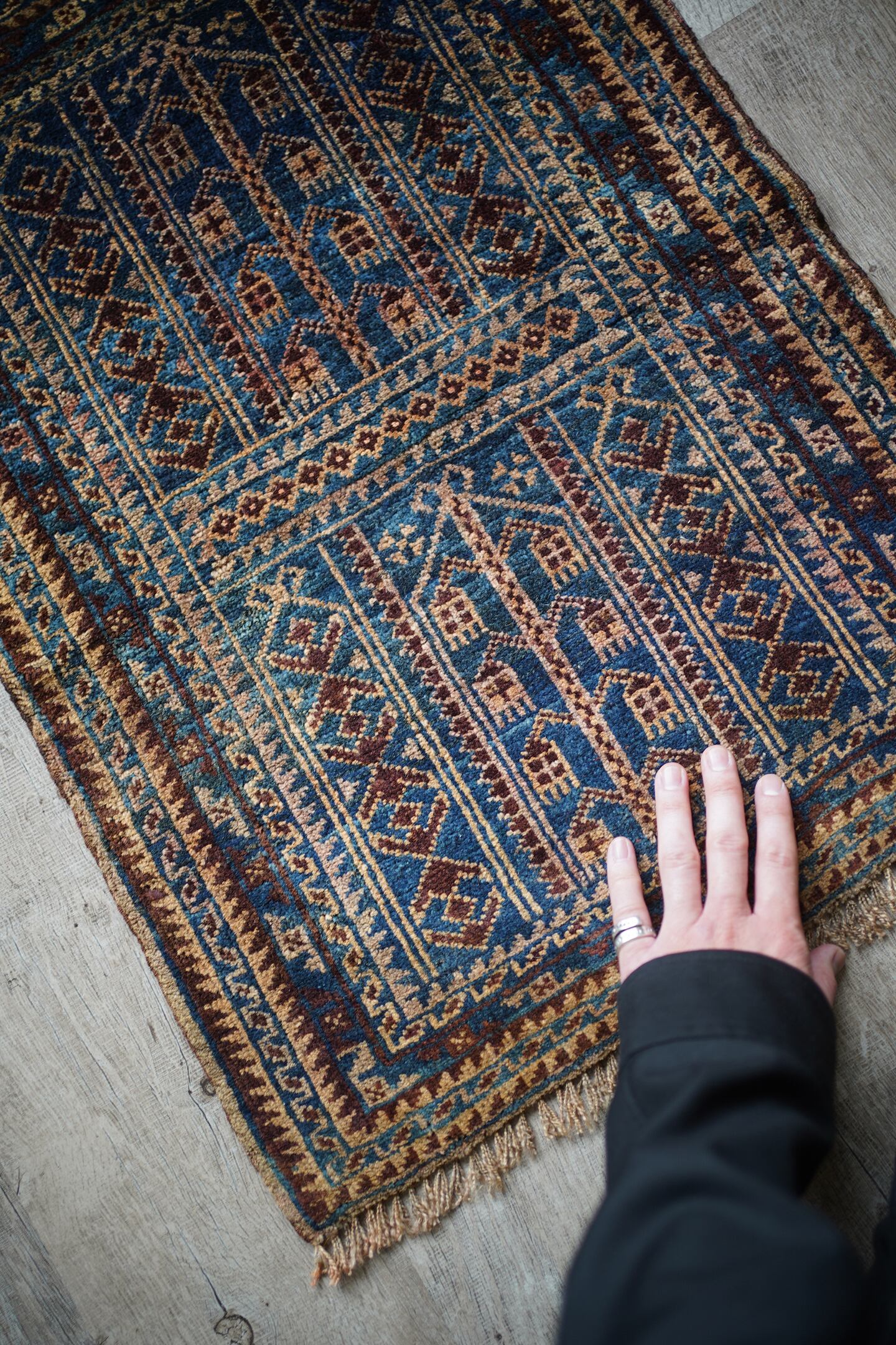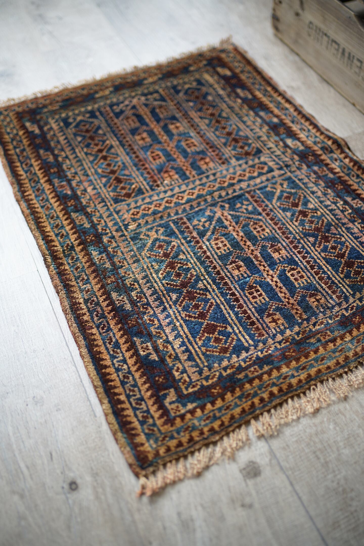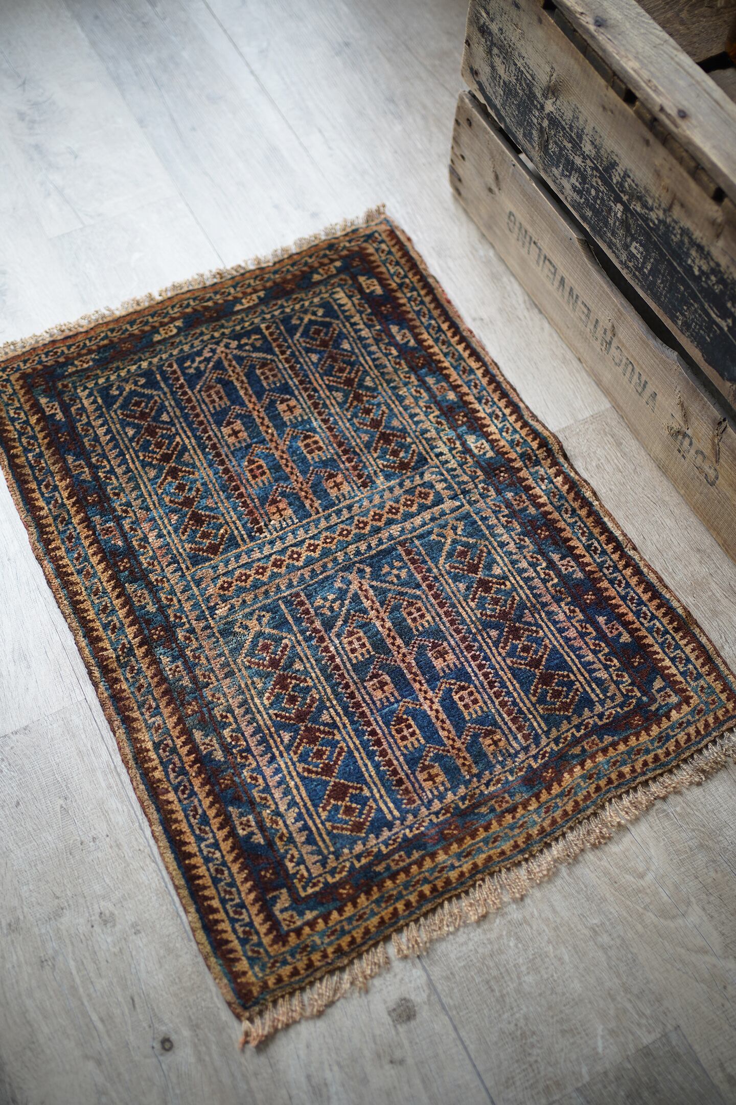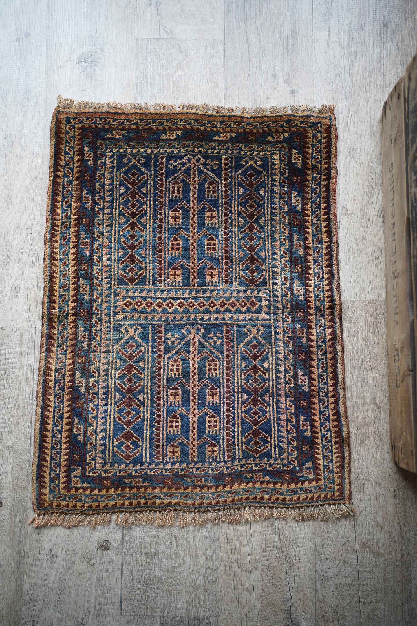 光沢感のある艶に輝くブルーグリーンの美しい色味が魅力的な経年50年ほどのアリホジャラグ。デザインは"ミフラーブ"と呼ばれるイスラム建築由来の紋様です。サラふわっとした滑らかな肌触り、厚みは5mm程度。目立ったダメージはなく、大変良好な状態です。チェストの上に敷いたり、タペストリーとしても壁に飾っても素敵かと思います♪