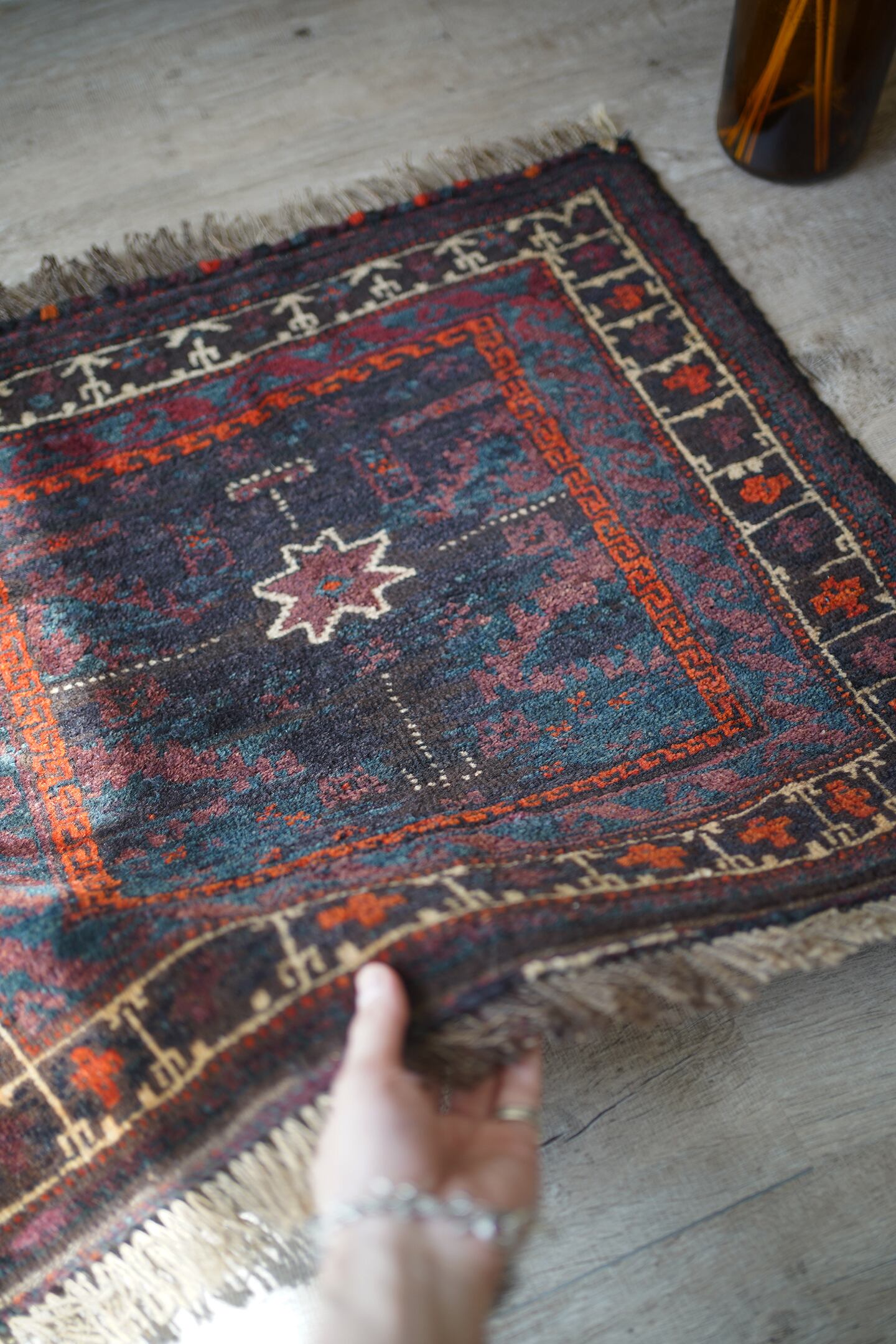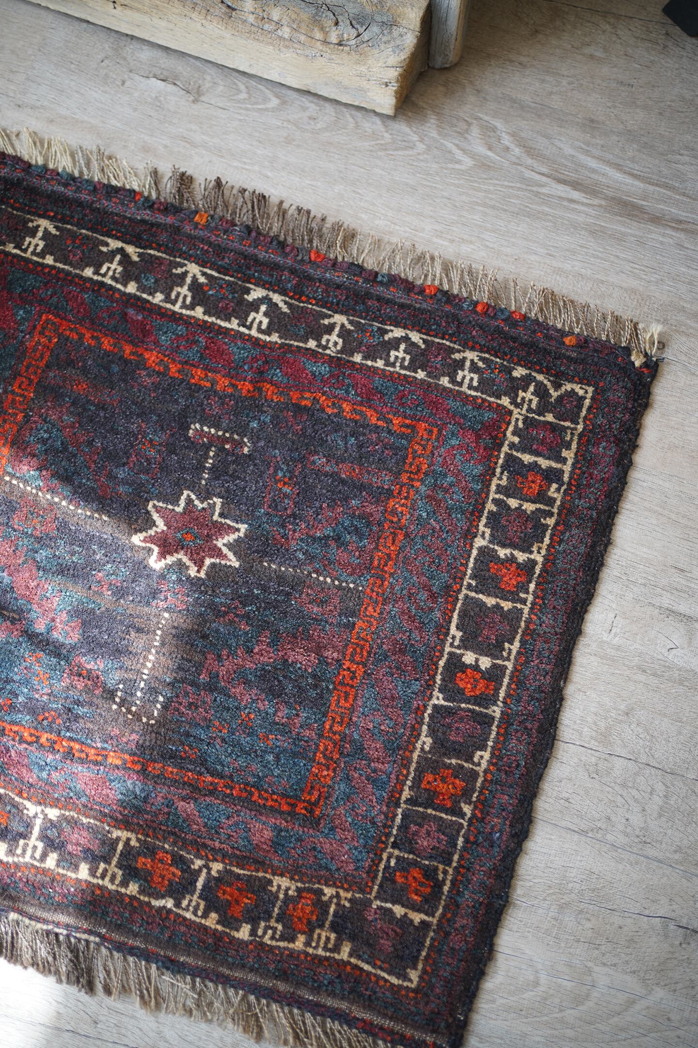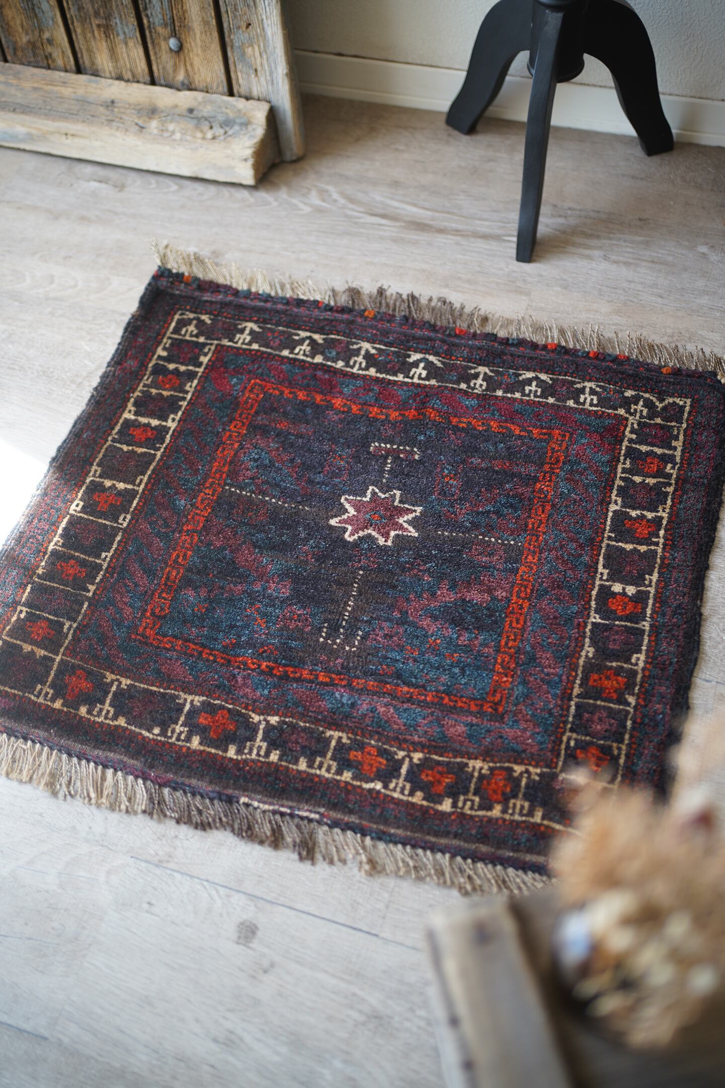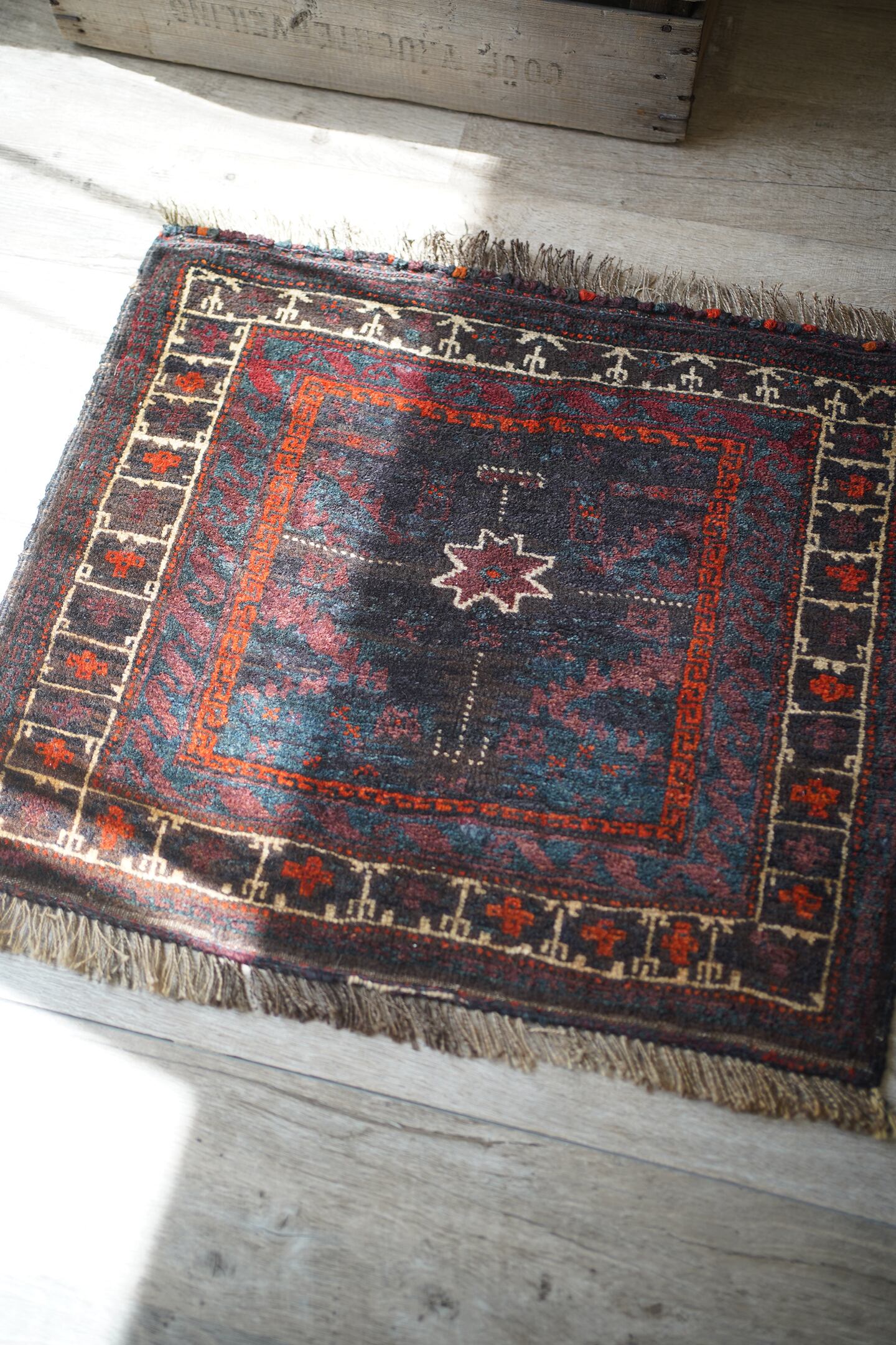約70年〜80年ほど前にアフガニスタン北西部のホラサーン州で織られたセミアンティークのバルーチラグです。このタイプのスクエアのバルーチラグでは、よく円に囲まれた八角星の紋様がたくさん織り込まれたラグはよく見かけるのですが、シンプルな八角星が一つだけ中央にあるタイプはかなり珍しい印象を受けました。ブラウンをベースに濃いめのオレンジがアクセントになった配色で、暗いところや日陰では分かりづらいのですが、太陽光に当たると濃く深いグリーンが使われているのが分かります。表面はふわっと滑らかで気持ち良い肌触りで、厚みは7mmほど。目立った補修跡もなくコンディションも良好。スクエアタイプなので、色んな場所に使いやすいサイズ感です。玄関や洗面所など、色んな場所にどうぞ♪