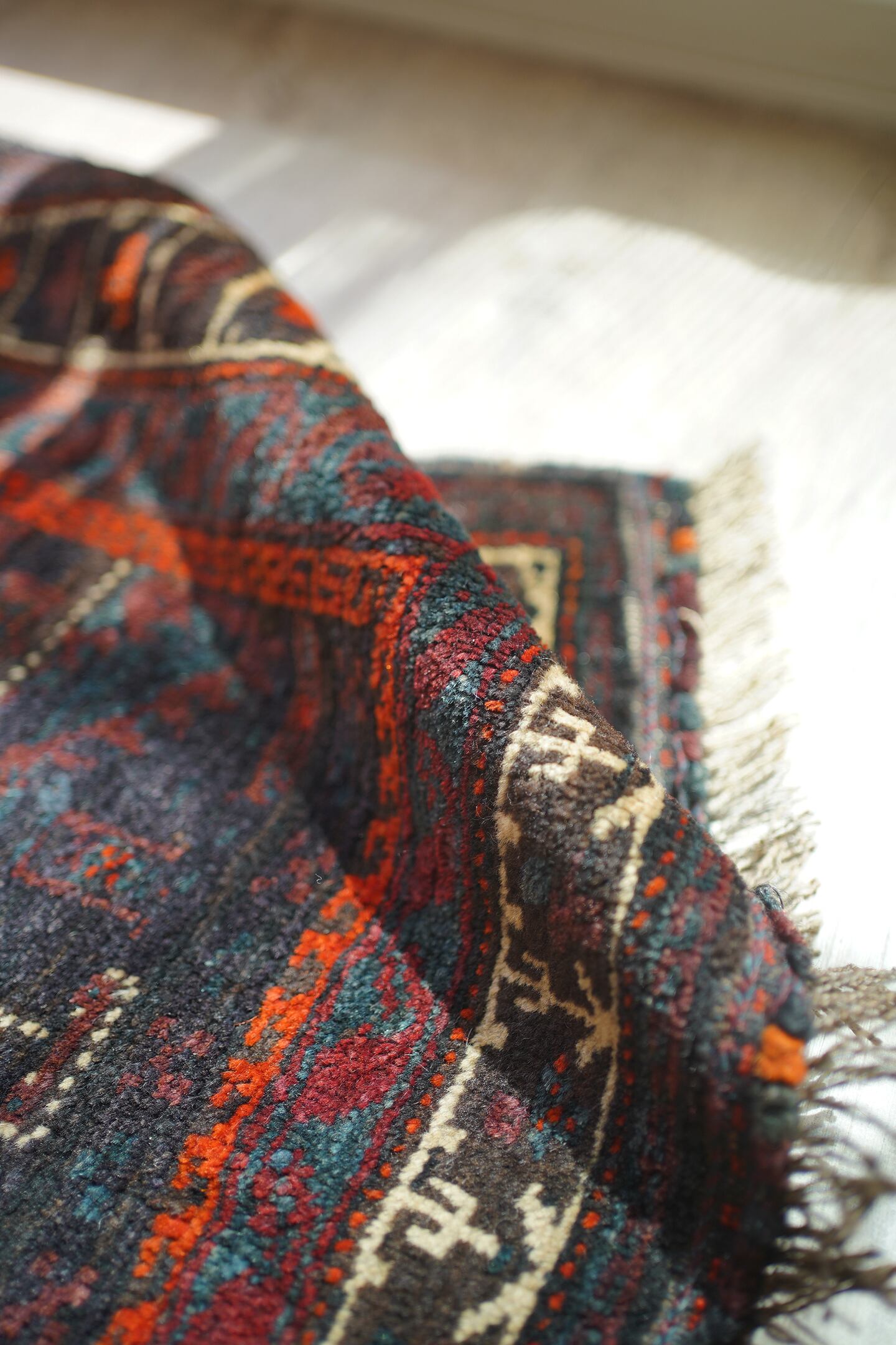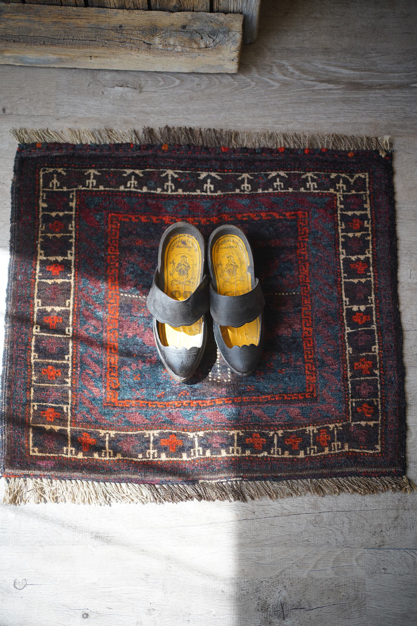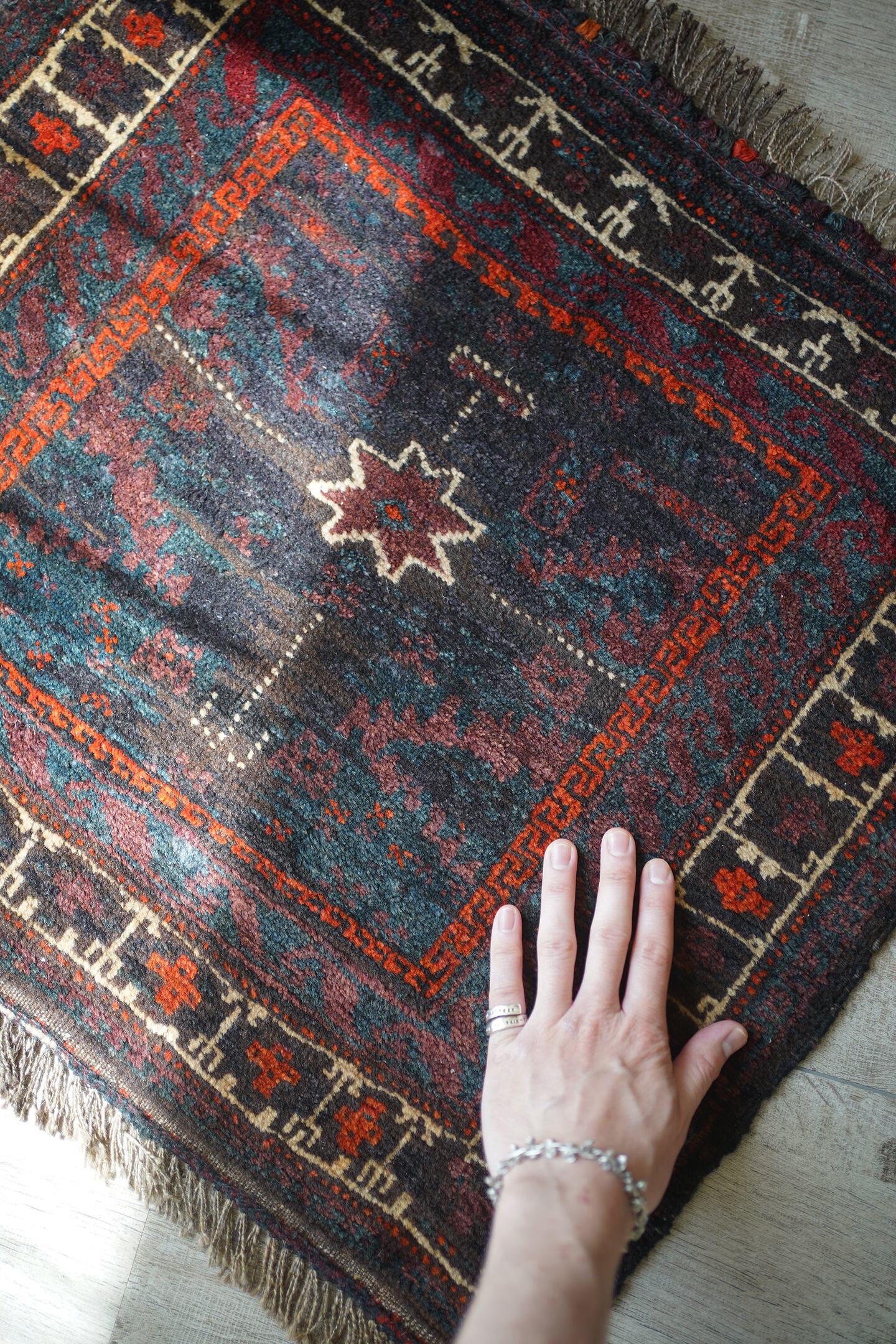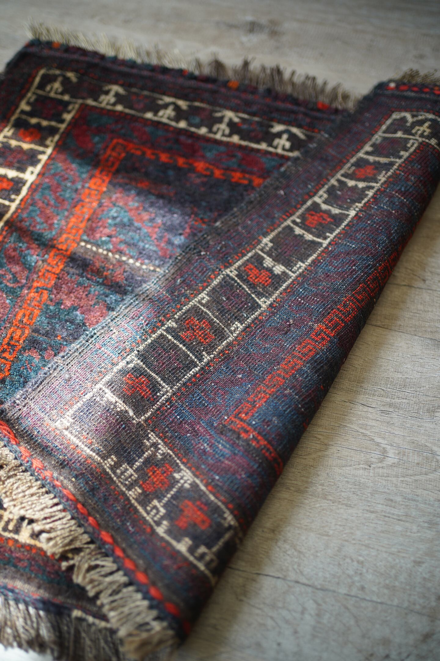 約70年〜80年ほど前にアフガニスタン北西部のホラサーン州で織られたセミアンティークのバルーチラグです。このタイプのスクエアのバルーチラグでは、よく円に囲まれた八角星の紋様がたくさん織り込まれたラグはよく見かけるのですが、シンプルな八角星が一つだけ中央にあるタイプはかなり珍しい印象を受けました。ブラウンをベースに濃いめのオレンジがアクセントになった配色で、暗いところや日陰では分かりづらいのですが、太陽光に当たると濃く深いグリーンが使われているのが分かります。表面はふわっと滑らかで気持ち良い肌触りで、厚みは7mmほど。目立った補修跡もなくコンディションも良好。スクエアタイプなので、色んな場所に使いやすいサイズ感です。玄関や洗面所など、色んな場所にどうぞ♪
