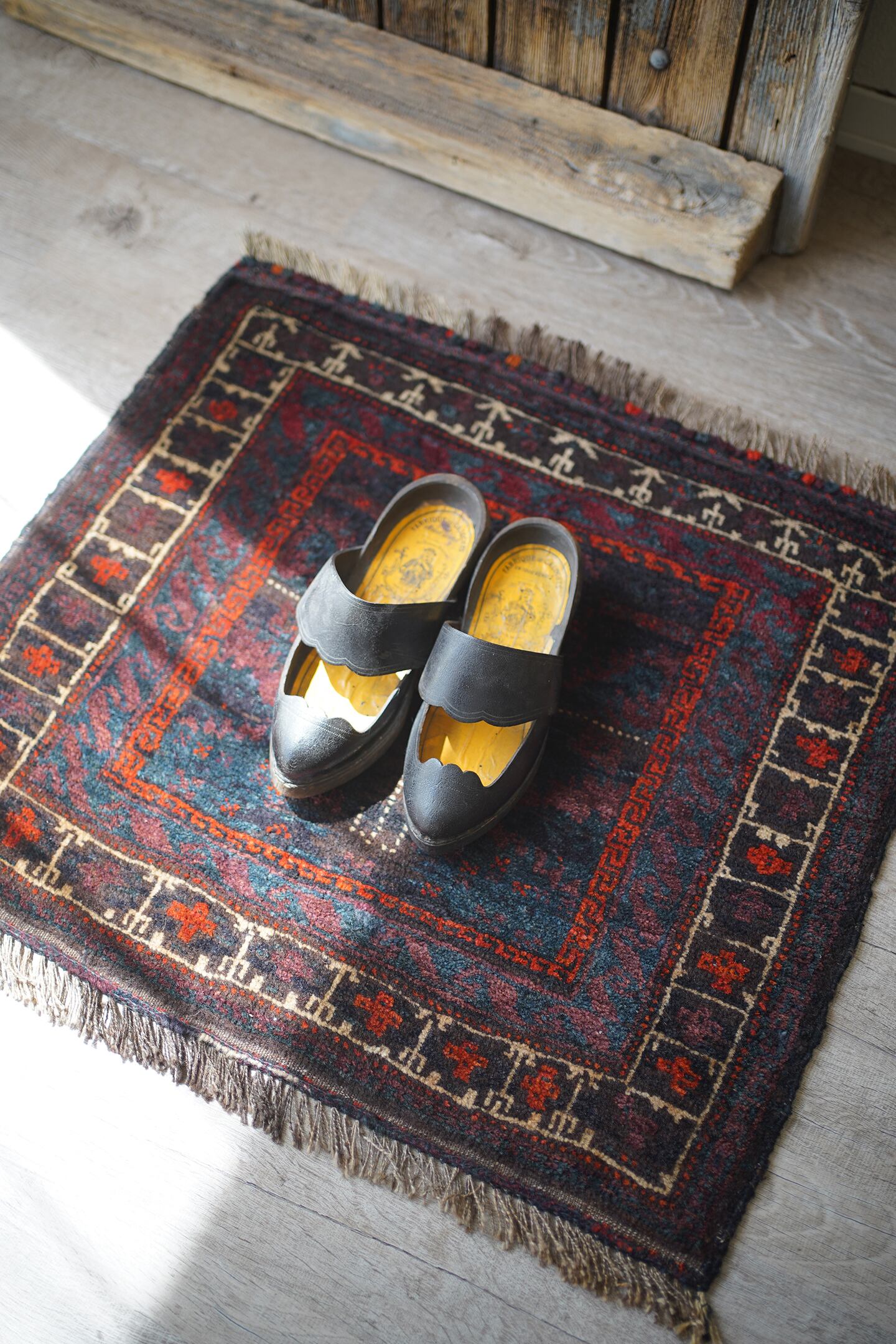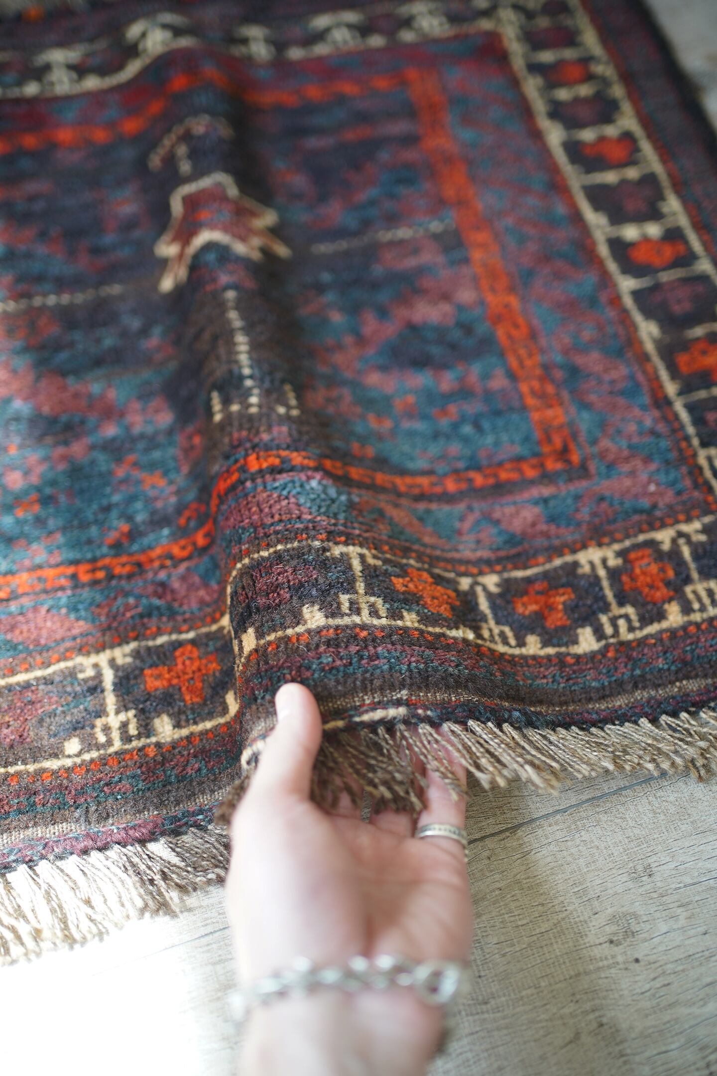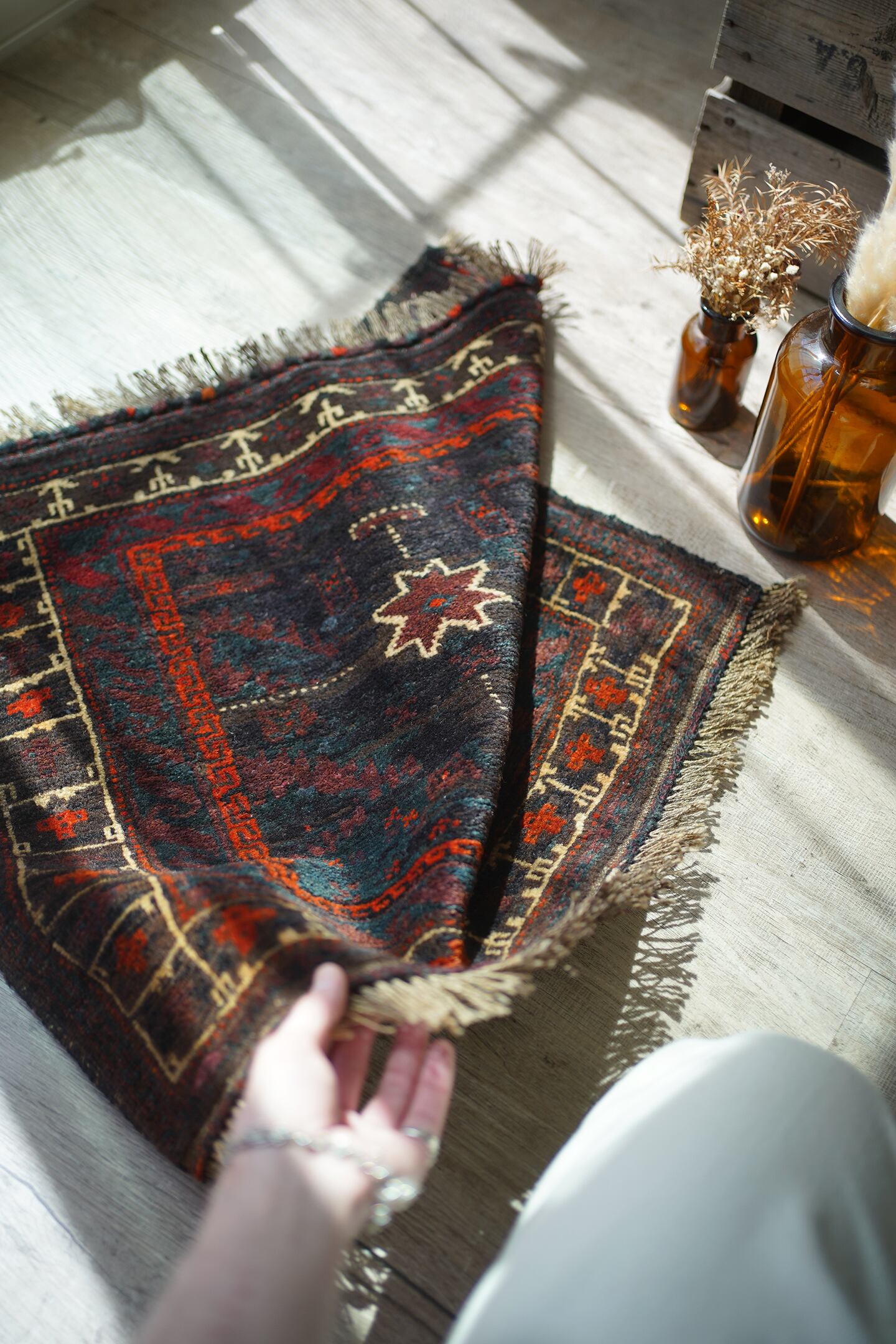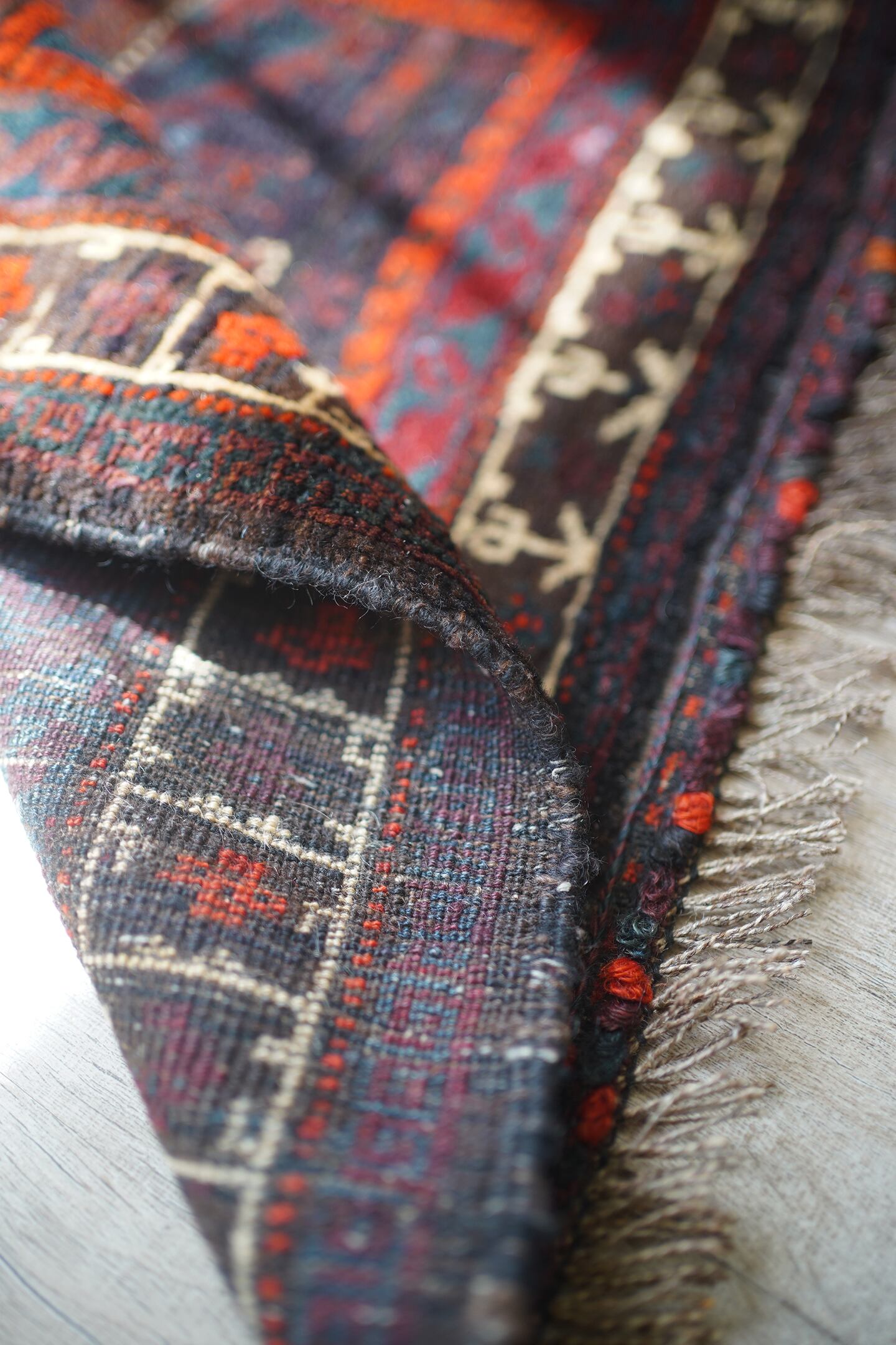 約70年〜80年ほど前にアフガニスタン北西部のホラサーン州で織られたセミアンティークのバルーチラグです。このタイプのスクエアのバルーチラグでは、よく円に囲まれた八角星の紋様がたくさん織り込まれたラグはよく見かけるのですが、シンプルな八角星が一つだけ中央にあるタイプはかなり珍しい印象を受けました。ブラウンをベースに濃いめのオレンジがアクセントになった配色で、暗いところや日陰では分かりづらいのですが、太陽光に当たると濃く深いグリーンが使われているのが分かります。表面はふわっと滑らかで気持ち良い肌触りで、厚みは7mmほど。目立った補修跡もなくコンディションも良好。スクエアタイプなので、色んな場所に使いやすいサイズ感です。玄関や洗面所など、色んな場所にどうぞ♪
