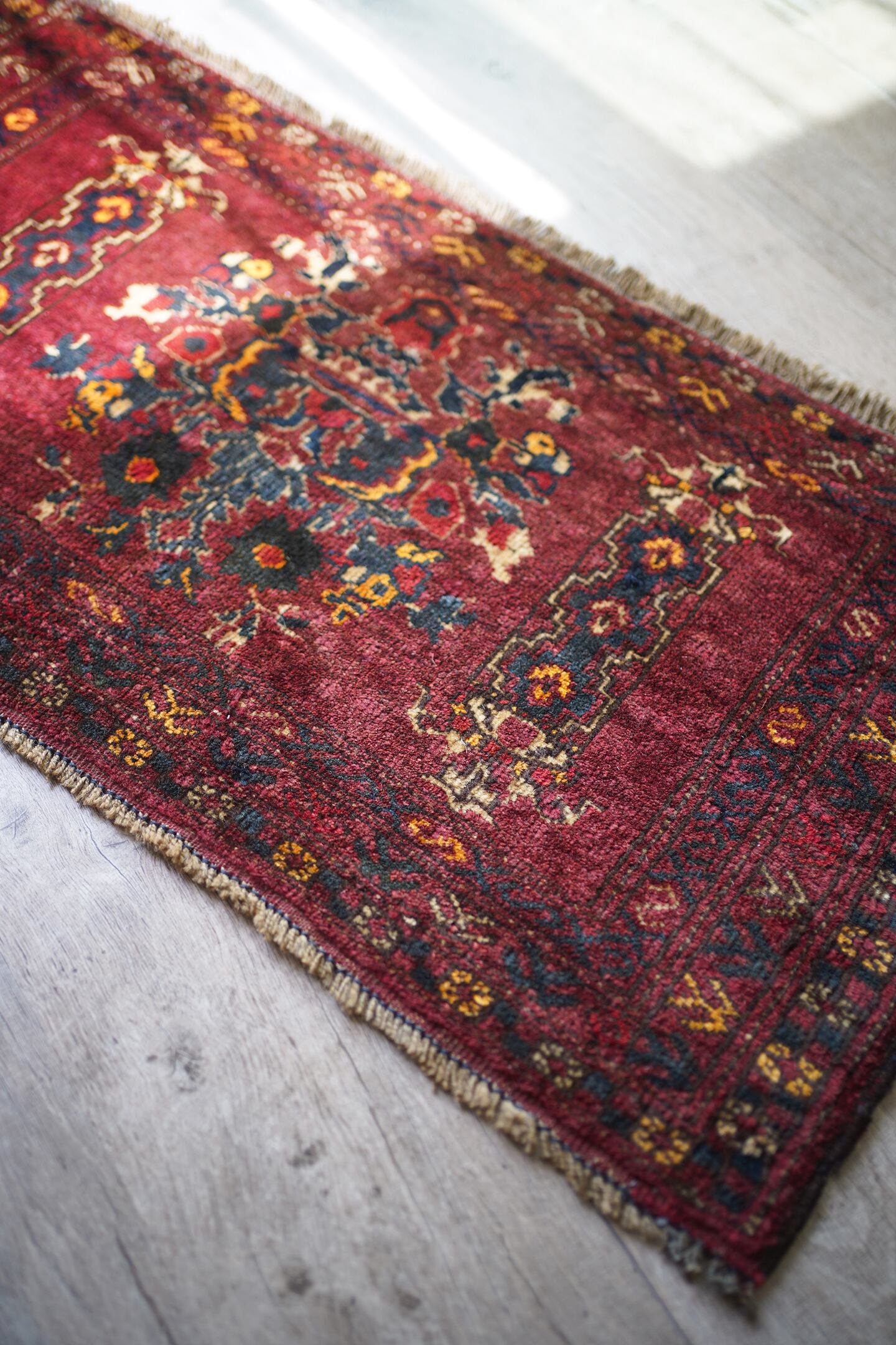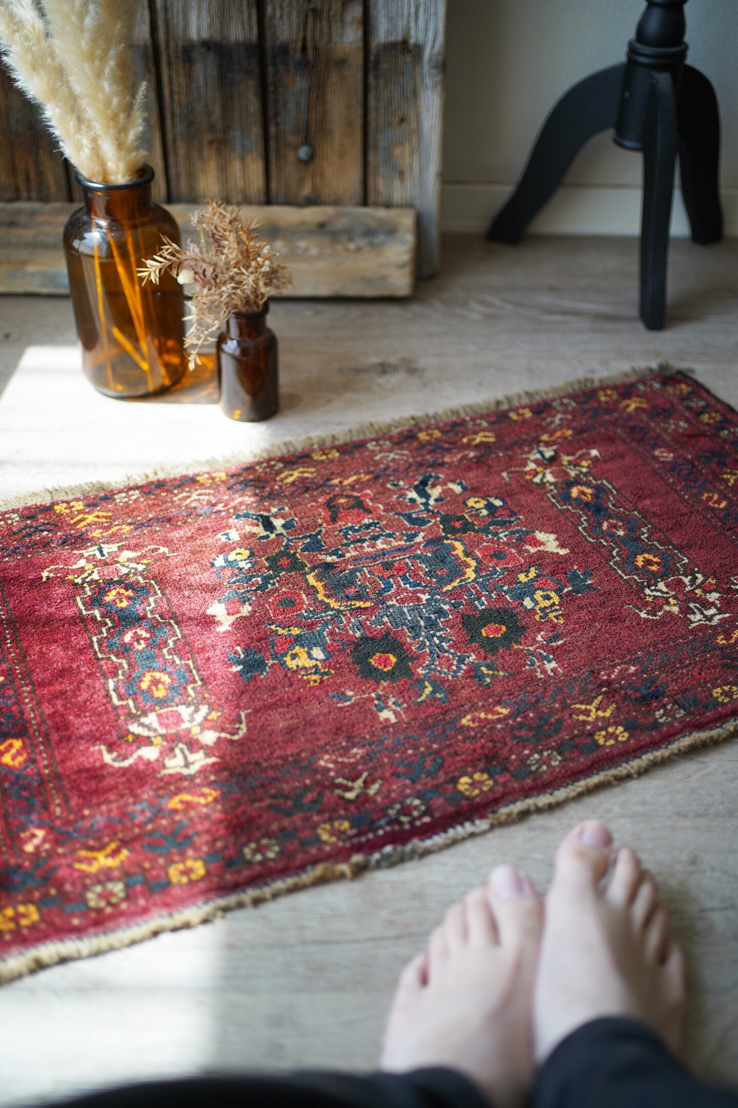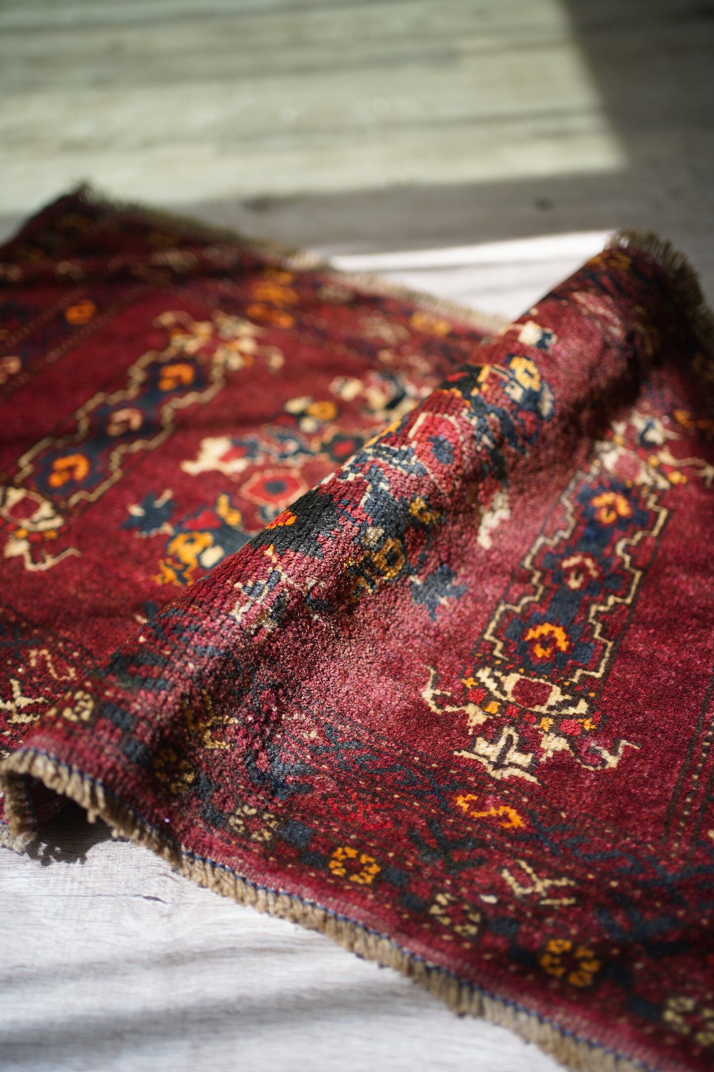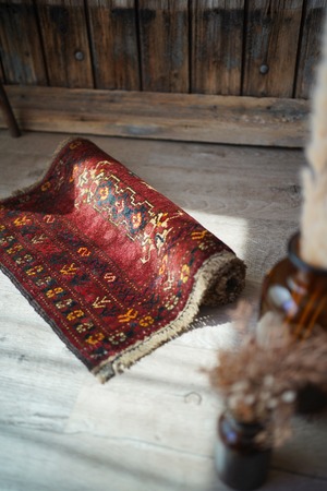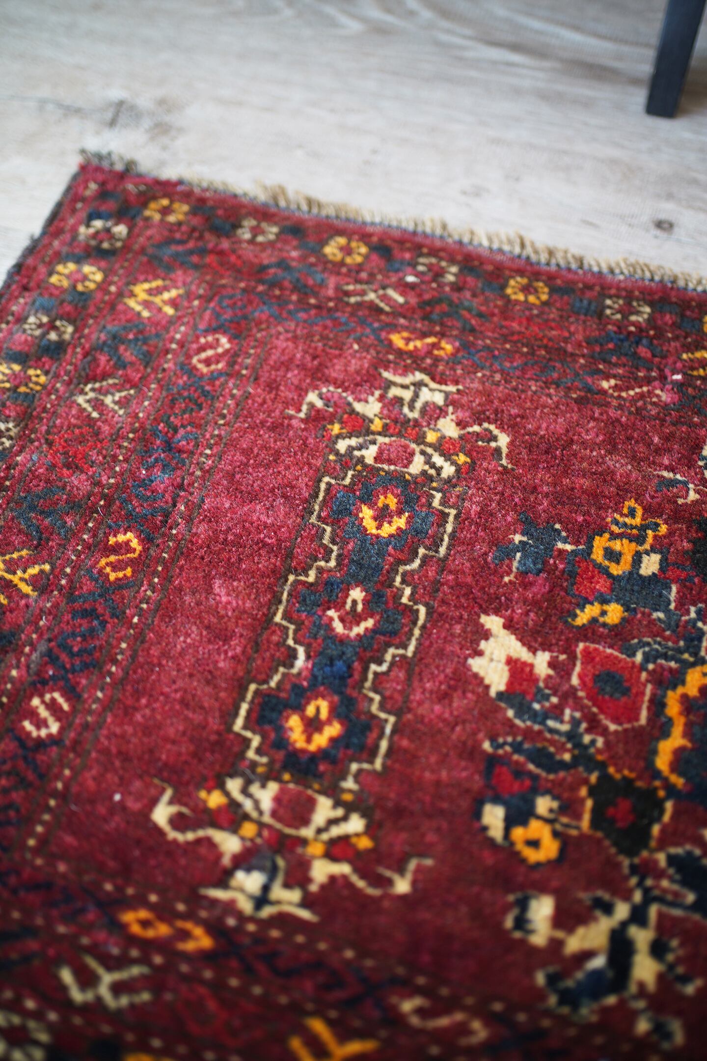 約80年前〜90年前にトルクメン族によって織られたセミアンティークのラグです。"バーリシト"と呼ばれる遊牧民が家財道具や食材を入れる袋状のものを表面のみに加工してもらいました。えんじ色に中央の大きく織り込まれた花の紋様が印象的な一枚で、パイルに艶もあり大変美しいです。ふわっと滑らかな優しい肌触りで、厚みは8mmほど。角部分で2箇所、修繕した形跡がございますのでお写真最後にてご確認ください(言われてみないとわからない程度かと思われます)。棚の前や玄関など、お気に入りの場所にぜひどうぞ♪