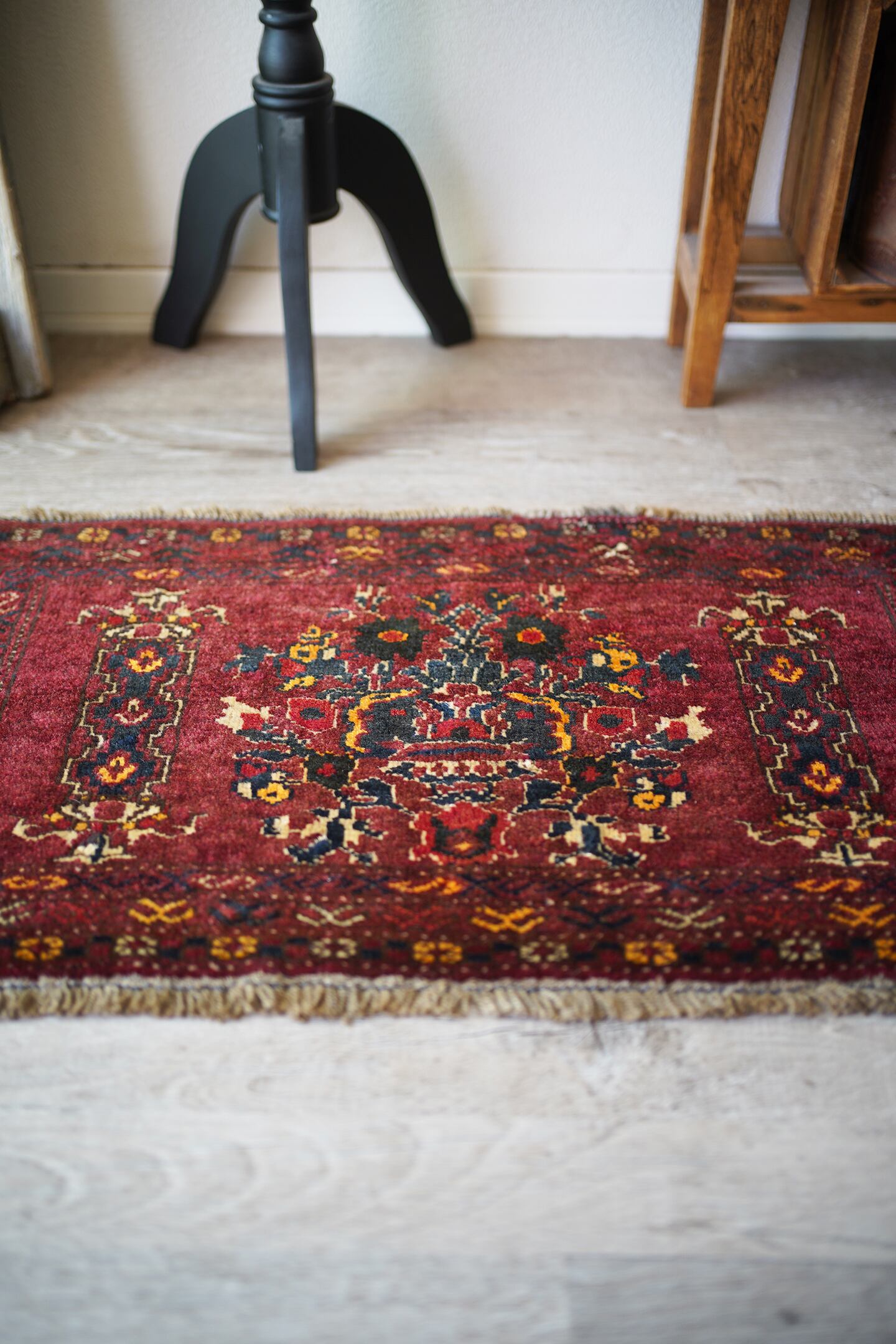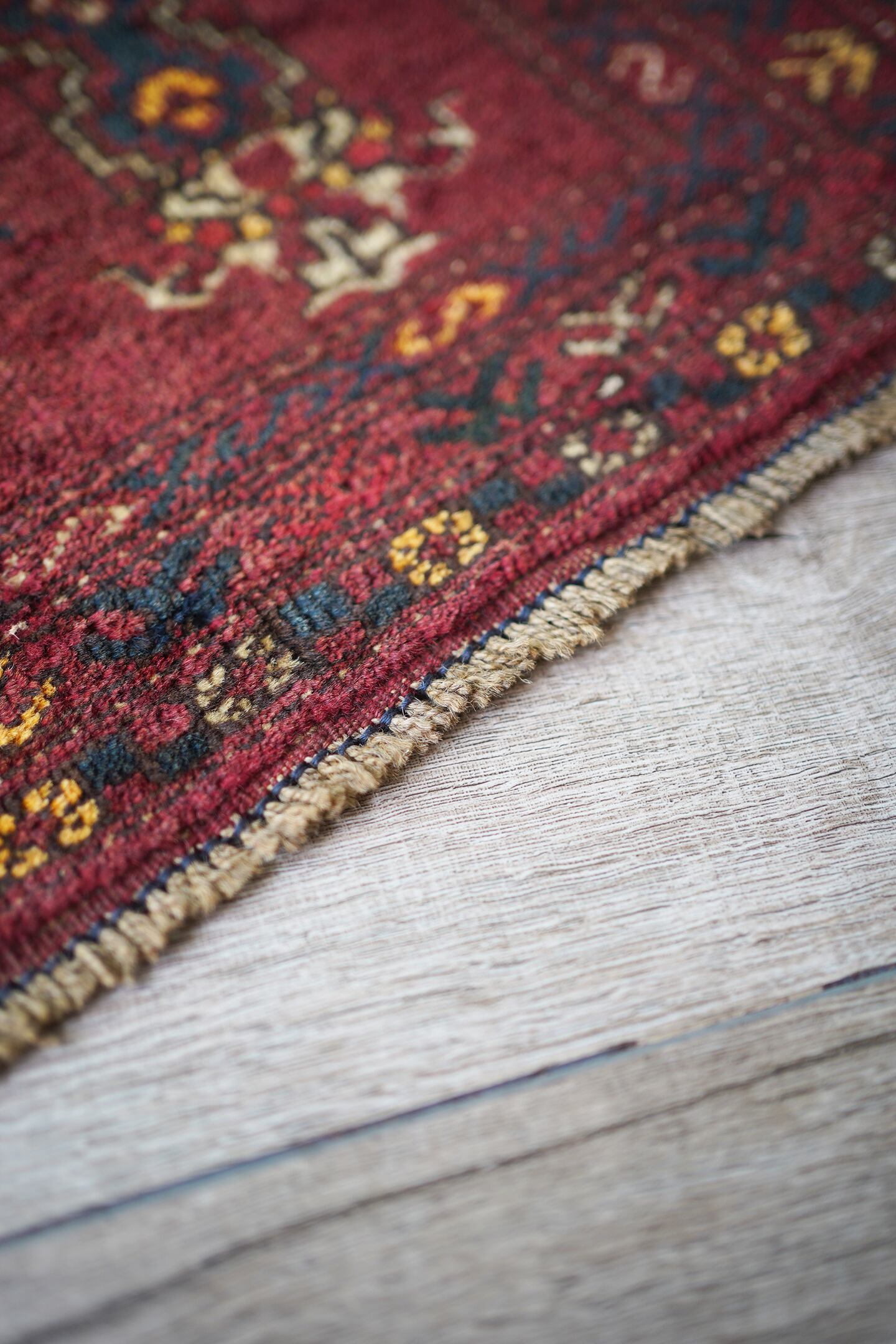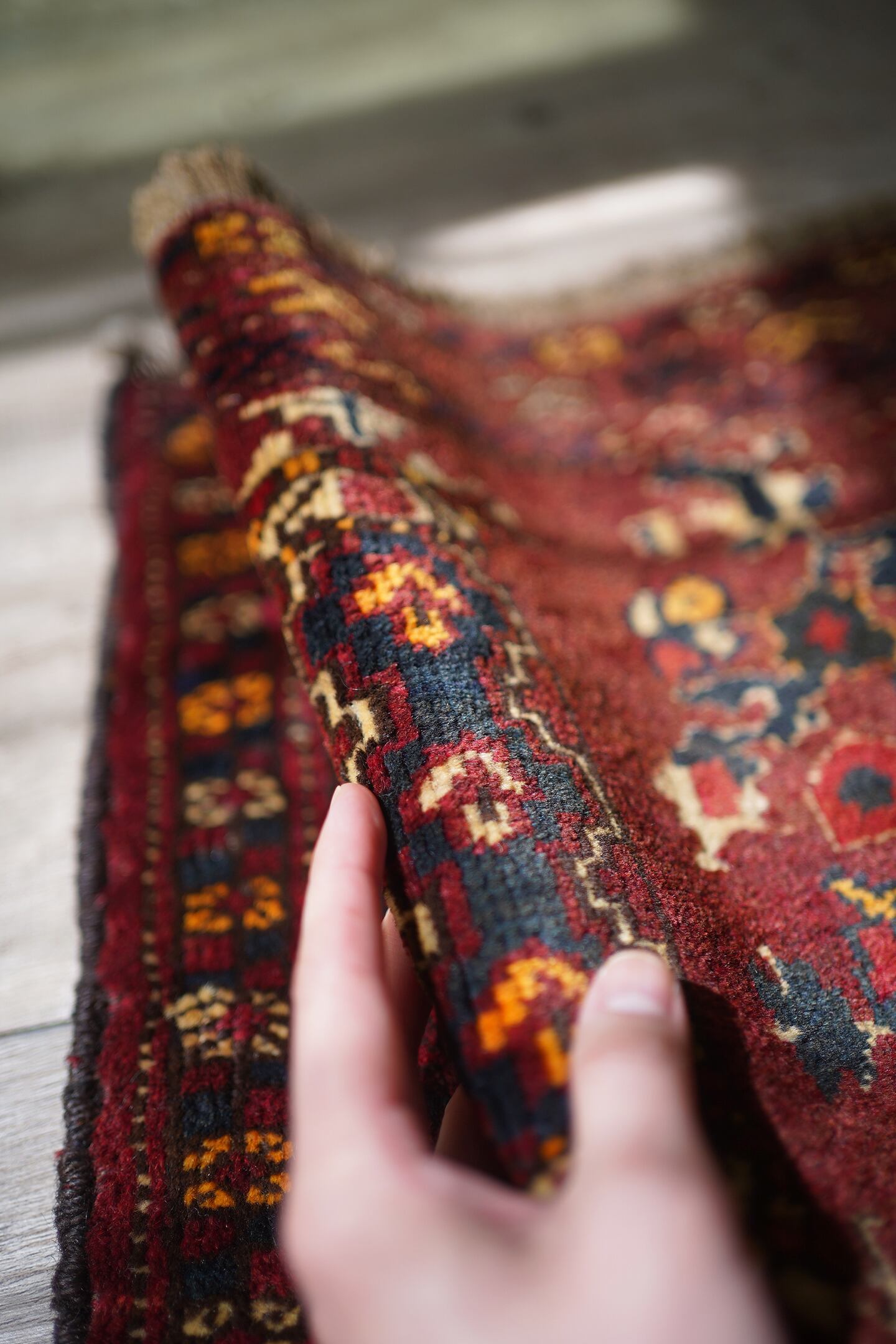 約80年前〜90年前にトルクメン族によって織られたセミアンティークのラグです。"バーリシト"と呼ばれる遊牧民が家財道具や食材を入れる袋状のものを表面のみに加工してもらいました。えんじ色に中央の大きく織り込まれた花の紋様が印象的な一枚で、パイルに艶もあり大変美しいです。ふわっと滑らかな優しい肌触りで、厚みは8mmほど。角部分で2箇所、修繕した形跡がございますのでお写真最後にてご確認ください(言われてみないとわからない程度かと思われます)。棚の前や玄関など、お気に入りの場所にぜひどうぞ♪