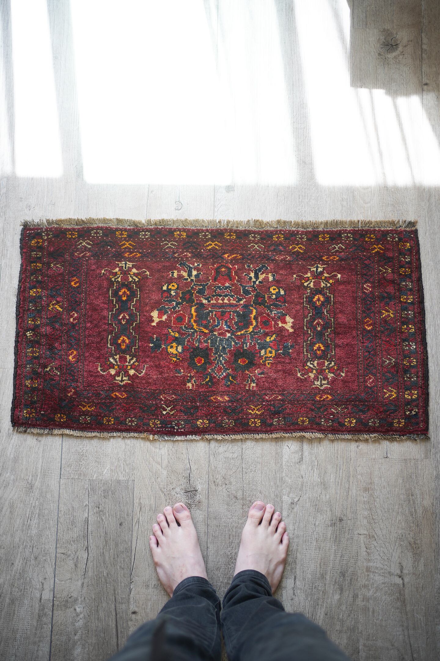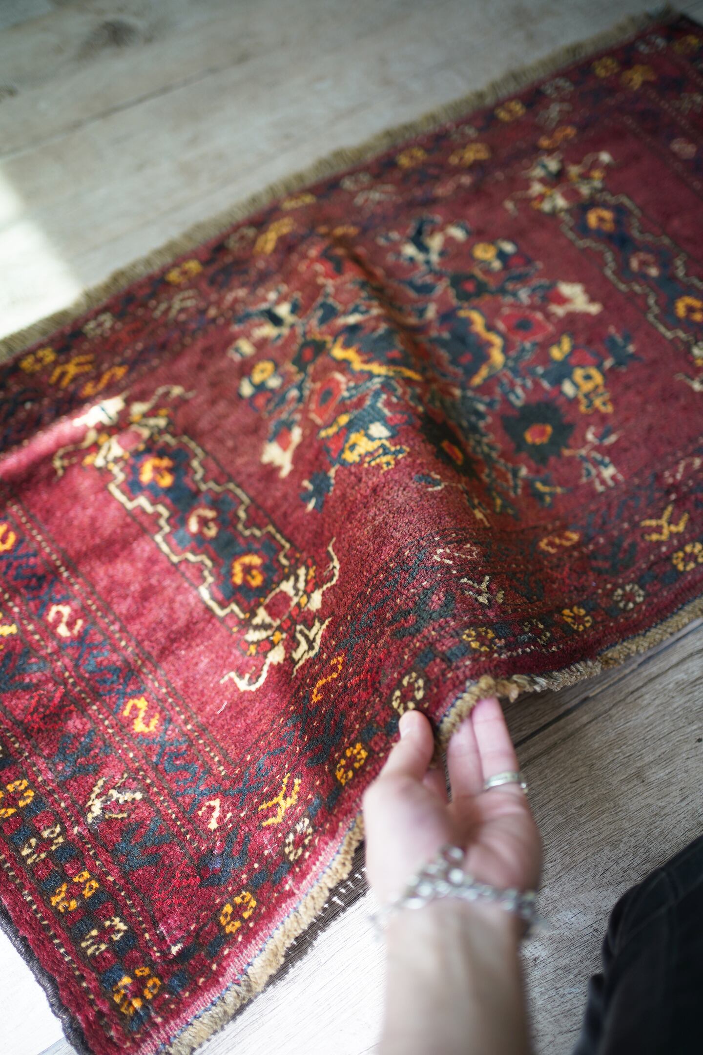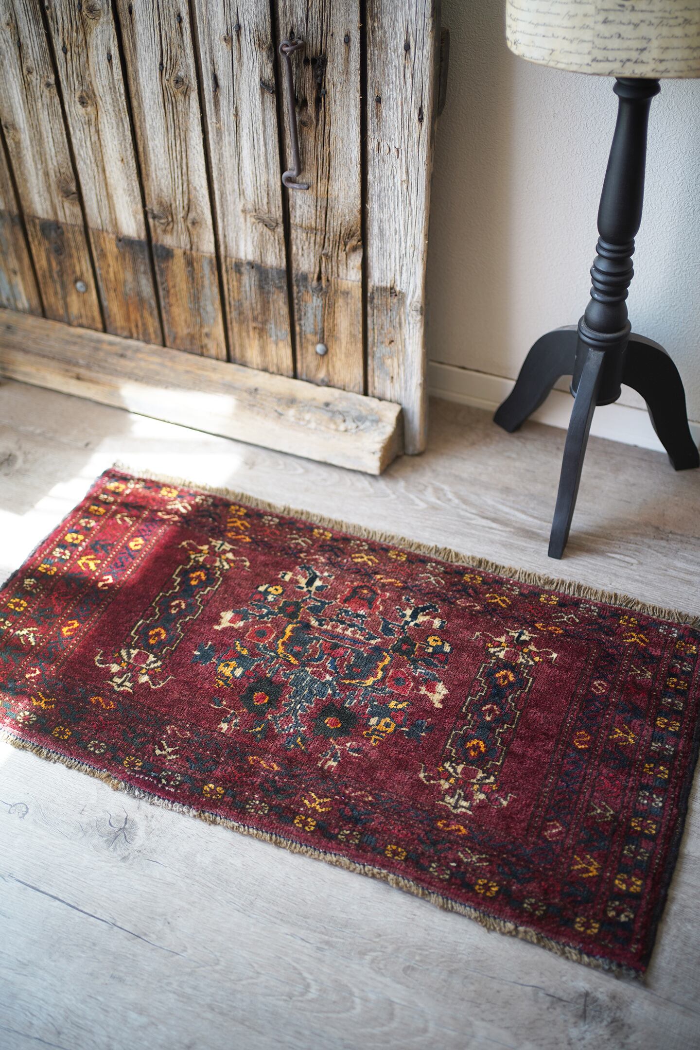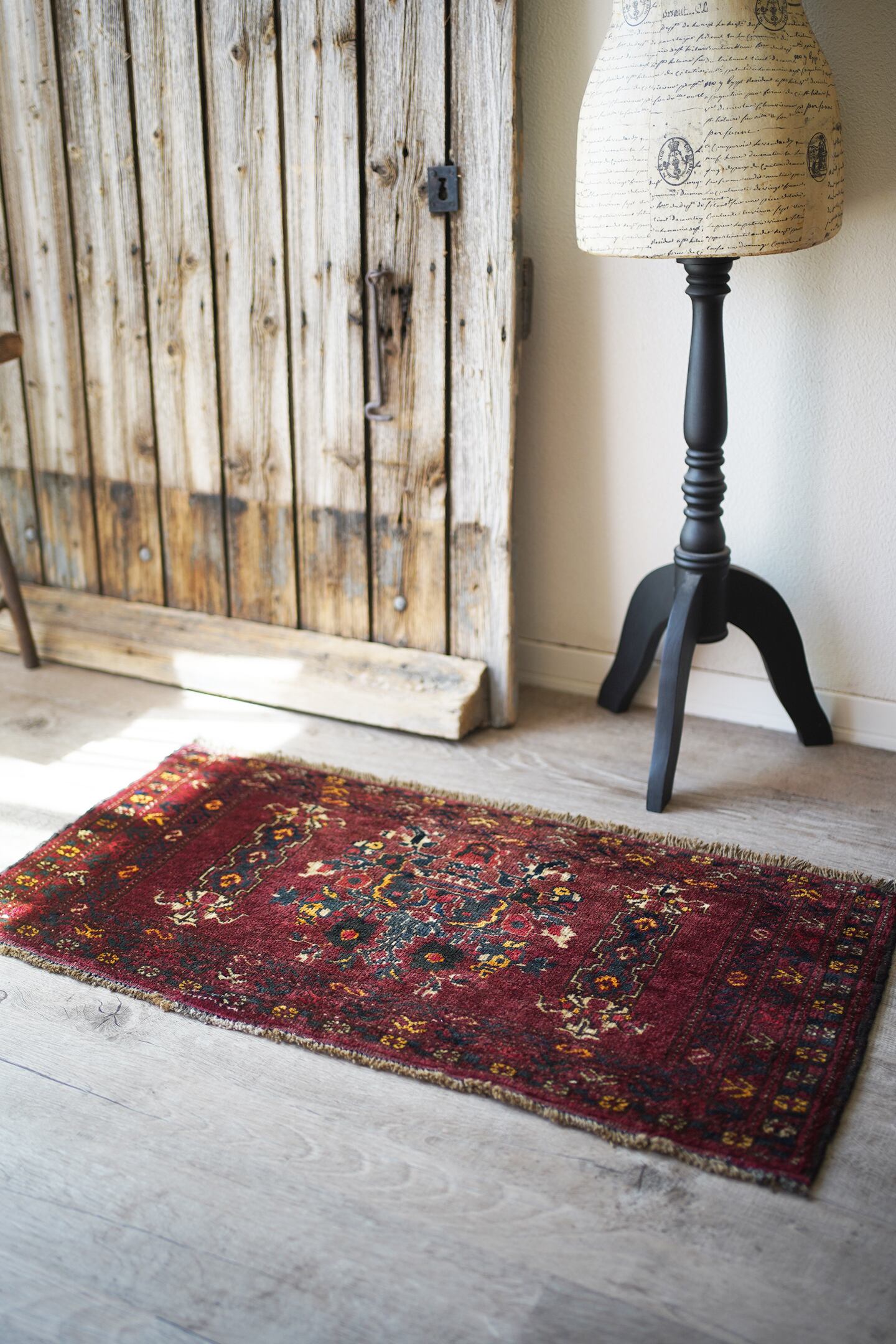 約80年前〜90年前にトルクメン族によって織られたセミアンティークのラグです。"バーリシト"と呼ばれる遊牧民が家財道具や食材を入れる袋状のものを表面のみに加工してもらいました。えんじ色に中央の大きく織り込まれた花の紋様が印象的な一枚で、パイルに艶もあり大変美しいです。ふわっと滑らかな優しい肌触りで、厚みは8mmほど。角部分で2箇所、修繕した形跡がございますのでお写真最後にてご確認ください(言われてみないとわからない程度かと思われます)。棚の前や玄関など、お気に入りの場所にぜひどうぞ♪